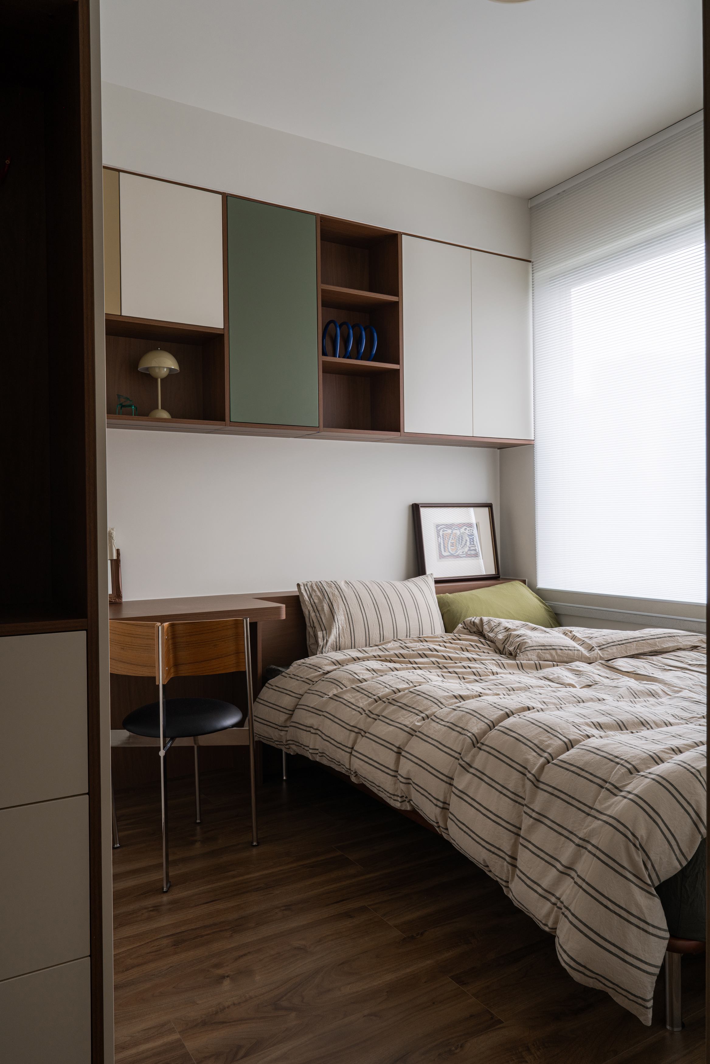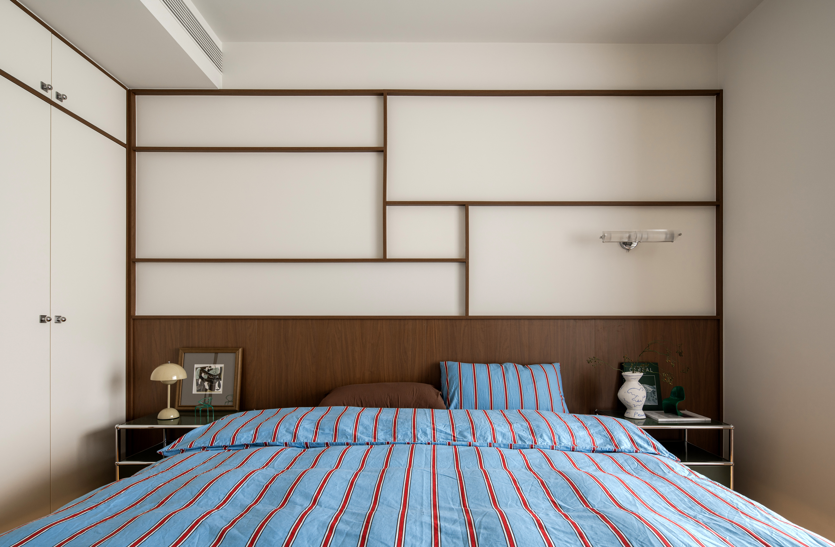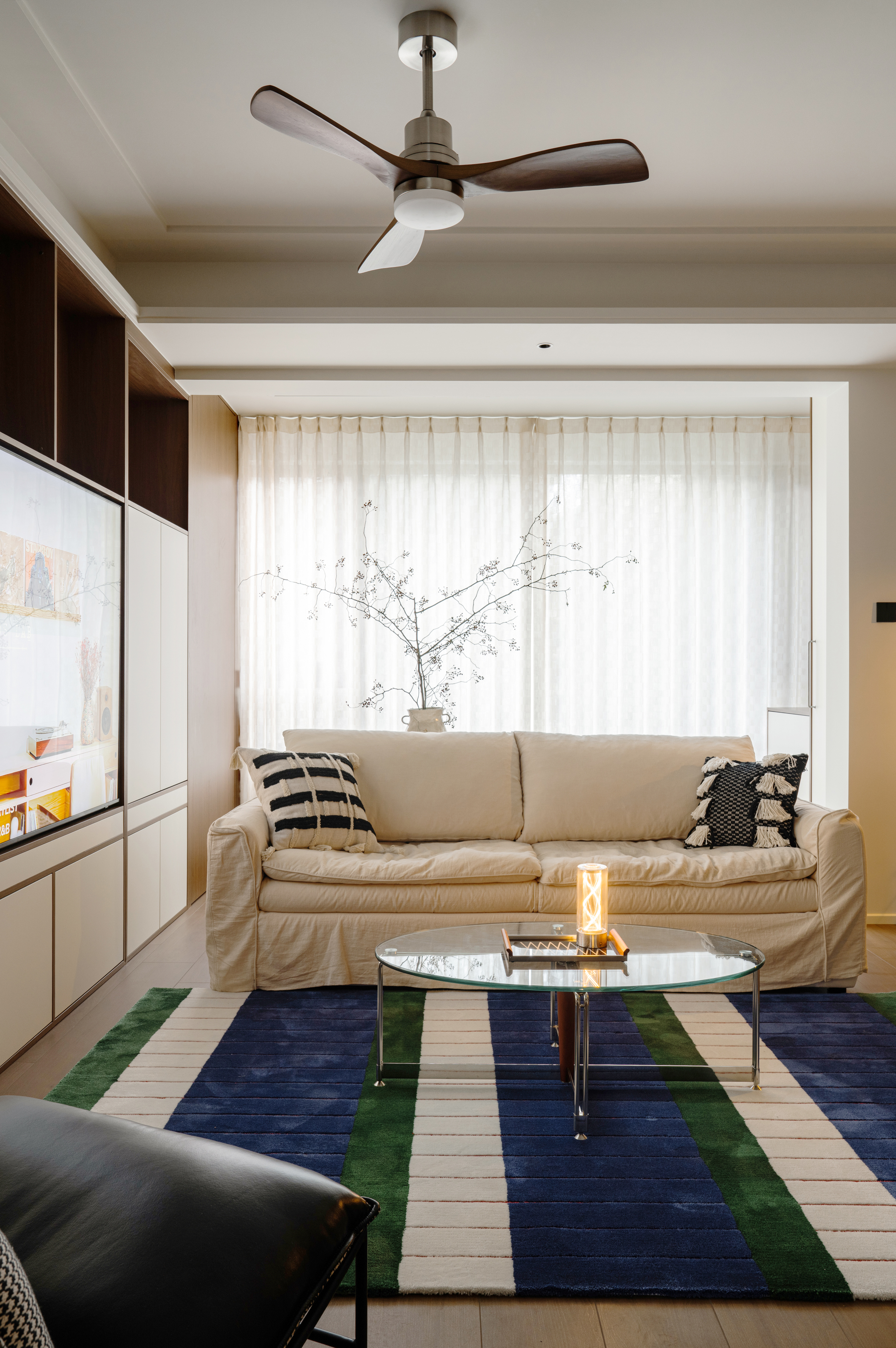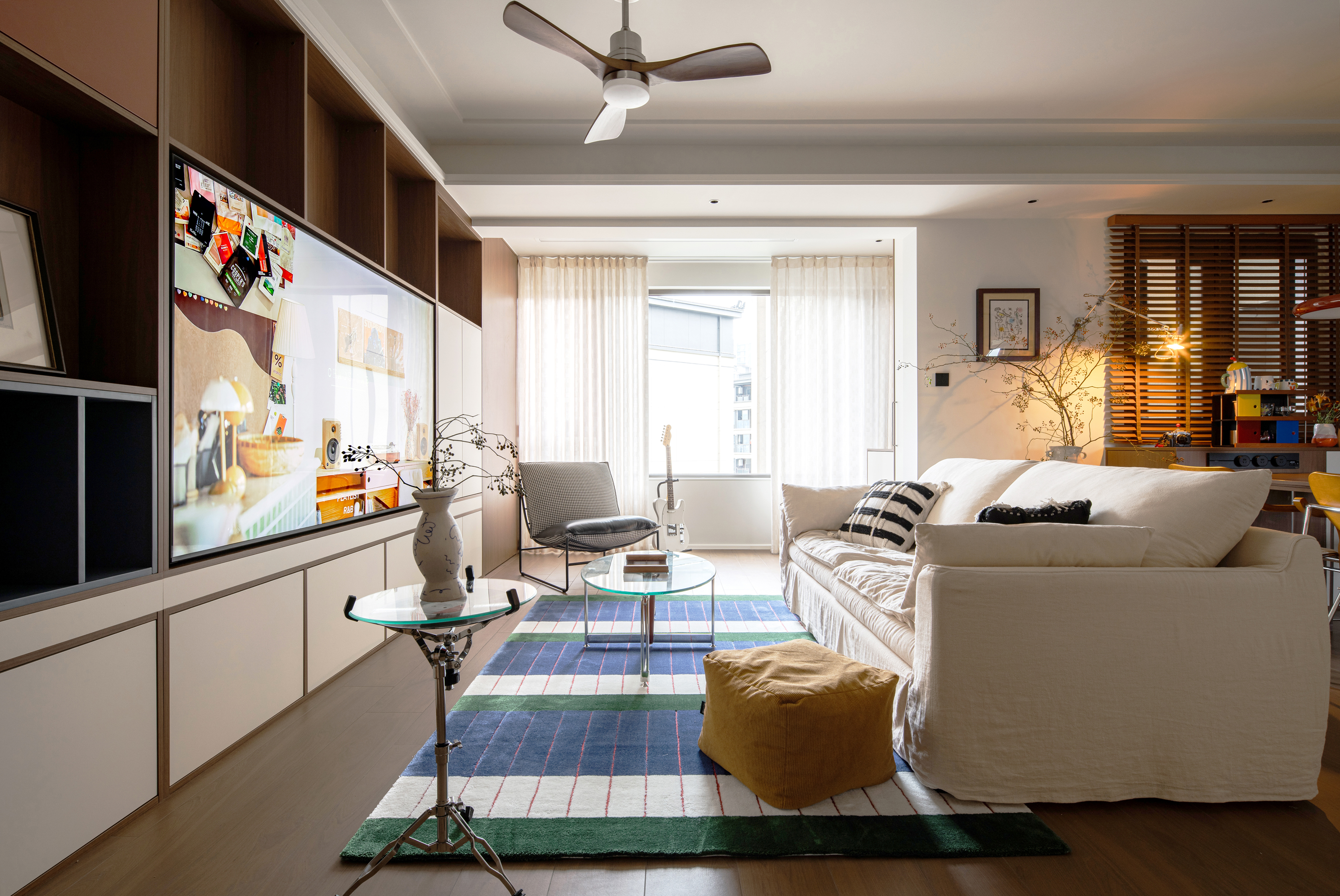 我们为经典柚木配上了浅奶油色的门板,如同在拿铁上倾入绵密奶泡,瞬间轻盈明亮起来。而真正的点睛之笔,是那几扇悄悄跳脱出来的门板——一抹灰调的红、一扇沉静的墨绿、一角明媚的鹅黄、一方静谧的克莱因蓝。它们不是喧闹的,而是像乐章中偶尔跳出的重音,让整面电视柜墙拥有了呼吸的节奏。 这份色彩的欢愉,从柜体蔓延至脚下。长方条拼色的羊毛地毯,用的正是这四种跳色,仿佛将墙上的音符拾起,编织成了可以赤脚踩踏的温柔诗篇。