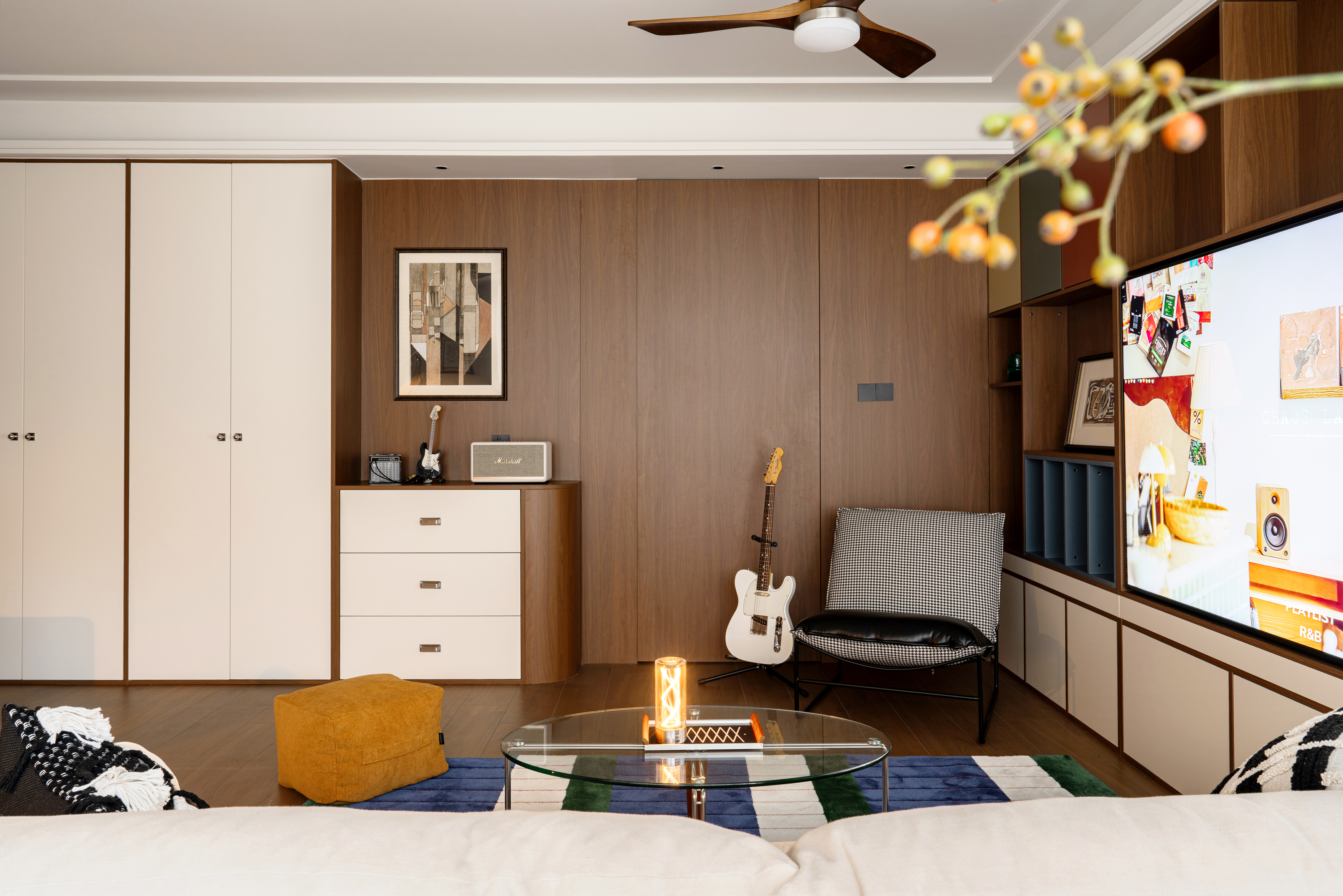 空间意境:推开门,先被一片温润的柚木色拥抱。这不是那种沉重的旧木色,而是被阳光筛过一遍的、带着蜂蜜光泽的暖调。它从整墙的柜体蔓延开来,成为这个客厅沉稳而温柔的底色。在这个底色之上,一场专属于这个家的色彩游戏,才正要开始。