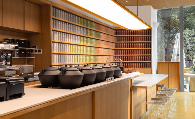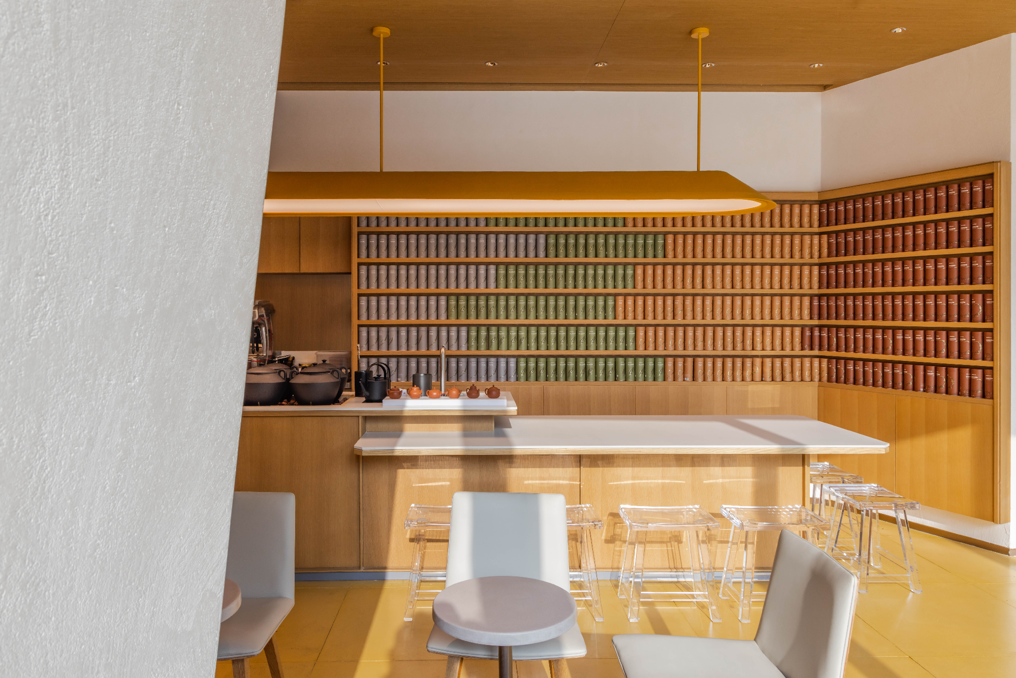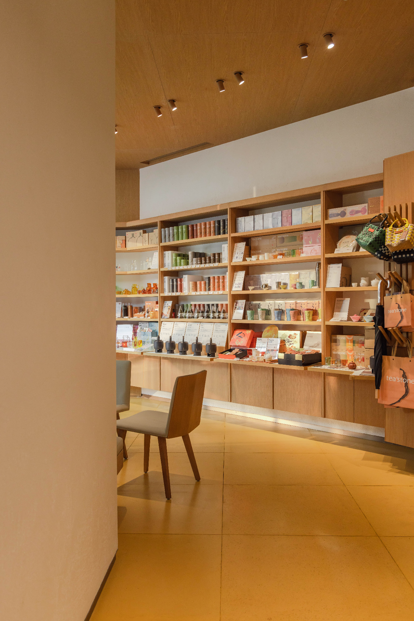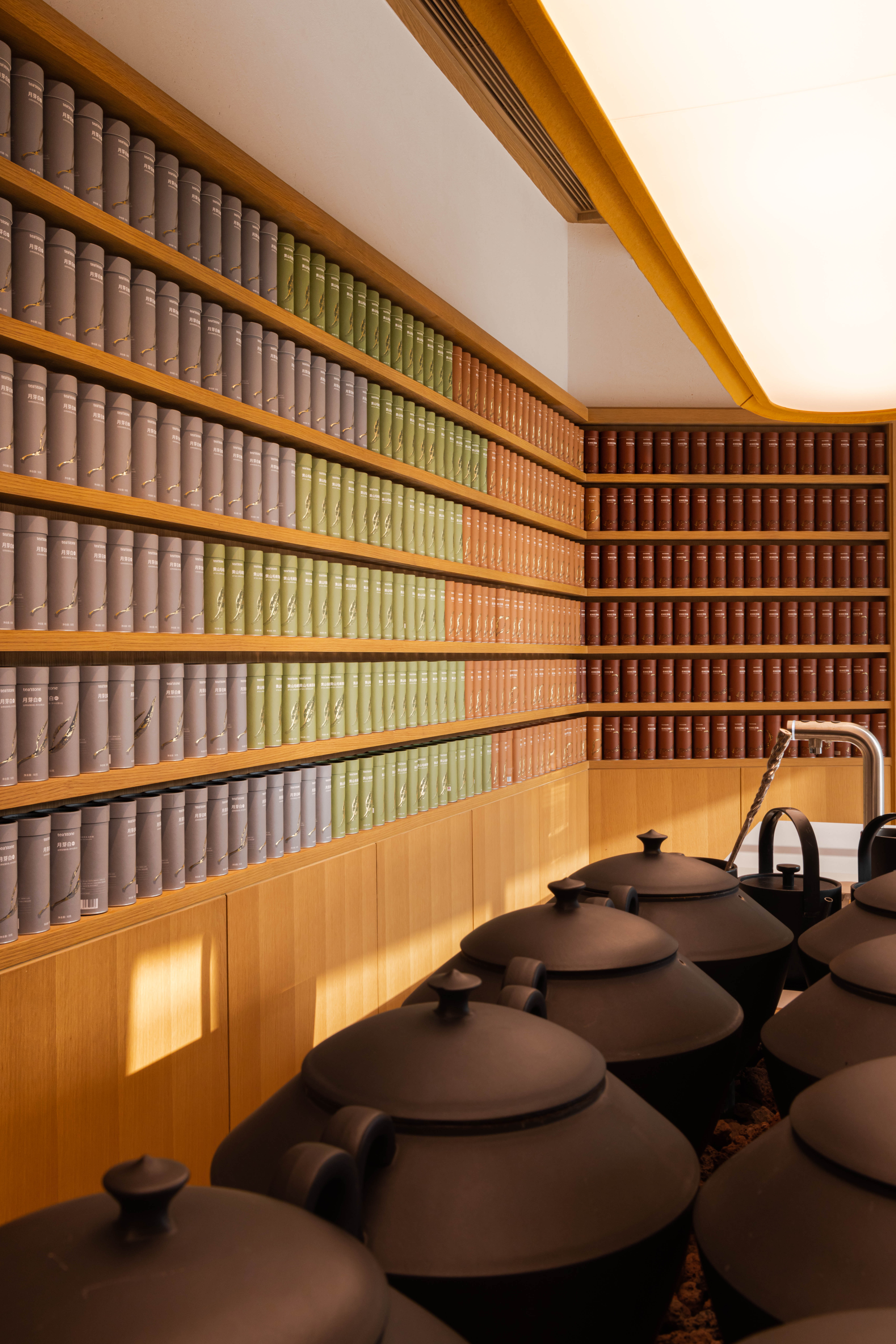 空间布局:设计打破面积小的限制,货架与茶柜沿折线型墙面顺势布置形成类似屏风的视觉效果,如徐徐展开的的当代茶事画卷,引导顾客在“移步易景”中自然探索,实现体验沉浸与运营效率的平衡。