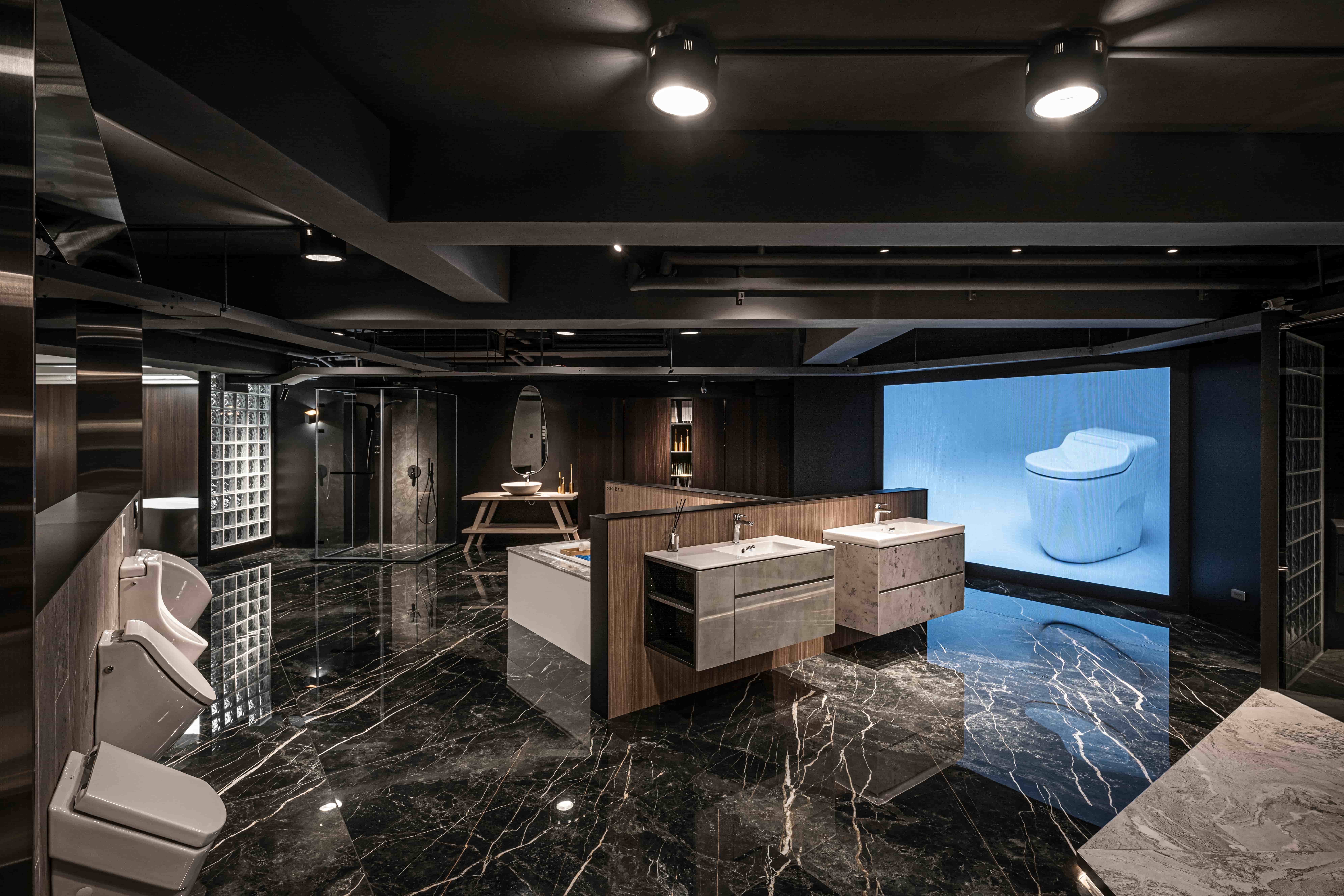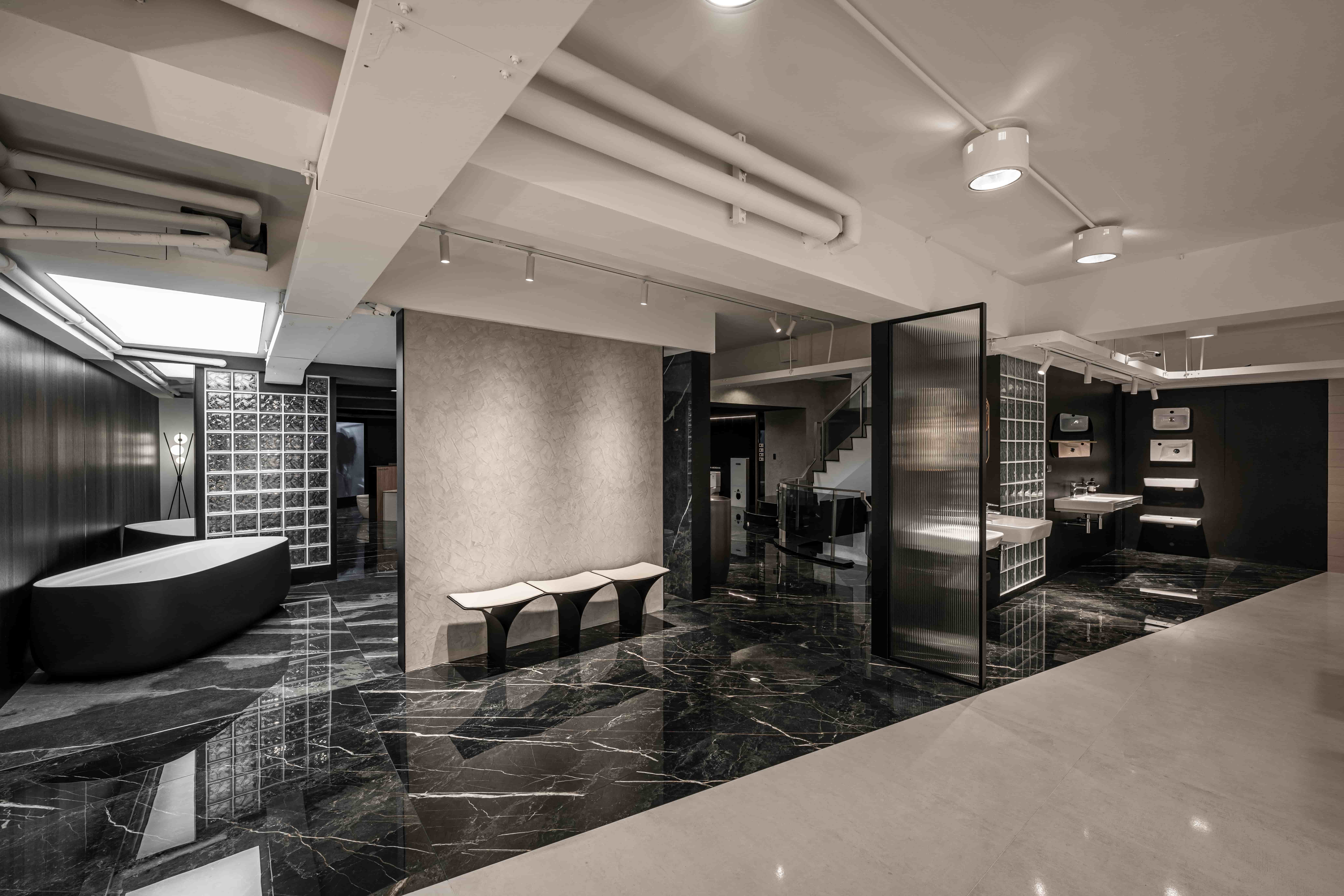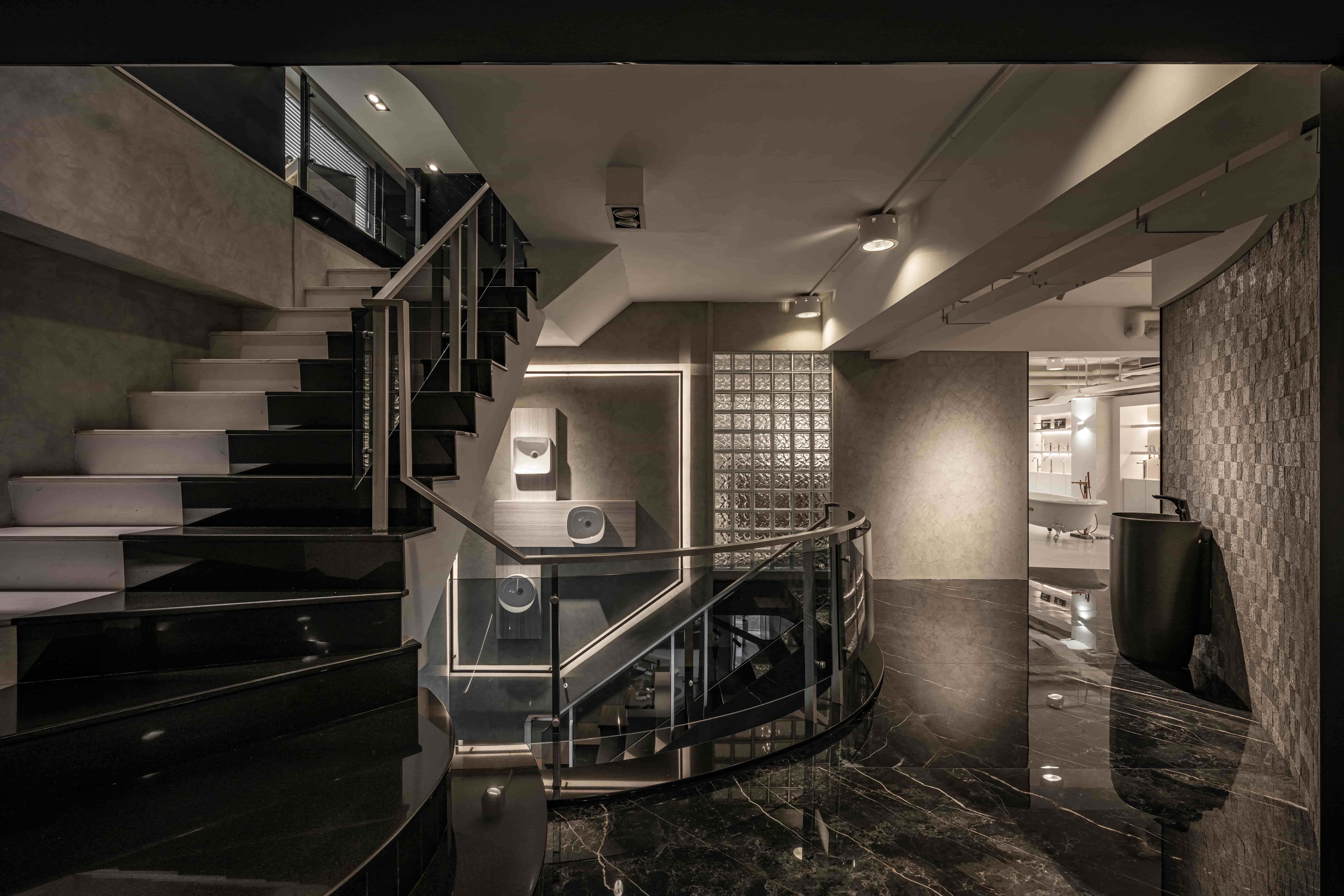 项目定位:此案為一衛浴設備展示空間,以沉浸式劇場為設計概念,參觀者能夠主動式體驗並沈浸在我們所設定的不同衛浴空間情境。一進入大門的是以幾合線條鐵件軌道串連挑高的一樓空間,並為該歐系品牌之頂級產品設定獨立空間場景,以控管預約參觀的顧客。二樓設計是以1:1.6的黃金比例斜切線為分水嶺做為2種情境的空間色調分割,黑色調呈現著沉穩與時尚,設置的大型LED螢幕牆設置如表現伸展台一般;典雅婉約的白色調區則是展示單品配件區,並設置藍色玻璃燈箱的水幕意象場景。三樓為品牌平價產品,所以以灰泥塗料作為基底設定,帶給顧客更多的是一種質樸感。二、三樓空間皆安排了雙回字型動線,並透過各式地材劃分不同場域設計,帶領顧客(觀眾)藉由沈浸式劇場般的情境設計,體驗歐系衛浴品牌的精緻工藝。