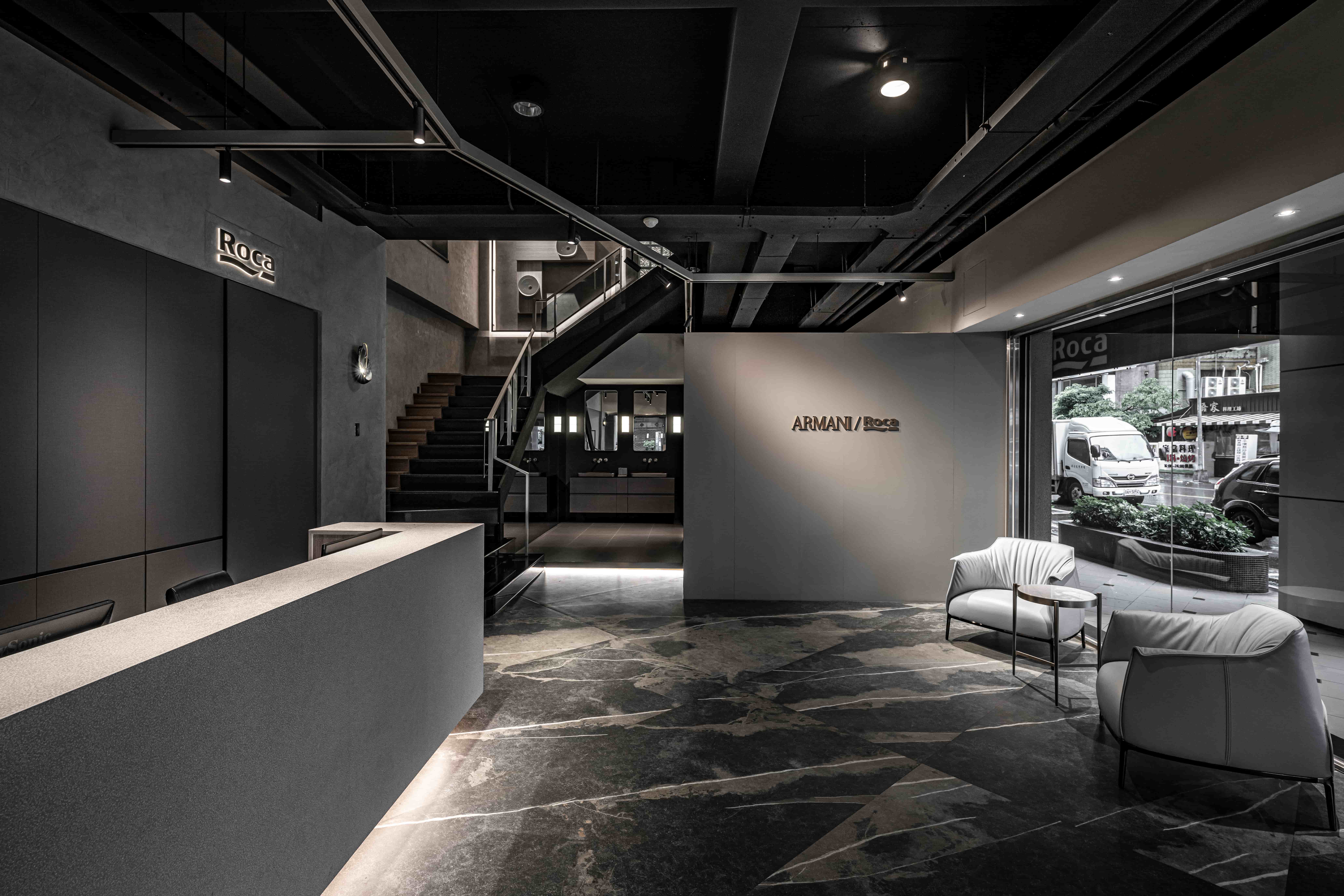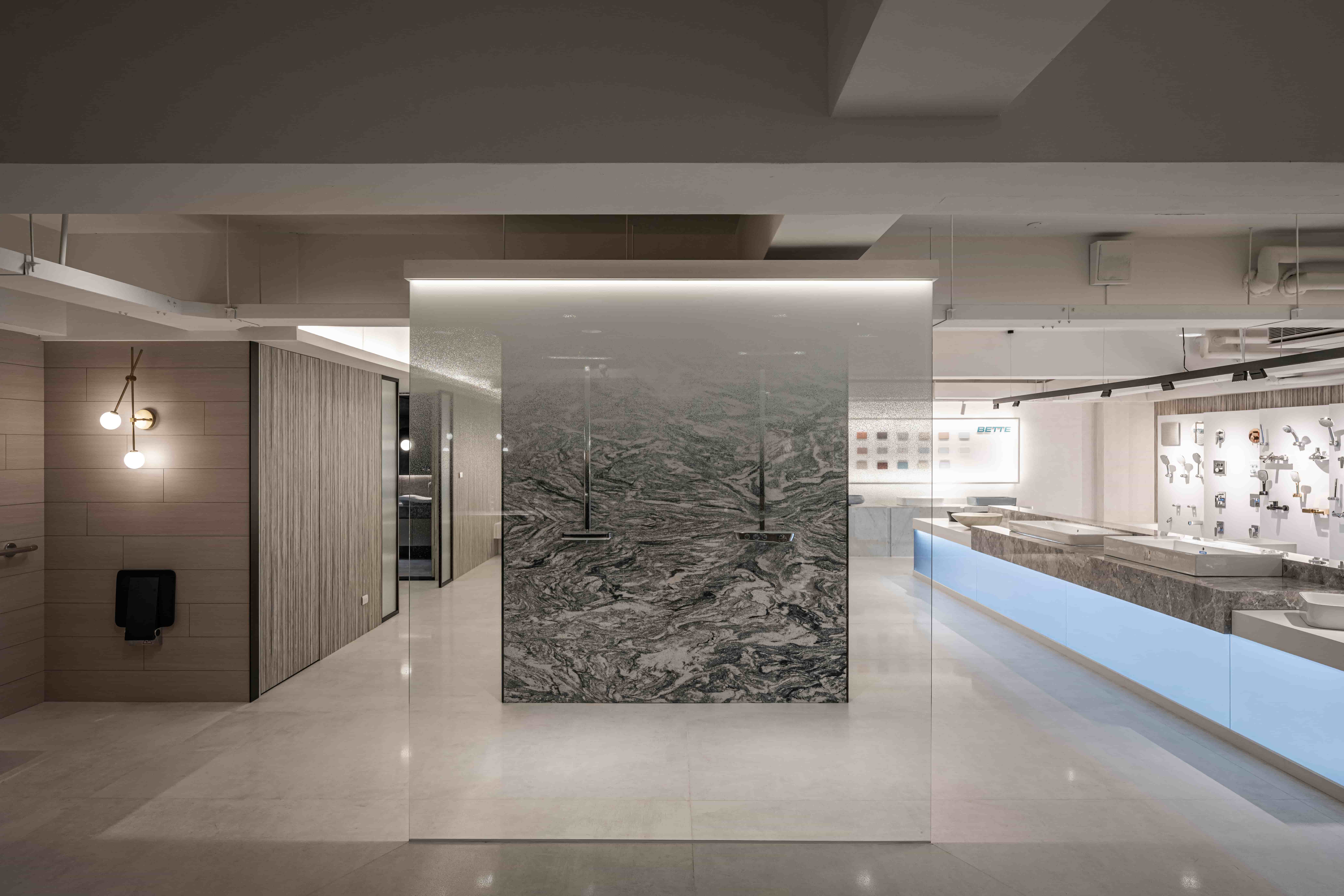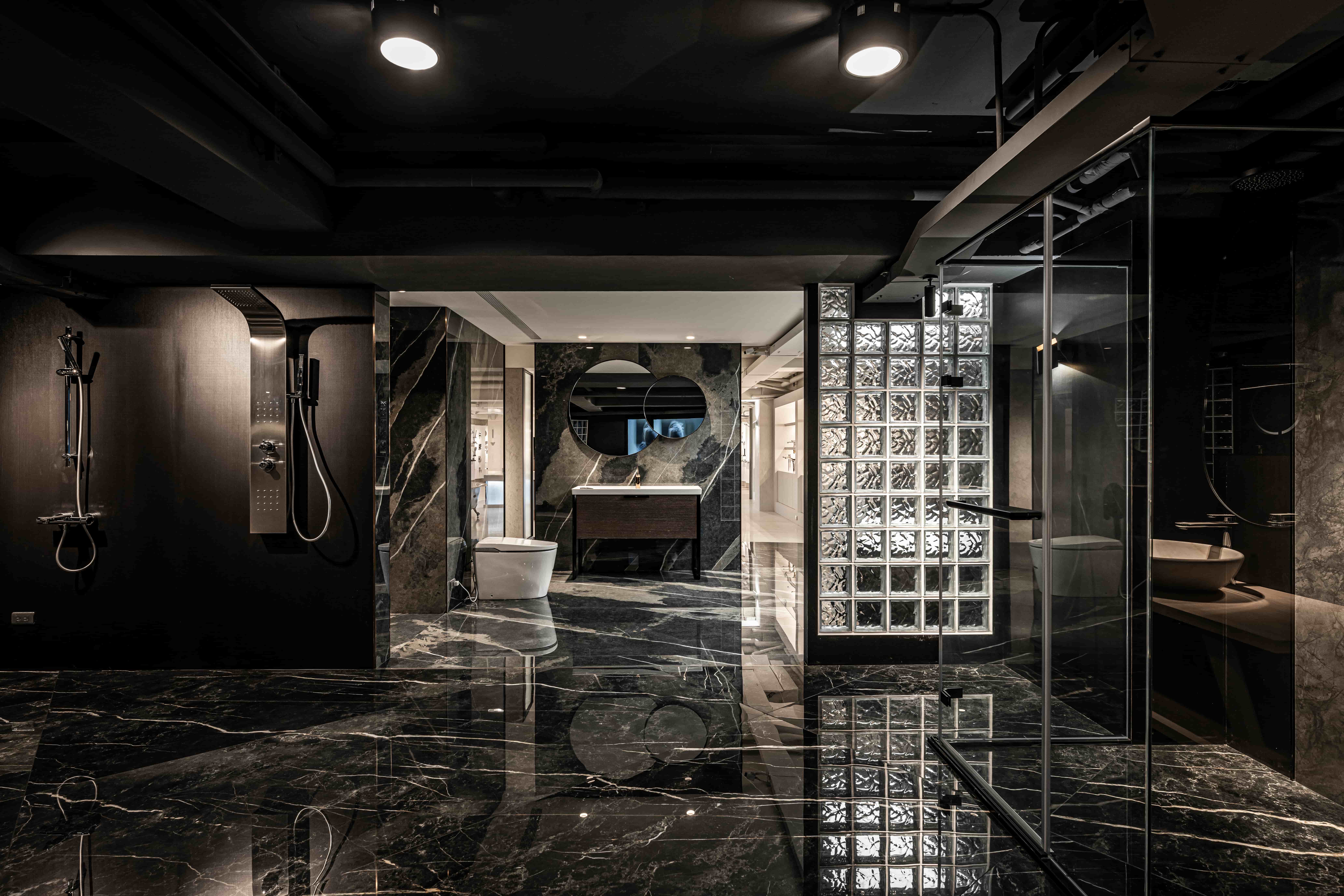 项目定位:此案為一衛浴設備展示空間,以沉浸式劇場為設計概念,參觀者能夠主動式體驗並沈浸在我們所設定的不同衛浴空間情境。一進入大門的是以幾合線條鐵件軌道串連挑高的一樓空間,並為該歐系品牌之頂級產品設定獨立空間場景,以控管預約參觀的顧客。二樓設計是以1:1.6的黃金比例斜切線為分水嶺做為2種情境的空間色調分割,黑色調呈現著沉穩與時尚,設置的大型LED螢幕牆設置如表現伸展台一般;典雅婉約的白色調區則是展示單品配件區,並設置藍色玻璃燈箱的水幕意象場景。三樓為品牌平價產品,所以以灰泥塗料作為基底設定,帶給顧客更多的是一種質樸感。二、三樓空間皆安排了雙回字型動線,並透過各式地材劃分不同場域設計,帶領顧客(觀眾)藉由沈浸式劇場般的情境設計,體驗歐系衛浴品牌的精緻工藝。