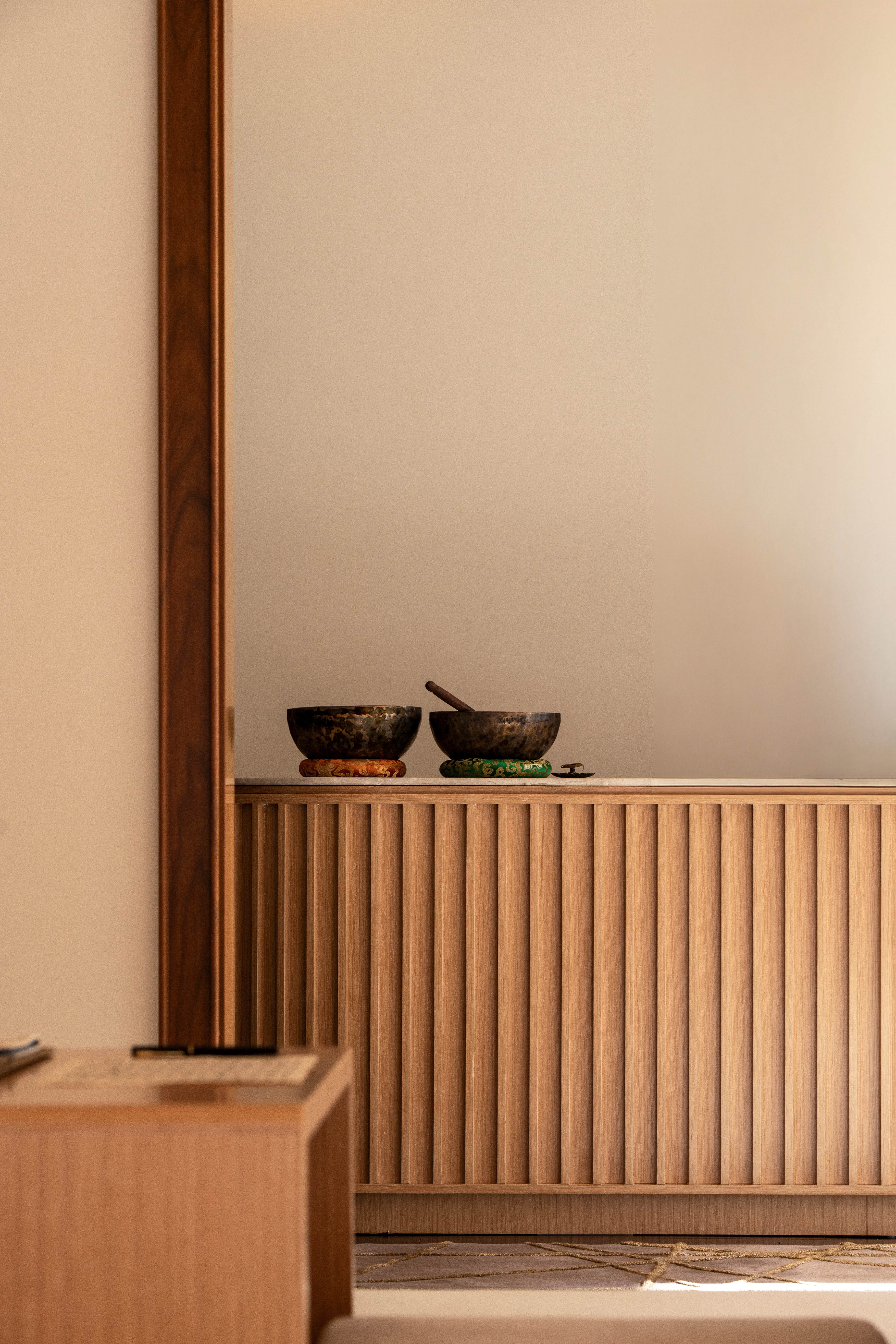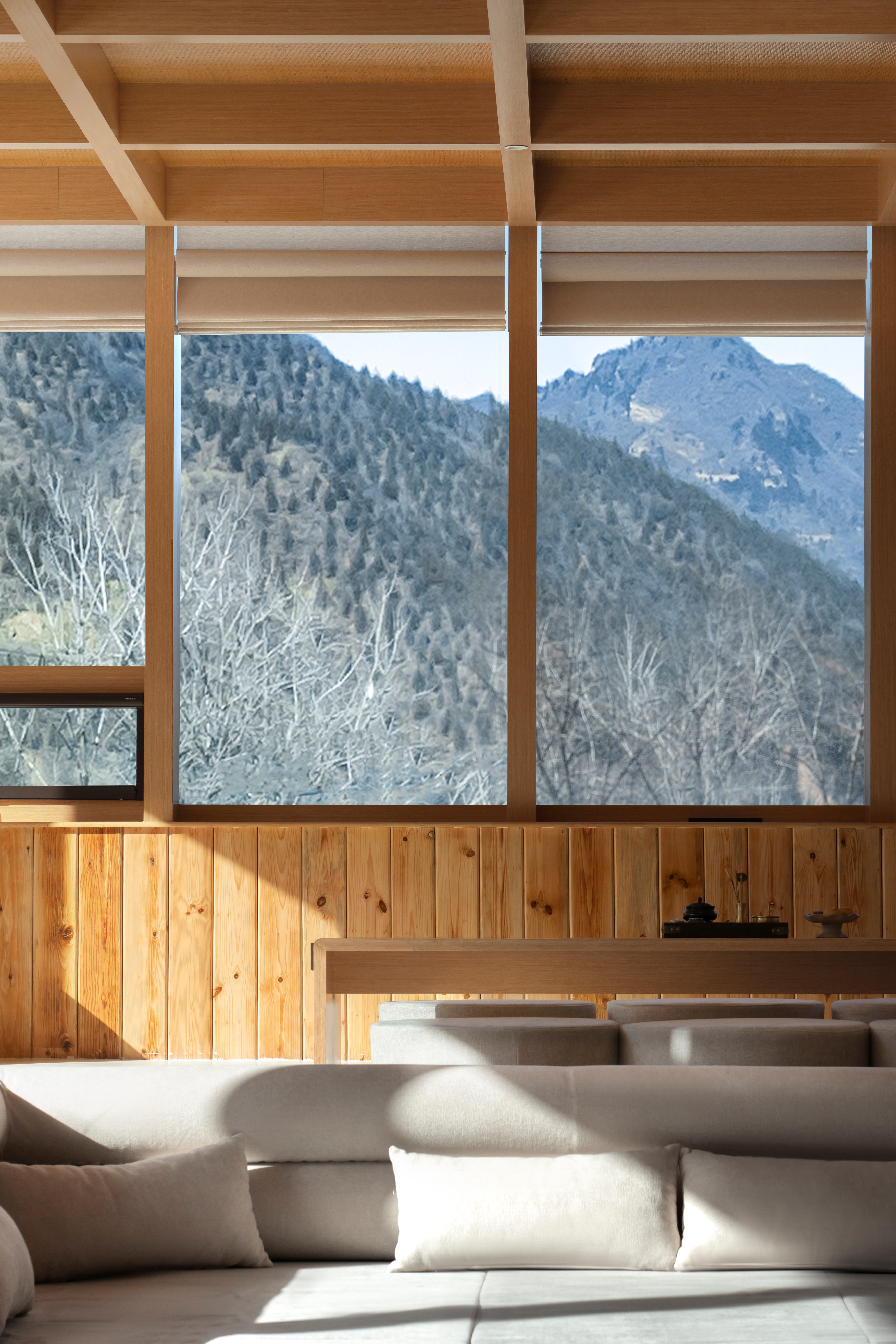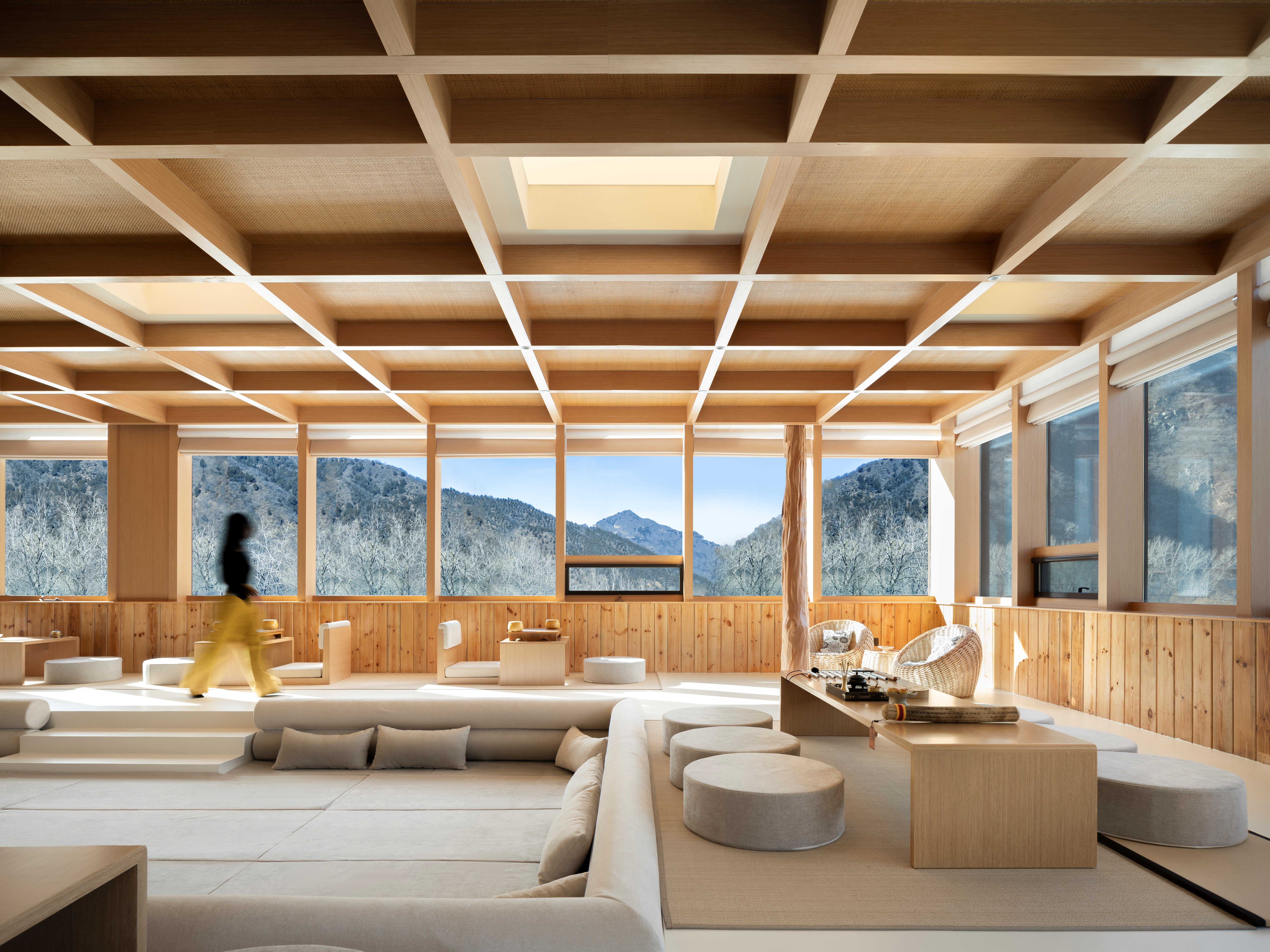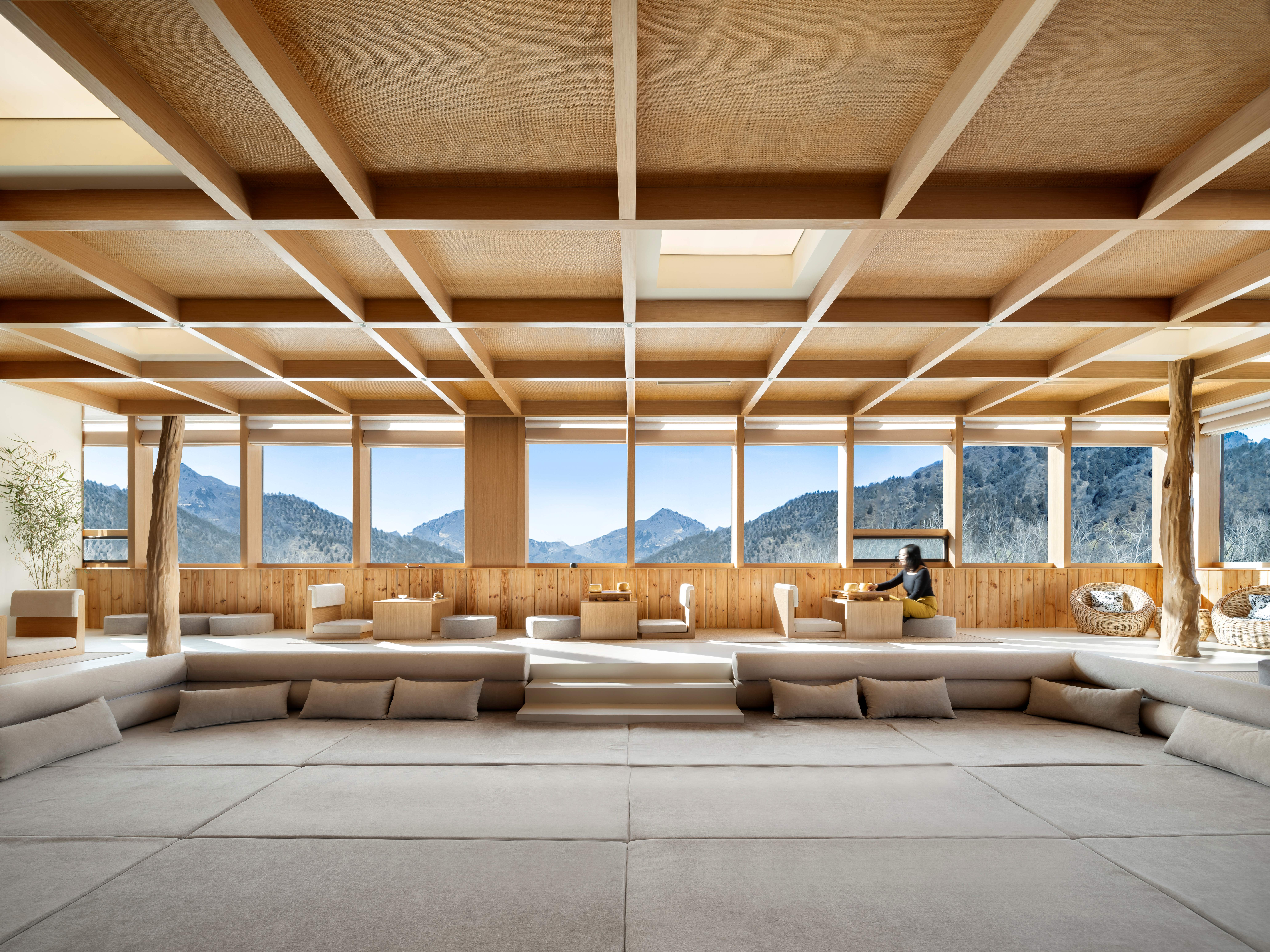 入口处为服务空间,有书架、茶水台等设施。紧接着是抬高三步的大平台布满整个空间,高差的转换暗示了功能与氛围的转换,同时也解决了原建筑窗台过高不利于欣赏山景的弊端。大平台的水平延展性强调了平面的存在,天花的生成源自于建筑自身的竖梃韵律,将其延续到天花即形成了有秩序的格构。在空间的垂直方向上设计有五根原木柱,每根柱对应的顶部在木格内开设天窗。阳光照亮木柱,温度会使木材的芳香迅速扩散。天窗的光影会随着时间的变化洒在不同的位置,为空间增强了与自然的联系。平台的中央为一个下沉的软座池,人们在其中或坐或卧,可以很放松自在地享受午后的阳光。空间本身并没有对功能做过多的限制,酒店团队可以制定茶席体验、花道体验、颂钵音疗、抄经焚香、瑜伽八段锦等活动来丰富住客的泊宿体验。 -