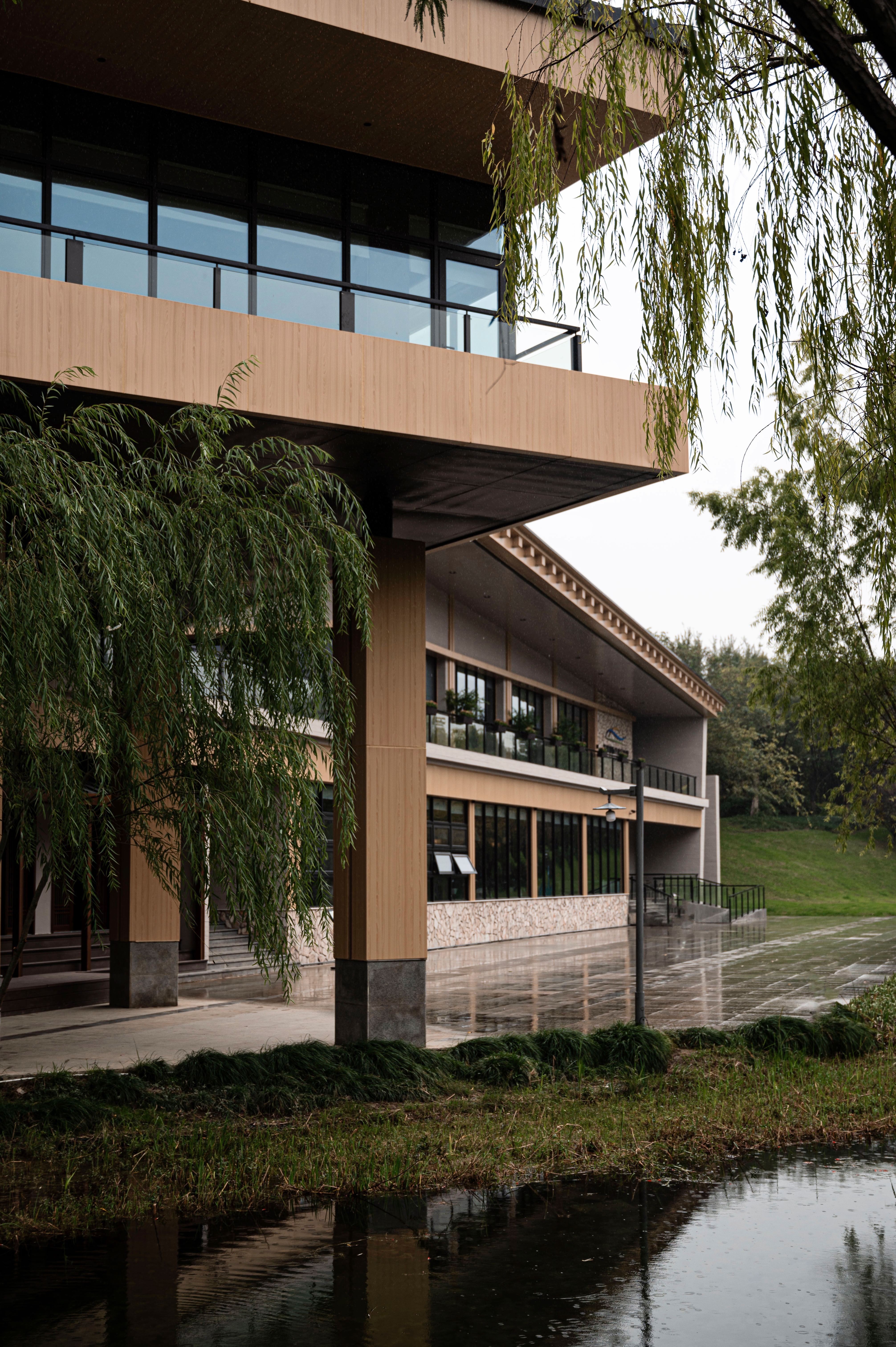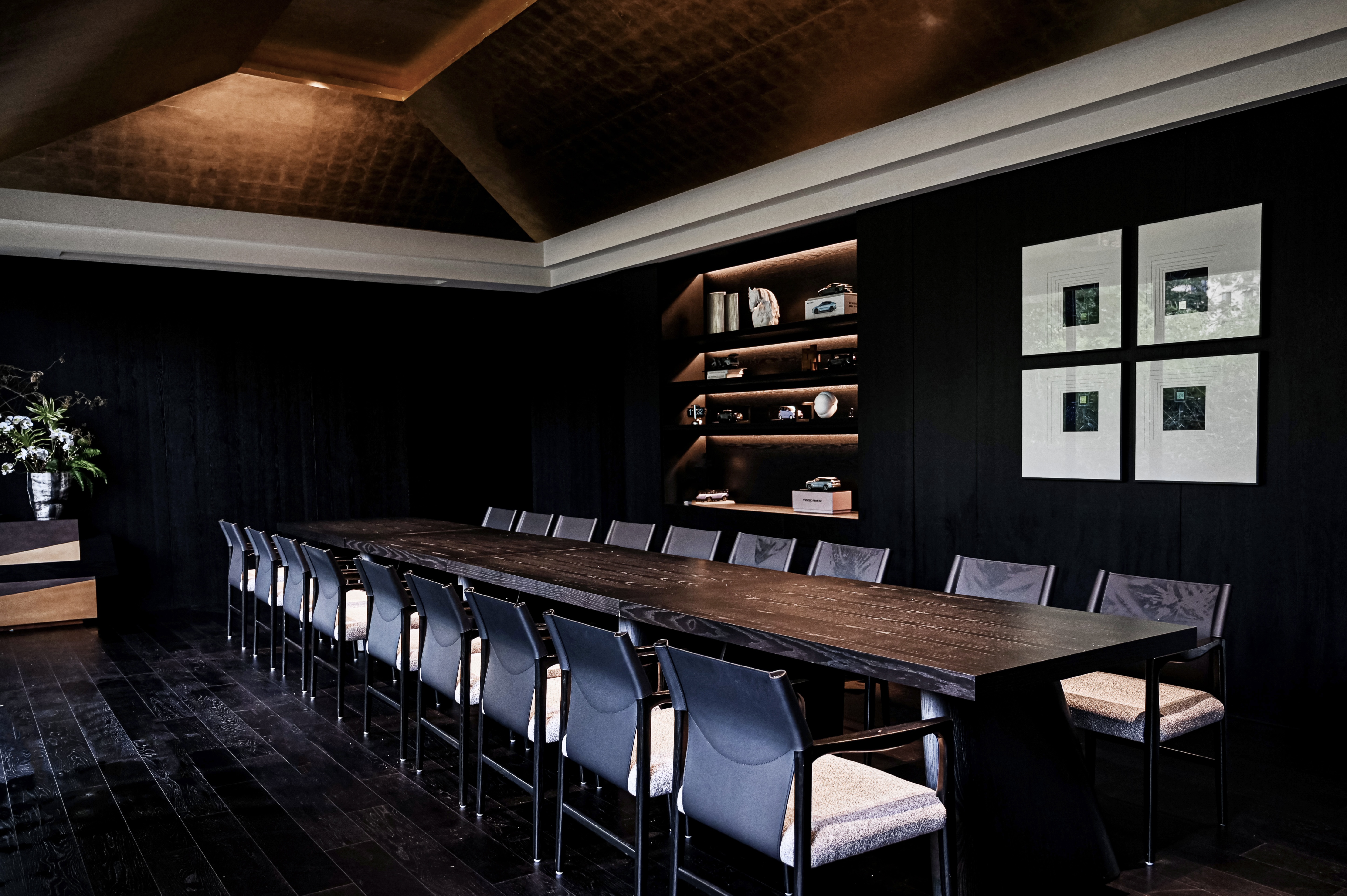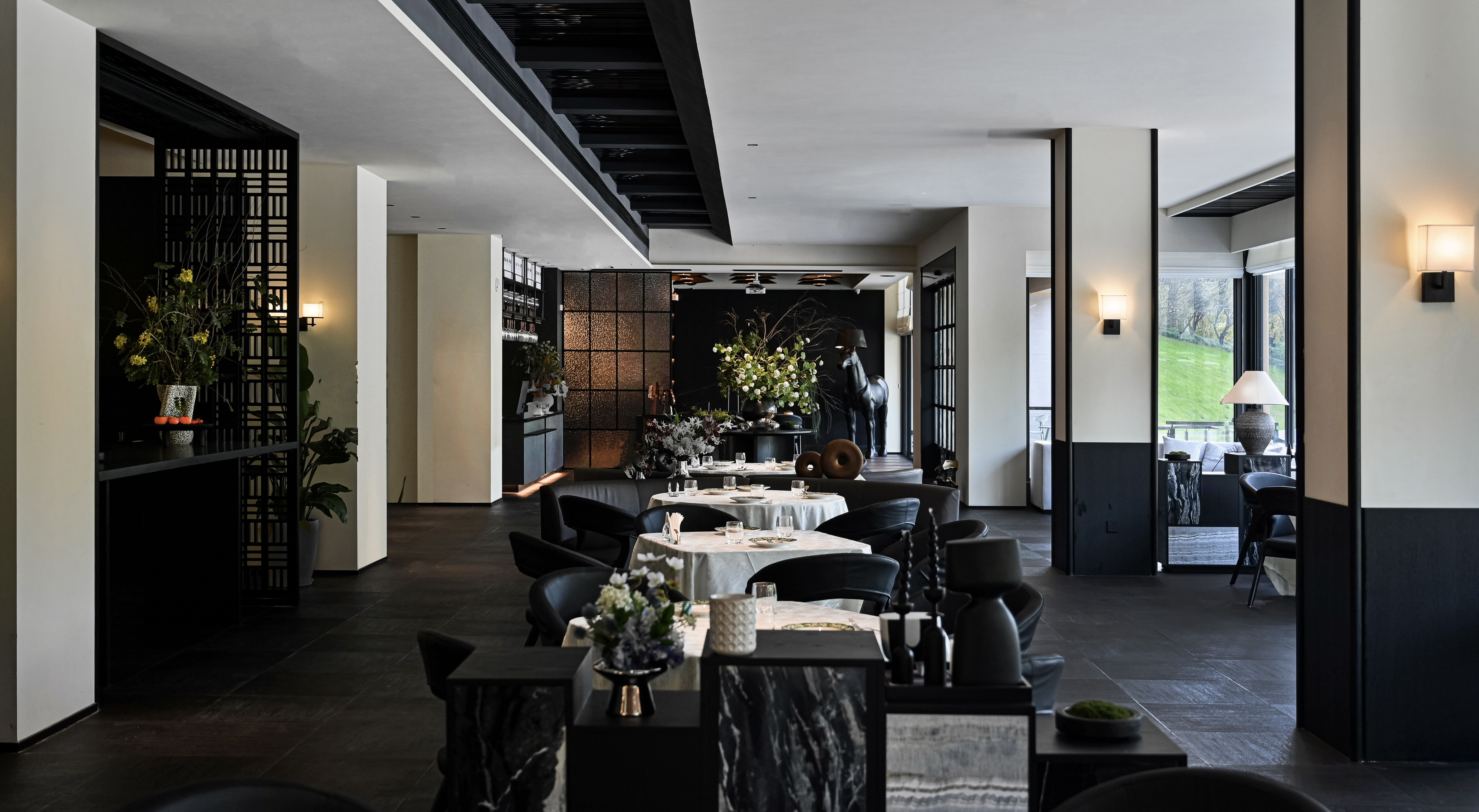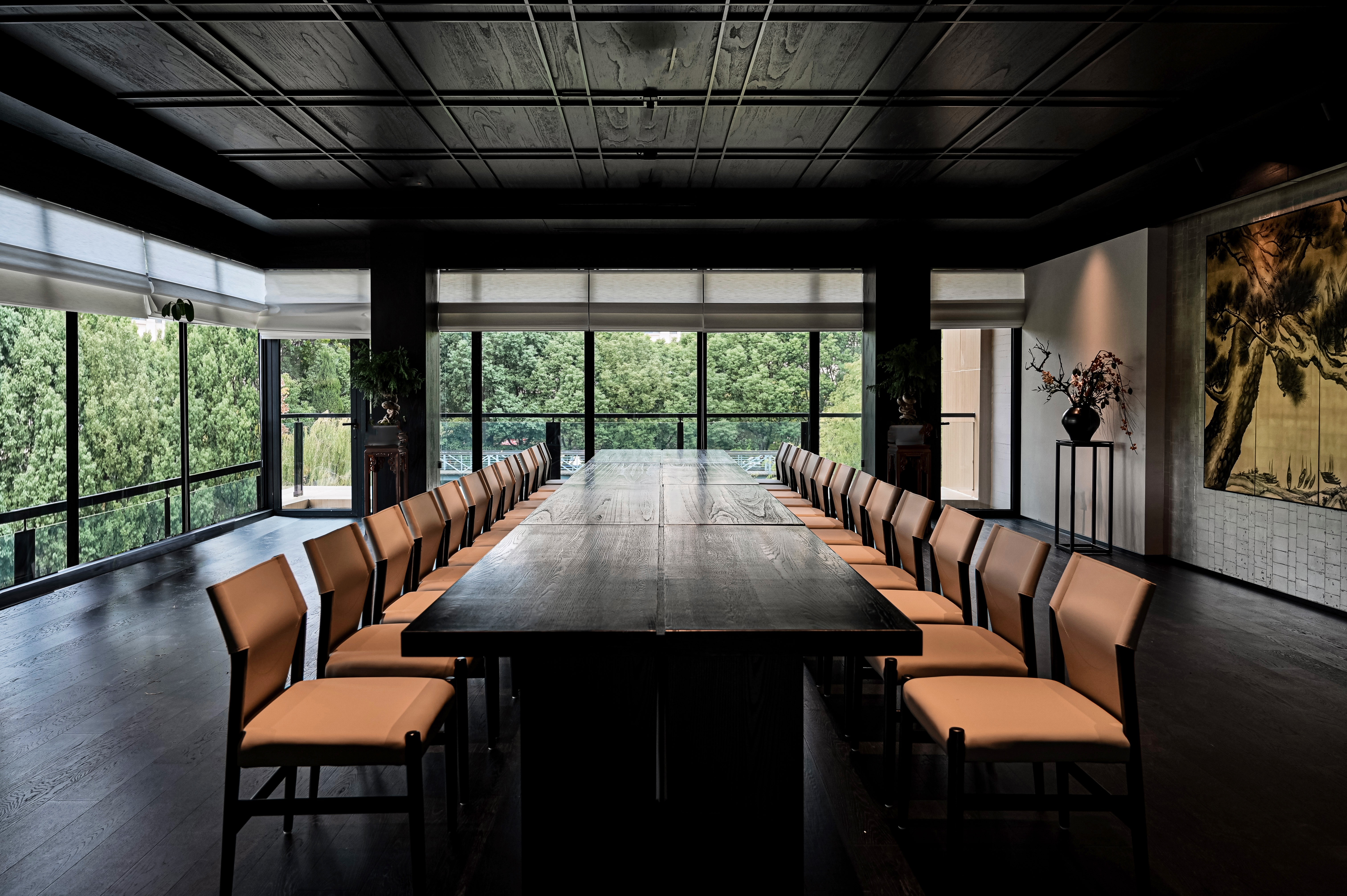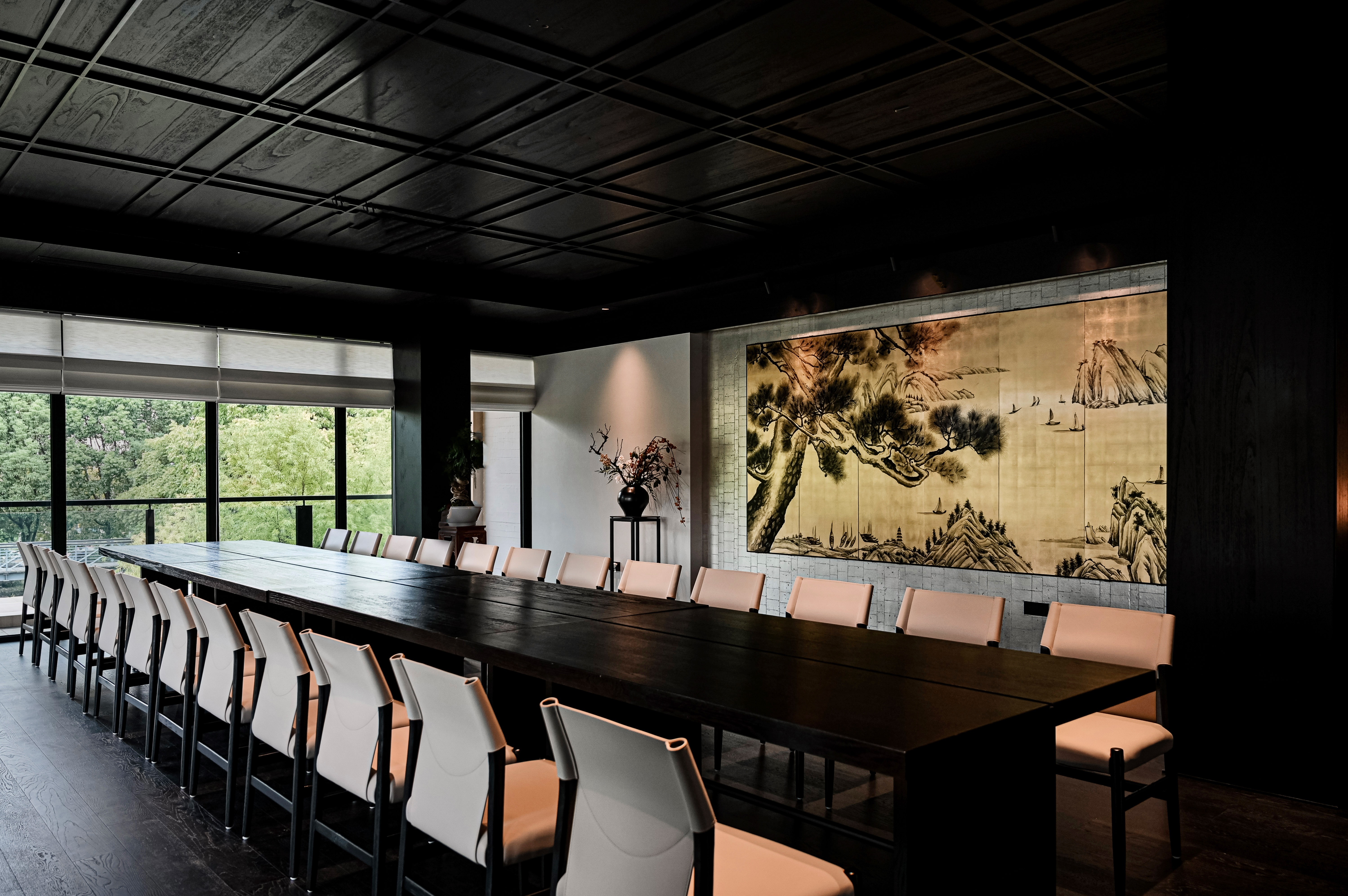 项目定位:本项目选址在所有山水间的绿飘带之称的芜湖中江公园,园内充满浓郁的自然气息。 一楼空间提取芜湖汽车,新兴产业,海绵城市,非遗,市花,市鸟等为设计元素,以现代生态为原则,并将古时常见的徽派建筑元素,以小品形式嵌入到当代建筑里、于现代感中保留了一份古韵,精致舒适的质感扑面而来。 二楼奇瑞包间以黑色为主题,两面为落地玻璃,主要突出窗外的中江公园风景,墙上画品以迎客松为前置/后场景为《天下徽商兴于鸠兹》铁画部分场景,描绘了天门山及楚江风貌,表达了广迎四方来客的热情意愿。 传统与现代糅合,空间隔而不隔,界而未界,起承转合之间传统与新潮发生奇妙碰撞与交融。 二楼国际会议厅主要材质为黑色实木、真皮和棉麻,选用深色系和麻色系,营造出高级且友好的氛围。 空间以白色浅斑驳为主,突出墙面的金箔壁画。墙上画品以鸠兹鸟元素融入手绘创作,绿色湖泽之上的花叶浓荫里,和窗外的中江公园景色呼应,体现一片安宁、美好的景象。 红酒品鉴区墙上画品以奇瑞四款经典车型(捷途旅行者、星途遥光、艾瑞泽8、瑞虎8)侧影作为创作元素,用明亮的色彩、简单的线条和几何阵列,契合奇瑞人自立、自强、创新的企业精神。 一楼独立包间以原木为主体,墙面画作以中江塔剪影融入创作元素,表达了“江上芙蓉”历百年风雨沧桑,仍屹立风云江口,独显其身的坚毅精神。 廊下松月,石上苔痕,一步一景,与自然万物紧紧相扣。环境被足够尊重,本次项目亦报以隐秘之美,两者相得益彰、相映成趣。 同时将建筑作为新的景致编织入环境,形成另一方诗境。