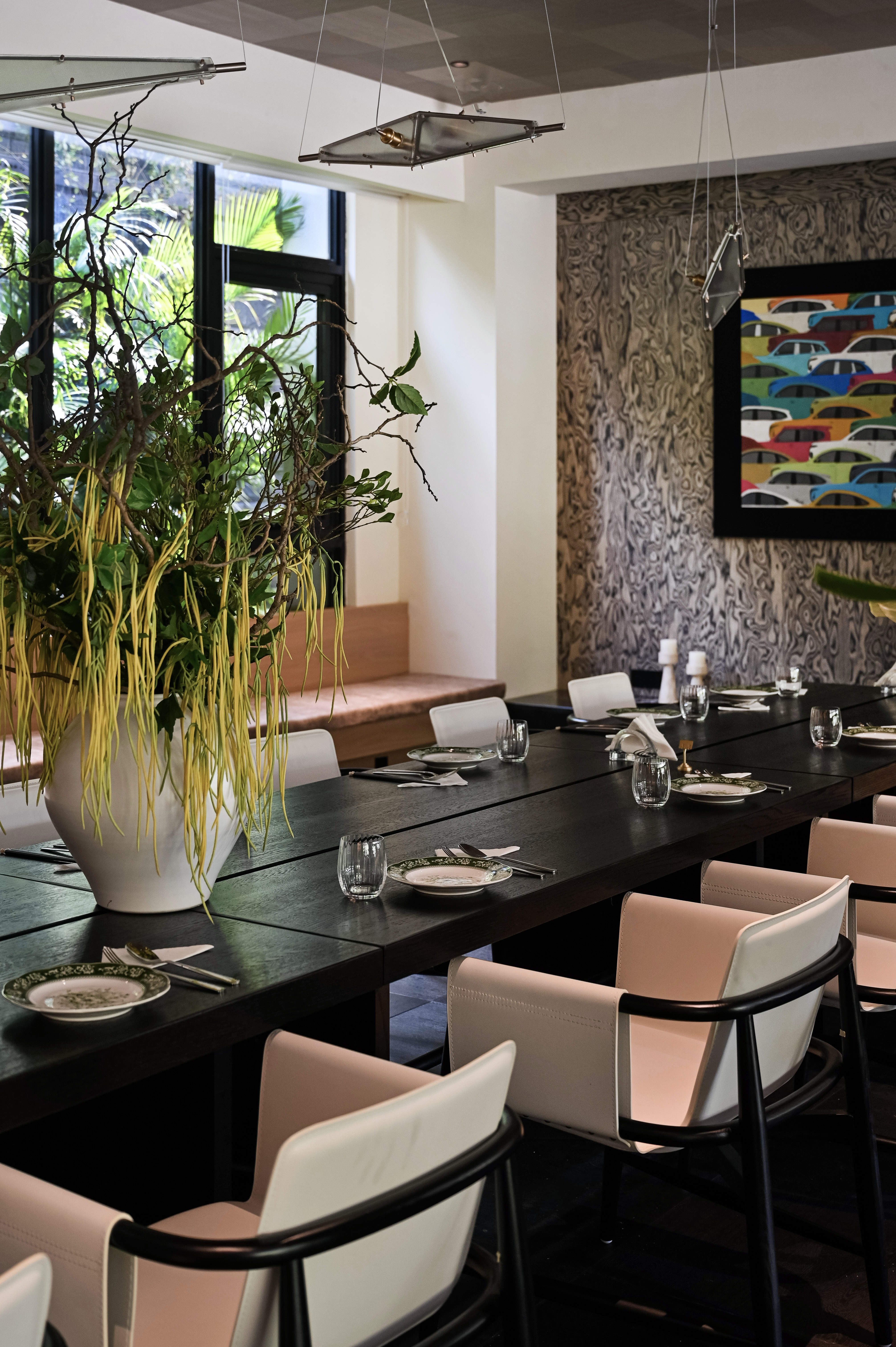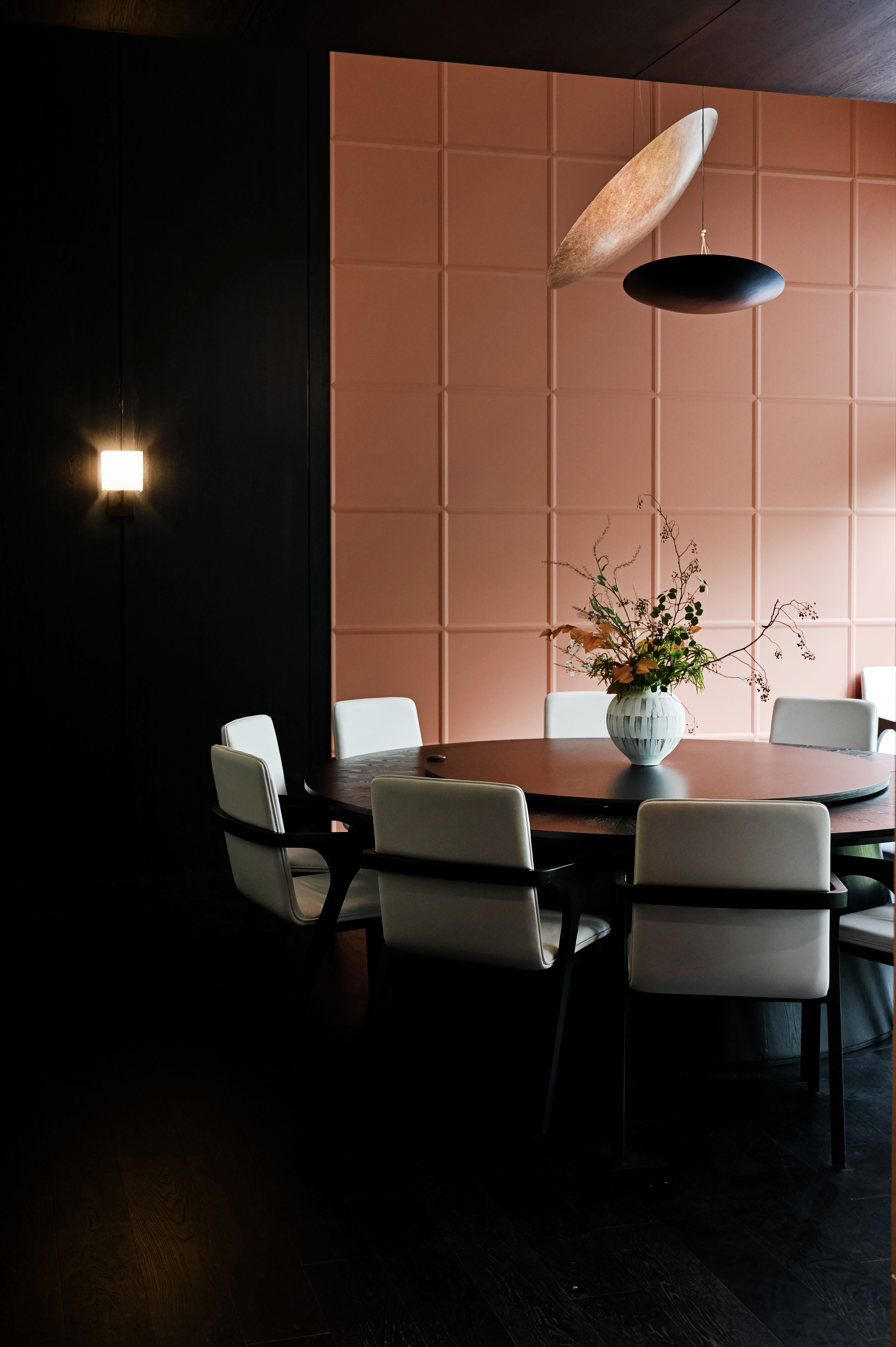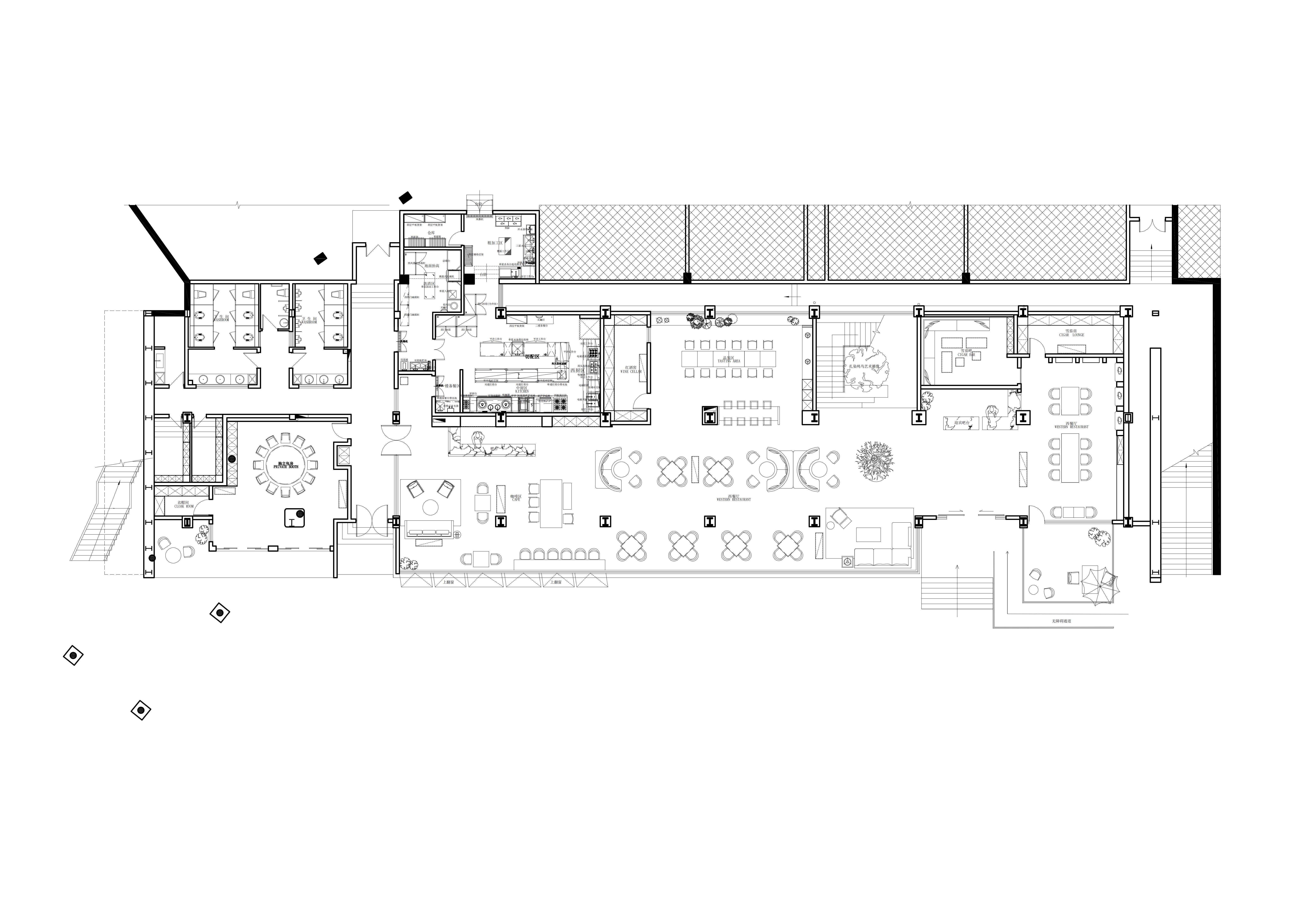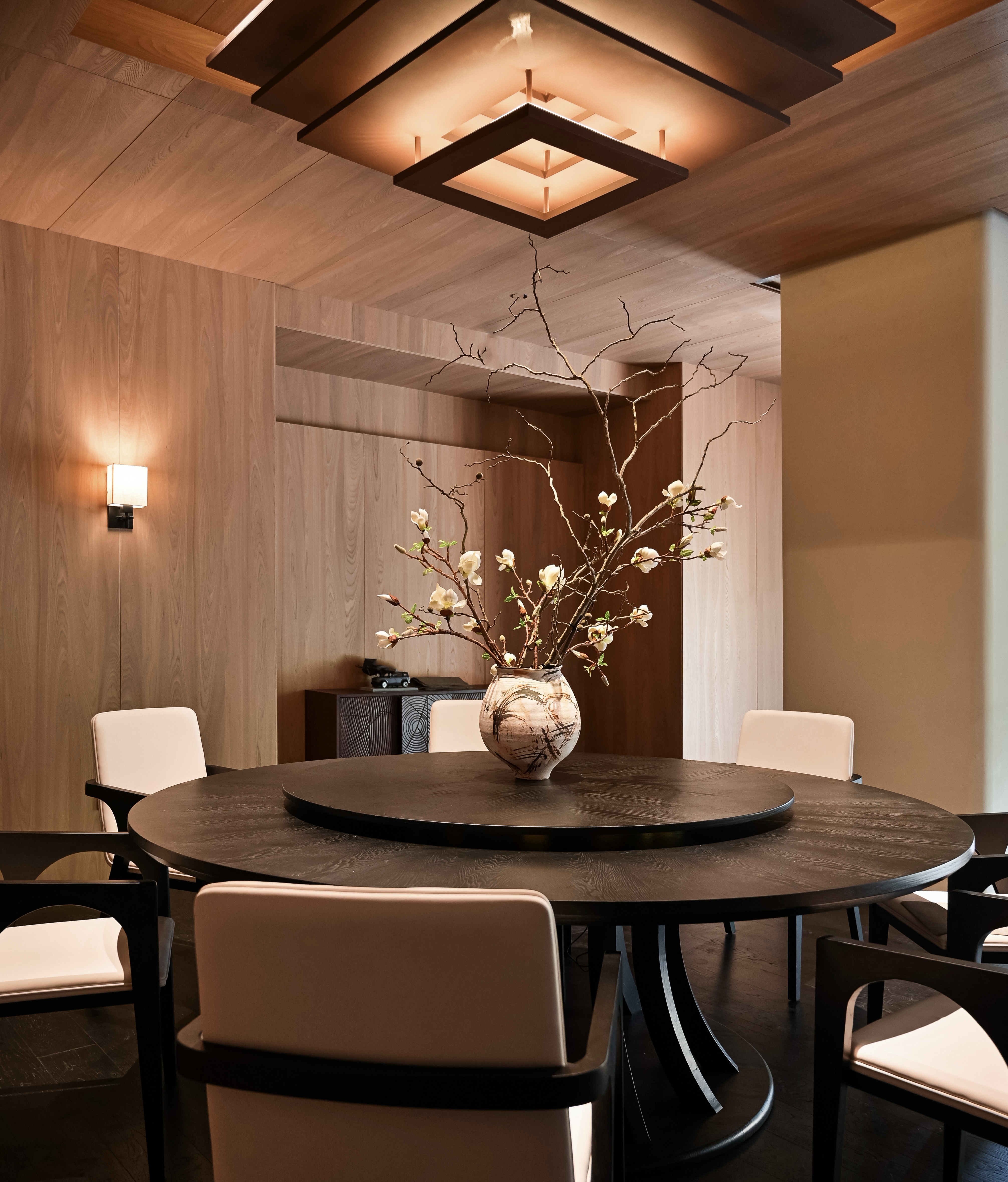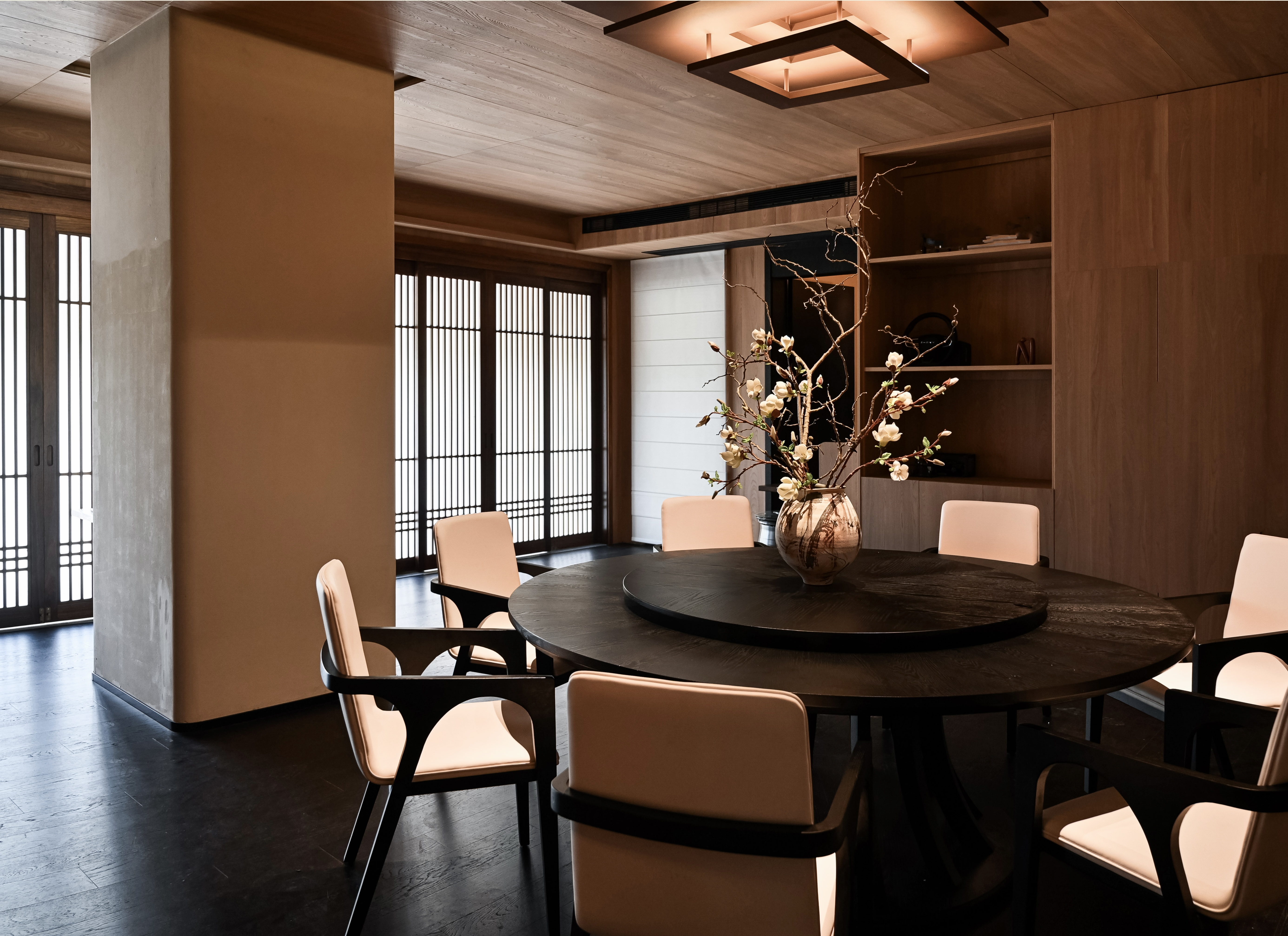项目定位:本项目选址在所有山水间的绿飘带之称的芜湖中江公园,园内充满浓郁的自然气息。 一楼空间提取芜湖汽车,新兴产业,海绵城市,非遗,市花,市鸟等为设计元素,以现代生态为原则,并将古时常见的徽派建筑元素,以小品形式嵌入到当代建筑里、于现代感中保留了一份古韵,精致舒适的质感扑面而来。 二楼奇瑞包间以黑色为主题,两面为落地玻璃,主要突出窗外的中江公园风景,墙上画品以迎客松为前置/后场景为《天下徽商兴于鸠兹》铁画部分场景,描绘了天门山及楚江风貌,表达了广迎四方来客的热情意愿。 传统与现代糅合,空间隔而不隔,界而未界,起承转合之间传统与新潮发生奇妙碰撞与交融。 二楼国际会议厅主要材质为黑色实木、真皮和棉麻,选用深色系和麻色系,营造出高级且友好的氛围。 空间以白色浅斑驳为主,突出墙面的金箔壁画。墙上画品以鸠兹鸟元素融入手绘创作,绿色湖泽之上的花叶浓荫里,和窗外的中江公园景色呼应,体现一片安宁、美好的景象。 红酒品鉴区墙上画品以奇瑞四款经典车型(捷途旅行者、星途遥光、艾瑞泽8、瑞虎8)侧影作为创作元素,用明亮的色彩、简单的线条和几何阵列,契合奇瑞人自立、自强、创新的企业精神。 一楼独立包间以原木为主体,墙面画作以中江塔剪影融入创作元素,表达了“江上芙蓉”历百年风雨沧桑,仍屹立风云江口,独显其身的坚毅精神。 廊下松月,石上苔痕,一步一景,与自然万物紧紧相扣。环境被足够尊重,本次项目亦报以隐秘之美,两者相得益彰、相映成趣。 同时将建筑作为新的景致编织入环境,形成另一方诗境。