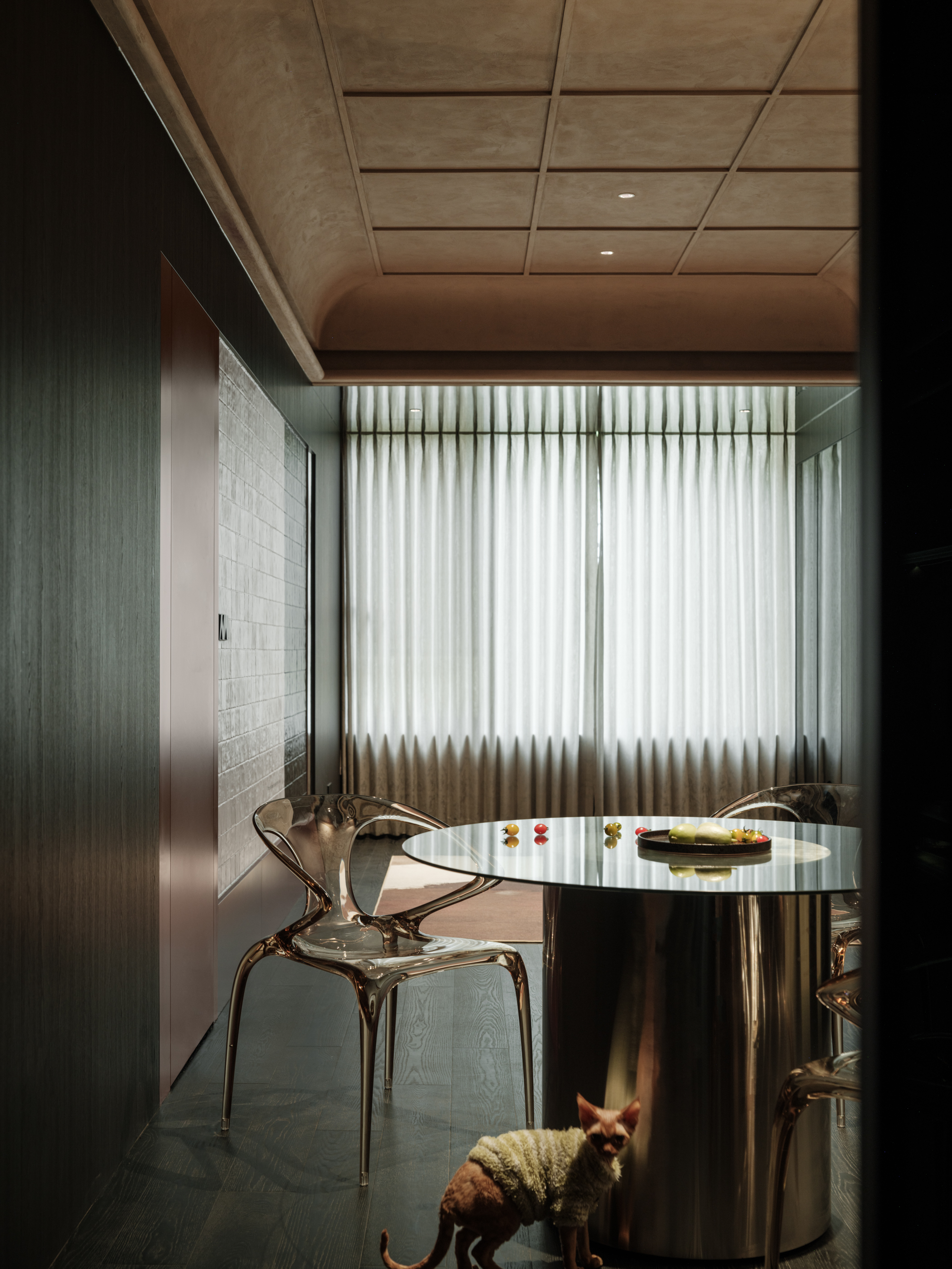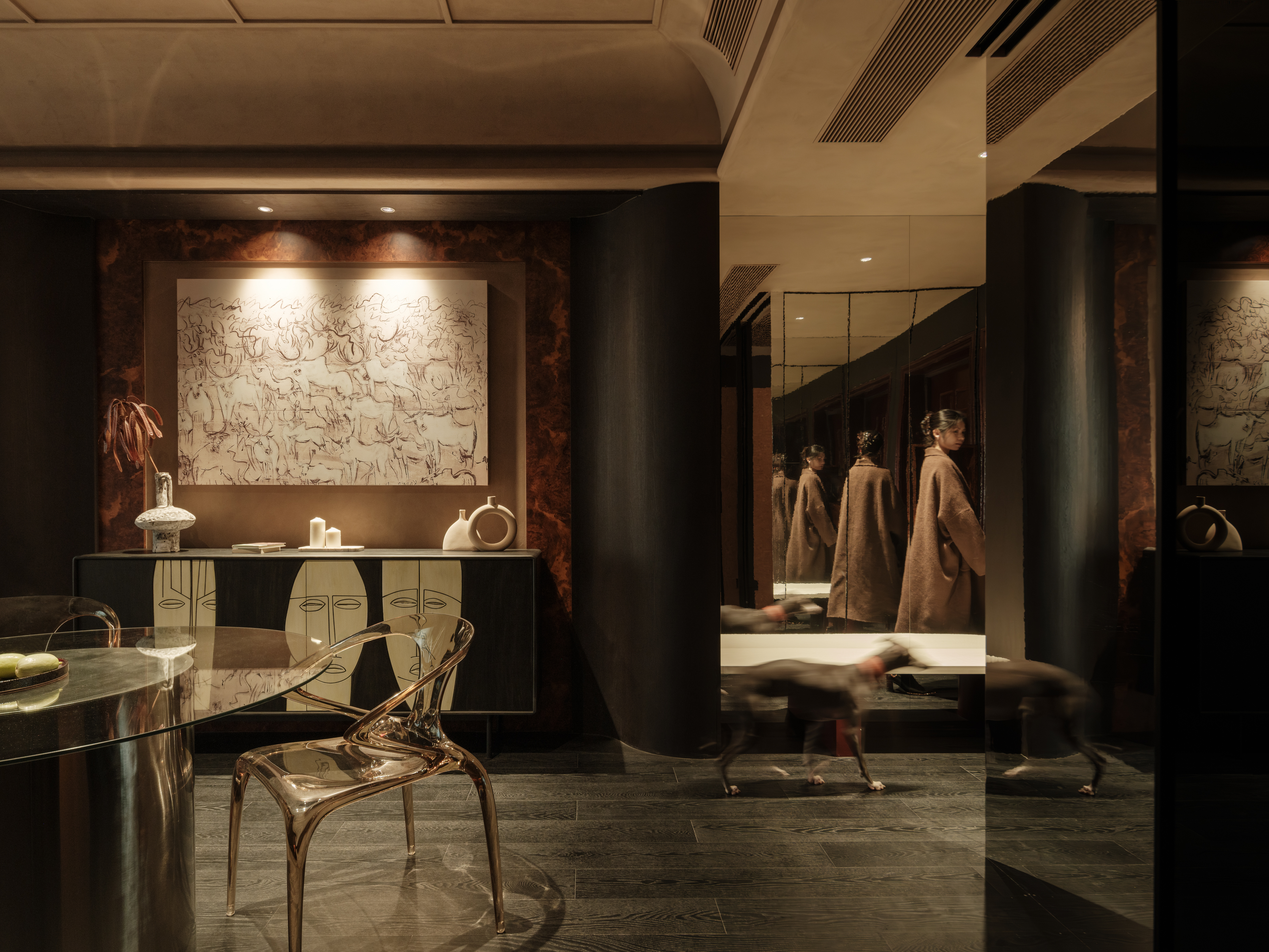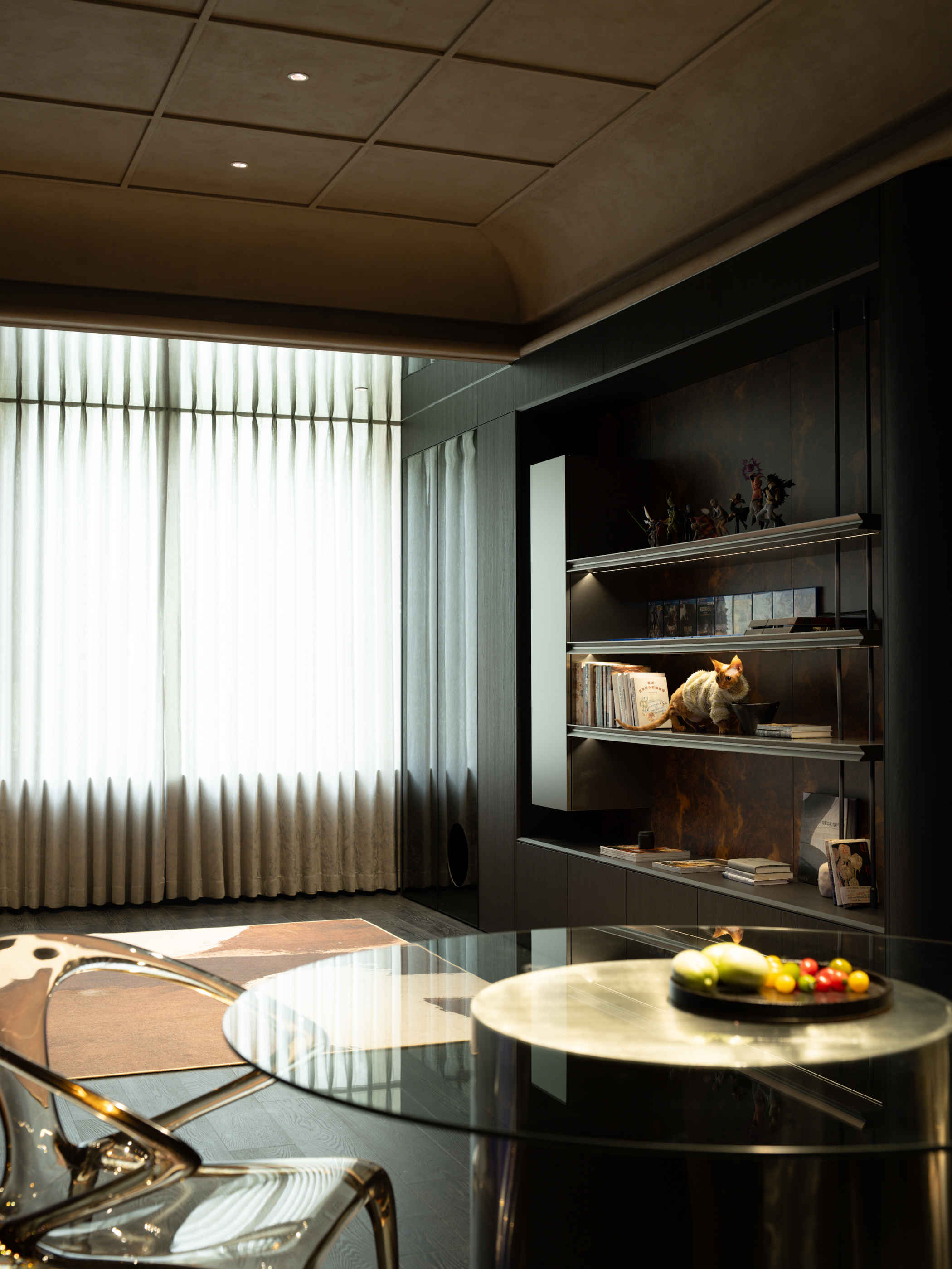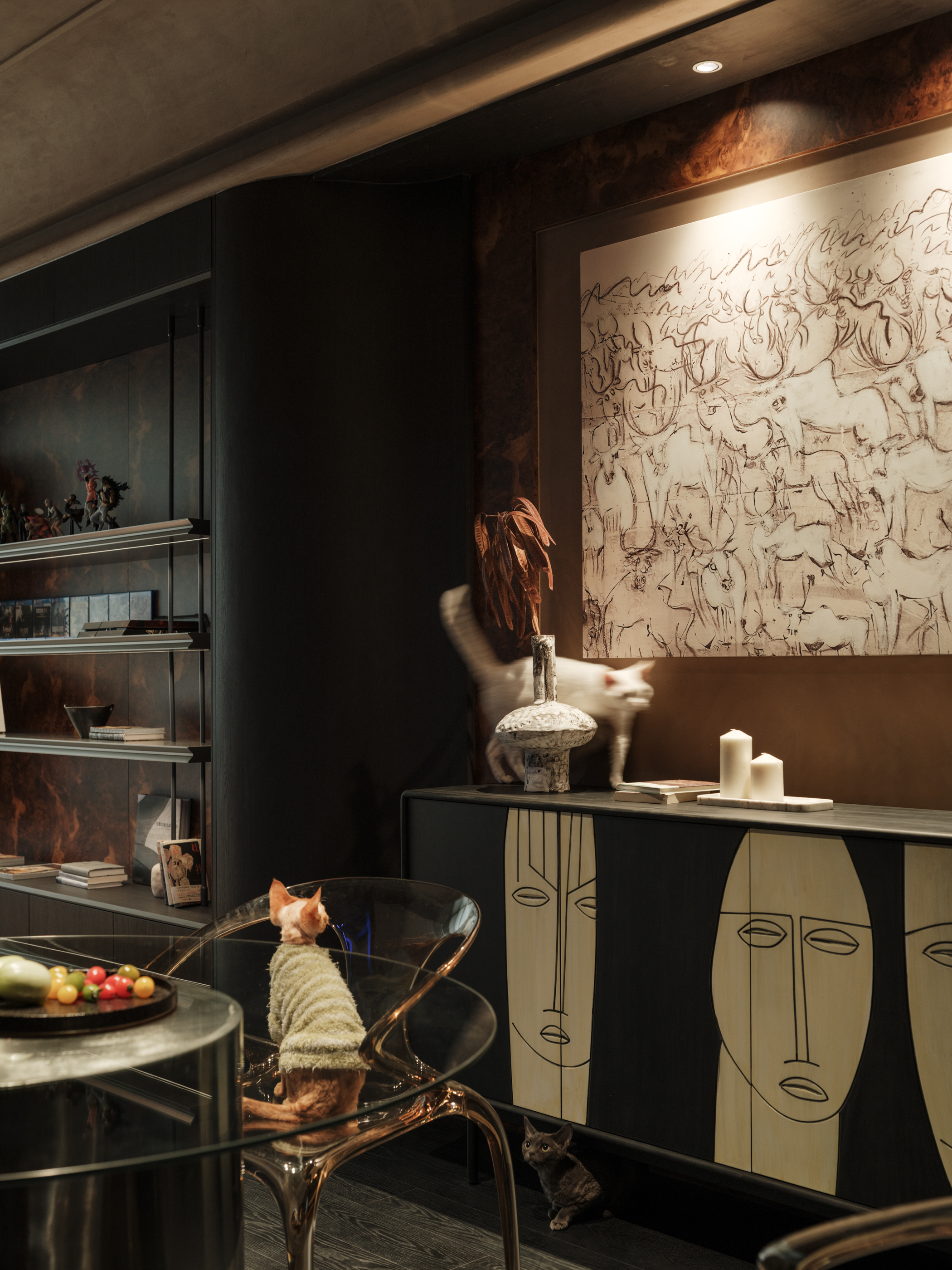 项目定位:以“暗黑轻奢+宠物共生”为设计内核,打破传统暗黑系空间的冷硬感,将宠物的陪伴属性与高端轻奢的材质、艺术化的设计语言融合,打造“人宠共居的艺术奢宅”。