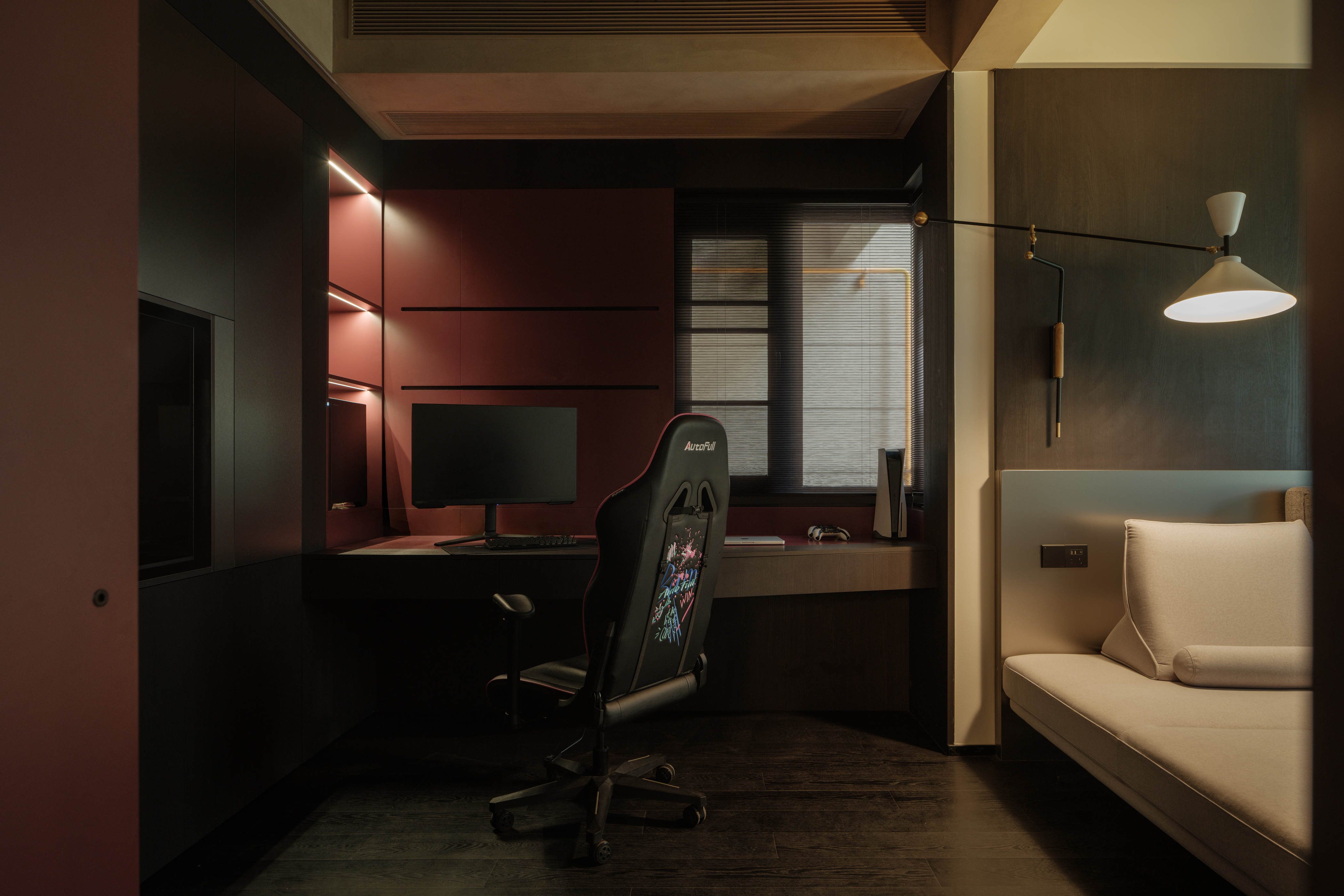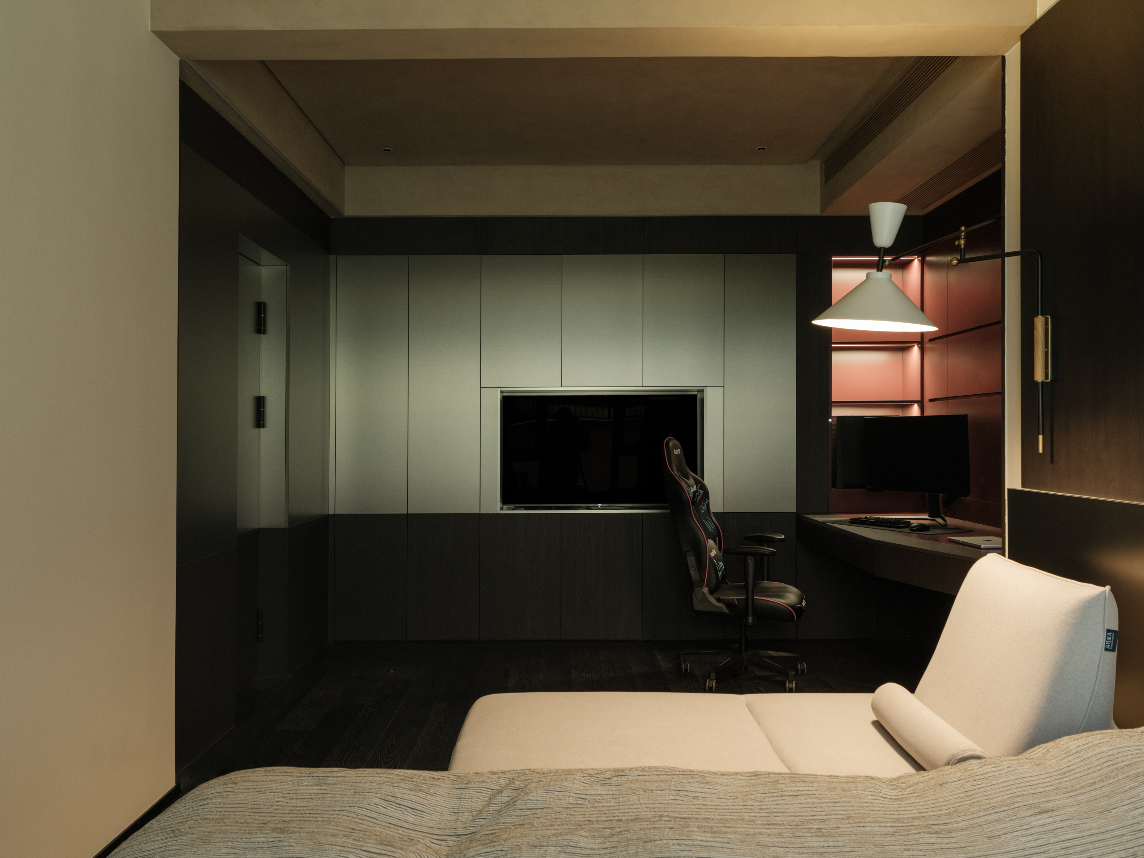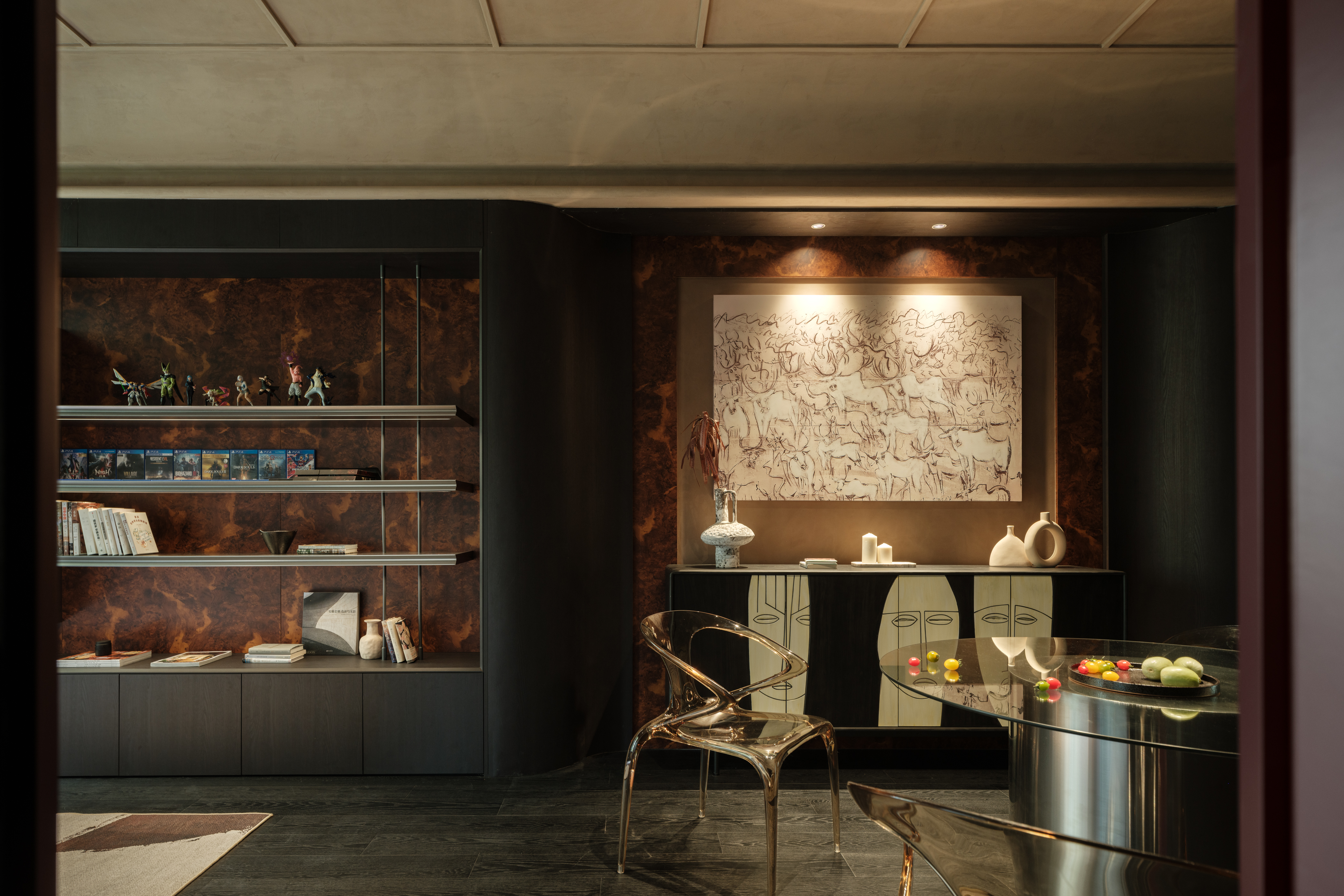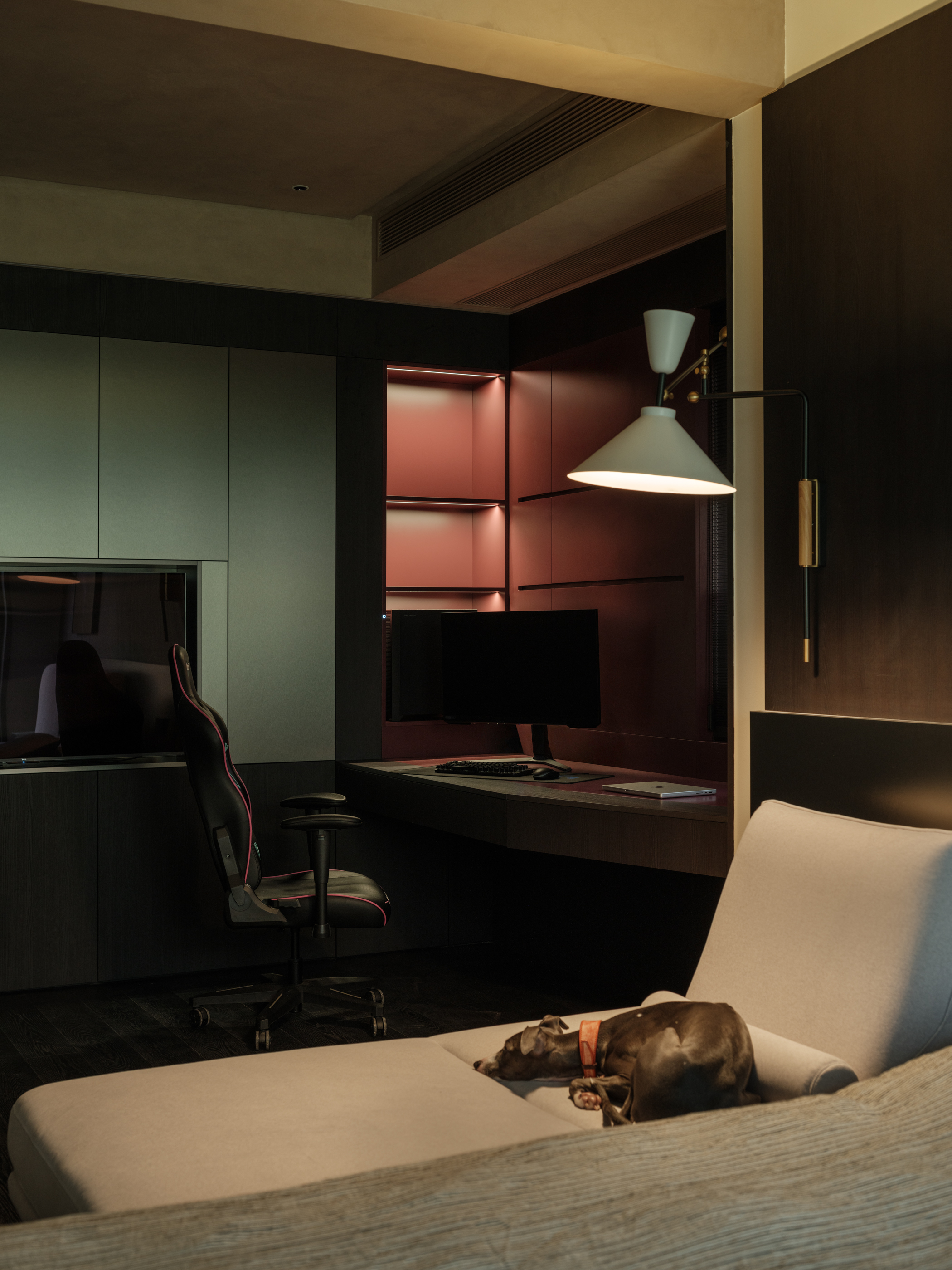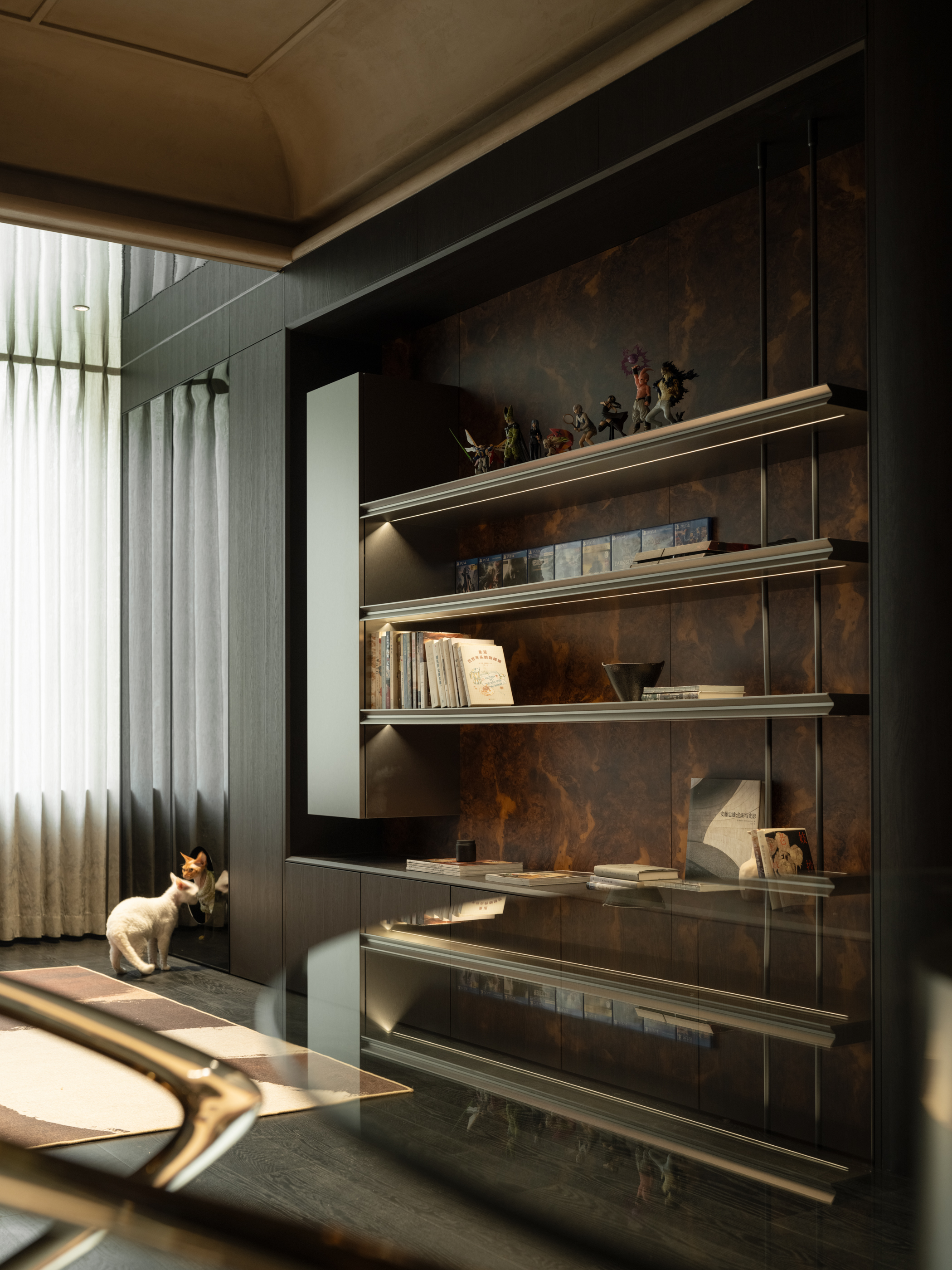空间意境:打破传统暗黑系空间的冷硬刻板印象,以深黑木作、金属漆材质为基底,融入宠物活动的柔和动线与休憩角落,用暖调嵌入式灯光、艺术织物软装中和暗黑调的冷峻,让轻奢质感与宠物陪伴的温馨感形成碰撞与融合,赋予暗黑风格“有温度的奢华”。