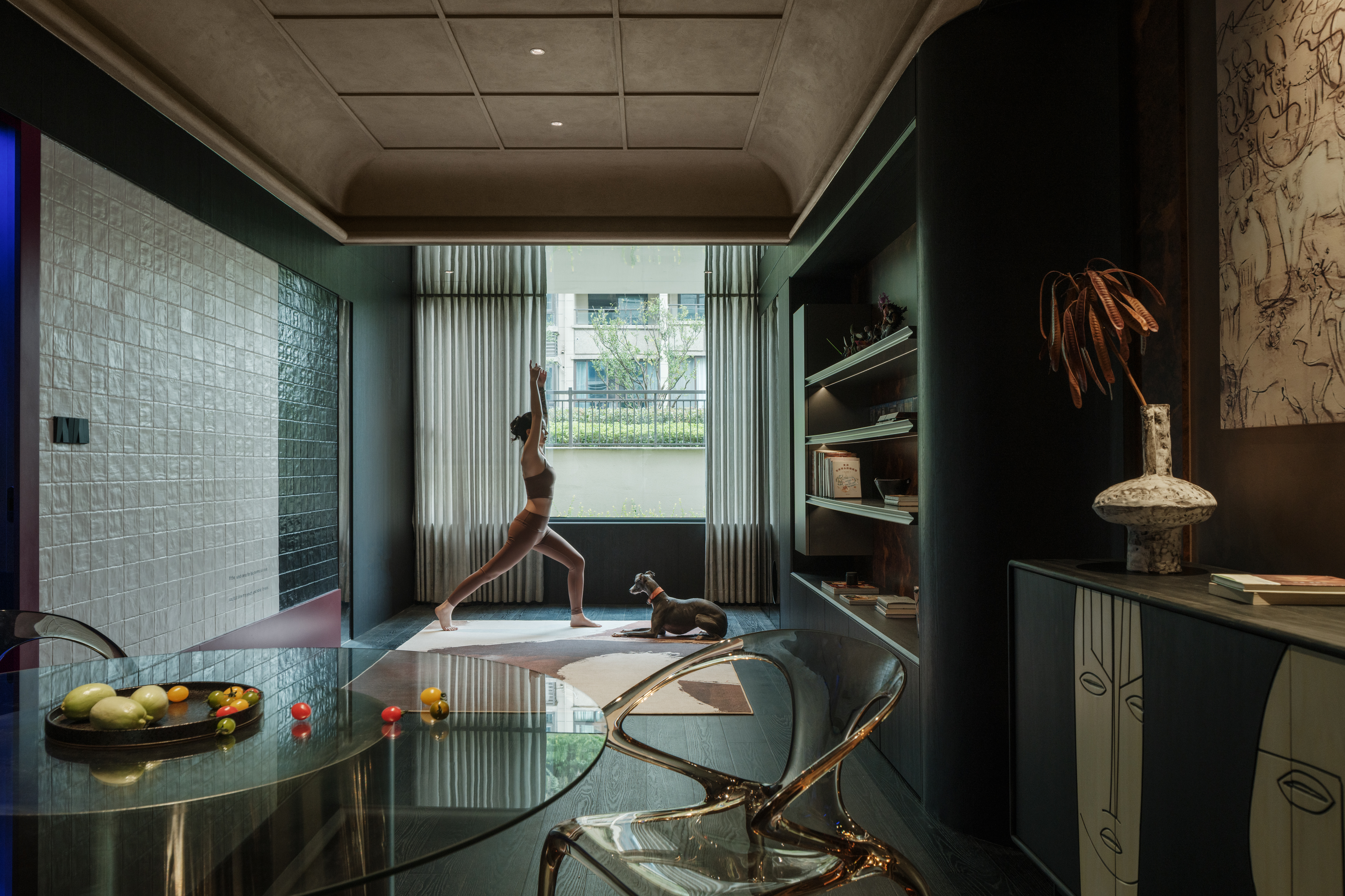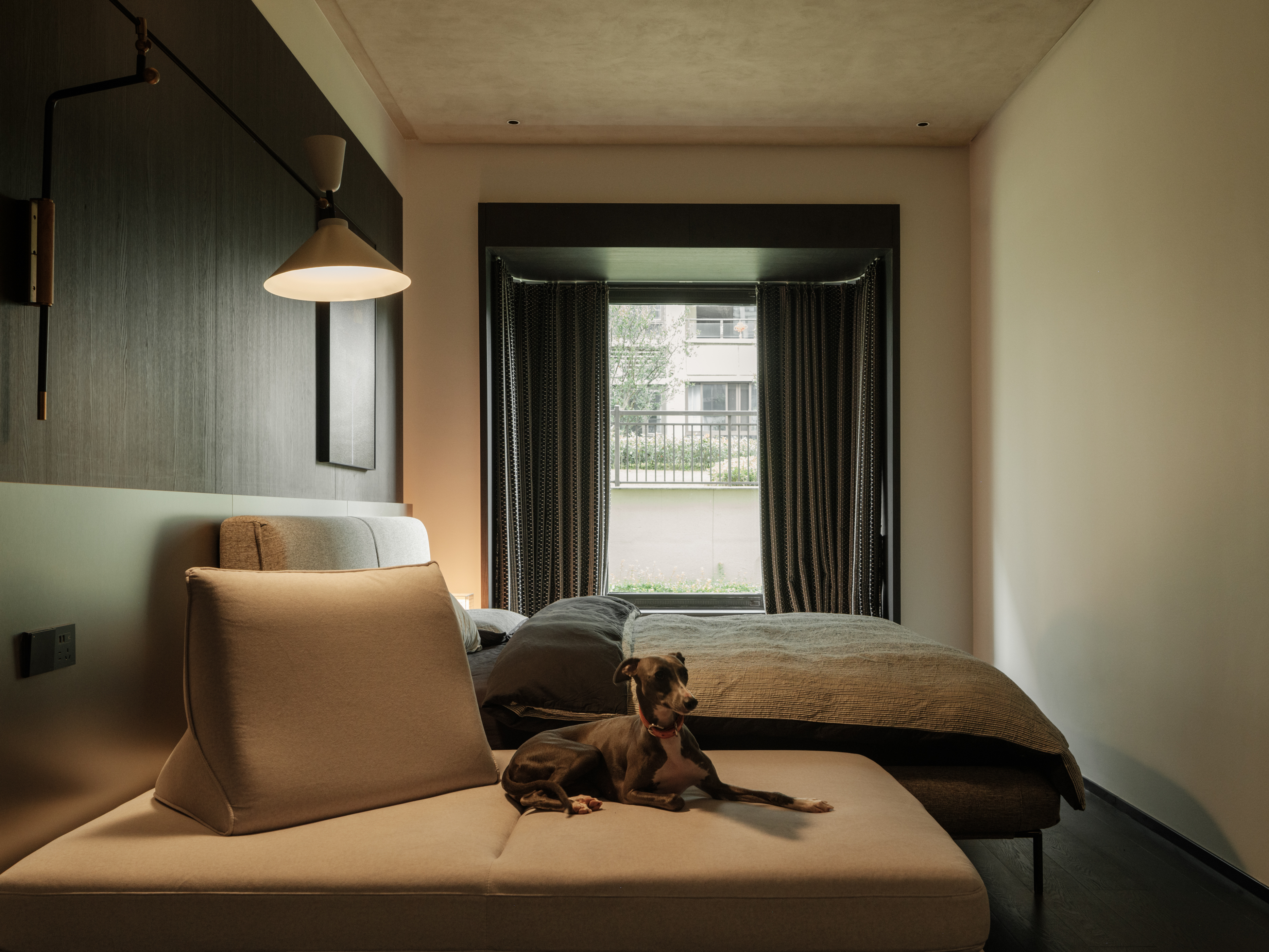空间布局:摒弃“宠物区域独立分割”的常规思路,将宠物活动轨迹自然融入空间功能分区——瑜伽区旁设宠物垫、餐区玻璃桌下留宠物穿梭空间、卧室边柜打造内嵌式宠物窝,使宠物空间与人类活动区无缝衔接,既保持空间整体的艺术完整性,又实现人宠互动的日常化。
