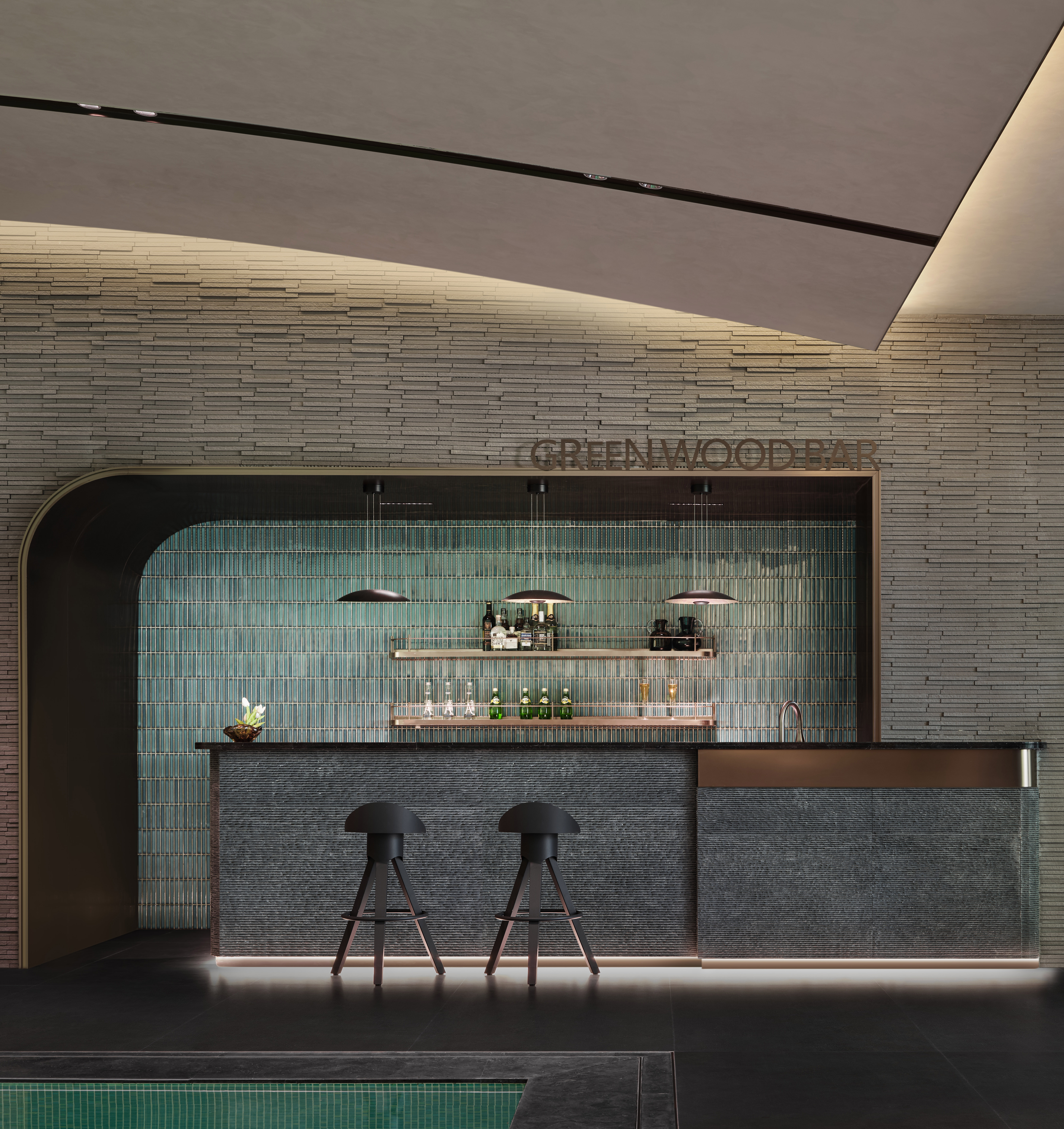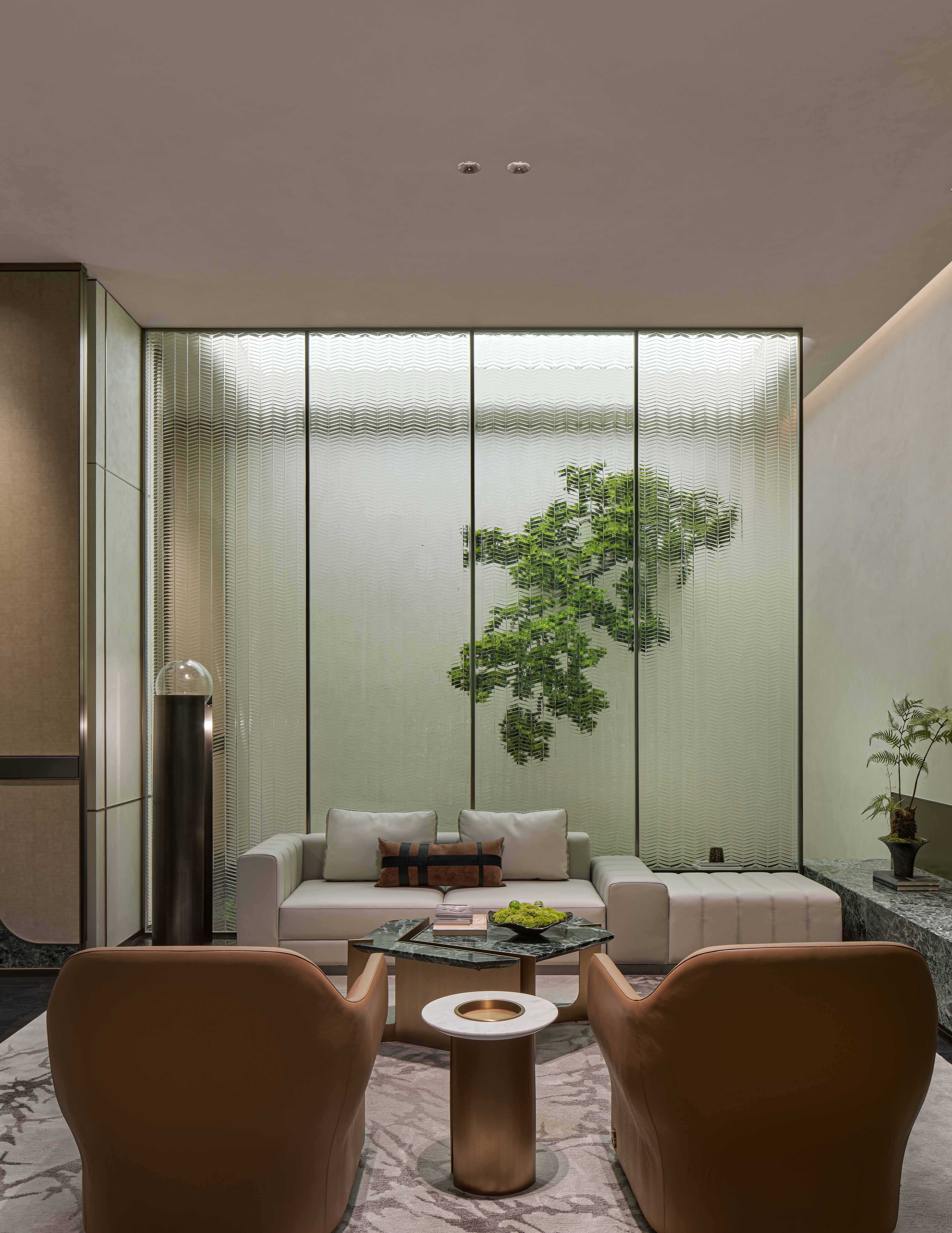 设计选材:以"内外共生"为理念,肌理物纹景墙与大落地玻璃幕墙虚实相生,让庭院的四季光影与室内绿意渗透交融。