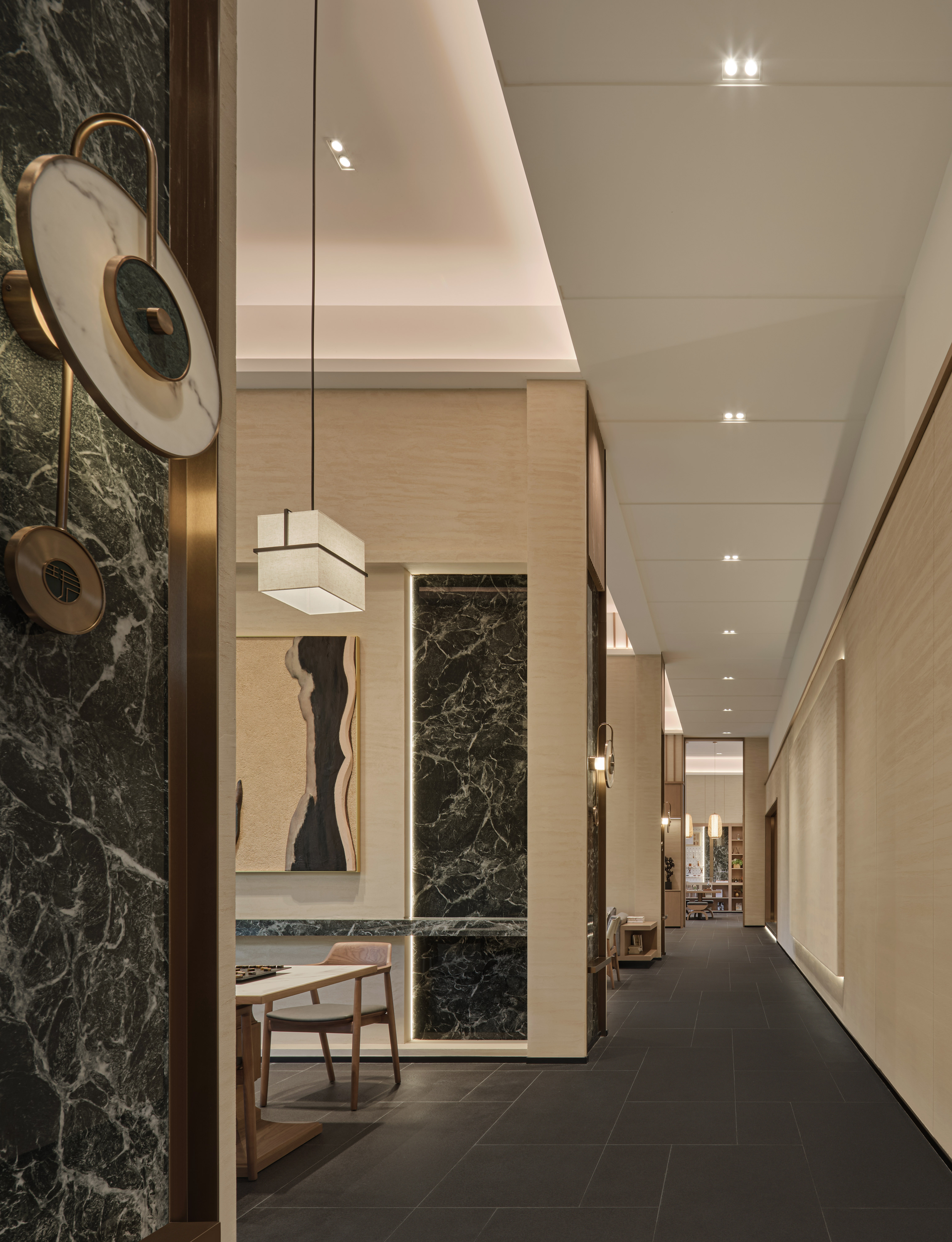 空间意境:结合天珺品牌文化与精神内涵,将玉石的温润通透质感与色彩韵律注入空间,塑造流动的东方美学意境。