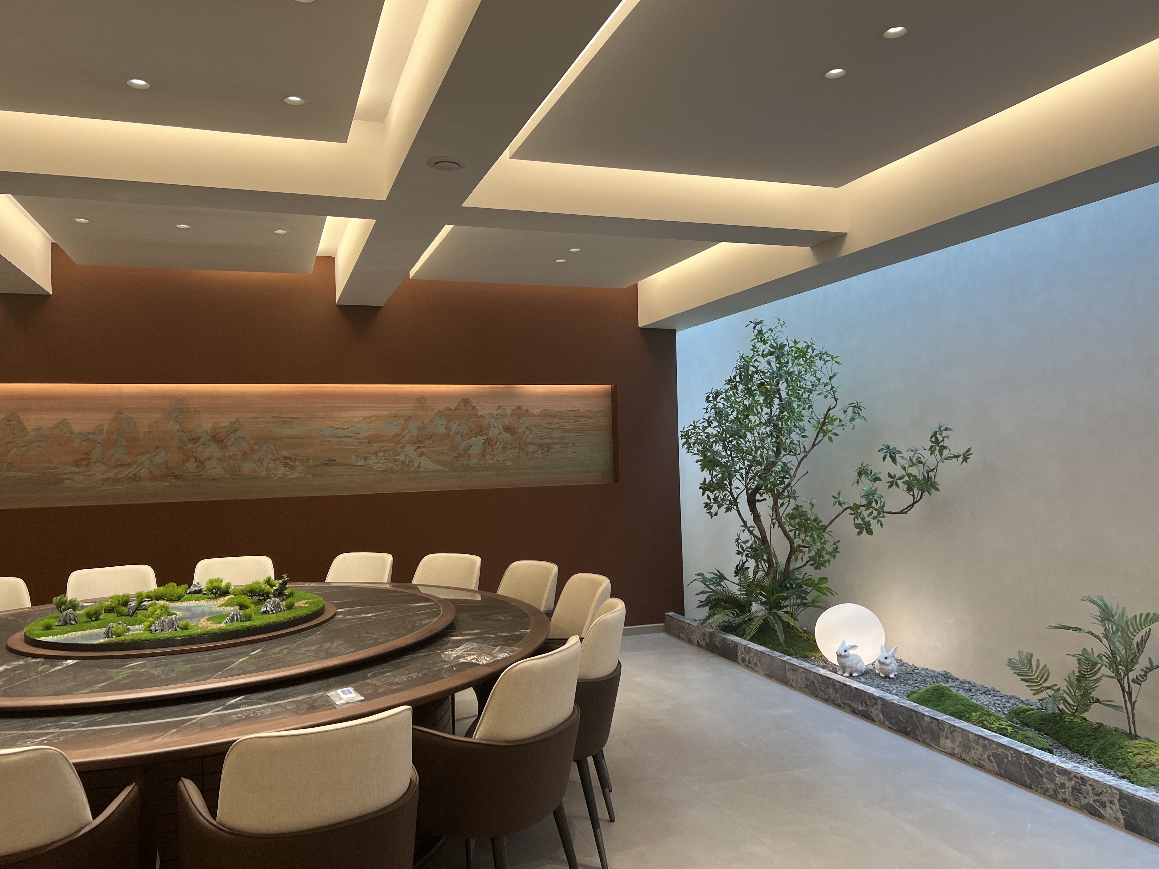 背景墙处打造嵌入式绿植造景区,以仿真乔木、苔藓、石子等模拟自然生态,成为宴请与休闲区的视觉过渡,也为商务空间注入自然生机。