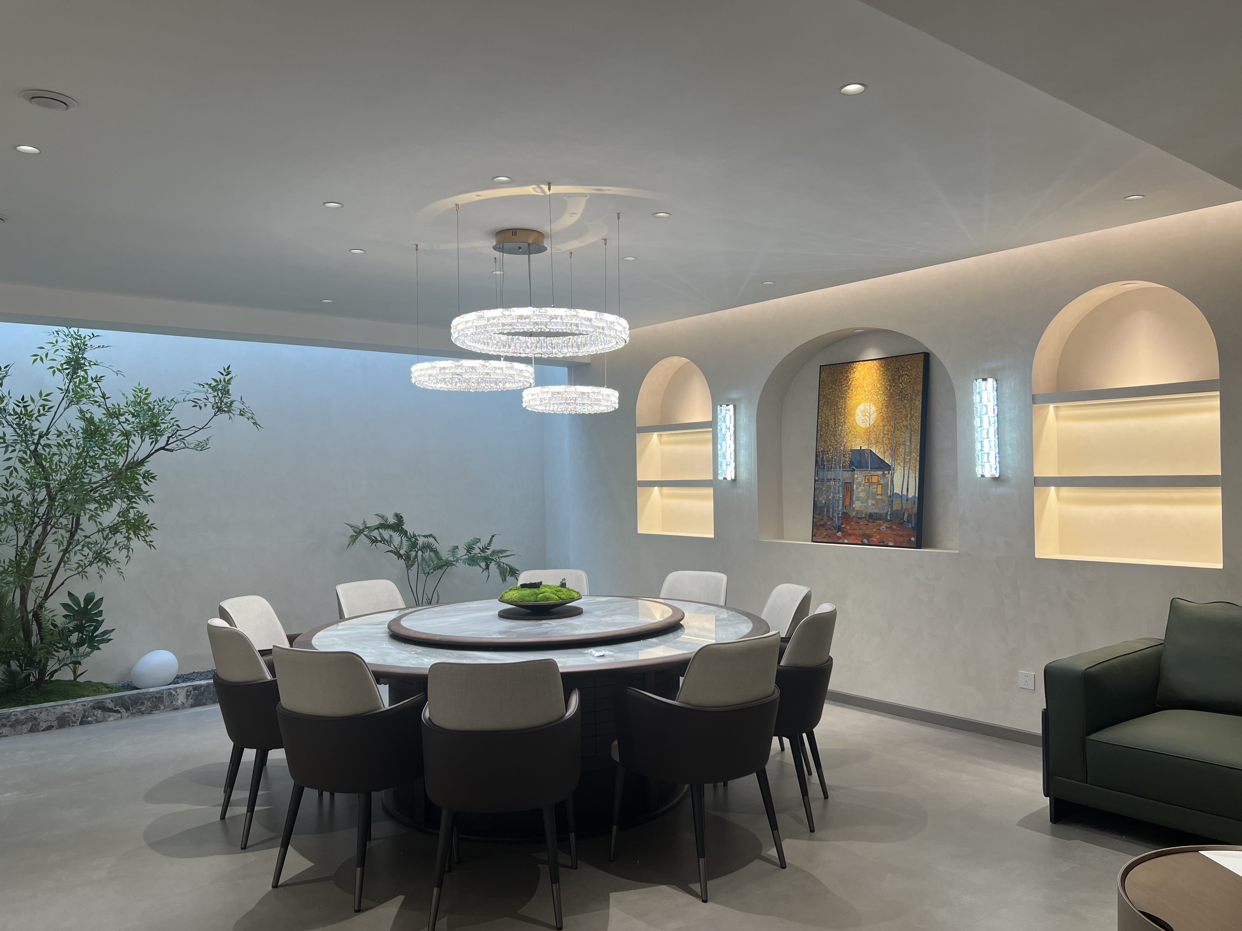 以极简的硬装线条、柔和的肌理墙面构建空间基底,搭配水晶吊灯、灯带等轻奢元素提升品质感,同时植入自然绿植与艺术画作,弱化纯商务宴请的刻板感,营造优雅且有温度的社交氛围。