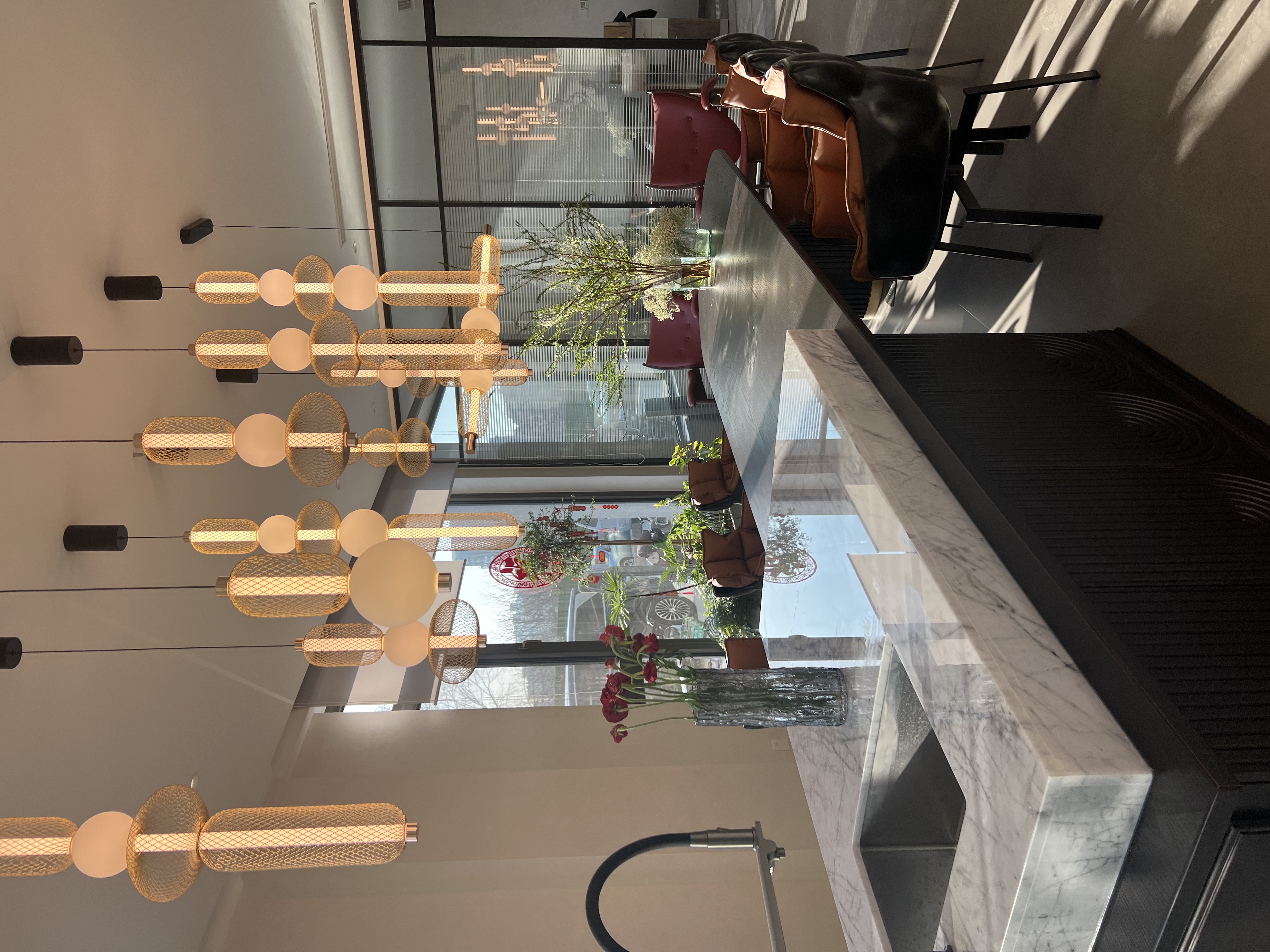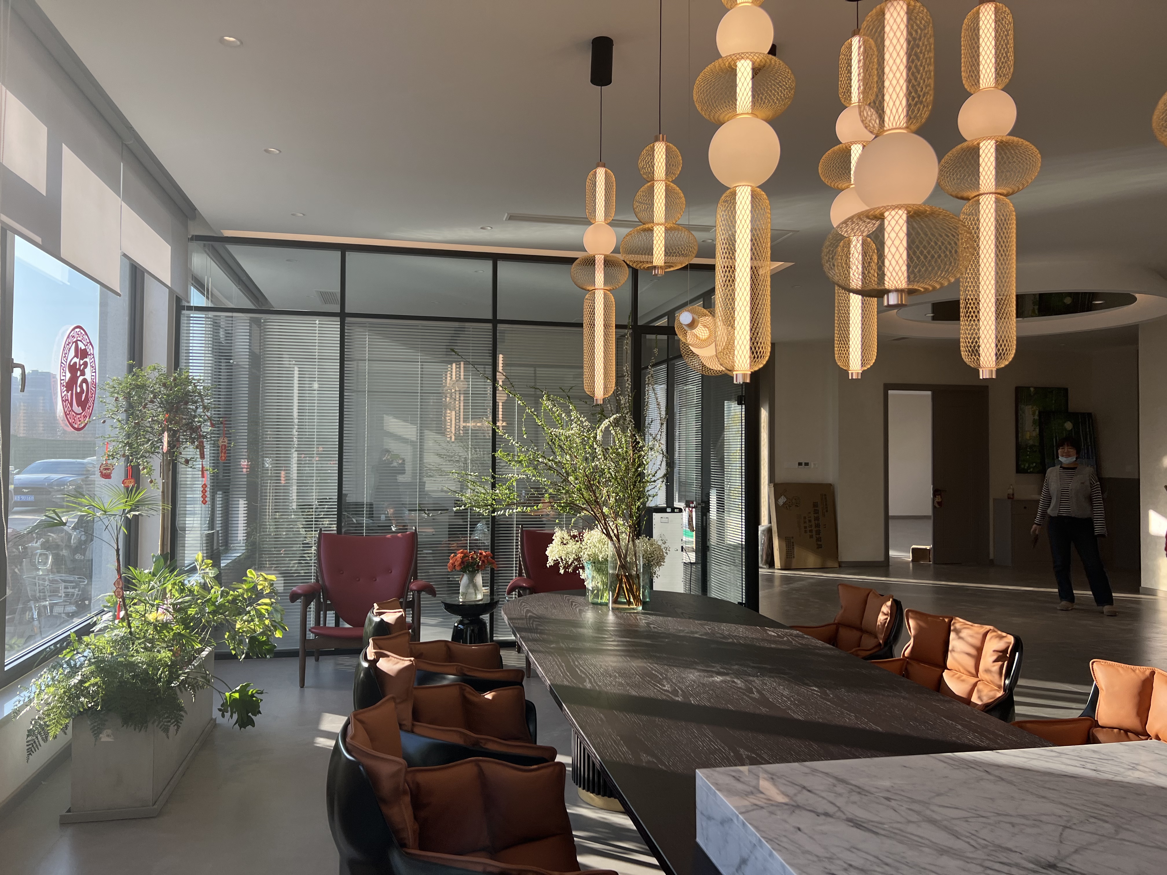 接待区顶部悬挂艺术感金属吊灯,以暖光营造温馨的待客氛围。
