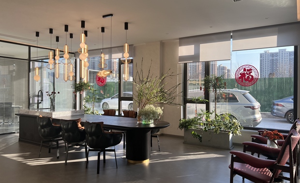 依托大面积落地窗打造绿植造景区,以高大乔木与花艺造景软化建筑外立面的生硬感,同时引入充足的自然光线,改善办公空间的生态体验。软装上以红色、黑色为主色调,搭配高质感绒布沙发、云朵造型茶几、艺术摆件等弱化传统办公空间的压迫感,增强休闲氛围,环节办公压力,提升空间的艺术品味。