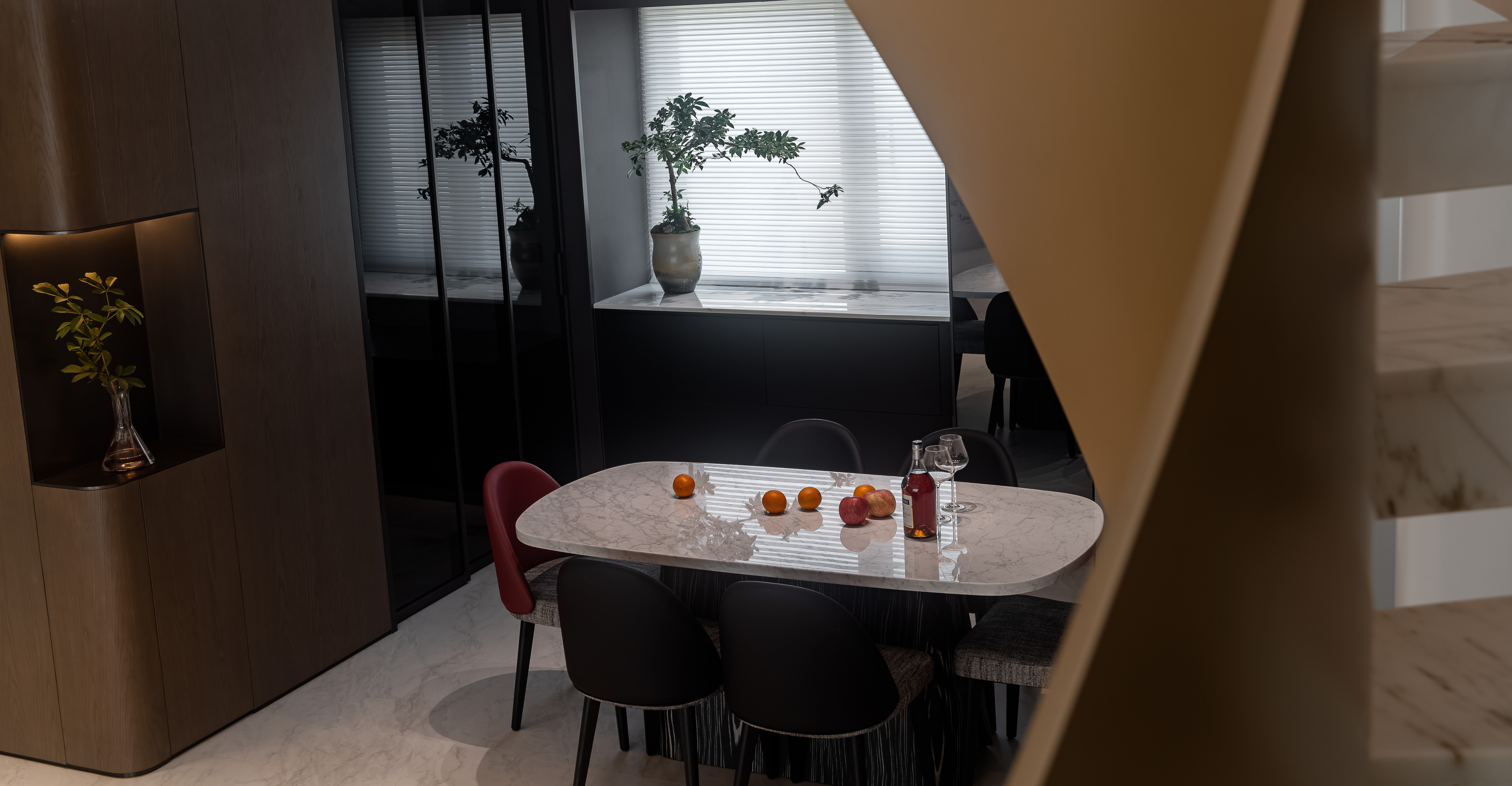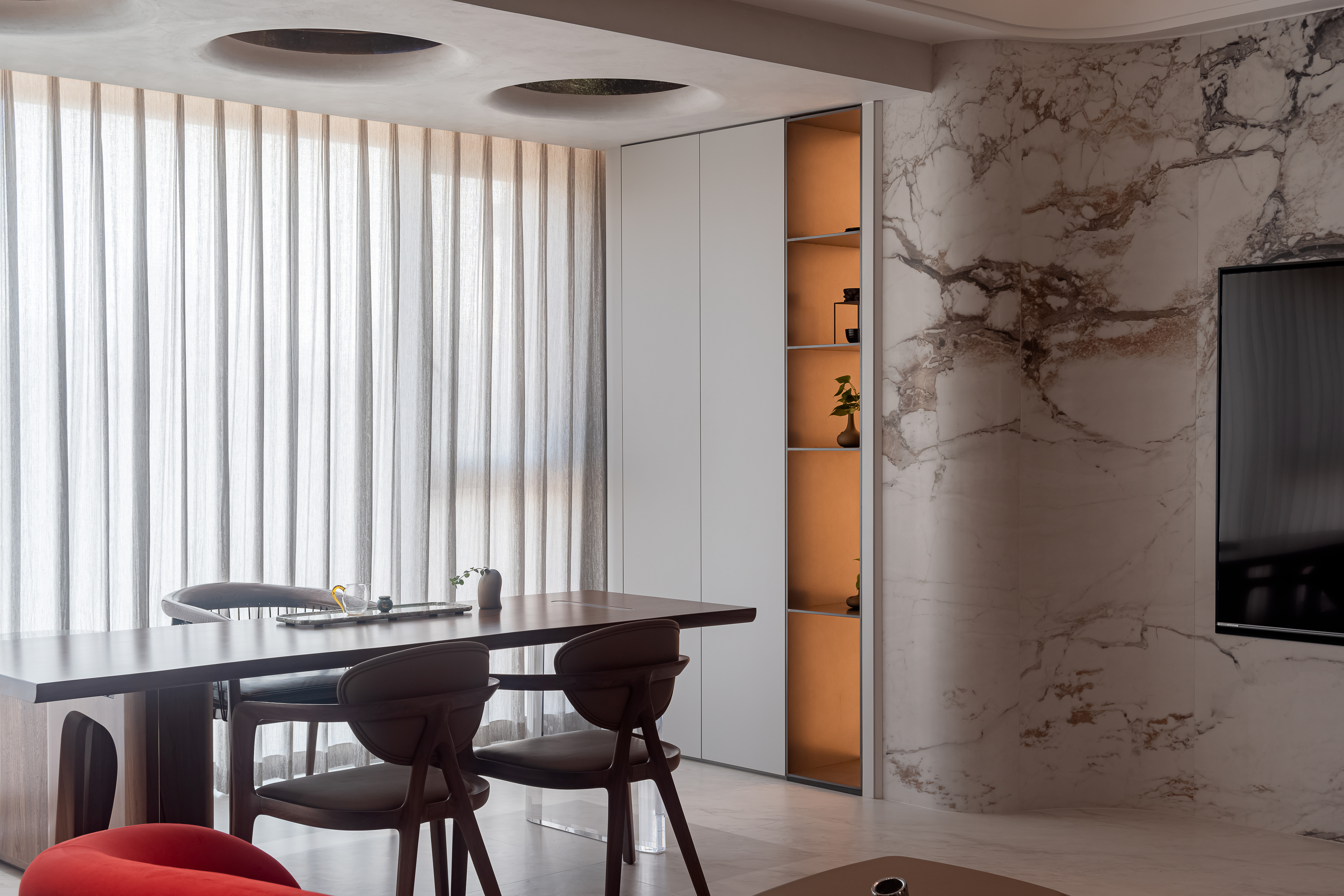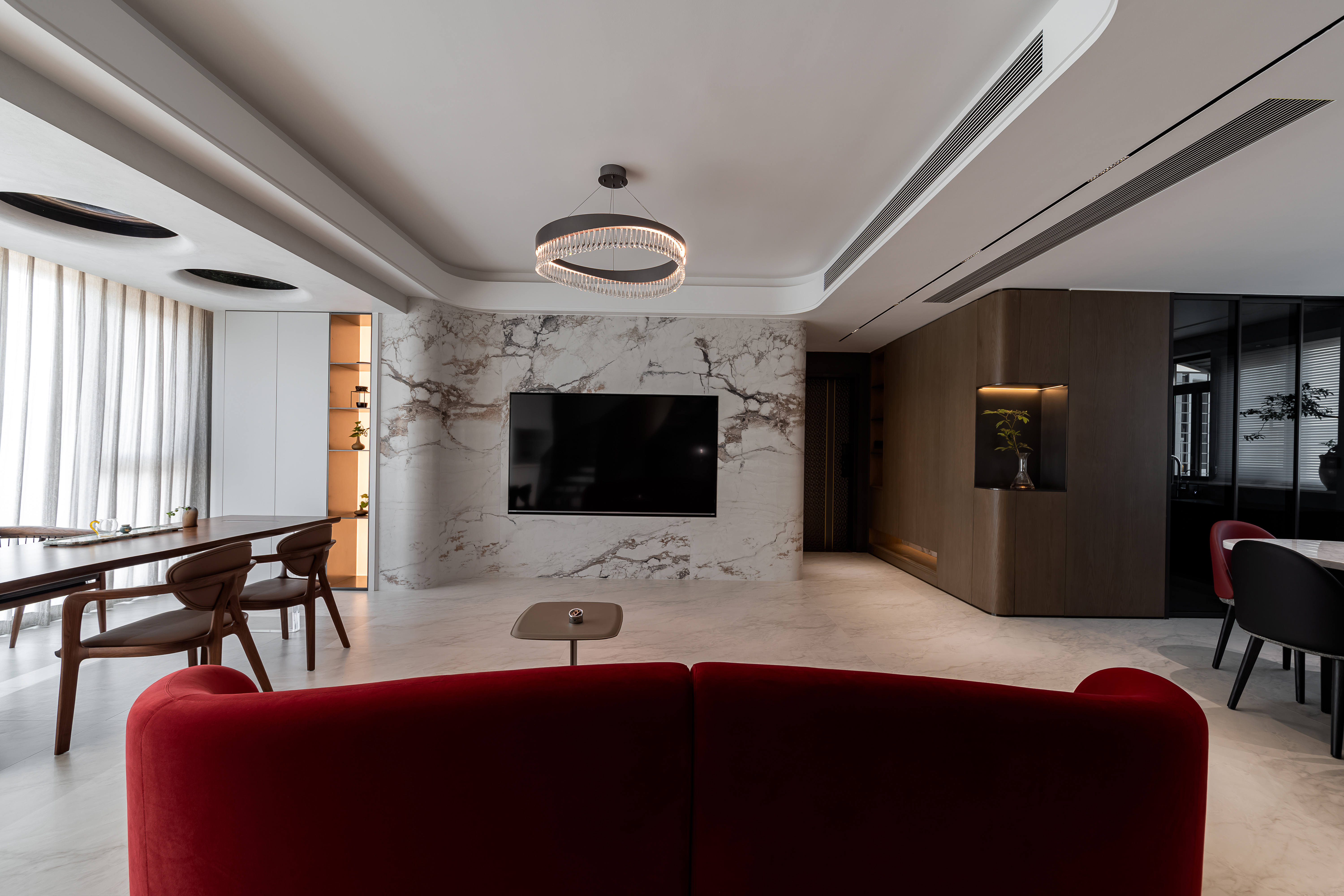 设计选材:主色调为米白、浅咖、灰色等低饱和度色系,搭配酒红色的绒布沙发形成视觉亮点,大理石的自然纹理(橙、蓝、黑等色彩)则作为细节点缀,整体配色和谐且富有层次。