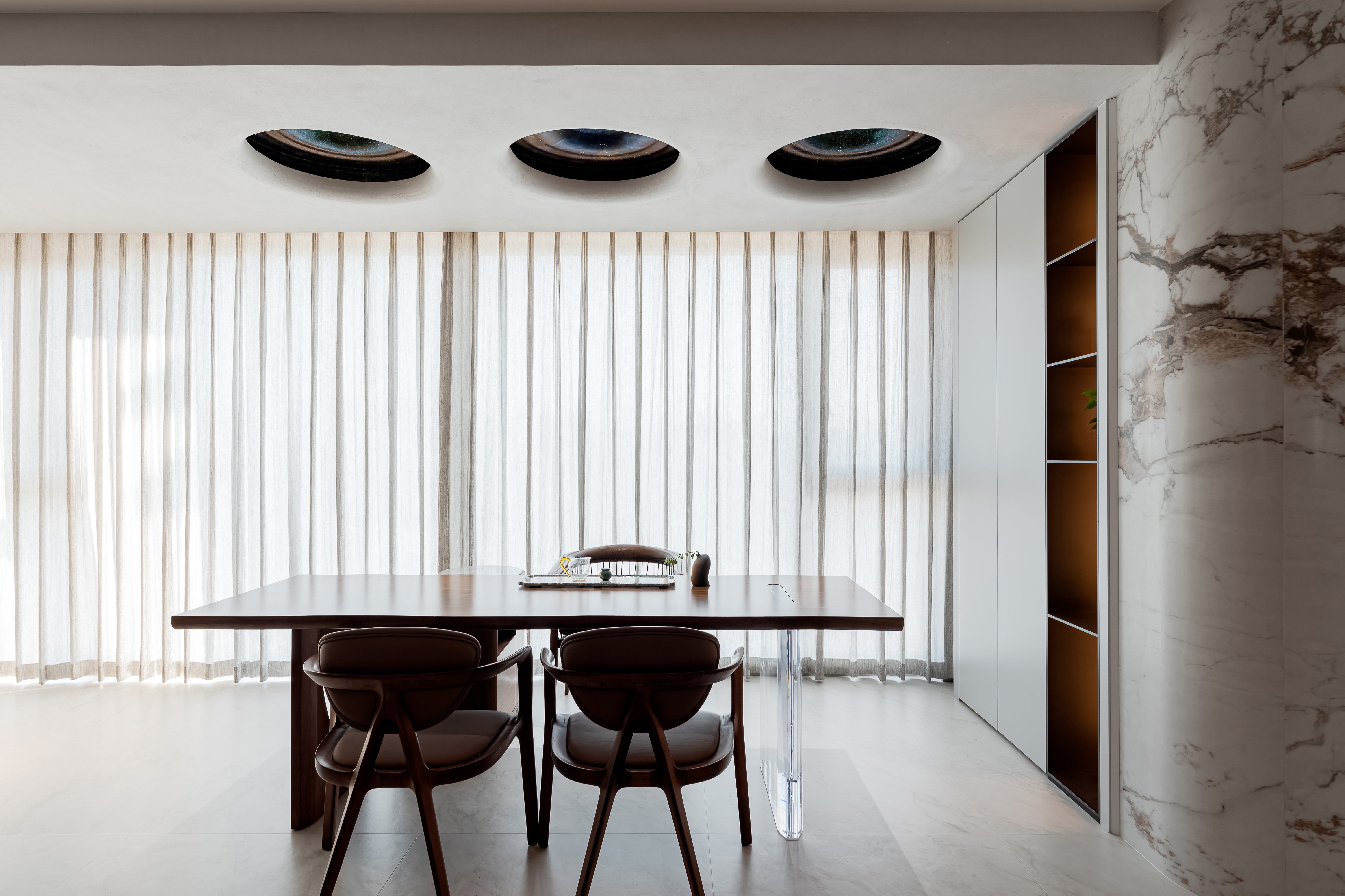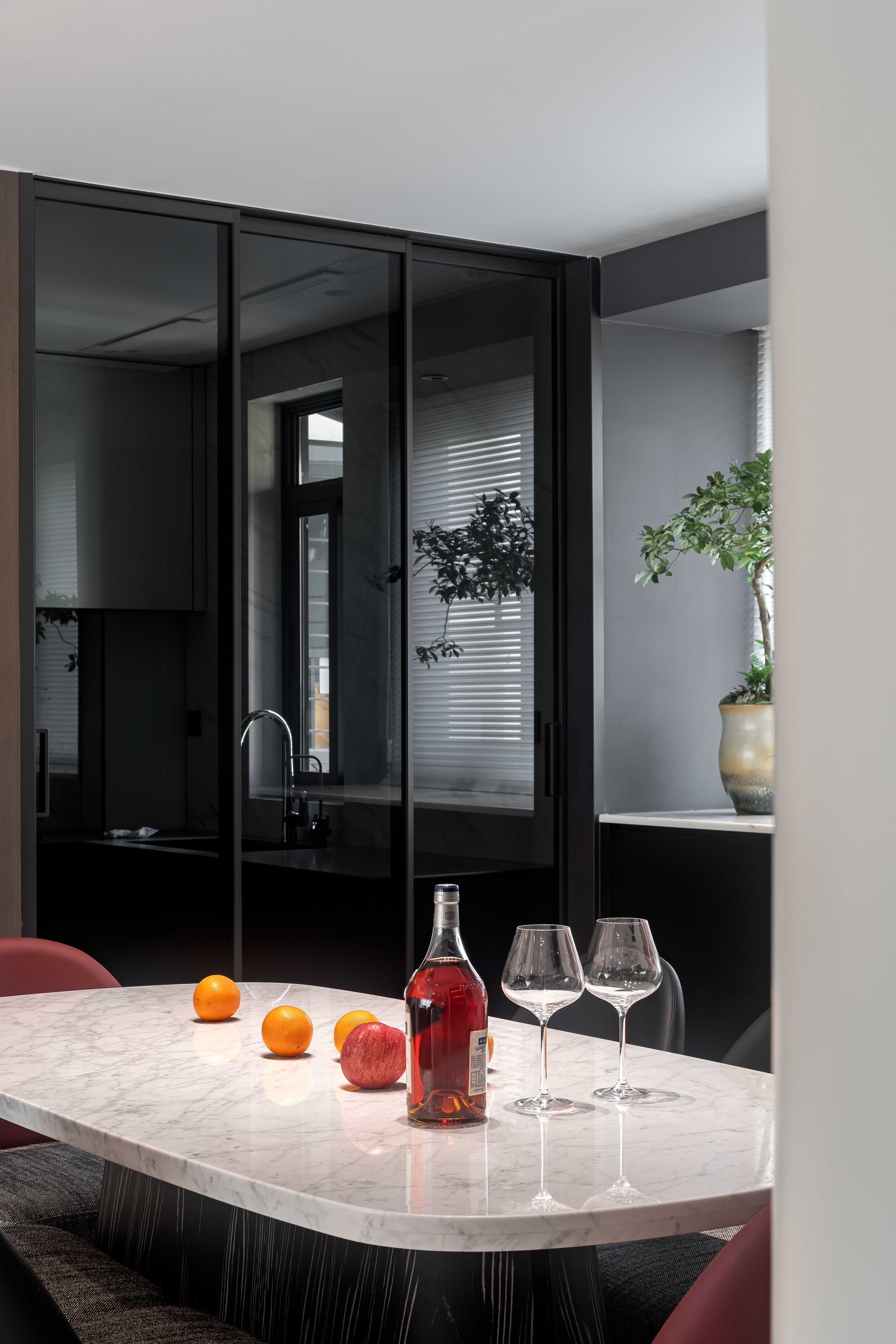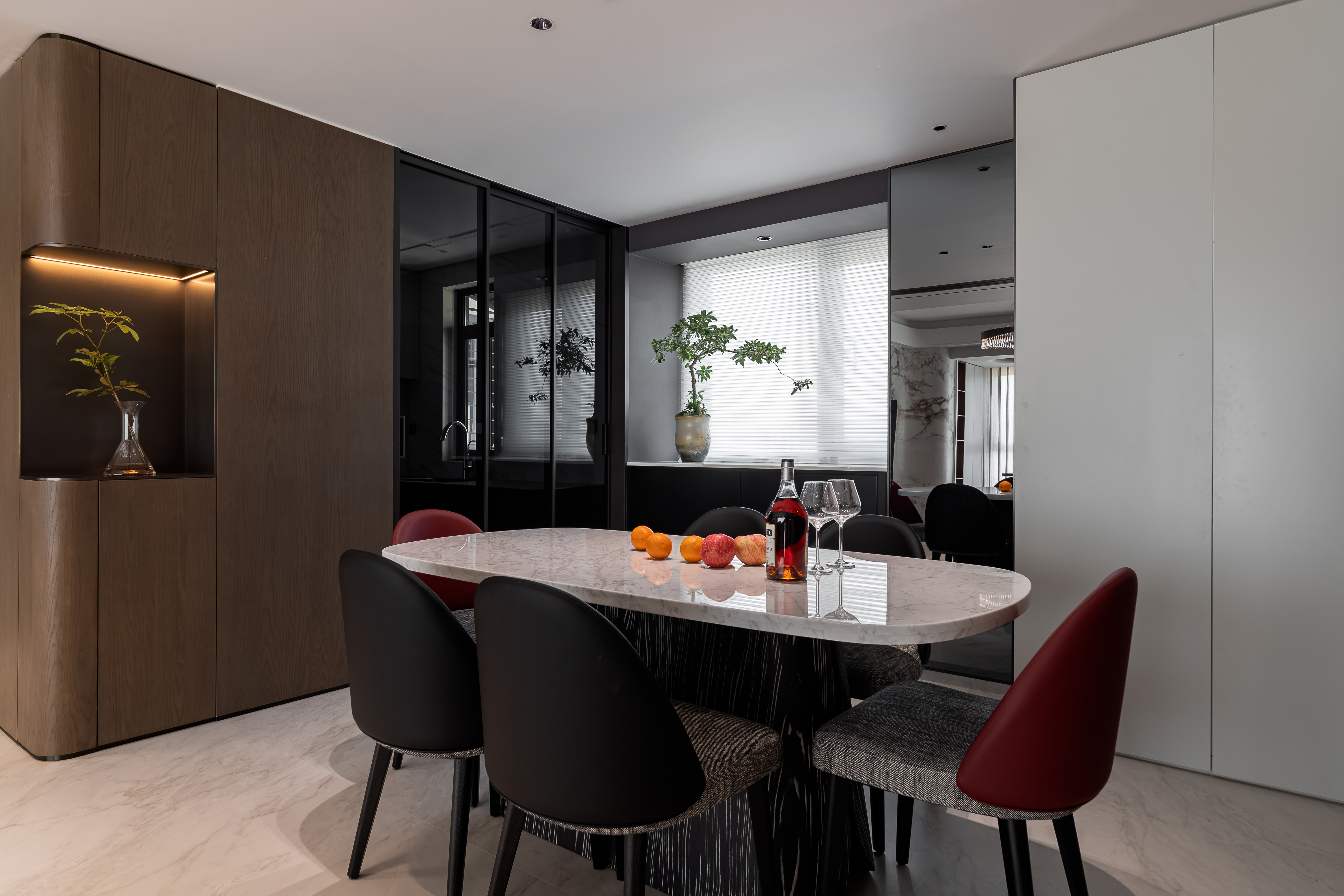 设计选材:主色调为米白、浅咖、灰色等低饱和度色系,搭配酒红色的绒布沙发形成视觉亮点,大理石的自然纹理(橙、蓝、黑等色彩)则作为细节点缀,整体配色和谐且富有层次。