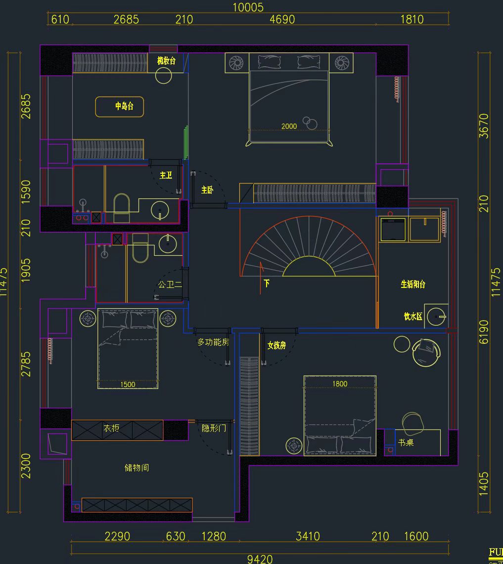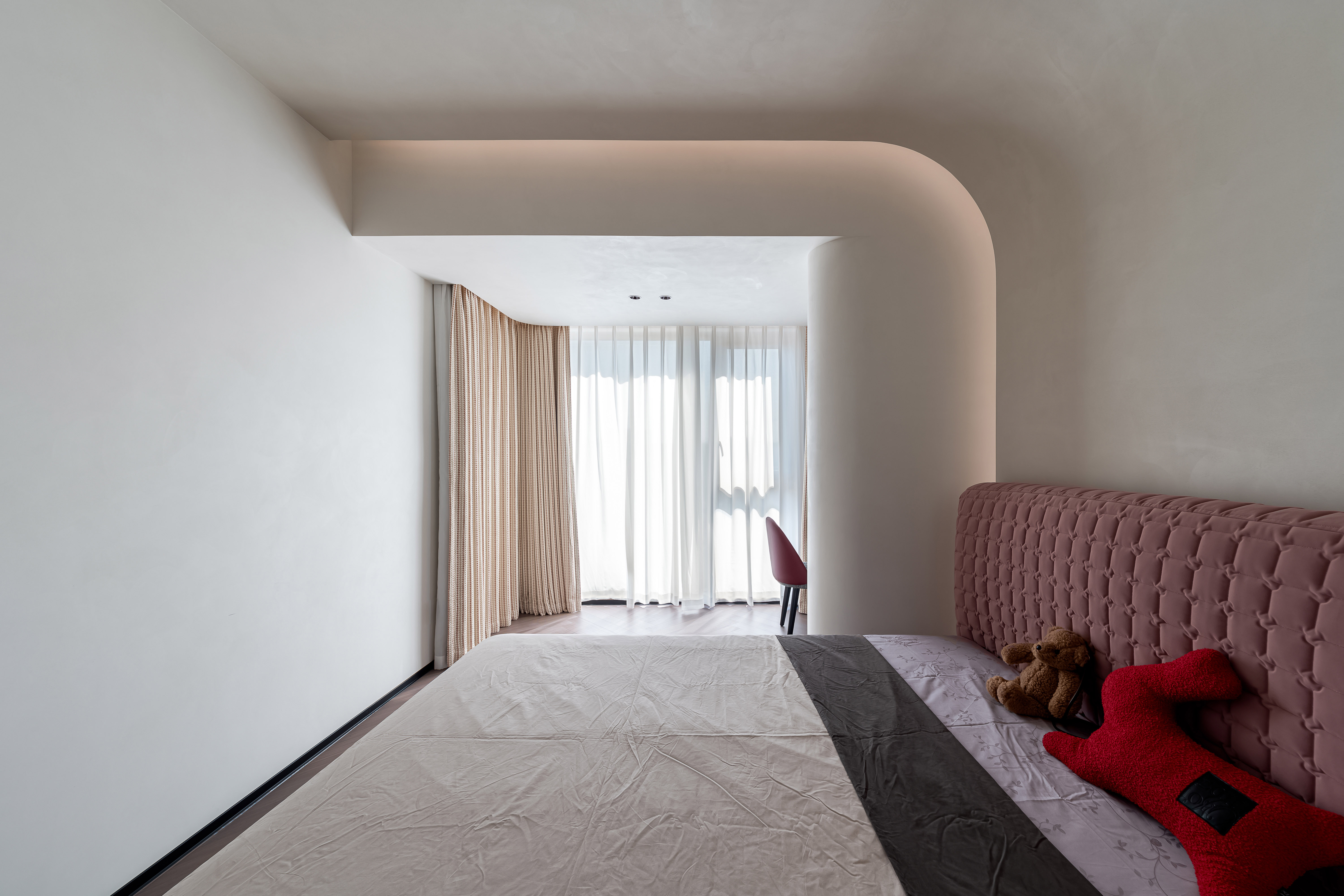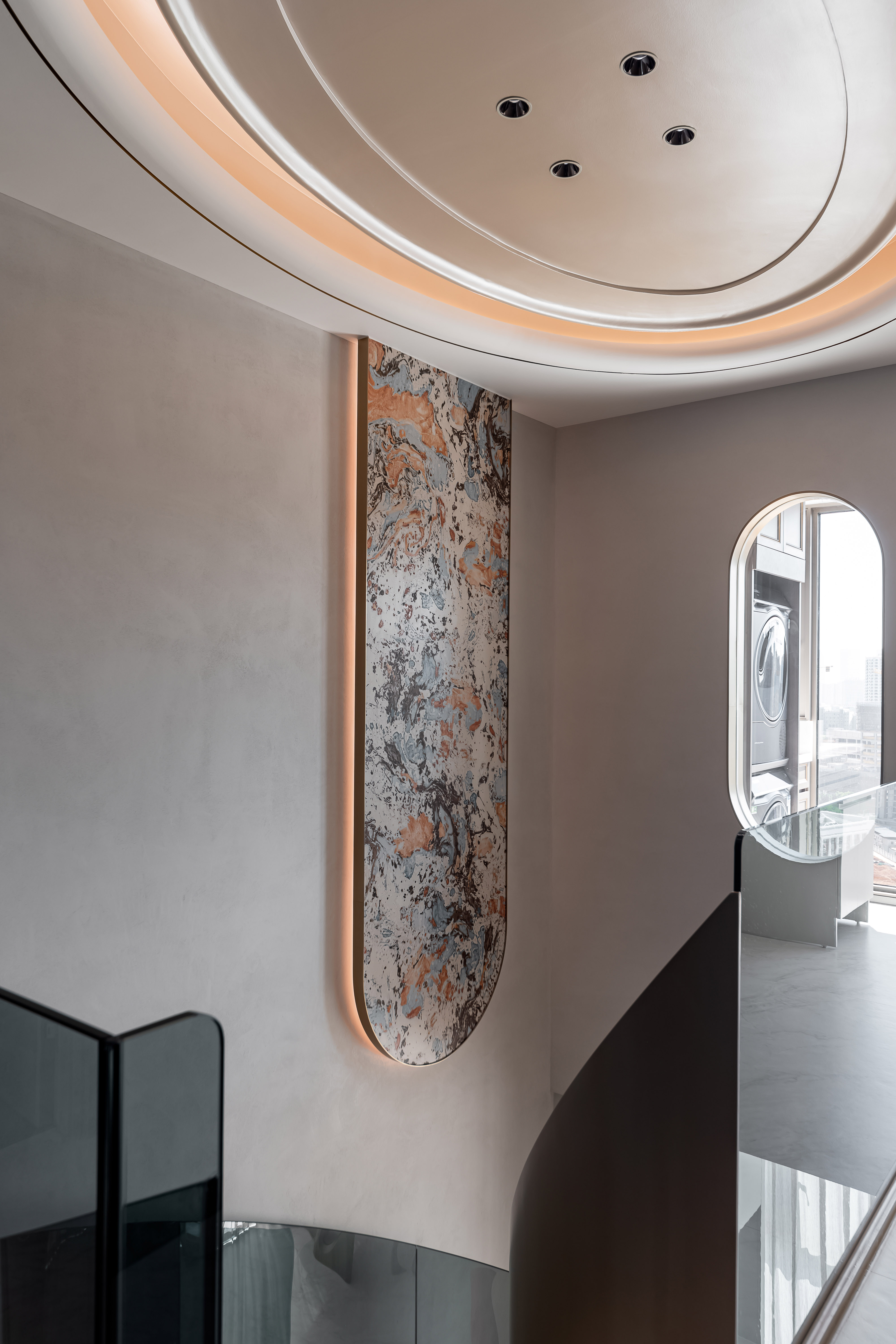 空间布局:以弧形、椭圆等柔化的线条为主,比如弧形的天花板灯带、椭圆形的窗洞/装饰镜、圆弧过渡的大理石墙面,弱化了直线的生硬感,让空间更具流动感;旋转楼梯的螺旋造型也成为空间的视觉焦点。