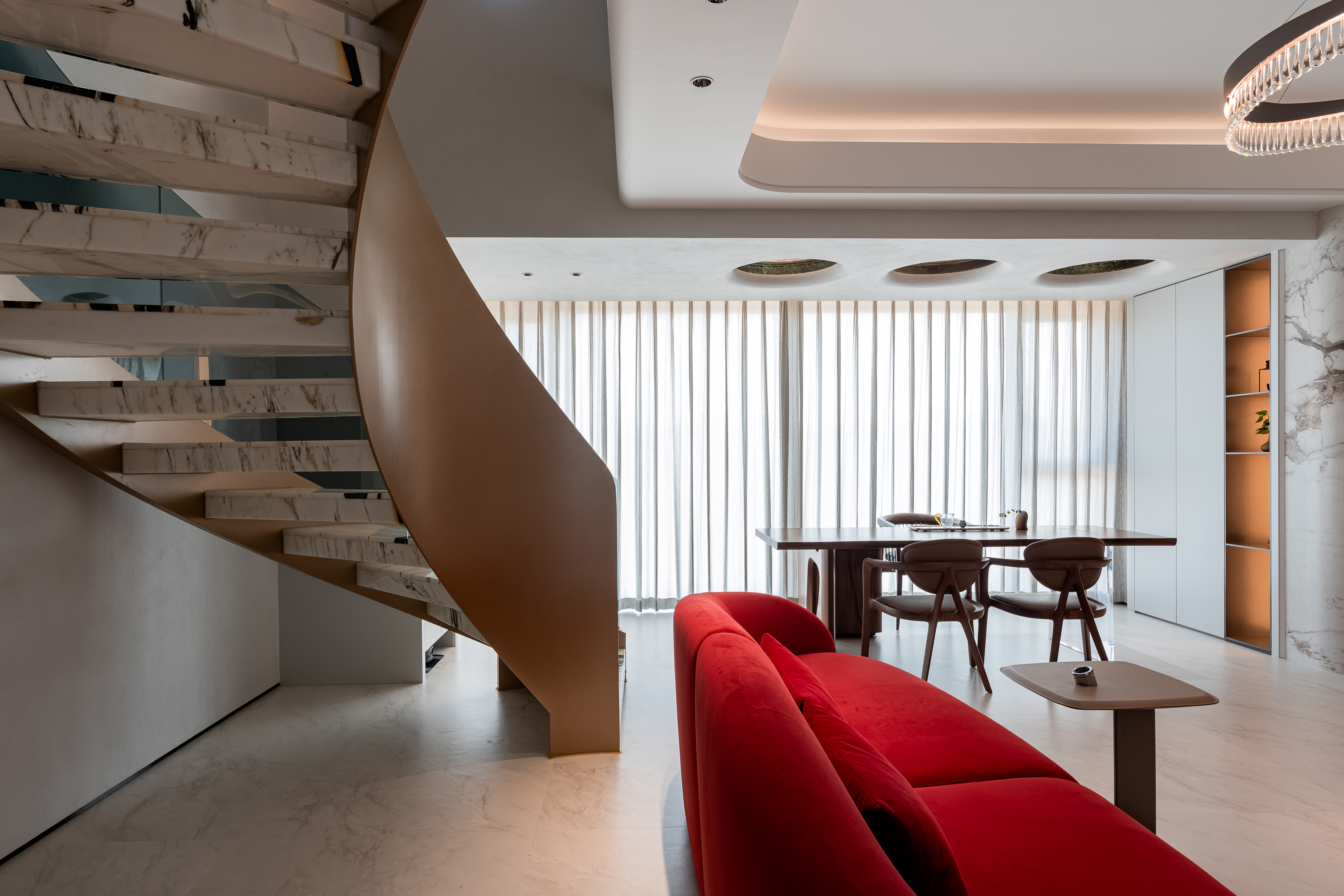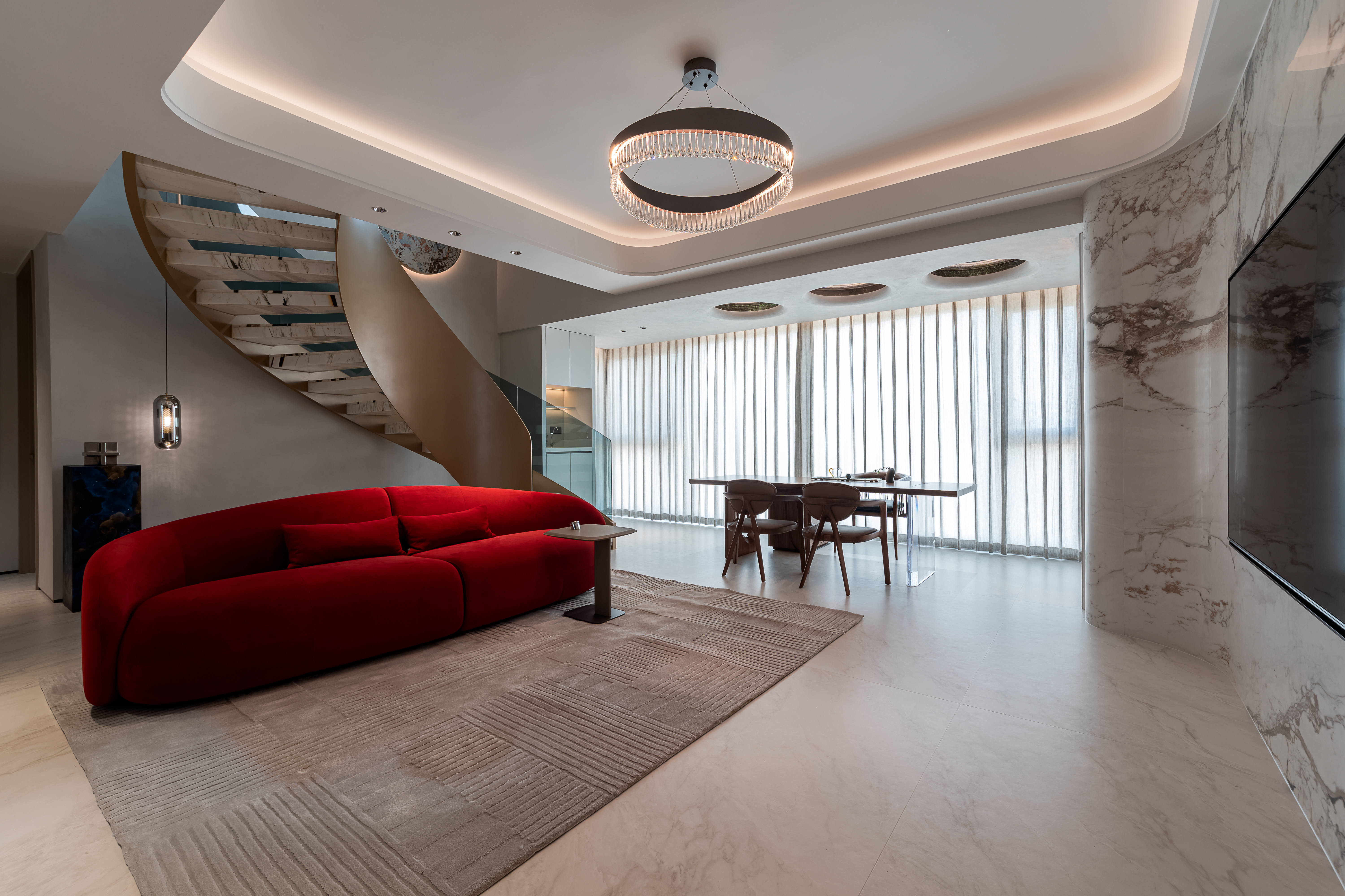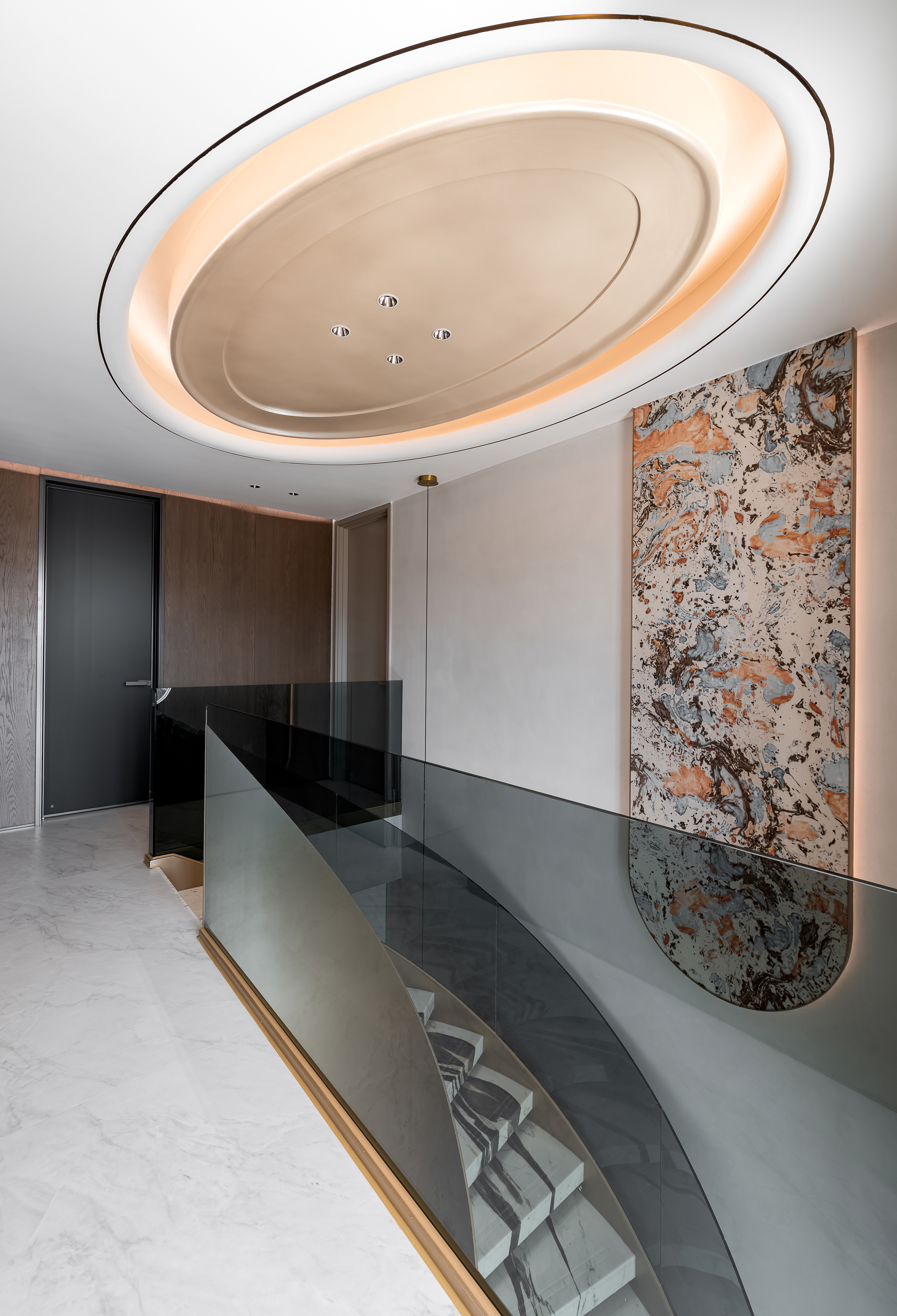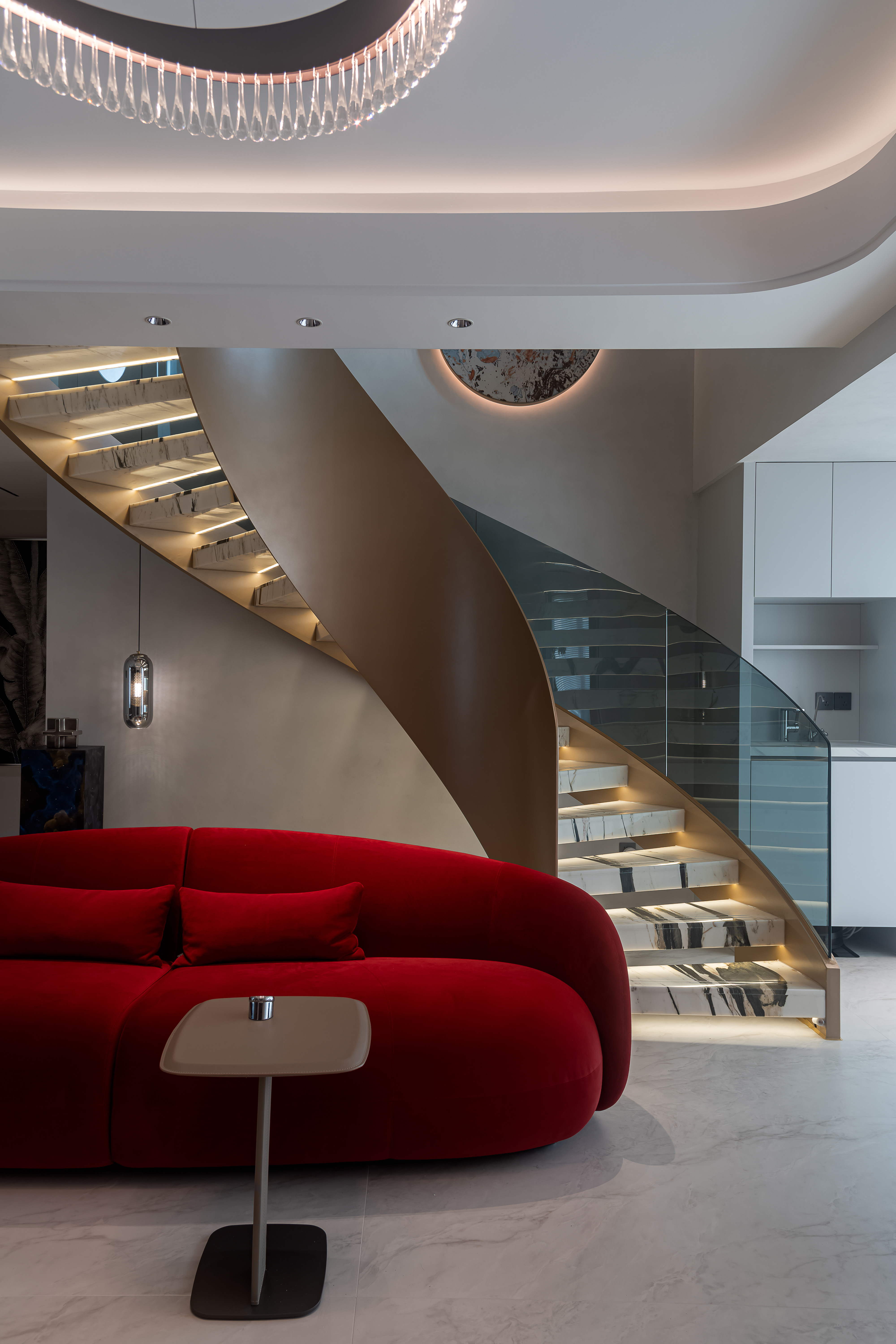 空间意境:大量使用大理石(包括纹理独特的艺术大理石、白色带纹理大理石)、金属饰条、玻璃、绒布等材质,石材的自然纹理与金属的质感形成碰撞,绒布家具则增添了柔软的触感;旋转楼梯处还结合了玻璃护栏与大理石踏步,强化了空间的通透感与高级感。