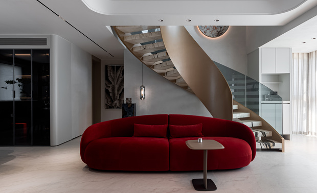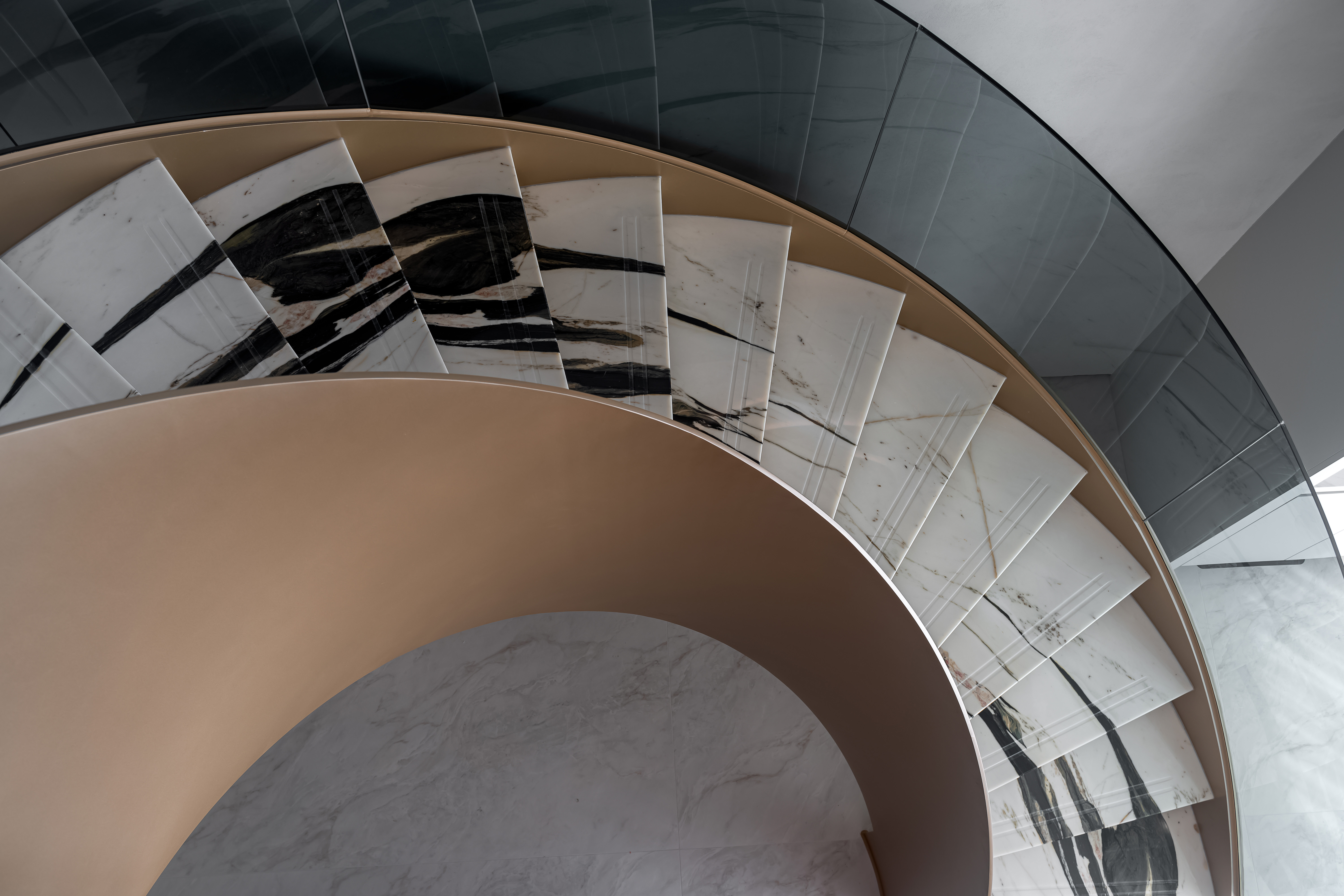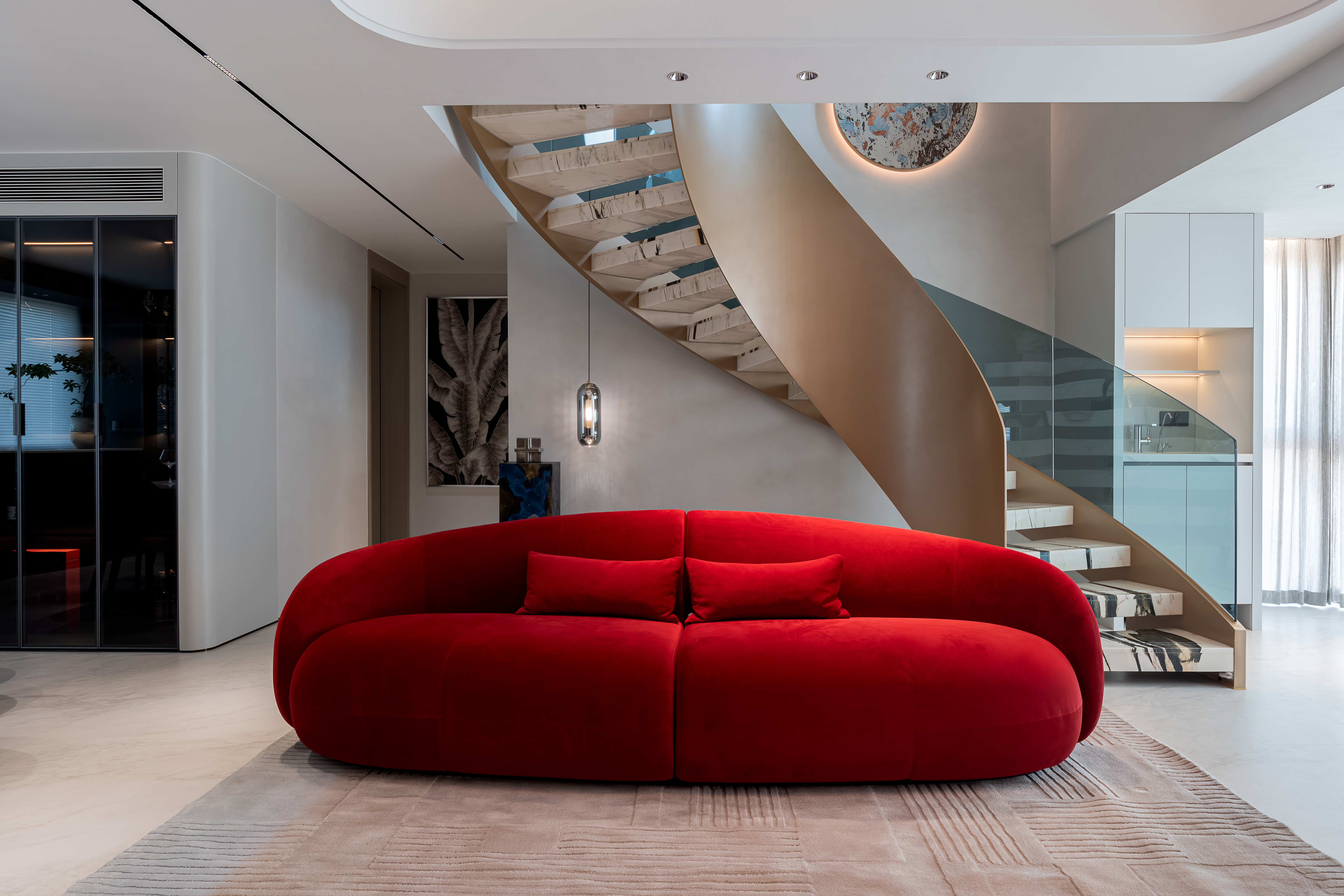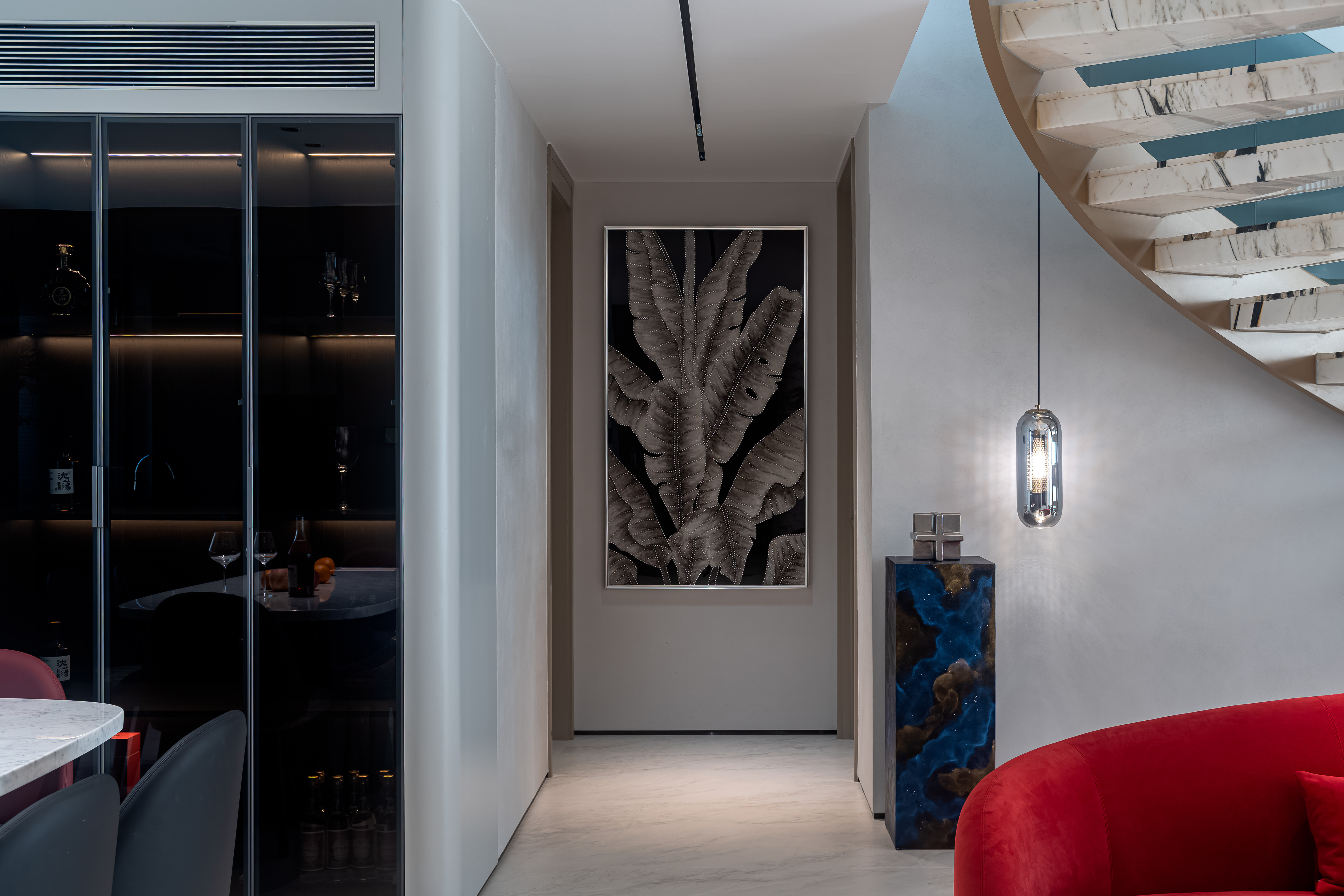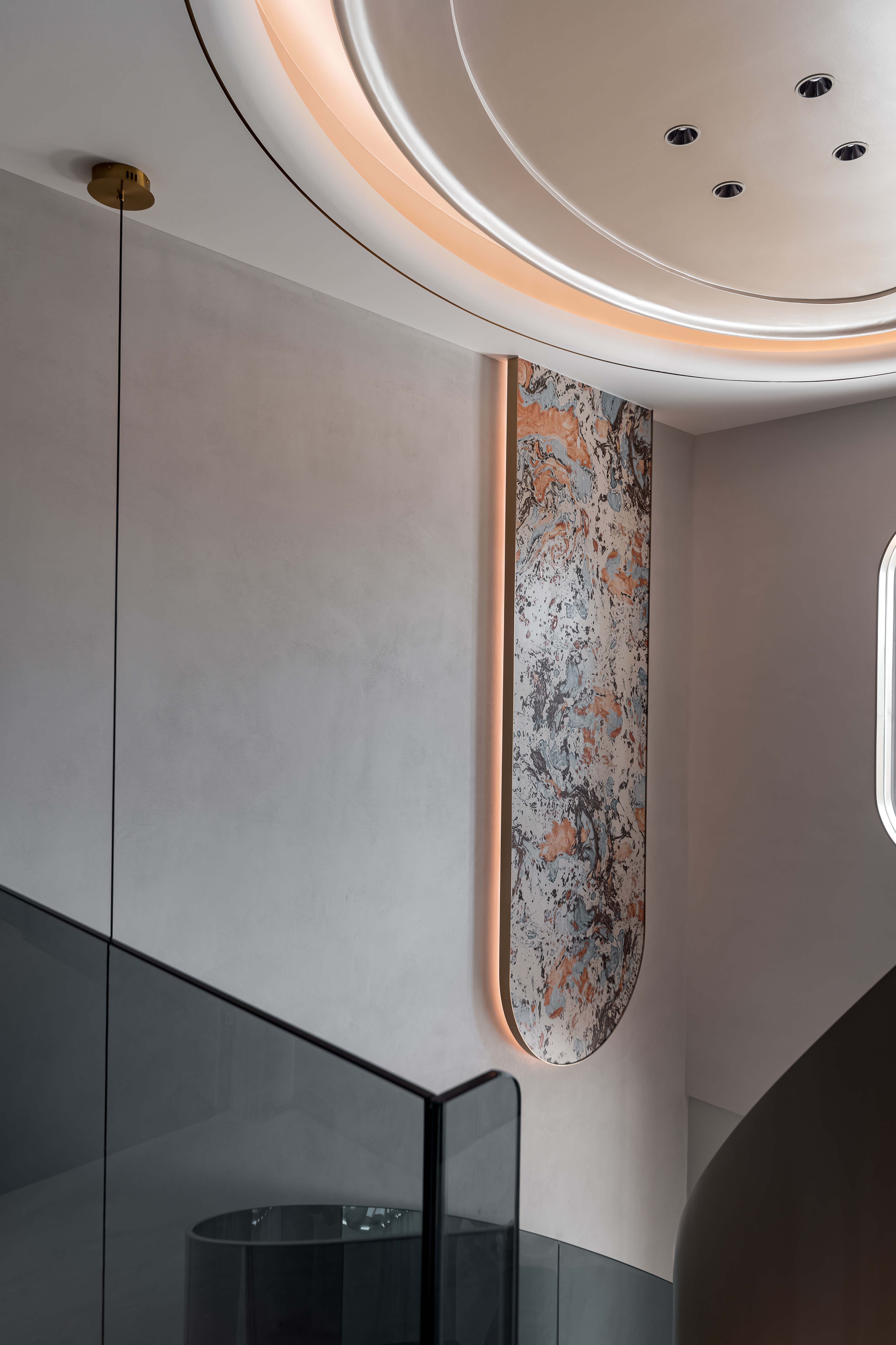 空间意境:大量使用大理石(包括纹理独特的艺术大理石、白色带纹理大理石)、金属饰条、玻璃、绒布等材质,石材的自然纹理与金属的质感形成碰撞,绒布家具则增添了柔软的触感;旋转楼梯处还结合了玻璃护栏与大理石踏步,强化了空间的通透感与高级感。