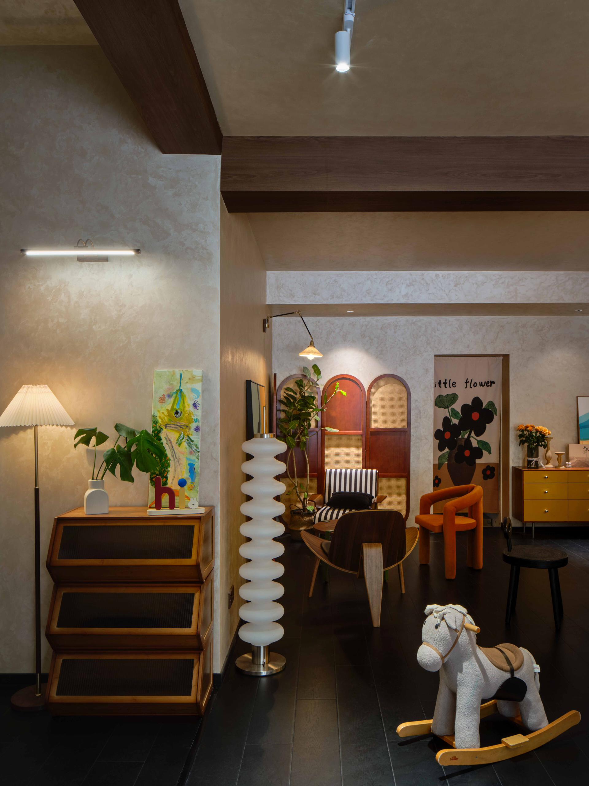 设计选材:艺术漆、有色漆、原木板、天然藤编、手工瓷砖。