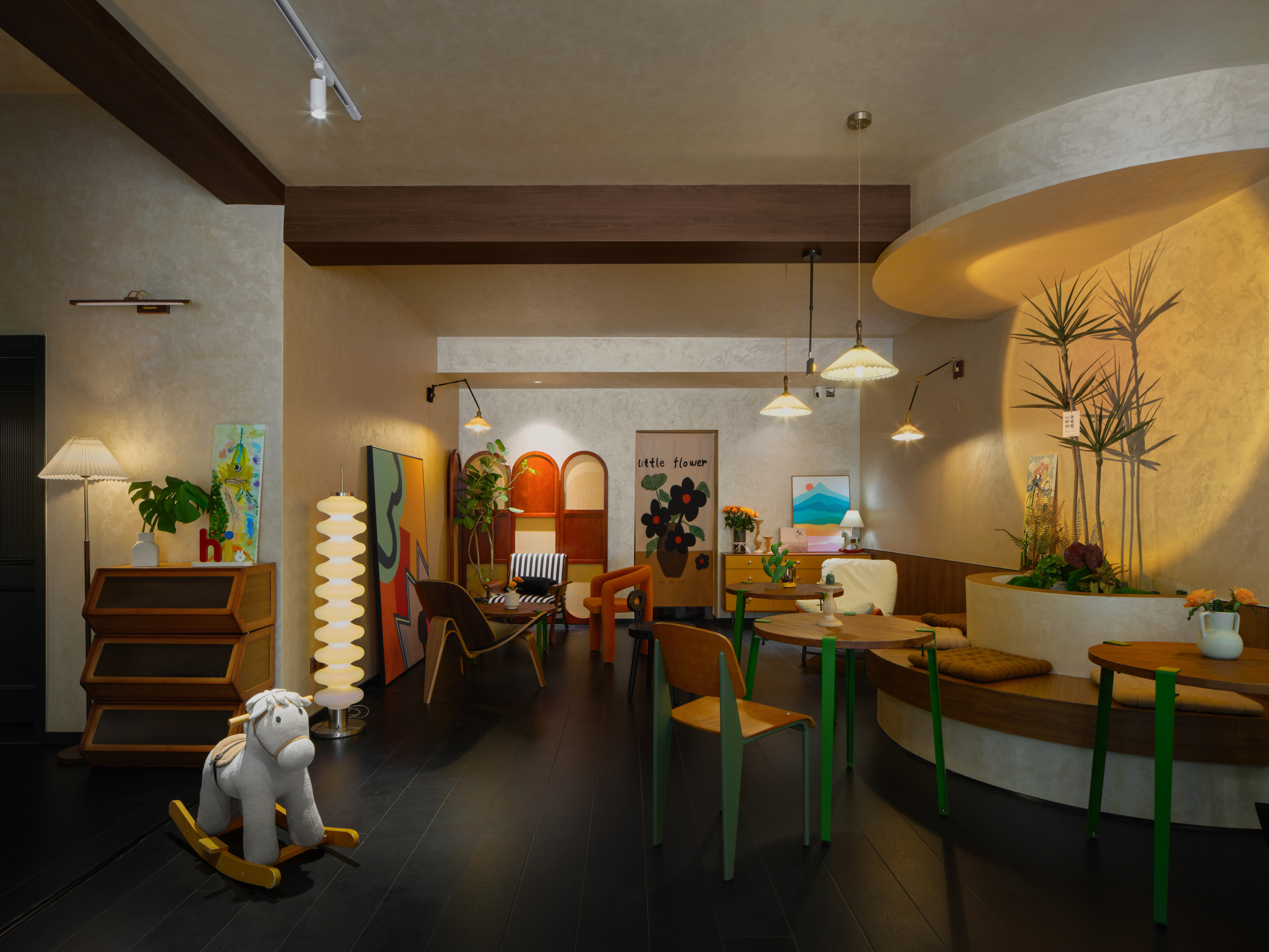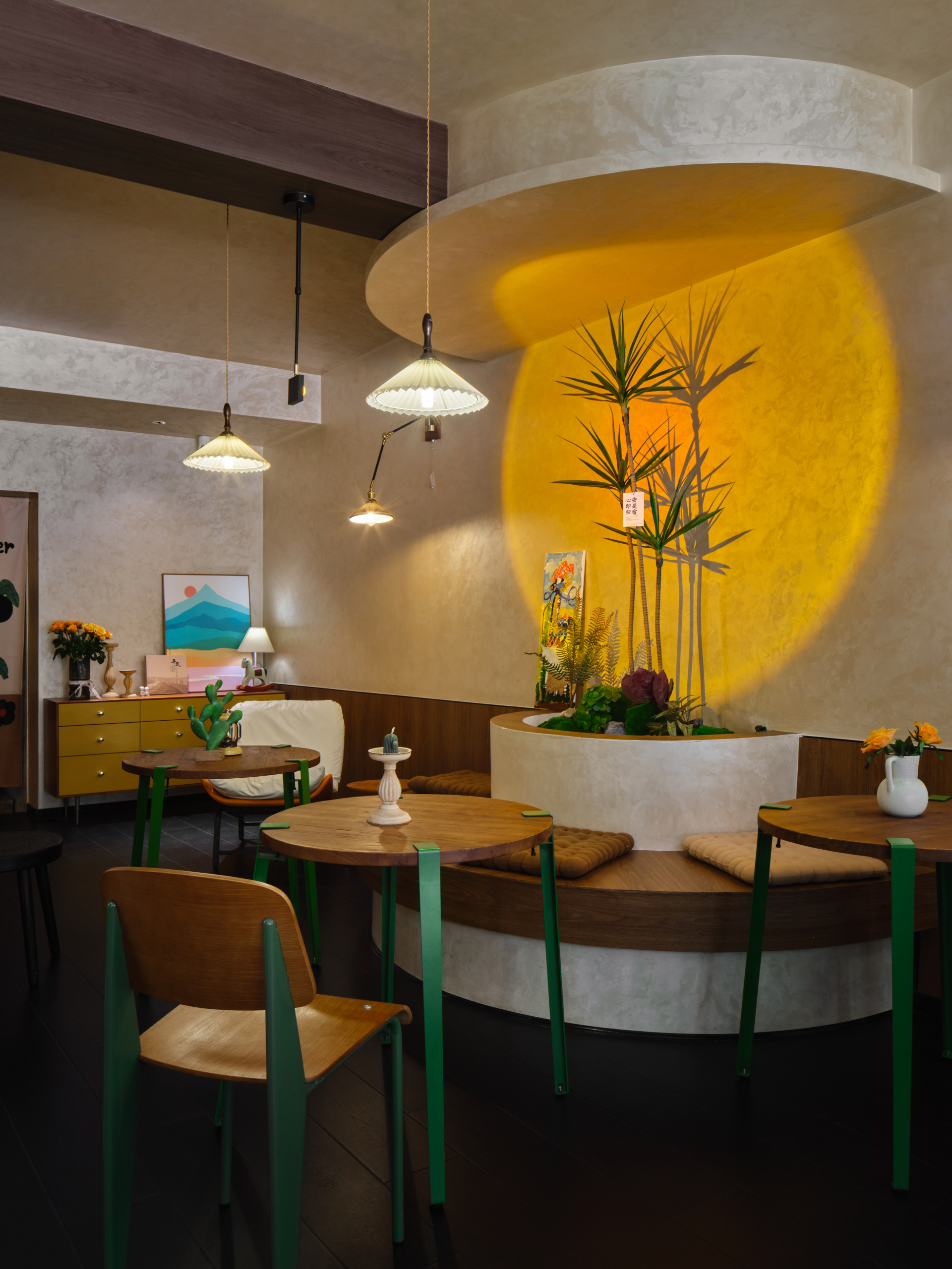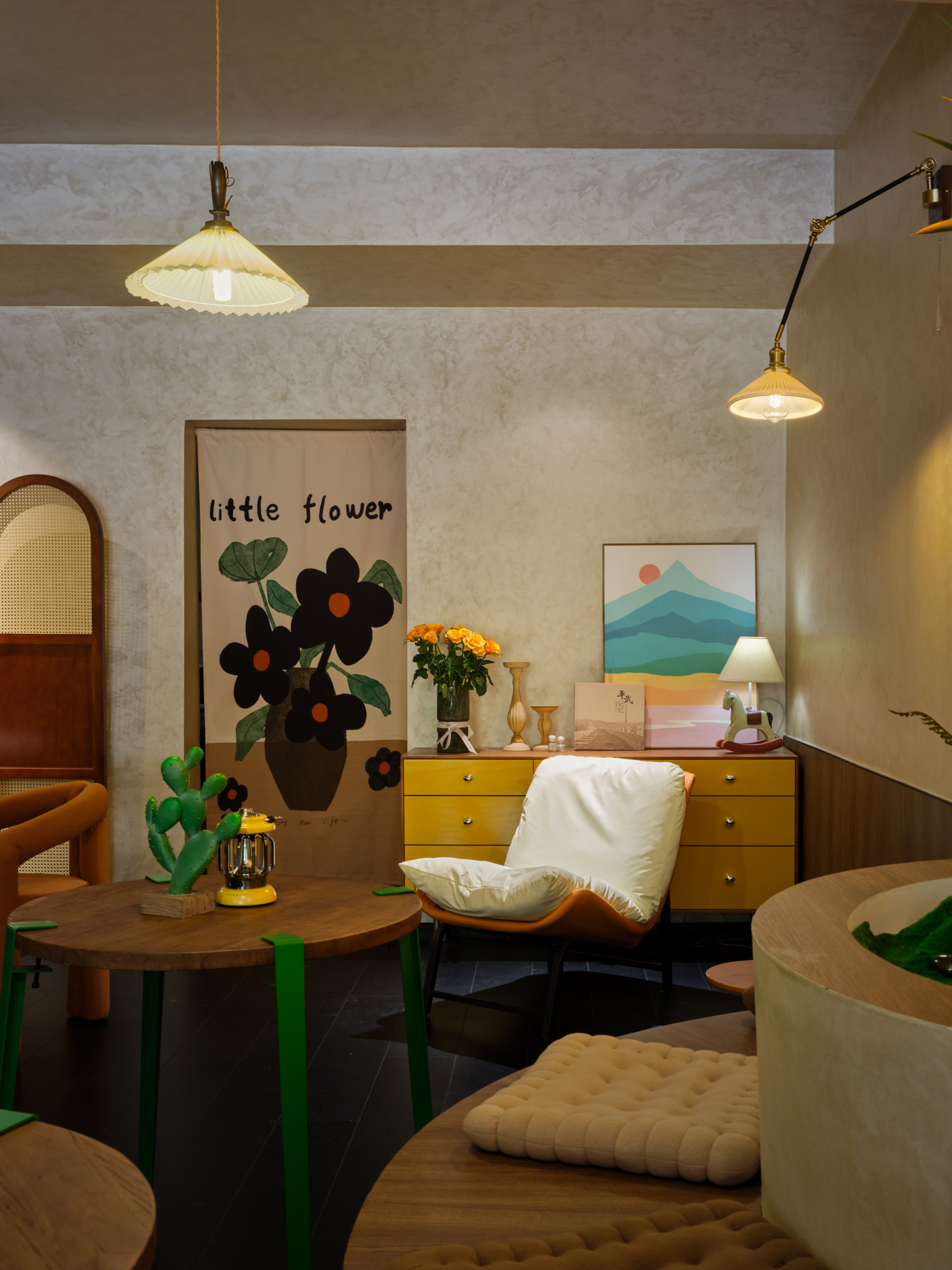 设计选材:艺术漆、有色漆、原木板、天然藤编、手工瓷砖。