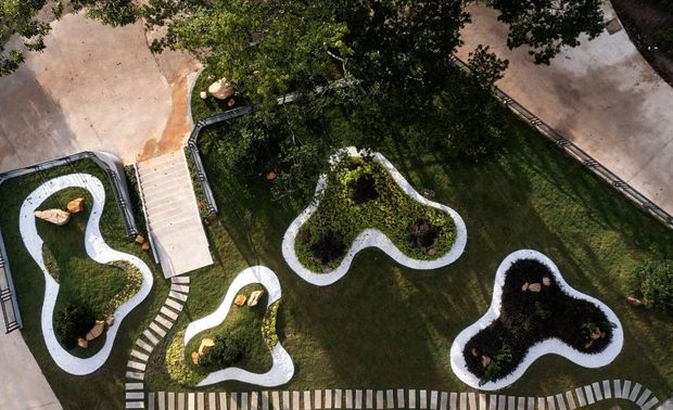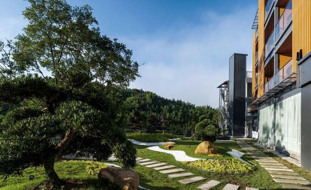 户外庭院景观设计以石头为中心展开,步行道延伸酒店不同角落。同时结合周边自然环境,利用造景的设计手法,打造酒店与大山对话,同自然环境共生共荣。