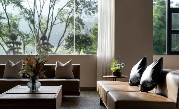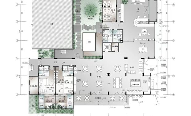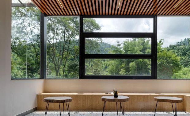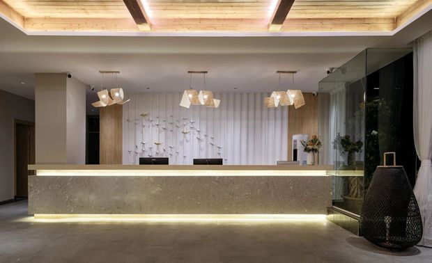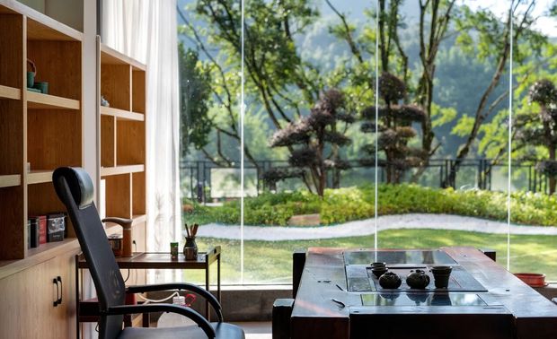 睛溪温泉酒店首层利用通透落地大玻璃,把室内外的融合,从外部延伸入里,打破立体界限。把前厅接待区、阅读区、儿童游戏区、茶室等公共空间最大化呈现,加强互通体验。