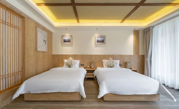 晴溪温泉酒店整体风格体现了东方美学的意境美。在设计上以藤、竹、石头、原木为元素,表达东方美学虚实,动静、刚柔、形神的神髓。