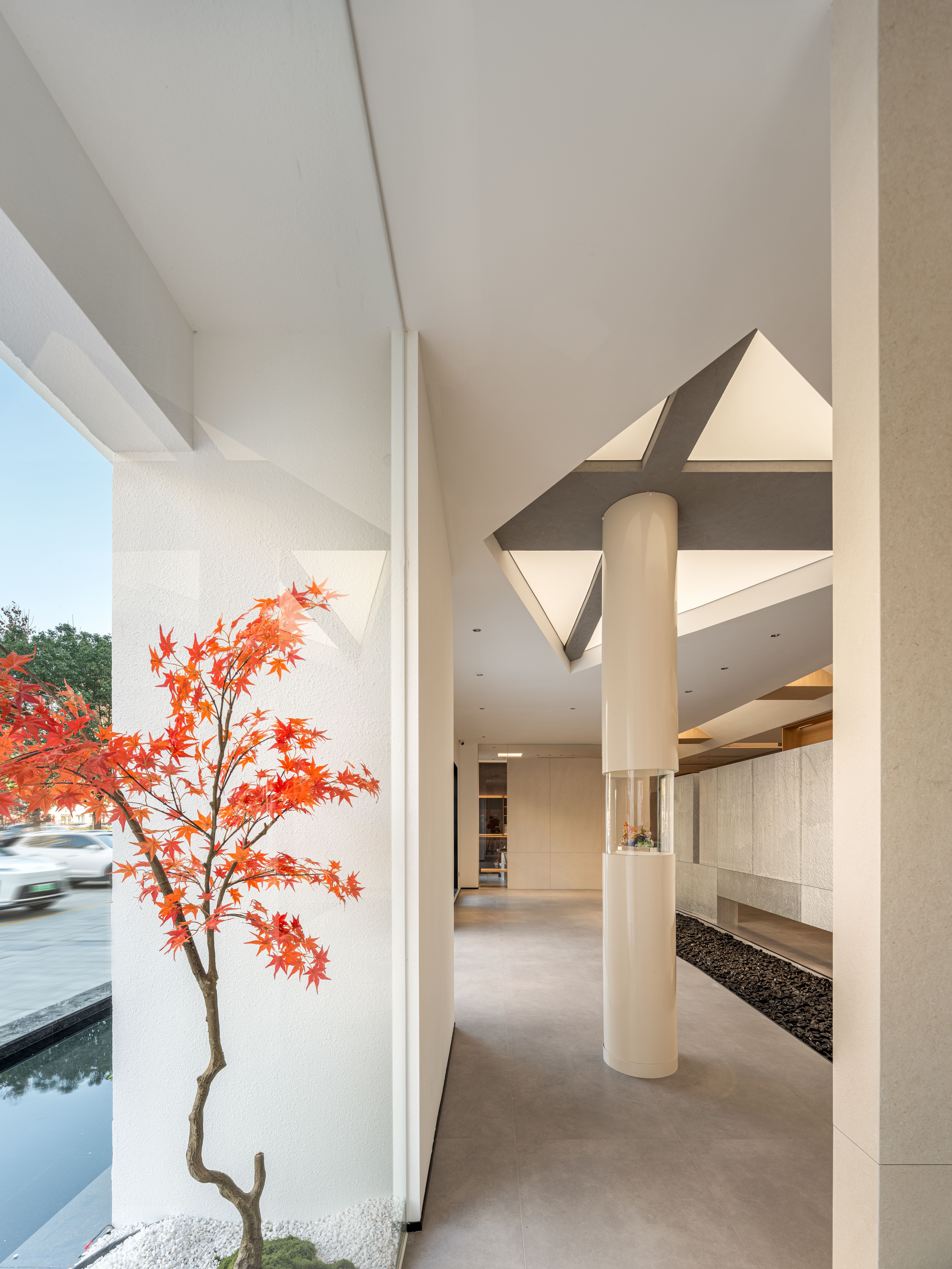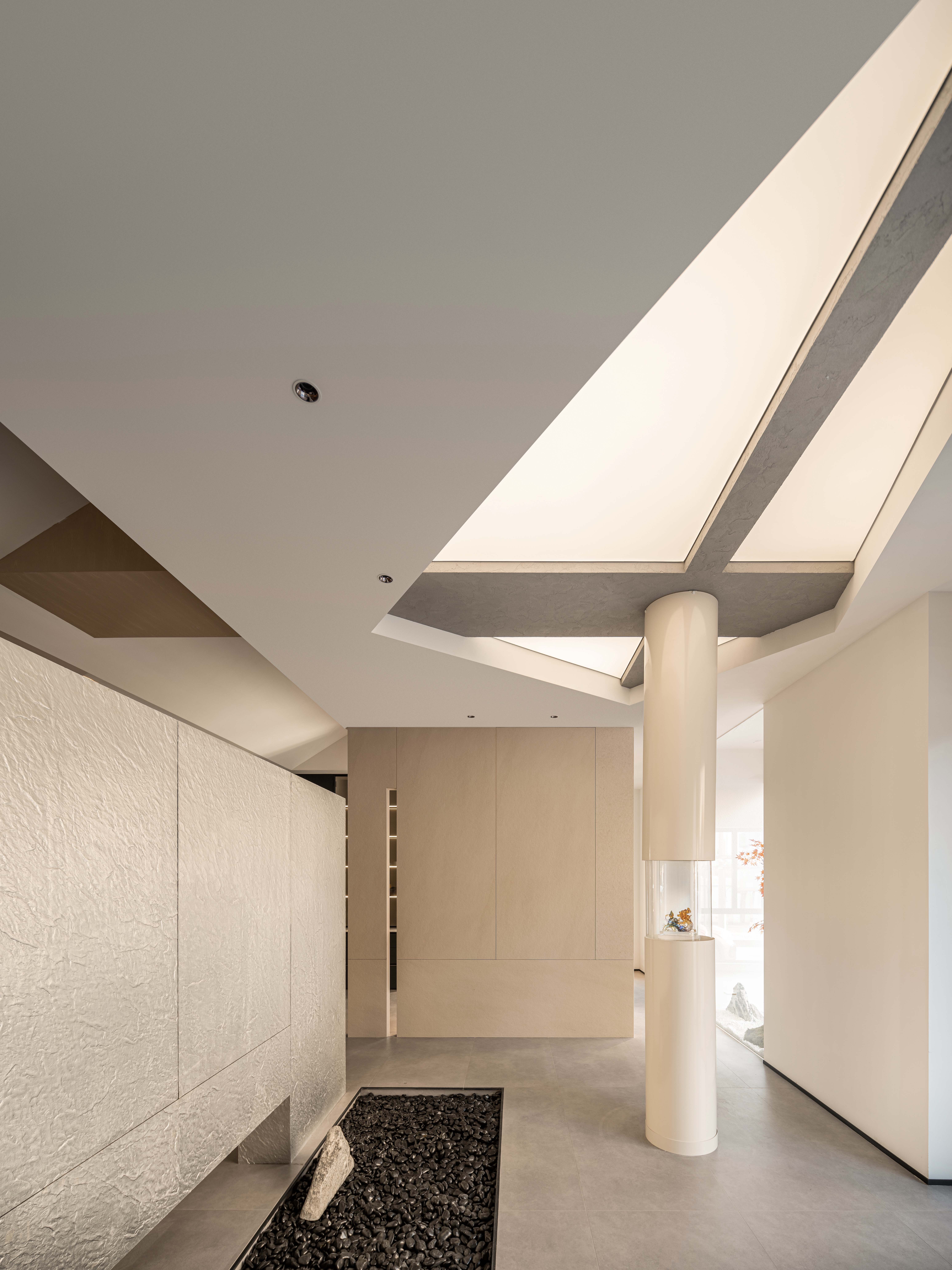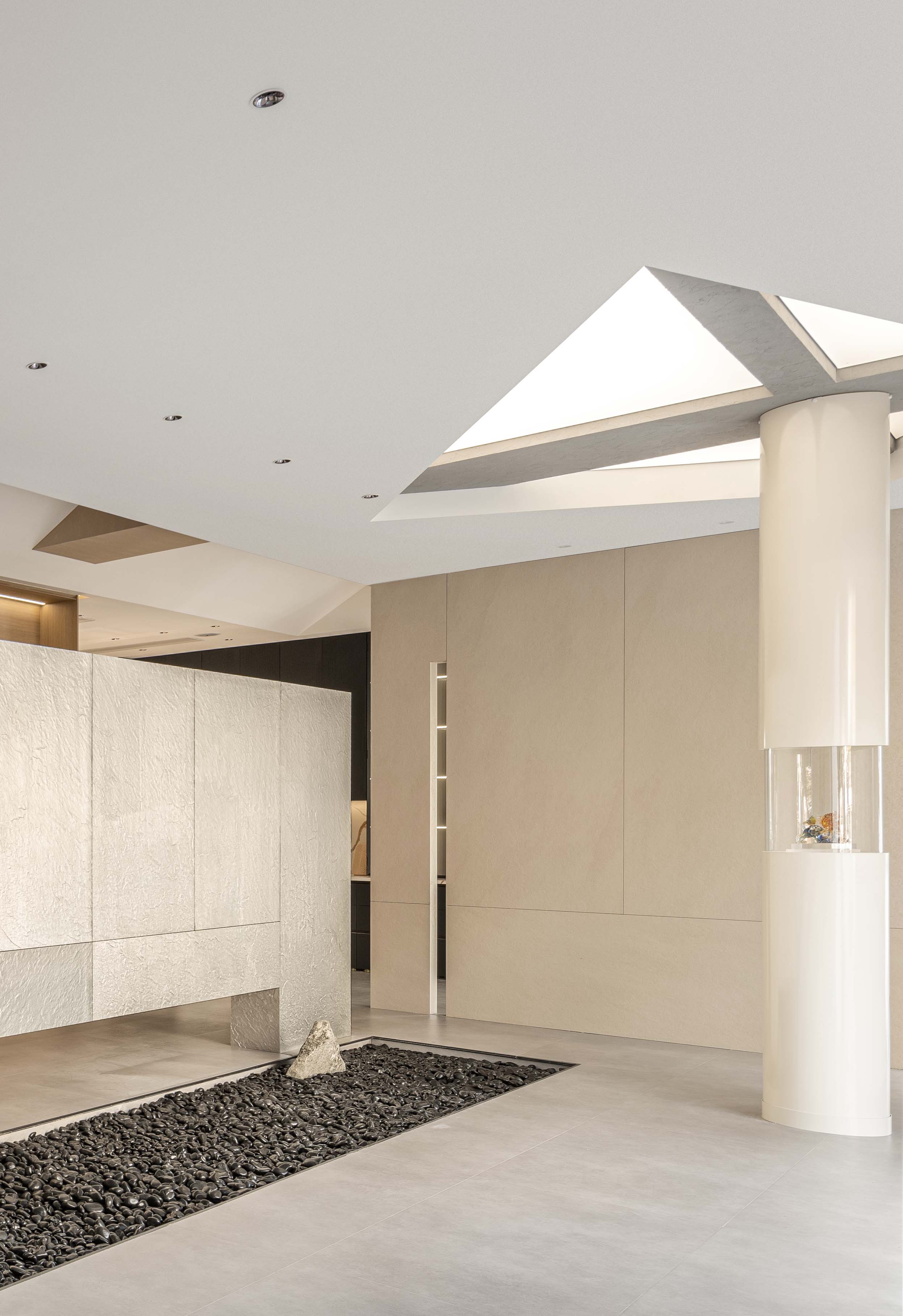 入户景墙是对传统中式建筑中“照壁”的现代运用,犹抱琵琶半遮面。 The entrance wall is a modern application of the "screen wall" in traditional Chinese architecture, like a veil half-hidden.