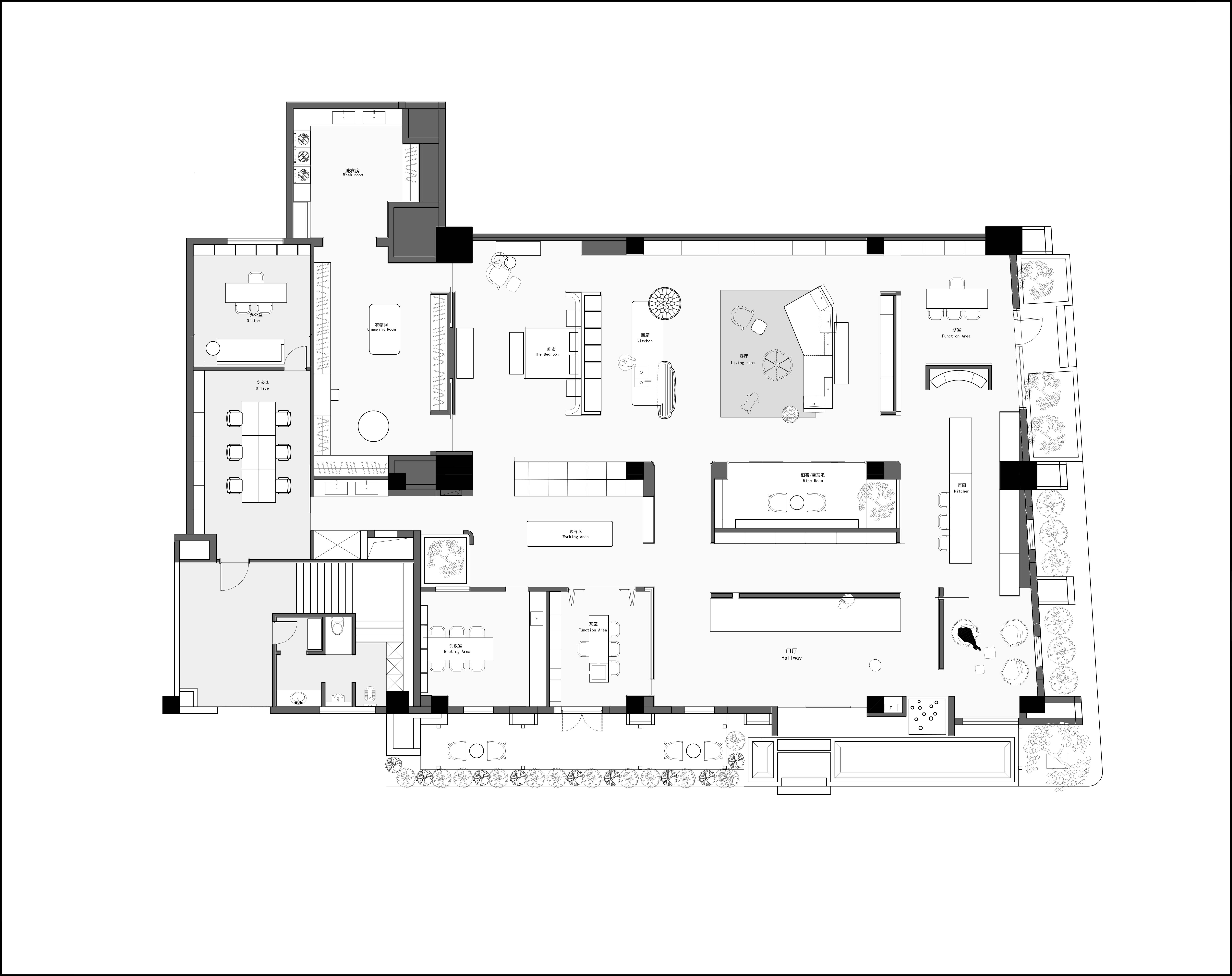 空间门厅的运用,是本案的一个重点。所有故事围绕着它,慢慢铺开。它是半遮面的琵琶,也营造出艺术氛围。选样区和酒窖,做为两个灰色空间,承接主题展厅和门厅。让空间更有条理和秩序感。工作区和展厅区,即独立又相互连接。 The application of the spatial foyer is a key point of this case. All the stories revolve around it and gradually unfold. It is a half-covered pipa, which also creates an artistic atmosphere. The sample selection area and the wine cellar, as two grey Spaces, connect the theme exhibition hall and the foyer. Make the space more organized and orderly. The work area and the exhibition hall area are both independent and interconnected.
