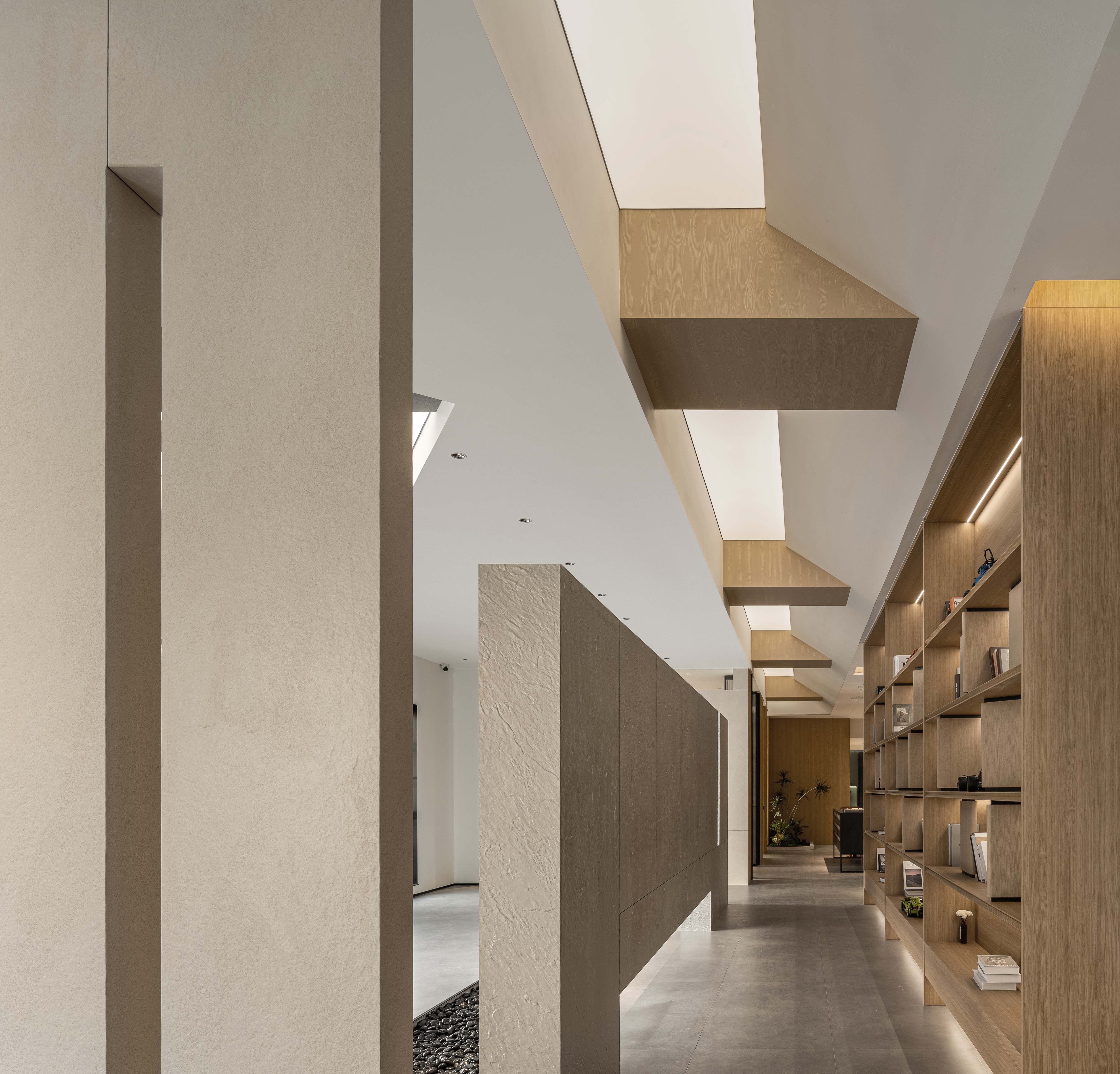 顶部局部抬高,让空间层次更加丰富,配合透光膜灯光设计,营造自然天光效果。 The top is partially raised to enrich the spatial layers. Combined with the light-transmitting film lighting design, it creates a natural sky light effect.
