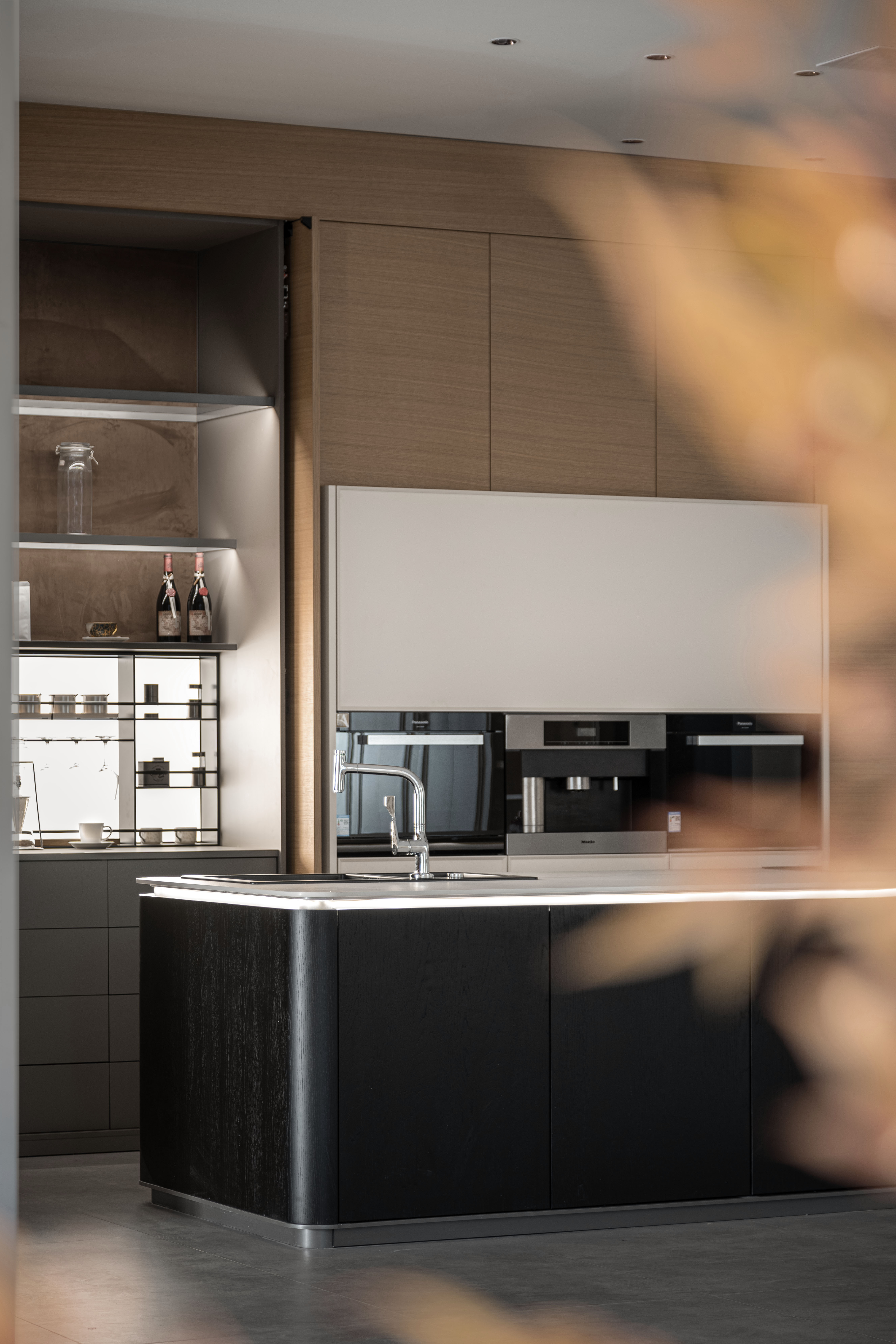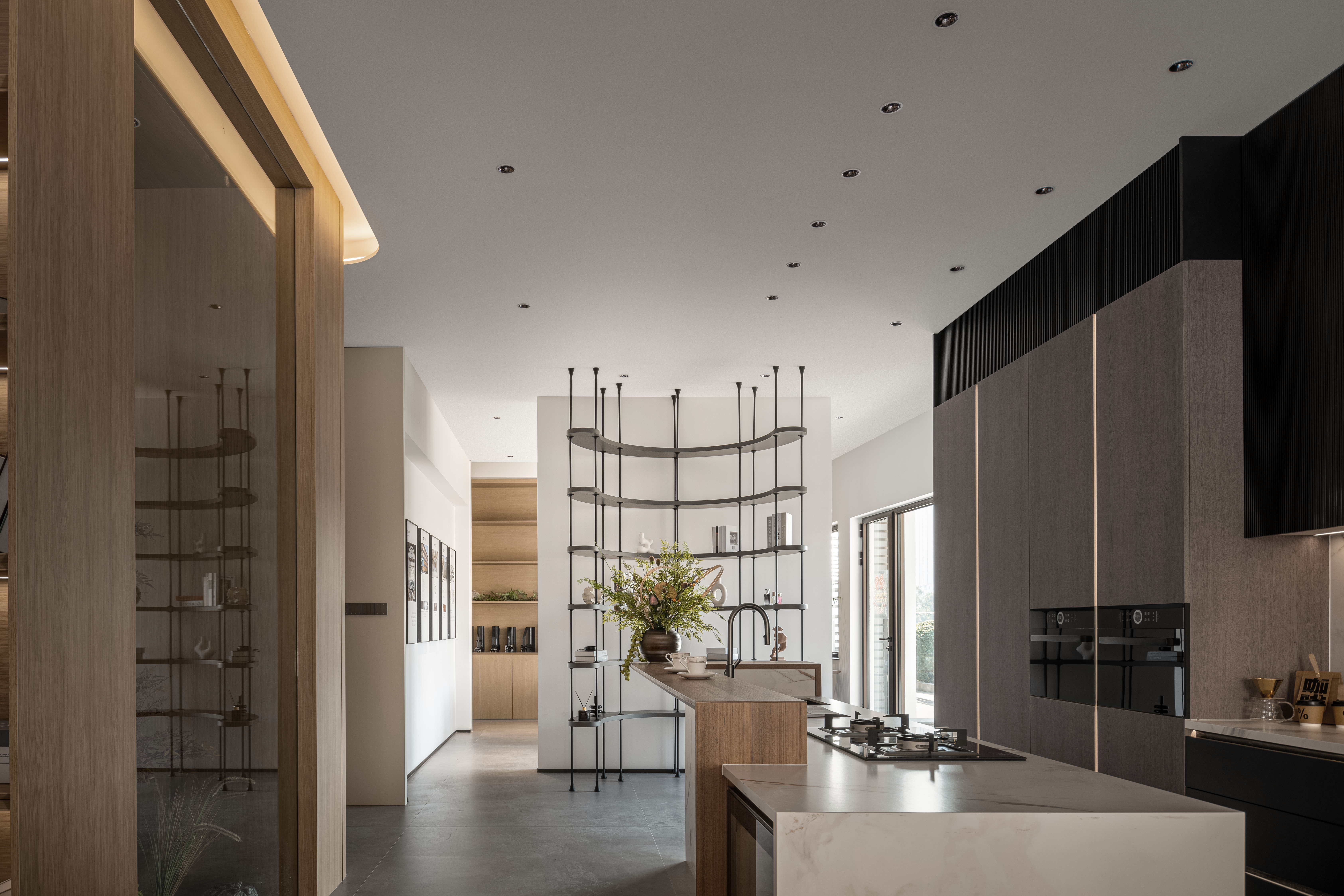 西厨空间,敞开柜与平板柜门以及家电的融合,相得益彰。 In the Western kitchen space, the integration of open cabinets, flat cabinet doors and household appliances complements each other perfectly.