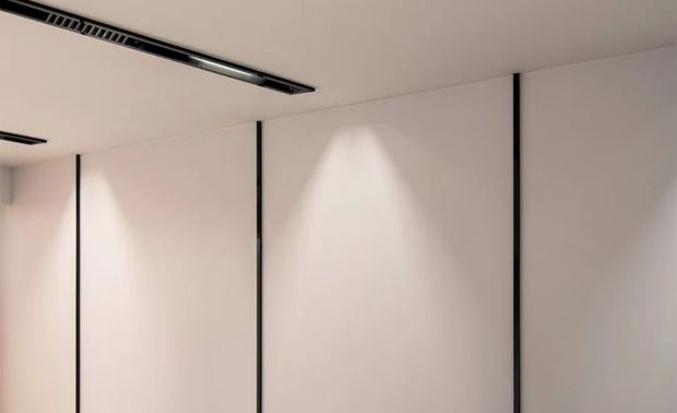 竖向的窗框搭配简约的线条,黑色的灯带与白色的墙面形成鲜明的对比,点缀了现代办公的精致感。