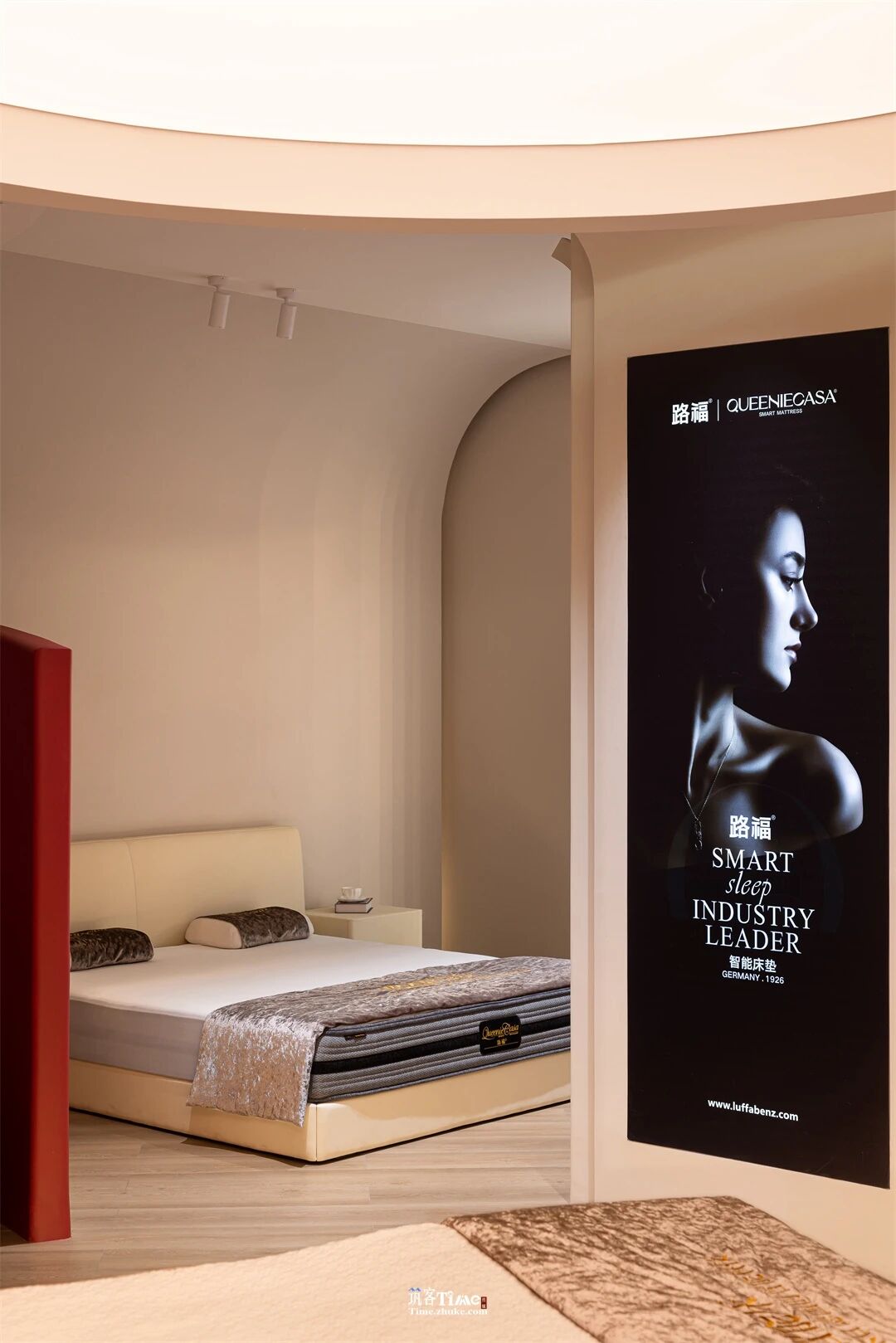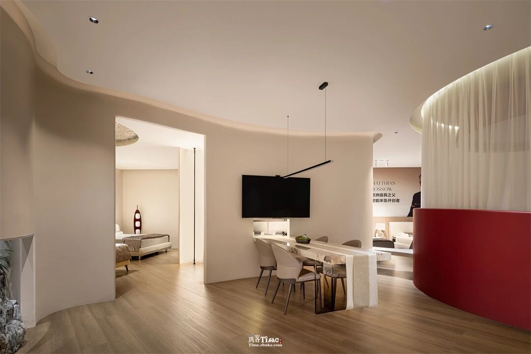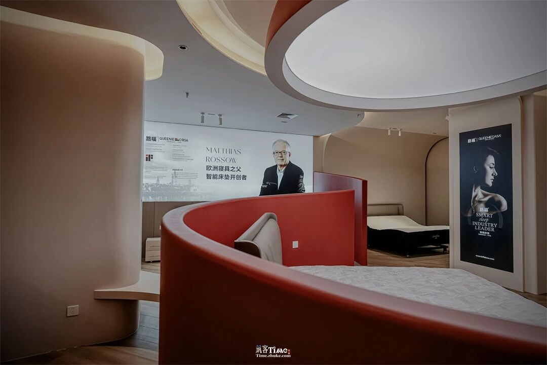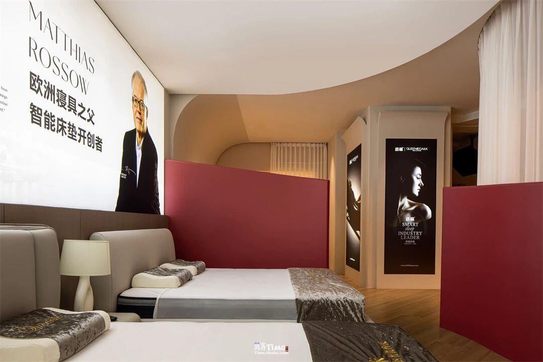用户体验:通过视觉牵引与动线引导激发探索欲,顶光营造静谧私域,让用户成为体验主角;材质触感、产品承托与光影细节的融合,强化沉浸式休憩感受;红白色彩的碰撞平衡静谧与活力,实现喧嚣剥离、身心放松的深度体验,让用户在探索中感知产品价值。