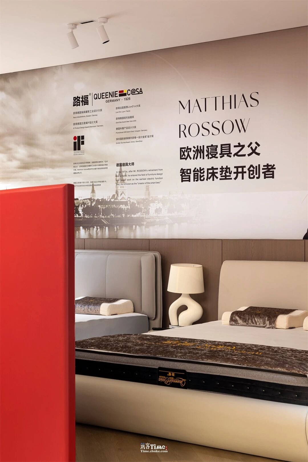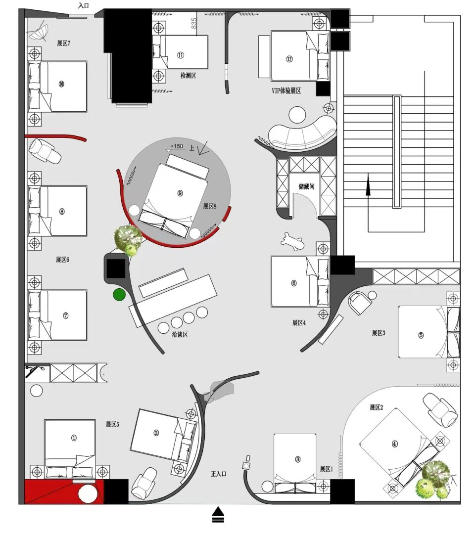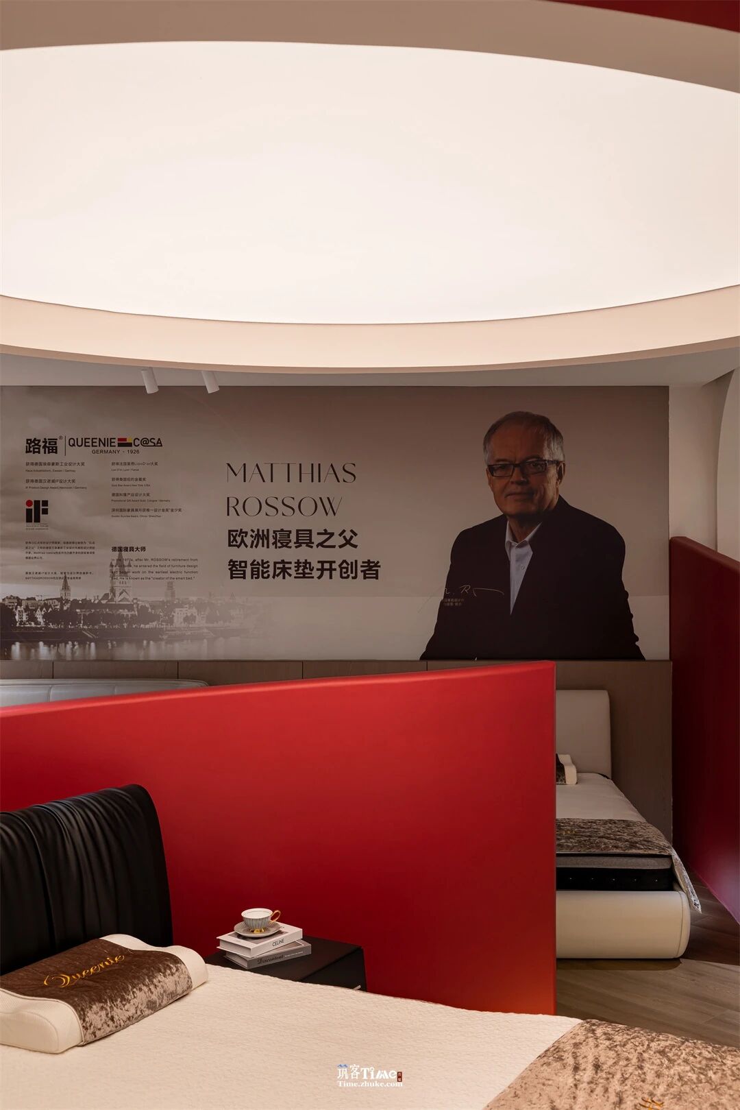 用户体验:通过视觉牵引与动线引导激发探索欲,顶光营造静谧私域,让用户成为体验主角;材质触感、产品承托与光影细节的融合,强化沉浸式休憩感受;红白色彩的碰撞平衡静谧与活力,实现喧嚣剥离、身心放松的深度体验,让用户在探索中感知产品价值。