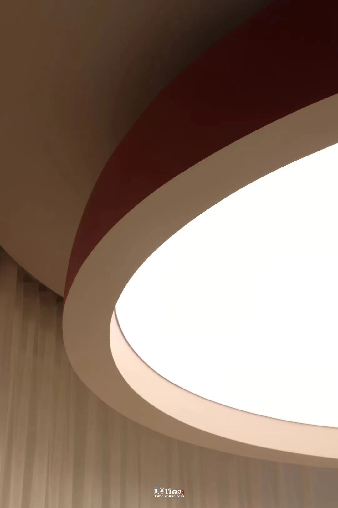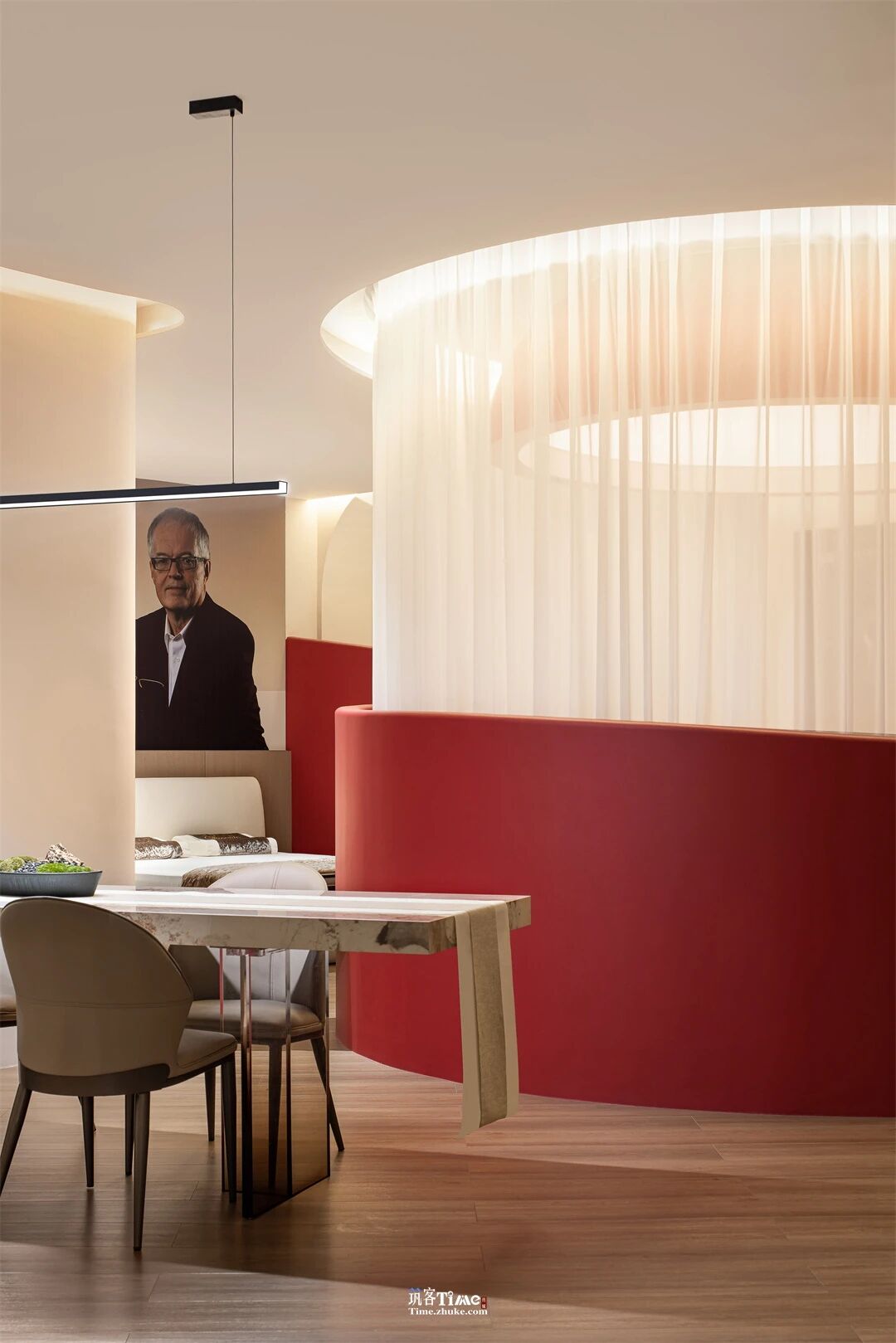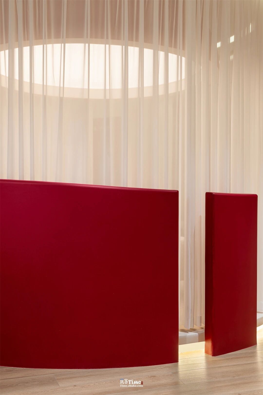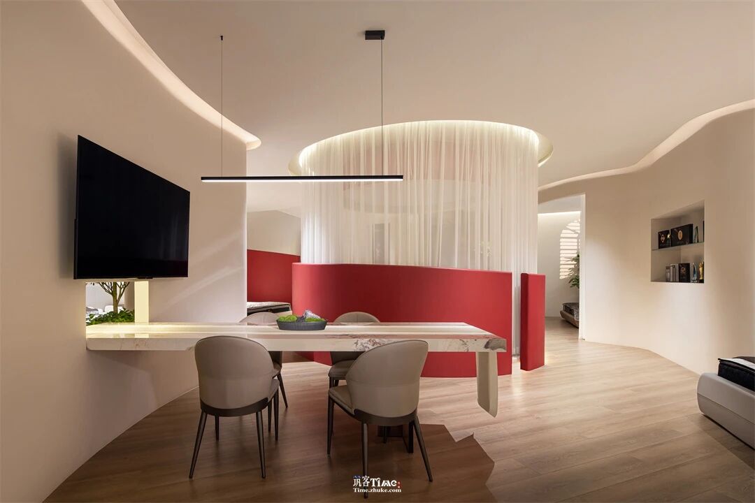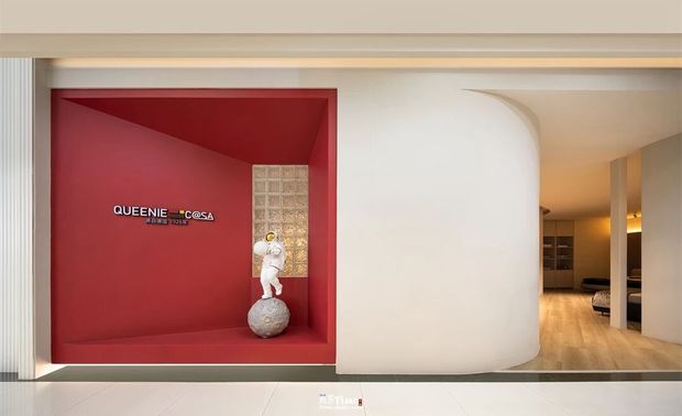 设计选材:以纯净之白为基底,搭配炽烈红色作为点睛元素;运用纯白薄纱、弧形红墙、透景窗格等材质,结合半圆穹顶、曲线肌理等造型;通过顶光、光锥等光影设计,营造素雅且富有张力的空间质感,兼顾视觉冲击与舒适体验。