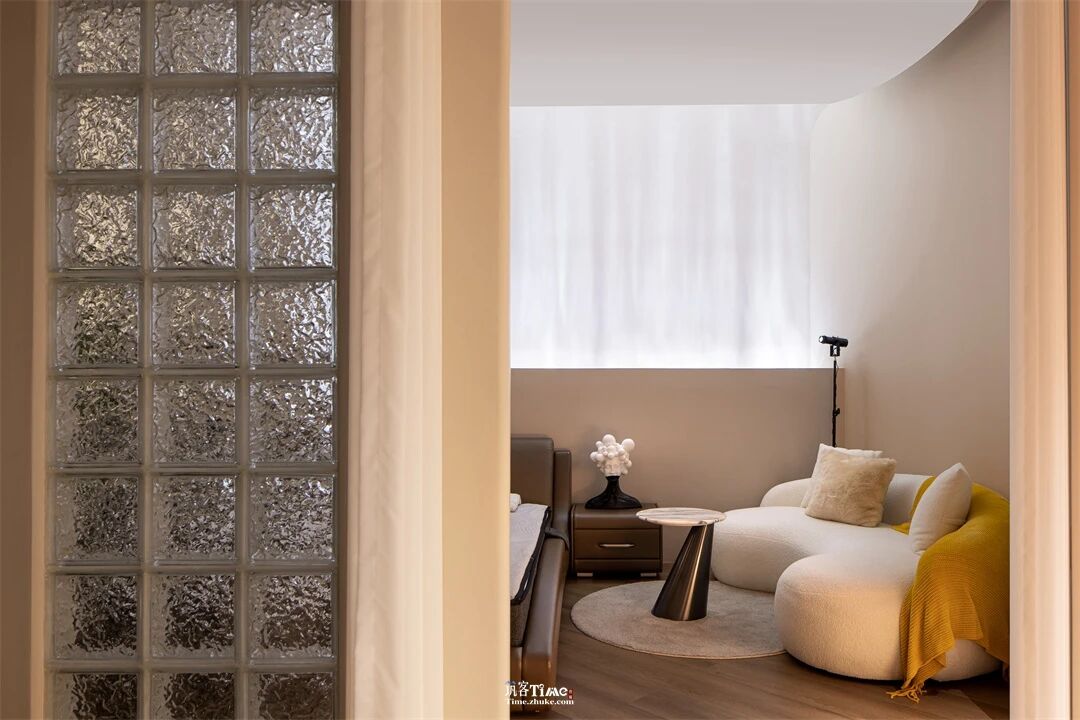 空间布局:以蜿蜒曲线为动线核心,形成“曲径通幽”的探索路径;洽谈区居于空间中心,借透景窗格衔接周边展区;区域间无缝衔接,通过外扩内收的入口设计、透景玄关、弧形边界等元素,实现视线与步履的自由穿梭,打造开放而富有层次的空间秩序。
