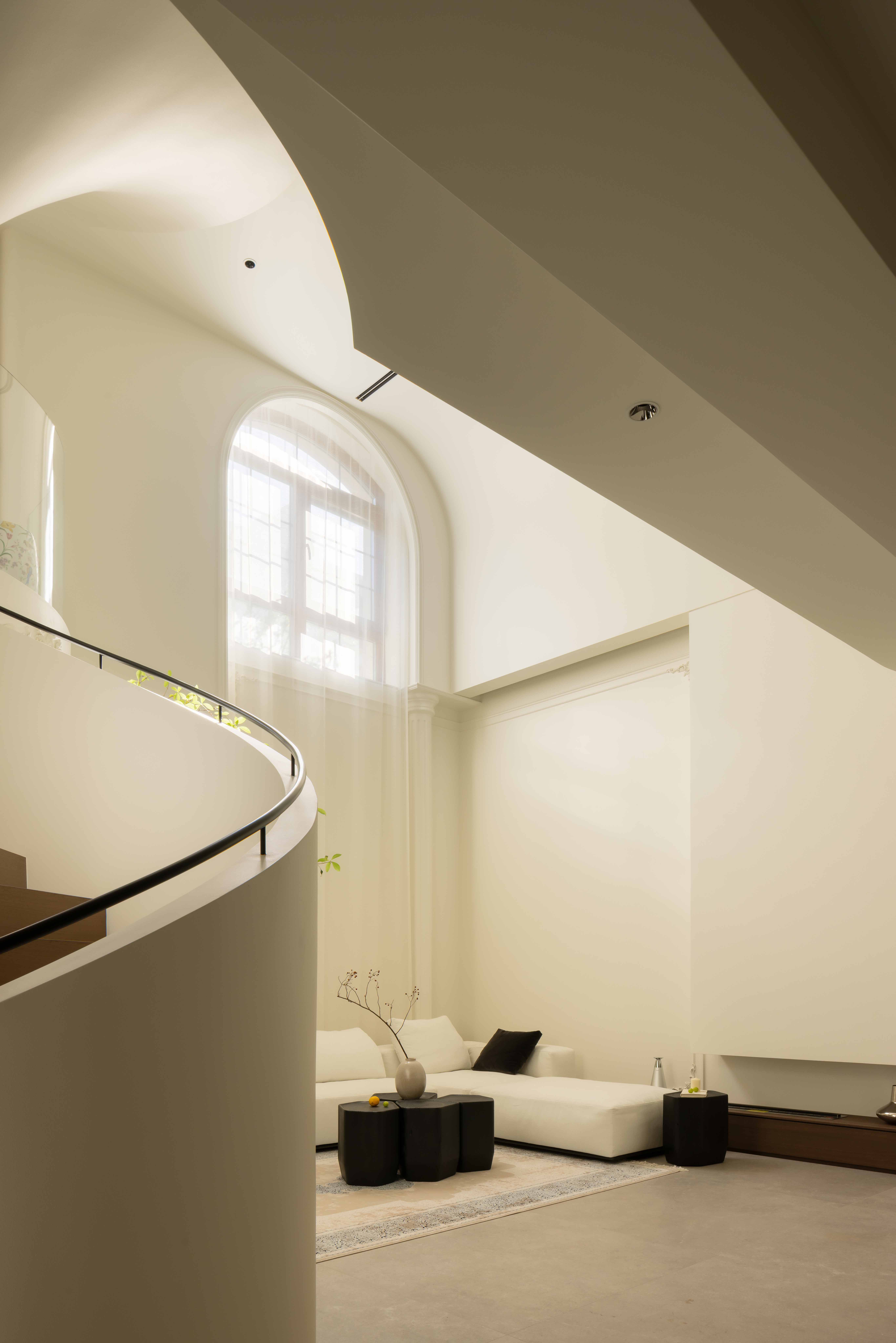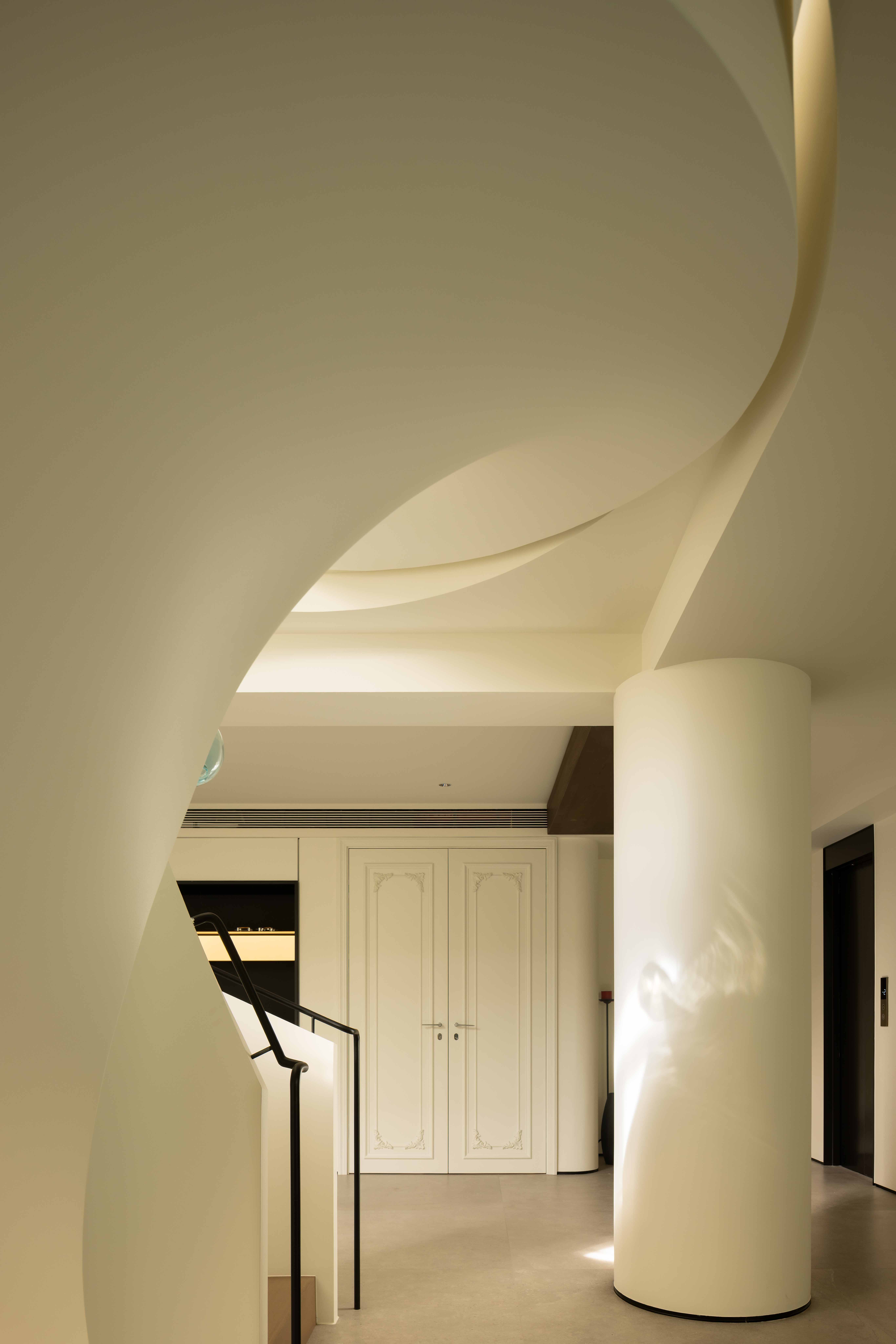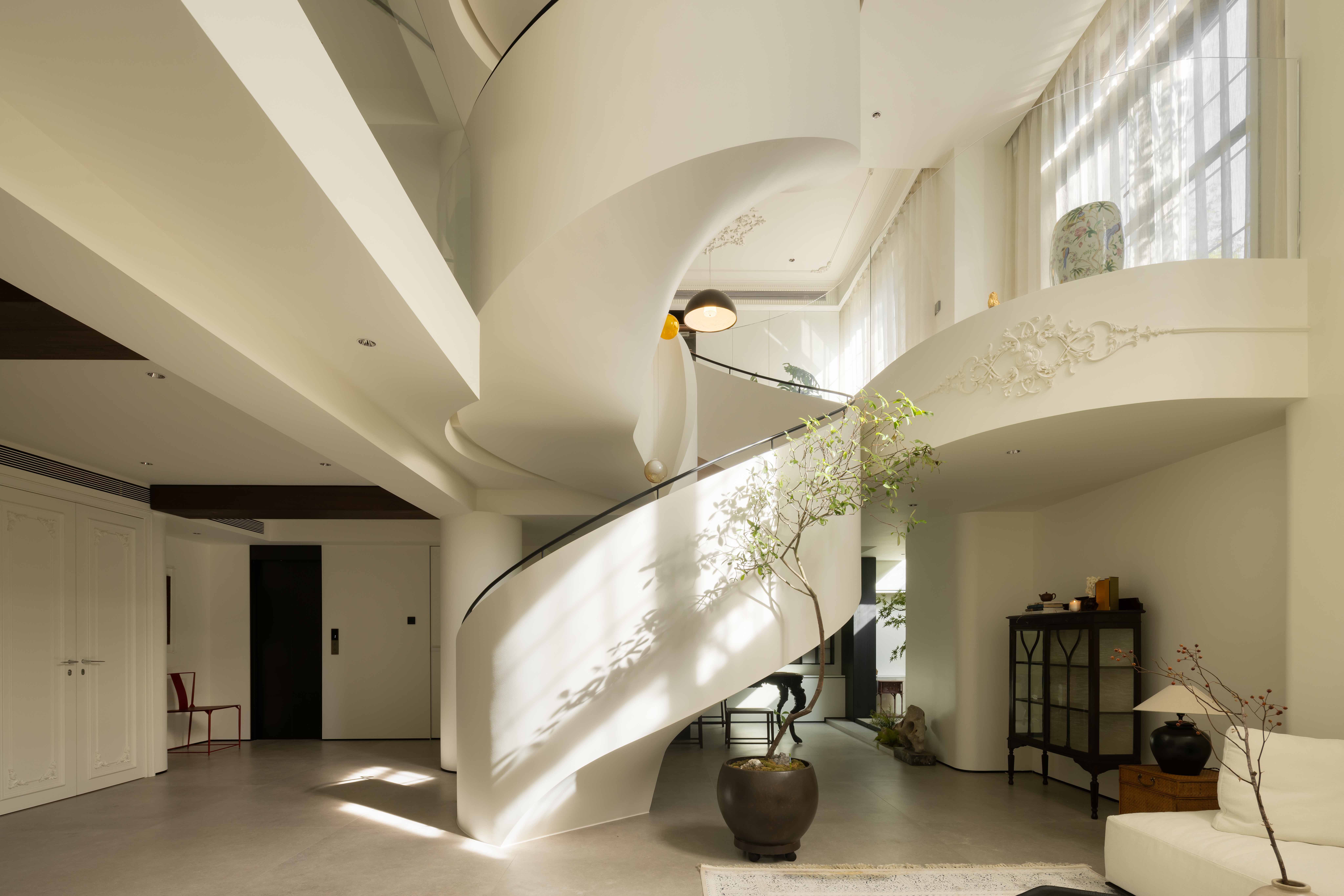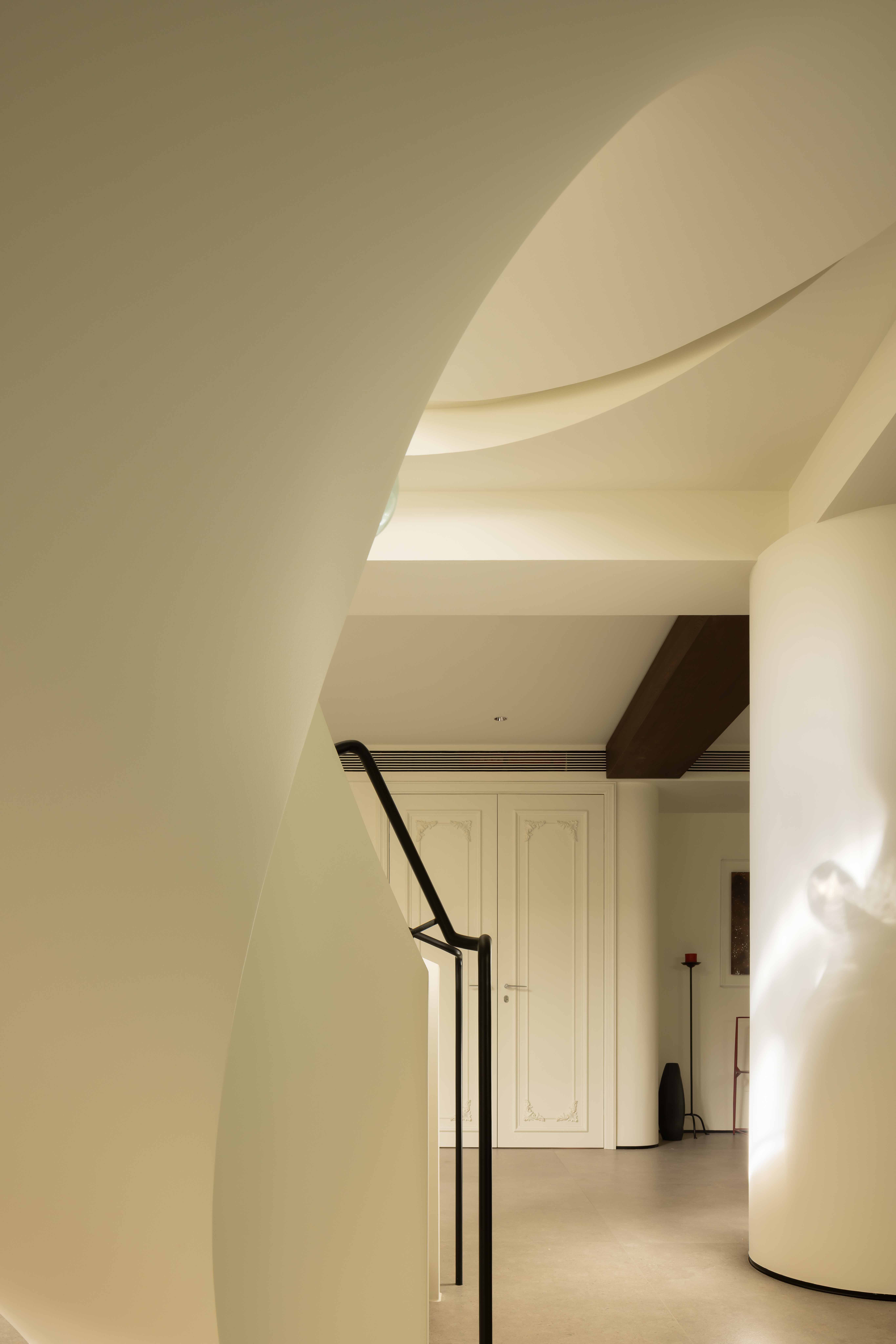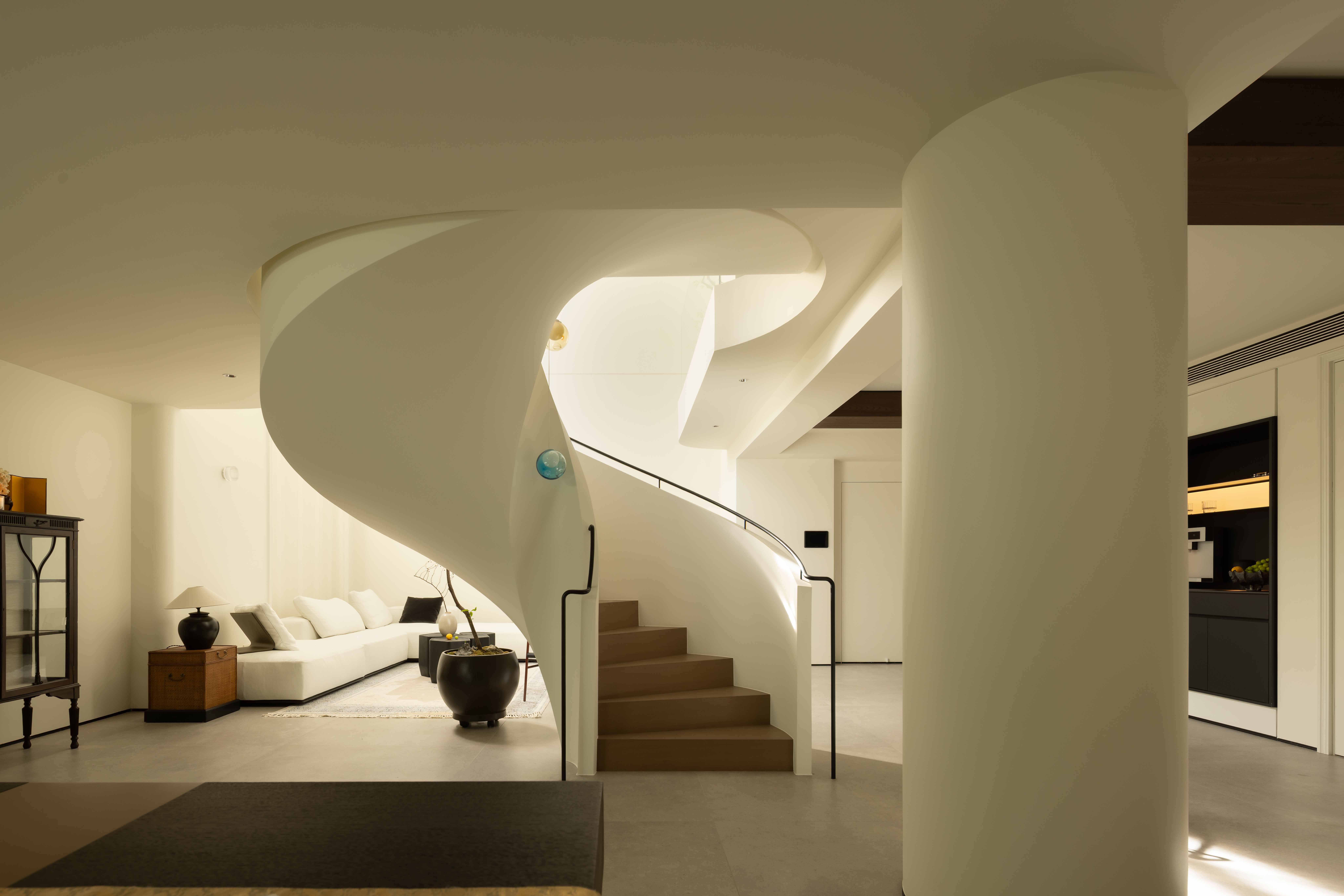 空间意境:空间的绝对焦点,是那座宛若艺术雕塑的旋转楼梯。它不仅是连接垂直空间的功能性构件,更是整个家的精神象征。其优美的螺旋曲线,以一种毫不费力的姿态,打破了空间的静态格局,引入了动态的流动感。楼梯的线条柔和而富有张力,在自然光线的雕琢下,于墙面和地面投射出不断变化的光影画卷,使空间随着时间流转而焕发生机