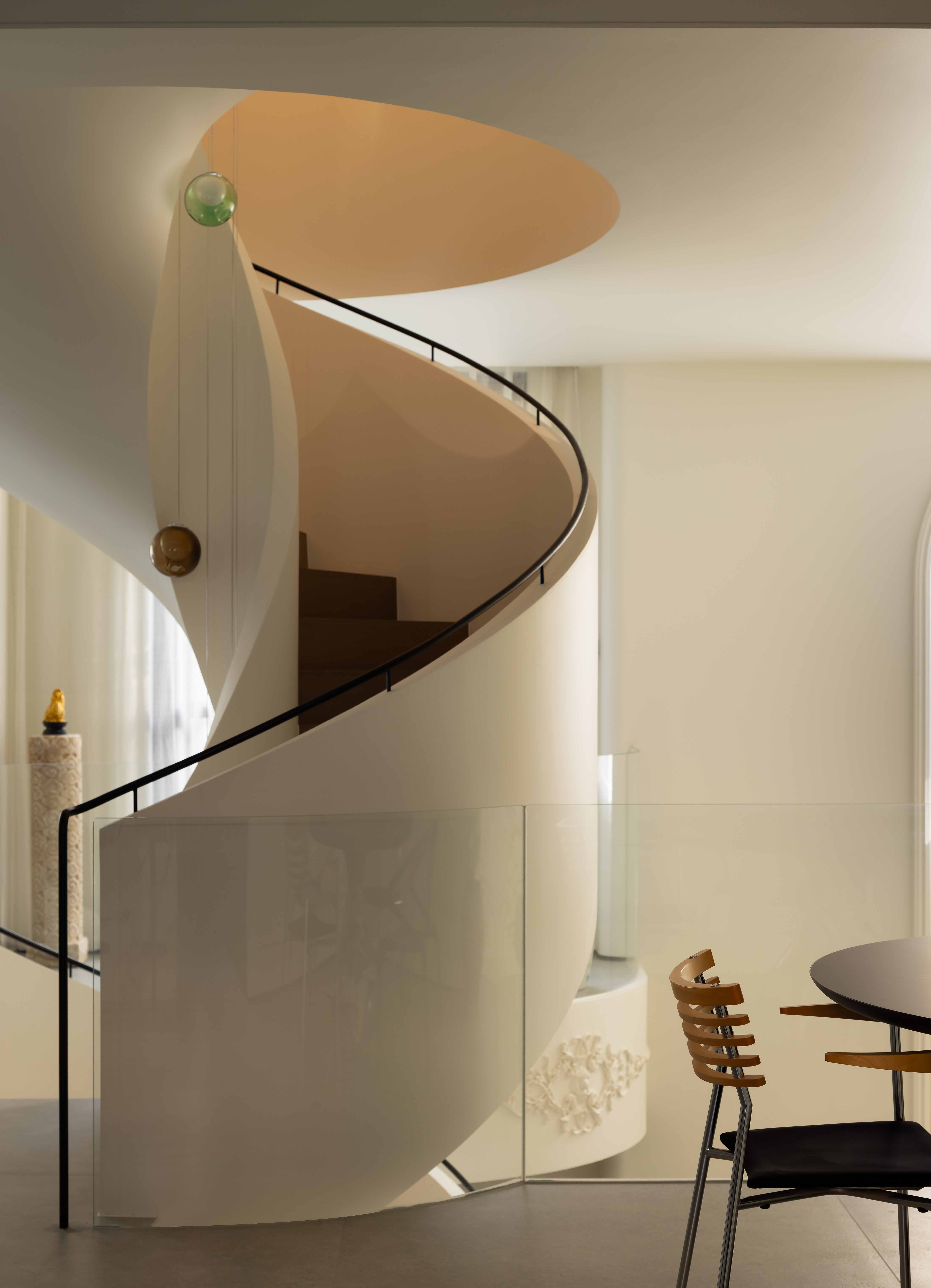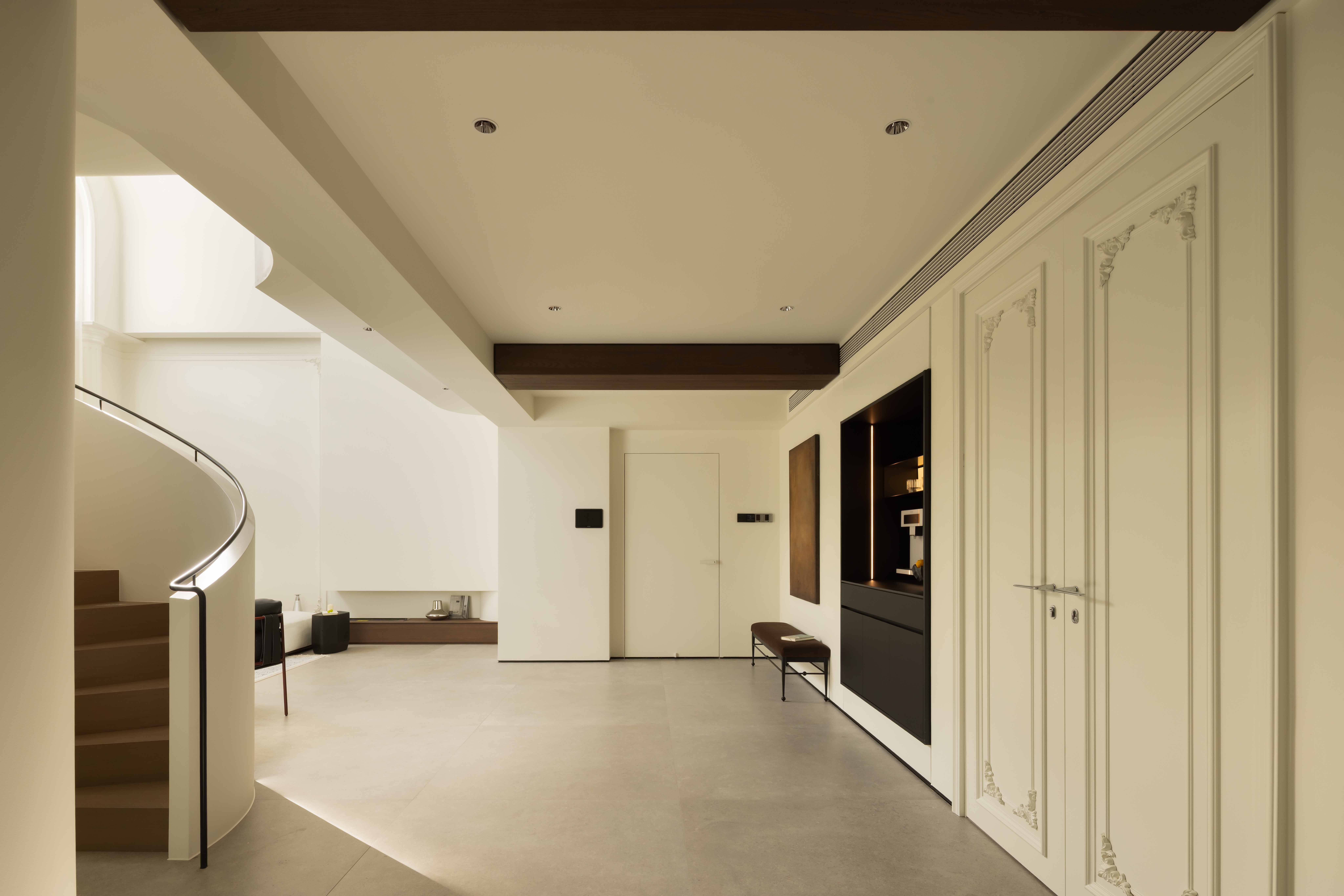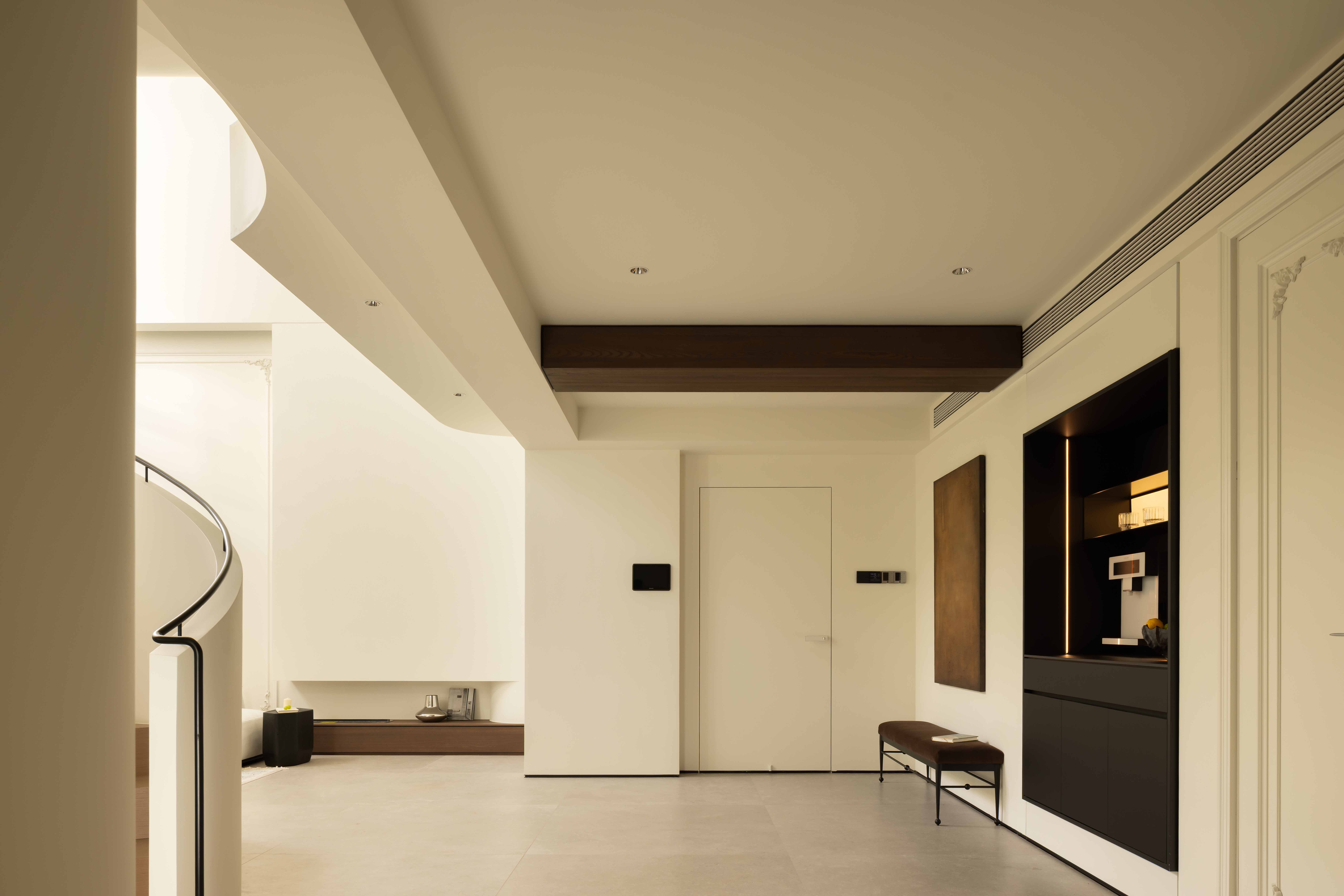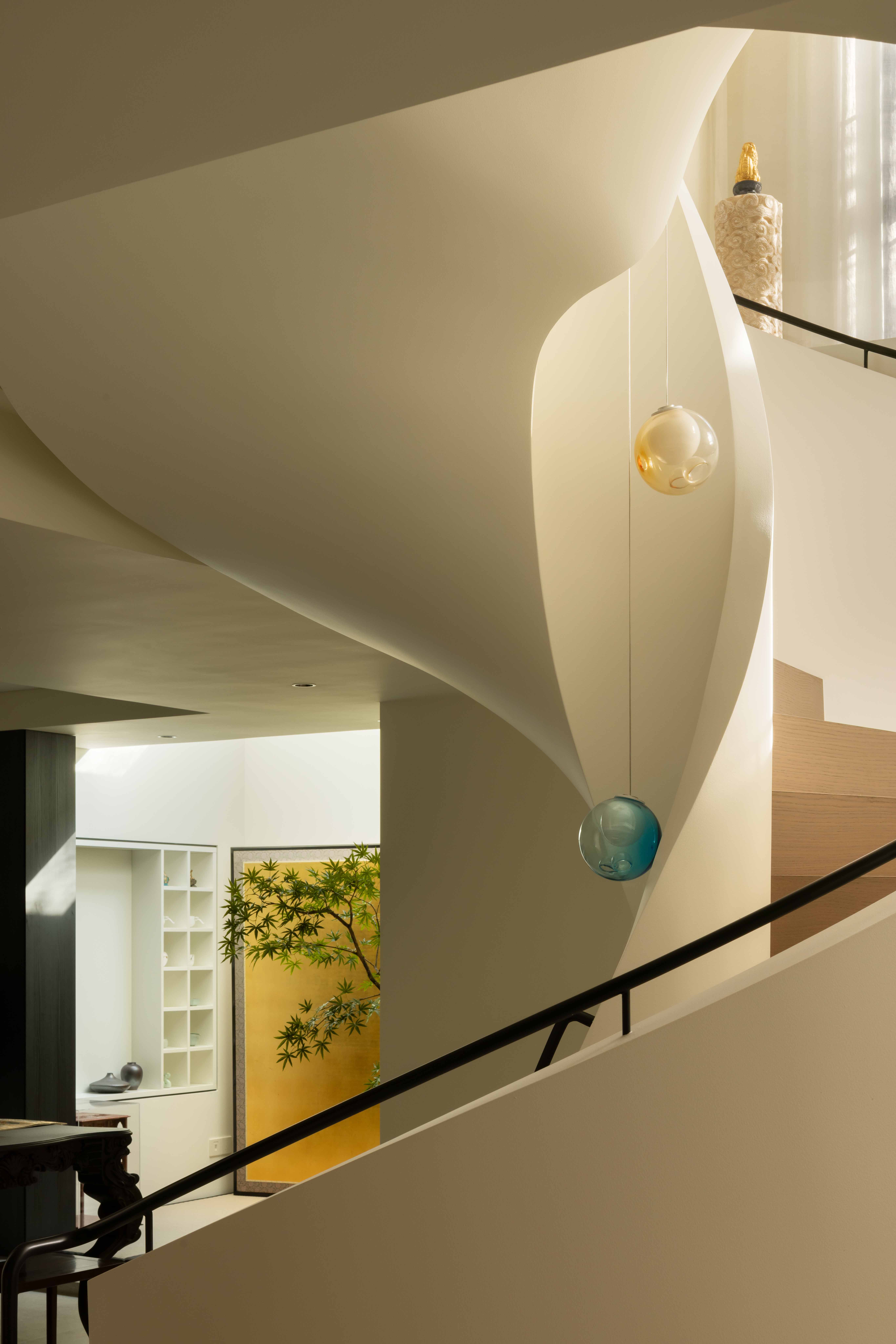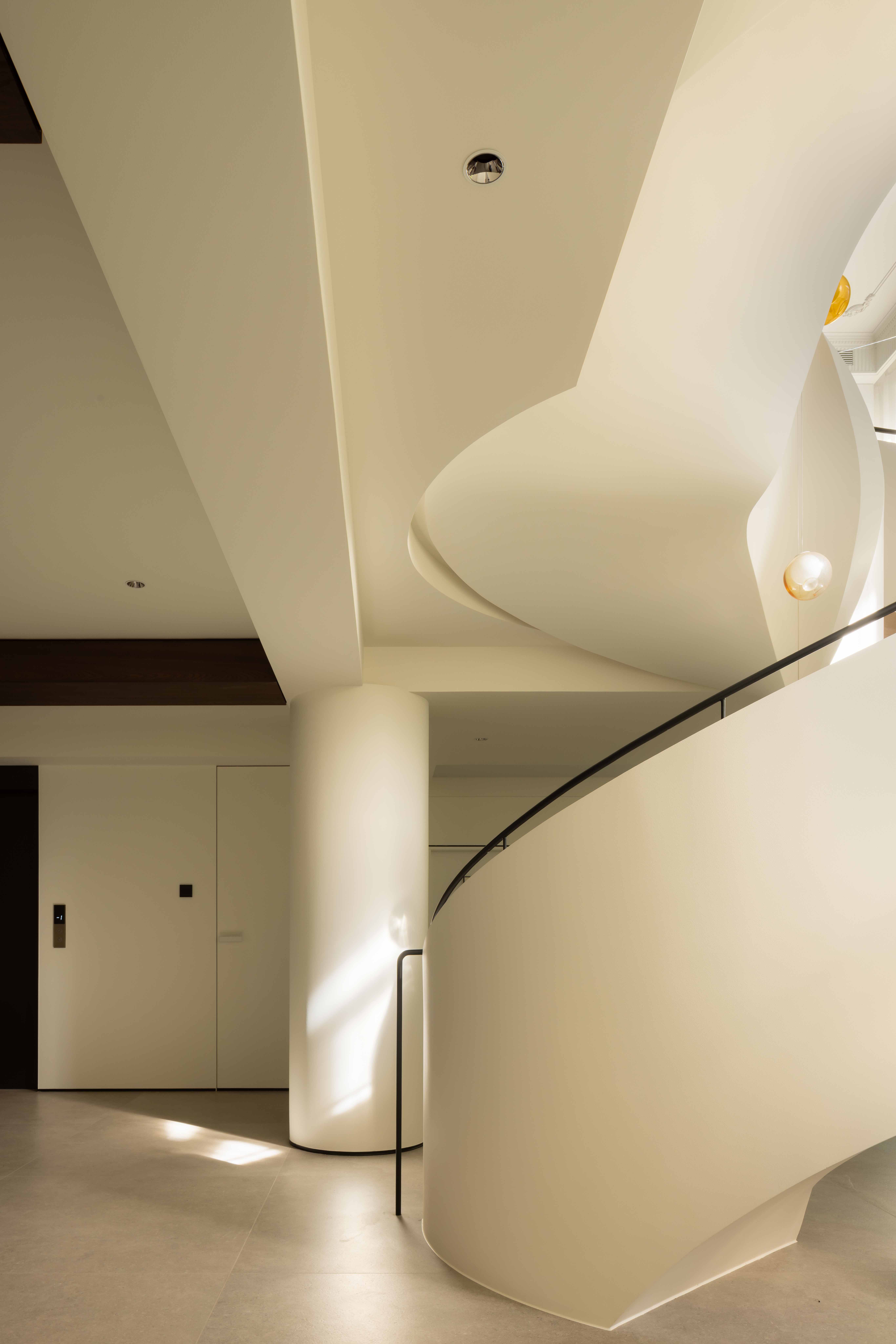 空间意境:空间的绝对焦点,是那座宛若艺术雕塑的旋转楼梯。它不仅是连接垂直空间的功能性构件,更是整个家的精神象征。其优美的螺旋曲线,以一种毫不费力的姿态,打破了空间的静态格局,引入了动态的流动感。楼梯的线条柔和而富有张力,在自然光线的雕琢下,于墙面和地面投射出不断变化的光影画卷,使空间随着时间流转而焕发生机