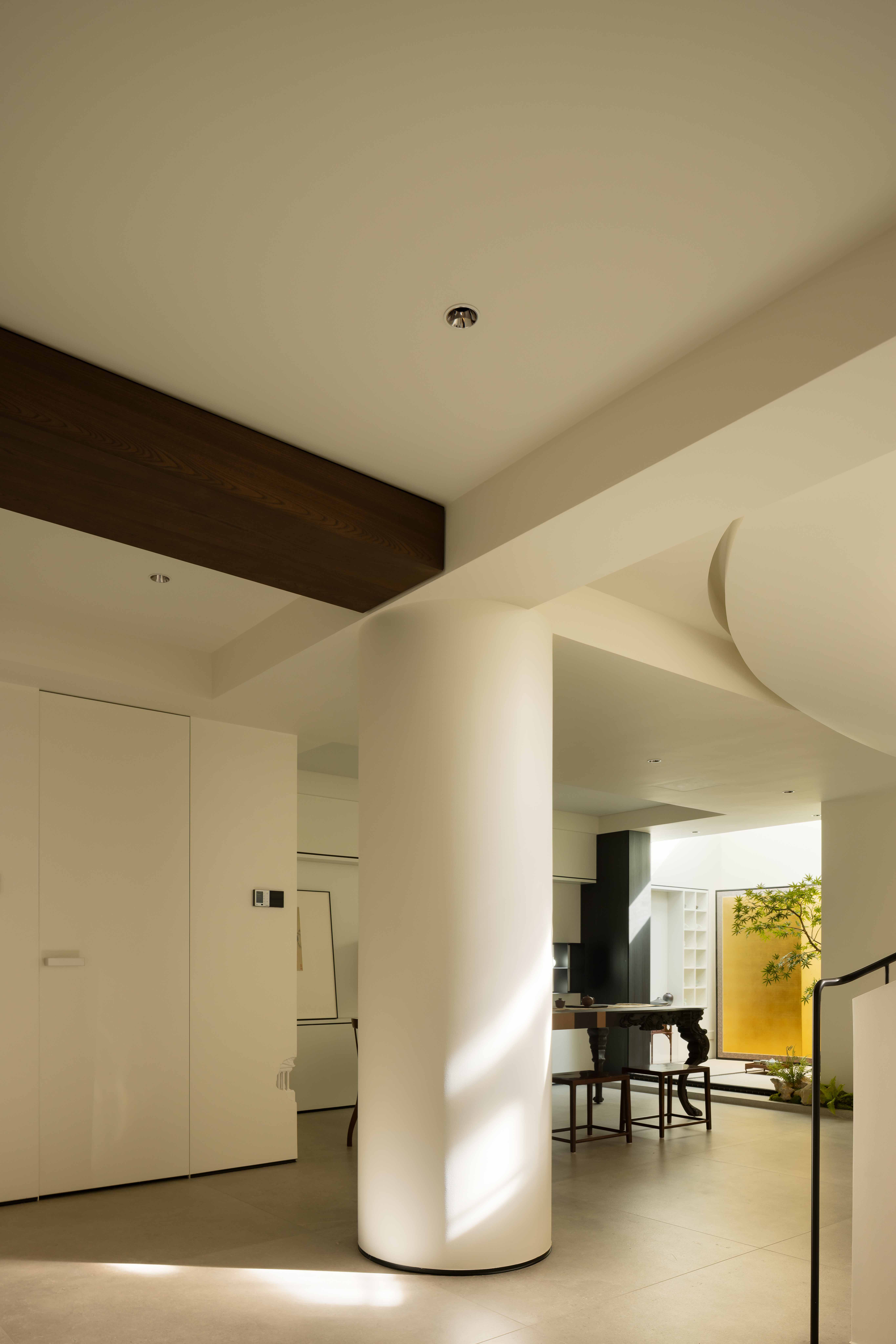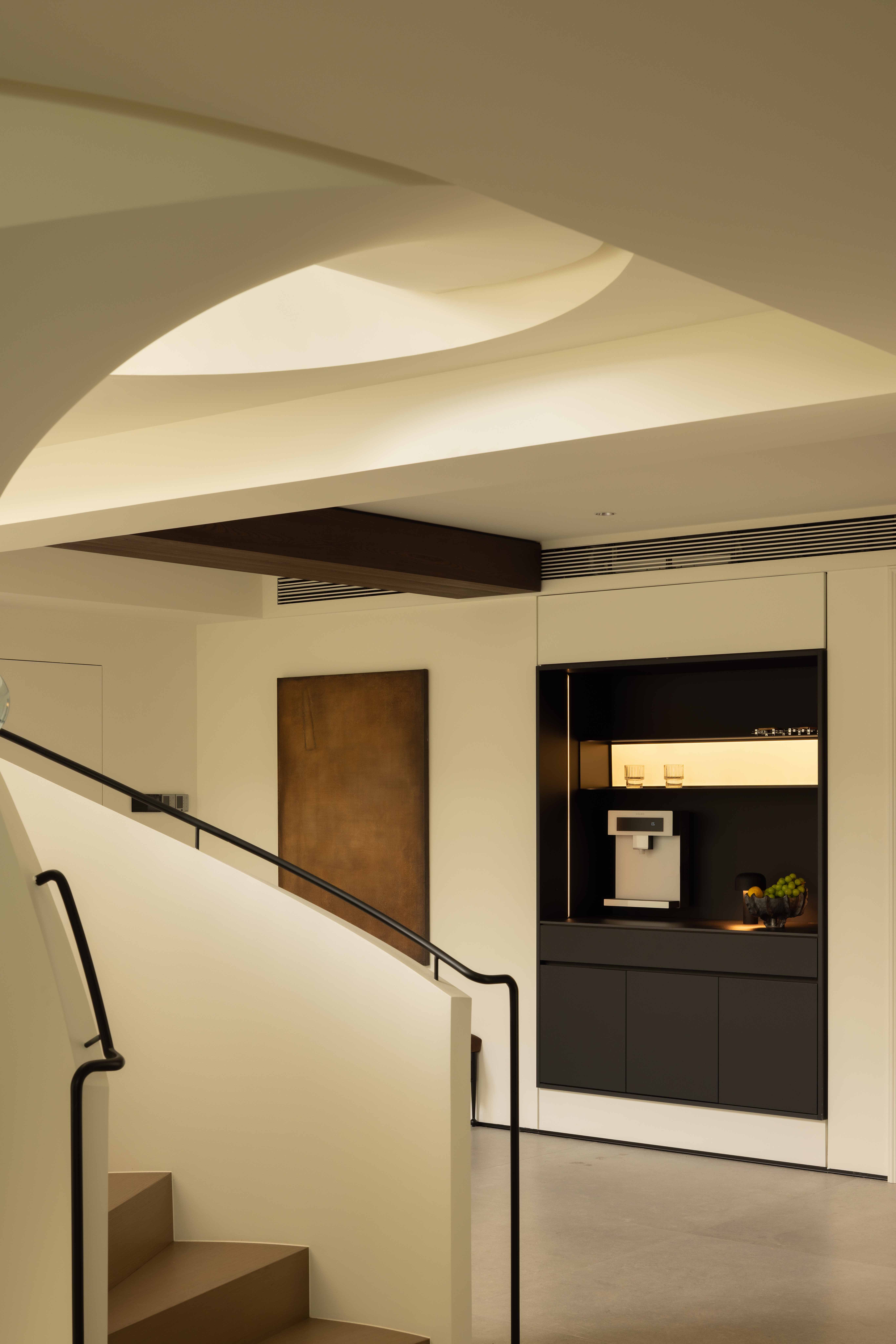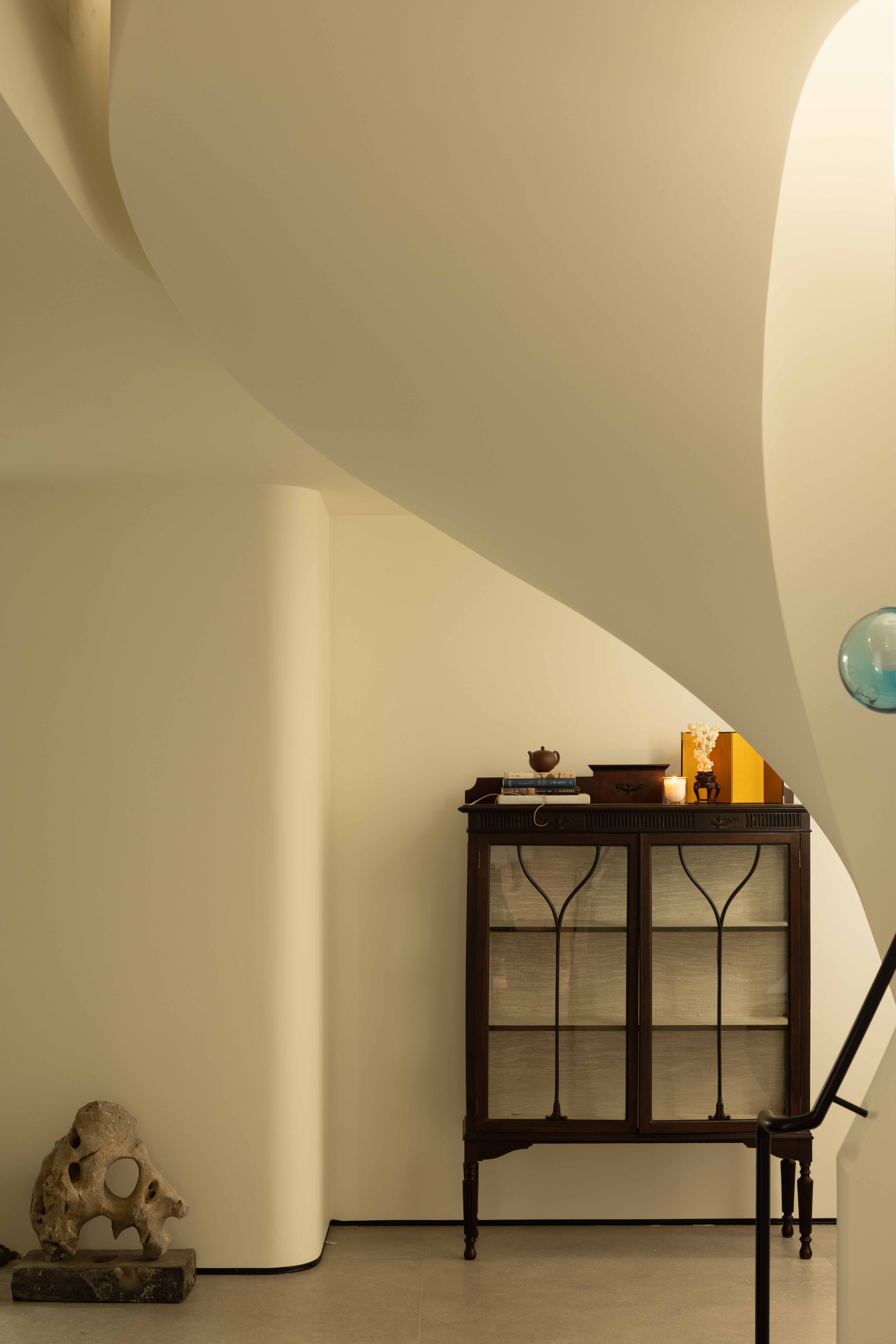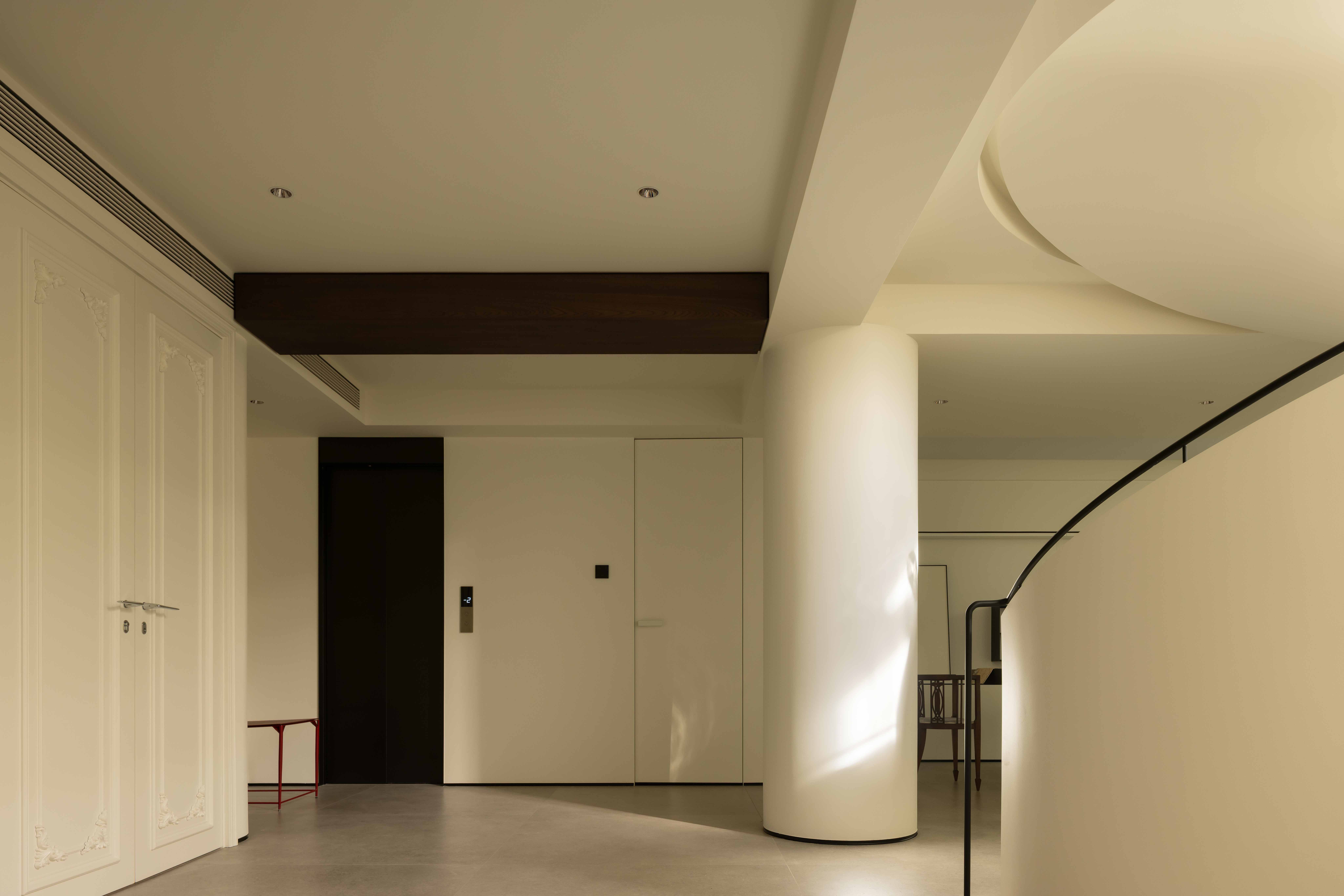 空间意境:空间的绝对焦点,是那座宛若艺术雕塑的旋转楼梯。它不仅是连接垂直空间的功能性构件,更是整个家的精神象征。其优美的螺旋曲线,以一种毫不费力的姿态,打破了空间的静态格局,引入了动态的流动感。楼梯的线条柔和而富有张力,在自然光线的雕琢下,于墙面和地面投射出不断变化的光影画卷,使空间随着时间流转而焕发生机