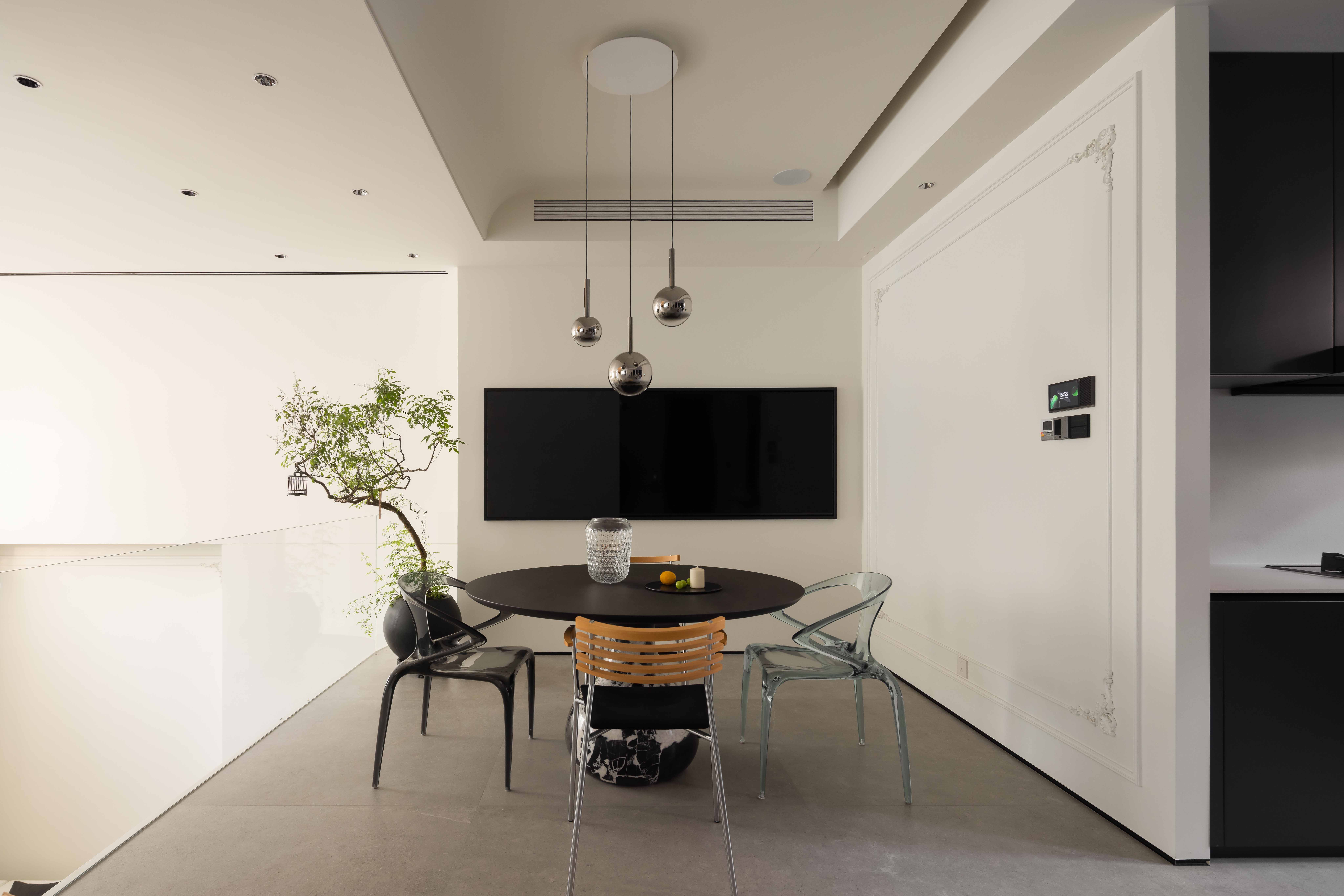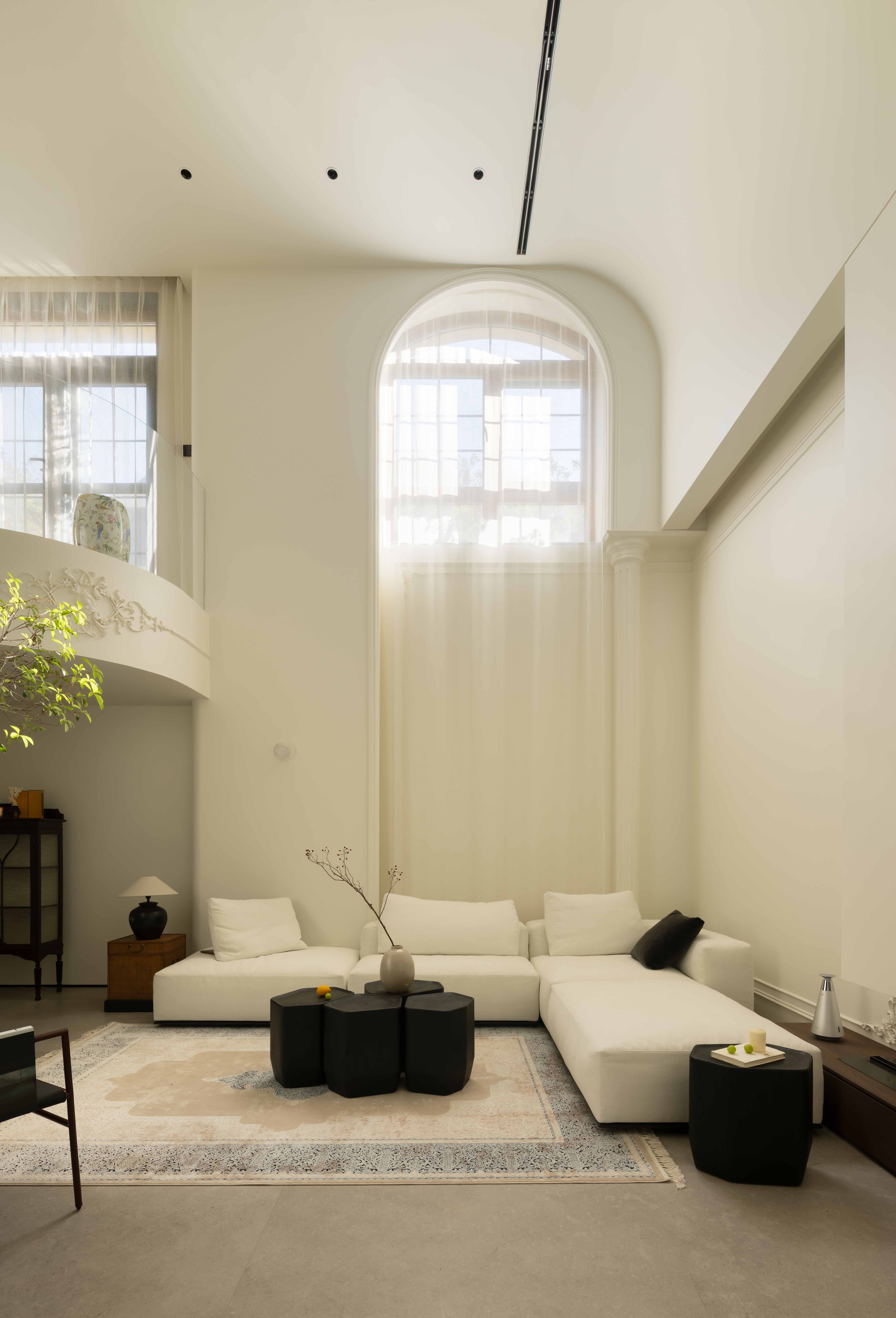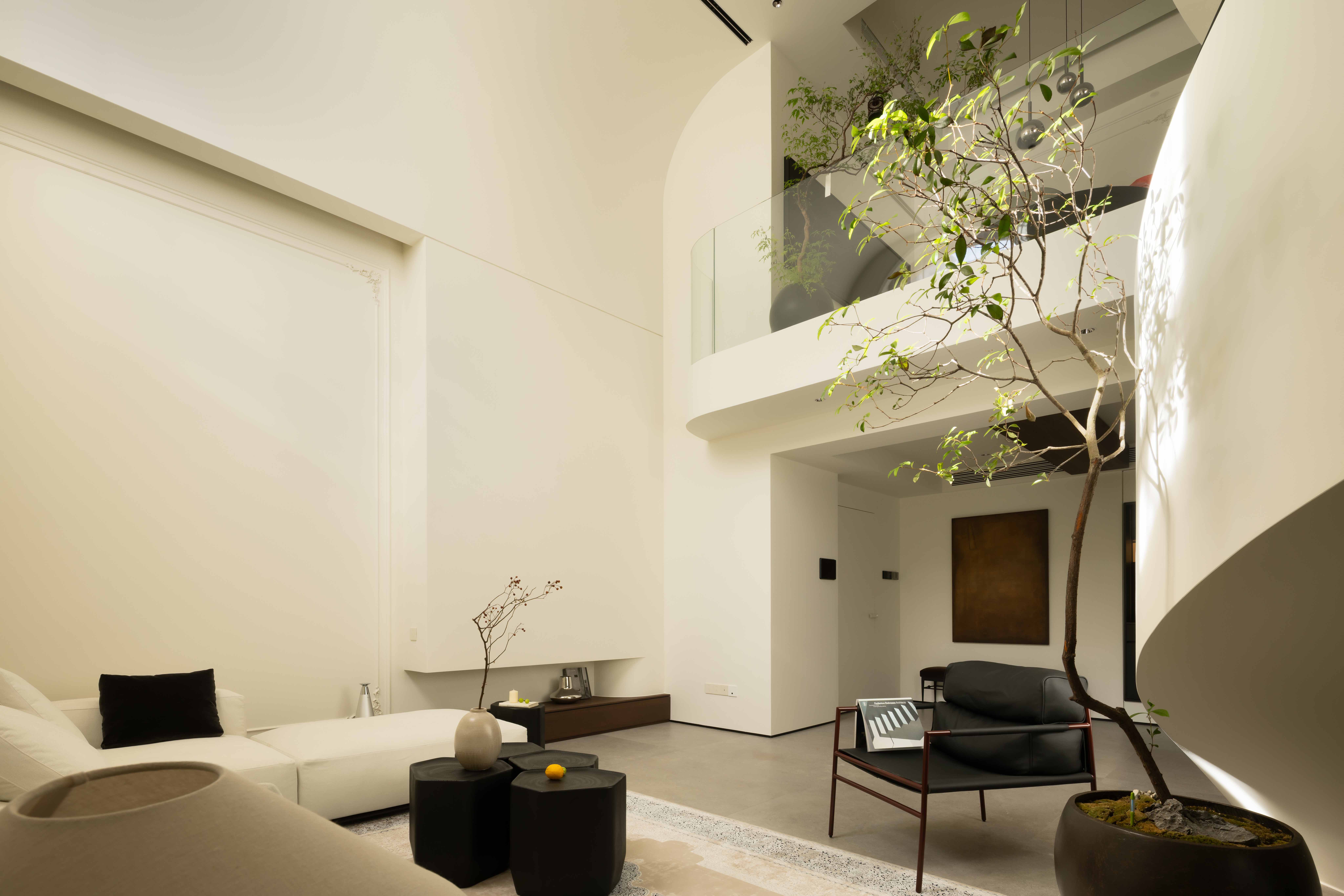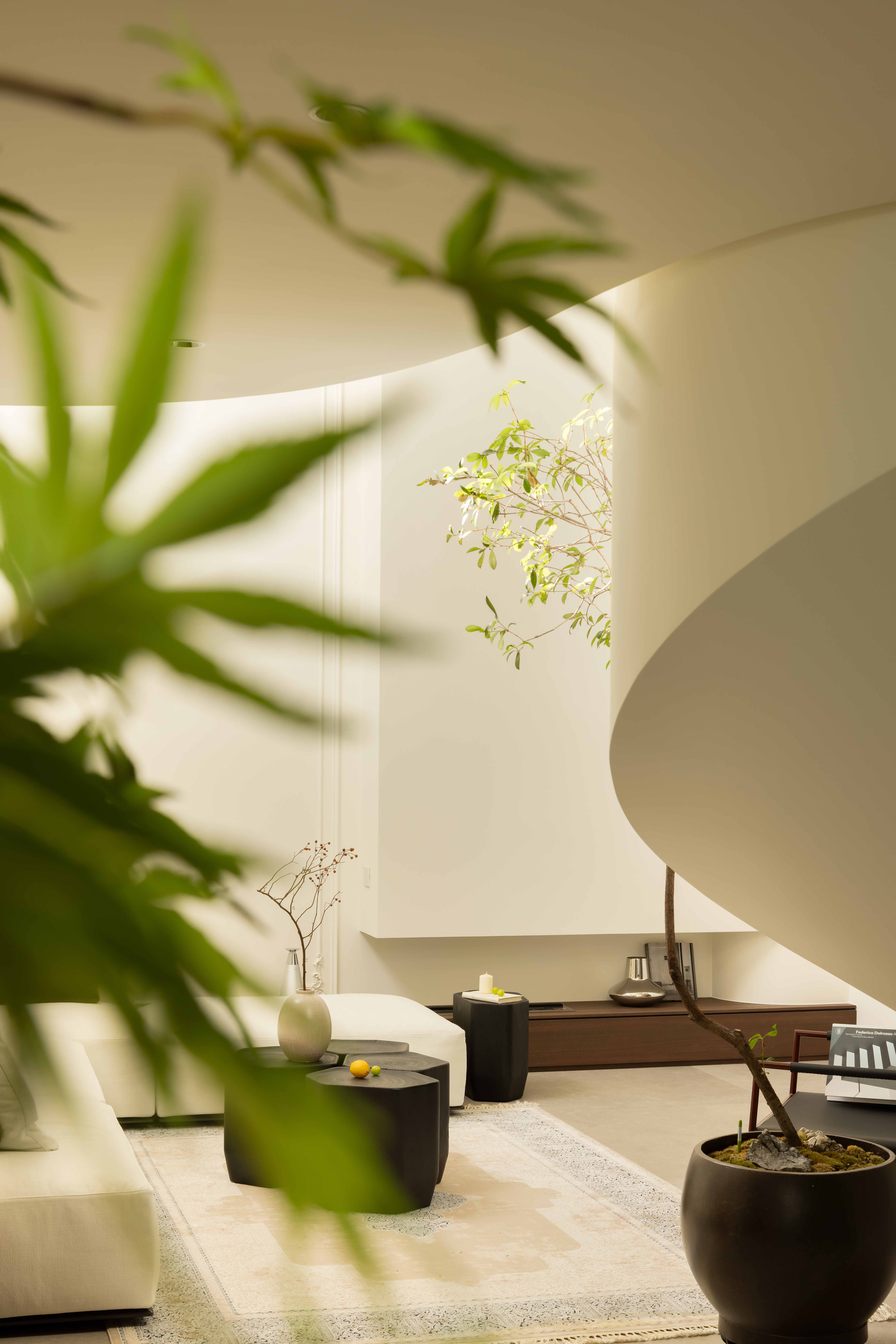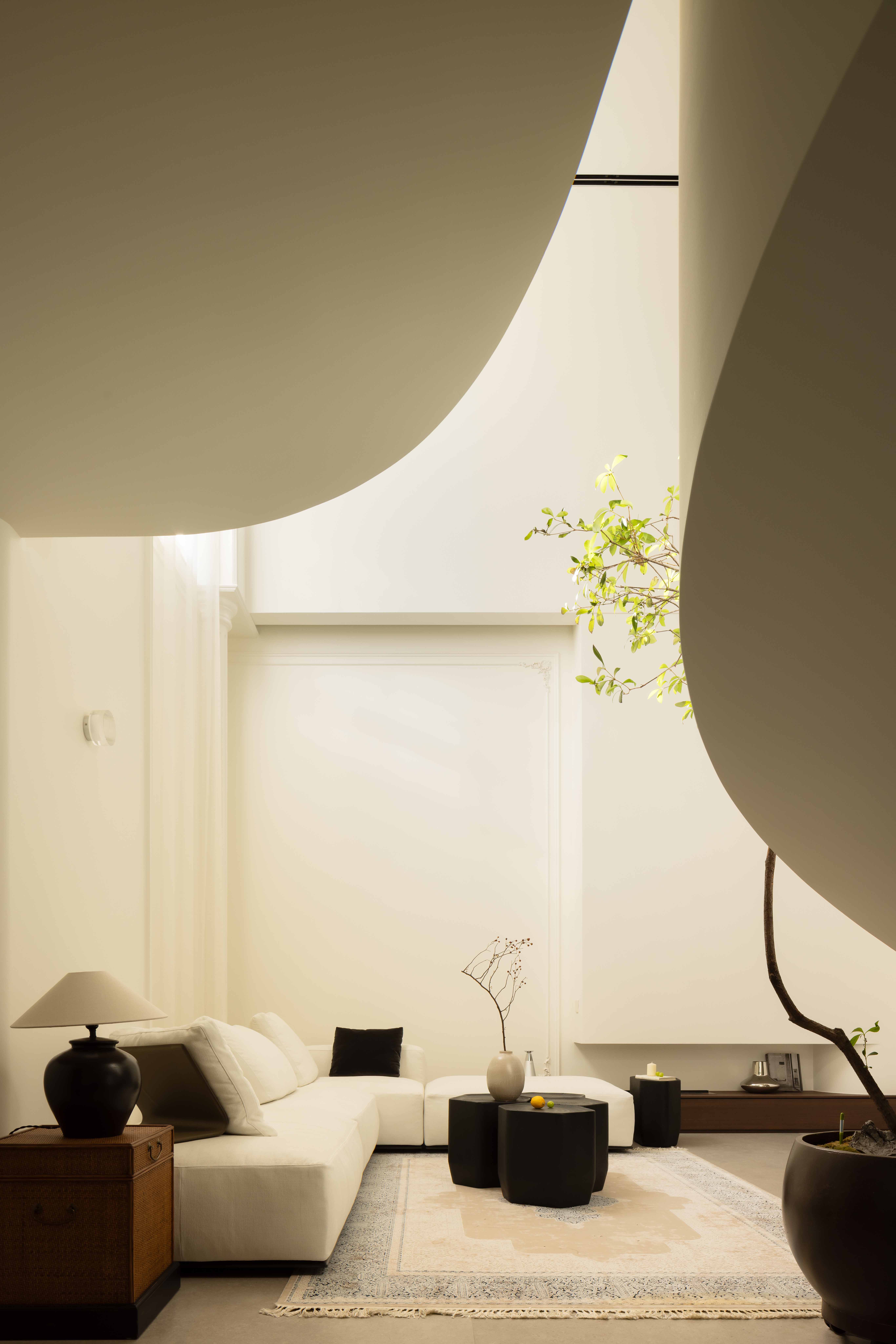 空间意境:空间的绝对焦点,是那座宛若艺术雕塑的旋转楼梯。它不仅是连接垂直空间的功能性构件,更是整个家的精神象征。其优美的螺旋曲线,以一种毫不费力的姿态,打破了空间的静态格局,引入了动态的流动感。楼梯的线条柔和而富有张力,在自然光线的雕琢下,于墙面和地面投射出不断变化的光影画卷,使空间随着时间流转而焕发生机