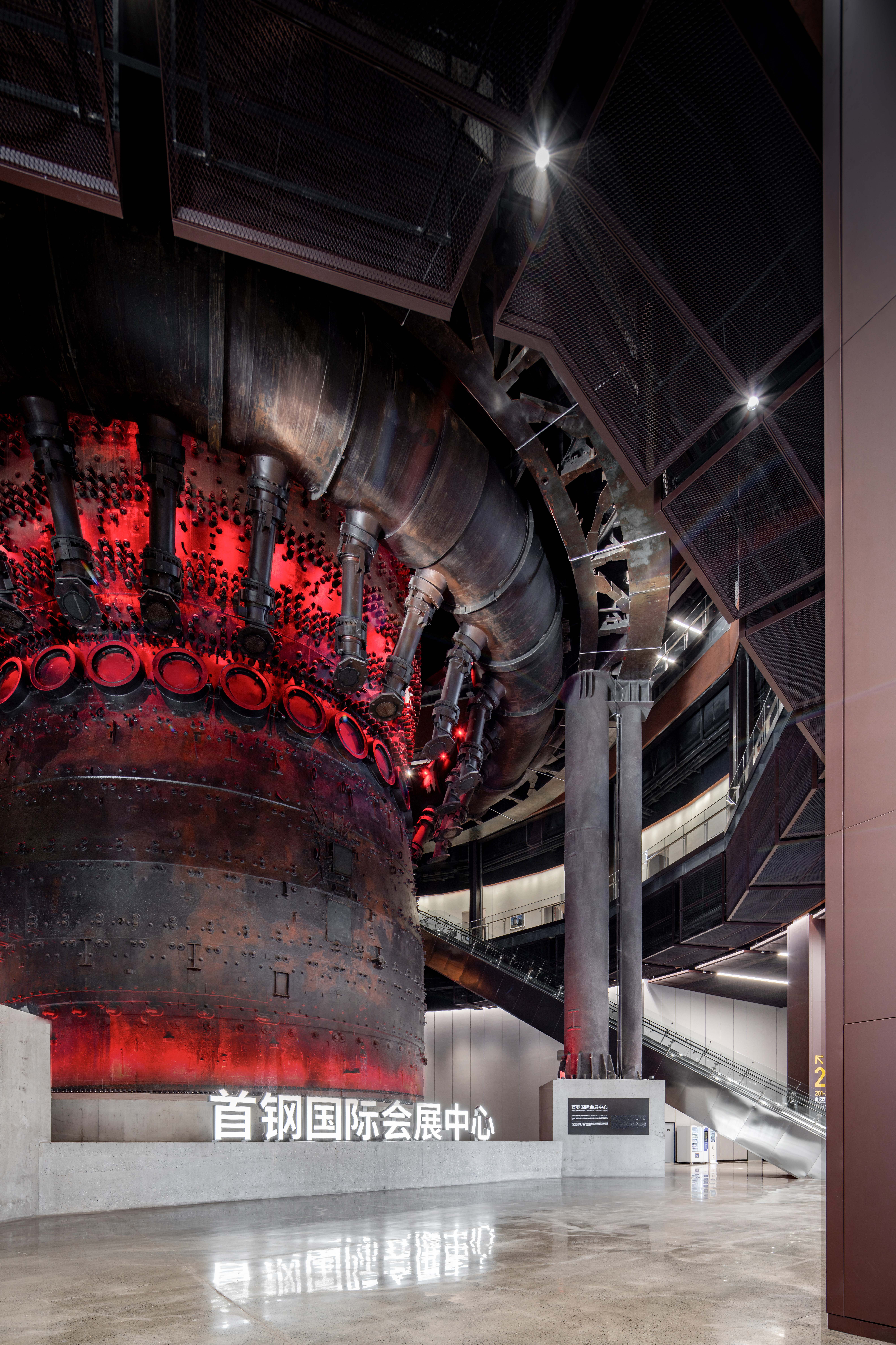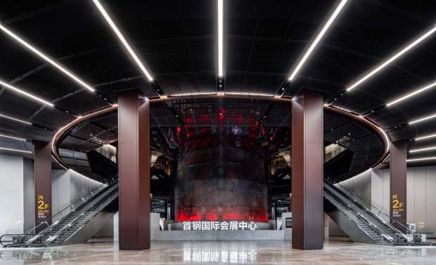 空间布局:四高炉作为服贸会的国门会客枢纽,保留工业遗存的醇厚记忆,建构和自然空间的有效对话,精装改造面积近万平方米。设计团队将四高炉改造为集会议、展览、接待于一体的综合性场馆——首钢国际会展中心的重要组成部分。设计选择完整保留其结构与外观,将其作为核心历史展品和最具震撼力的空间标识融入新功能中,实现对资源与独特高大空间的创新性可持续利用。