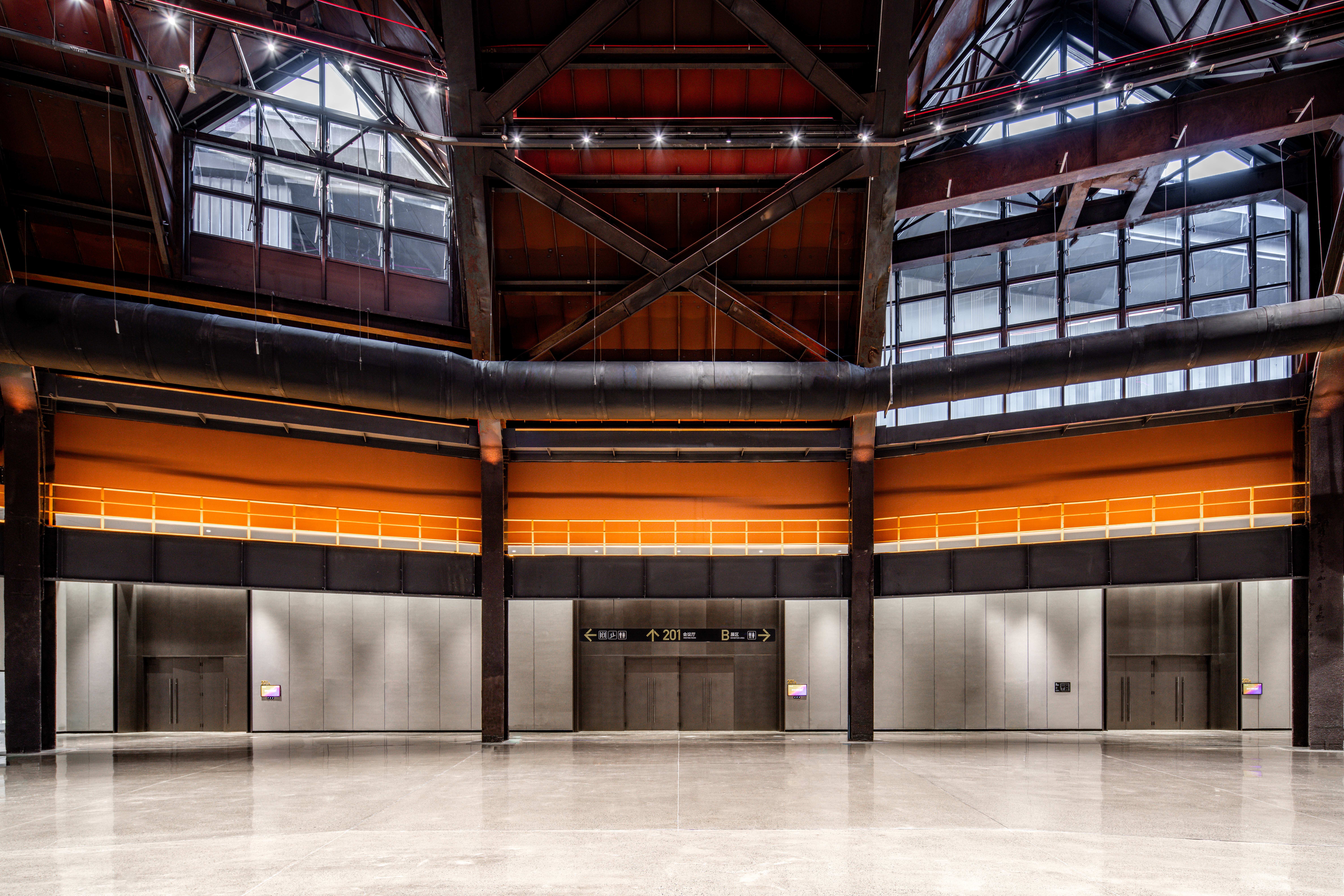 设计选材:空间设计注重灵活性,采用可移动隔断、模块化家具等,使展厅和会议空间能根据“平时”与“会时”(展会期间)的不同需求进行快速转换,与周边展馆共同形成尺度宜人的展览集群。原有的工业材质,如锈蚀钢板、裸露的钢结构、水泥地面等,强调历史的真实质感。精心植入现代、精致的材料如金属网单元吊顶、吸声硬包、木饰面、预制水磨石等,与粗犷的旧肌理形成鲜明对比,凸显时代感与品质感。