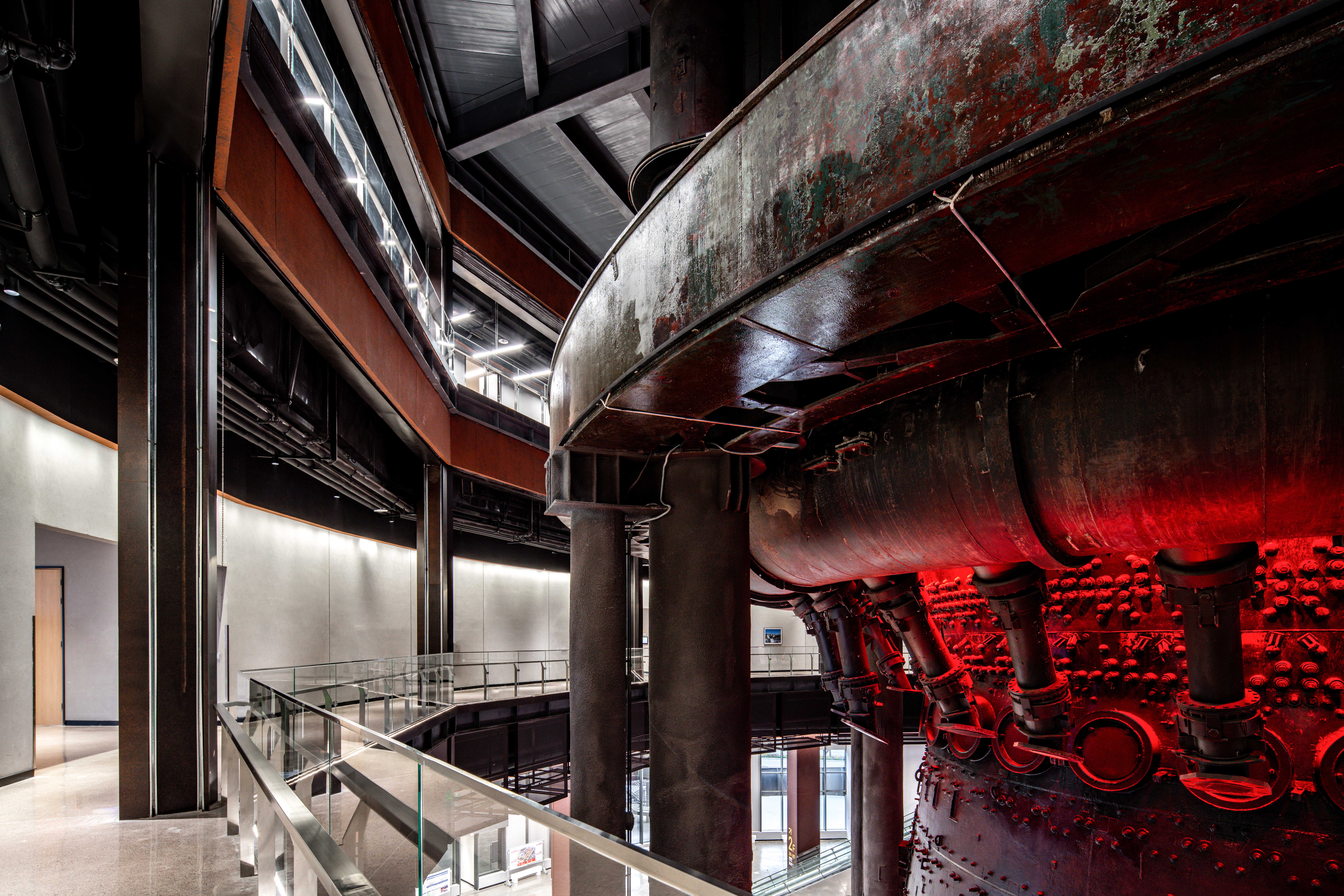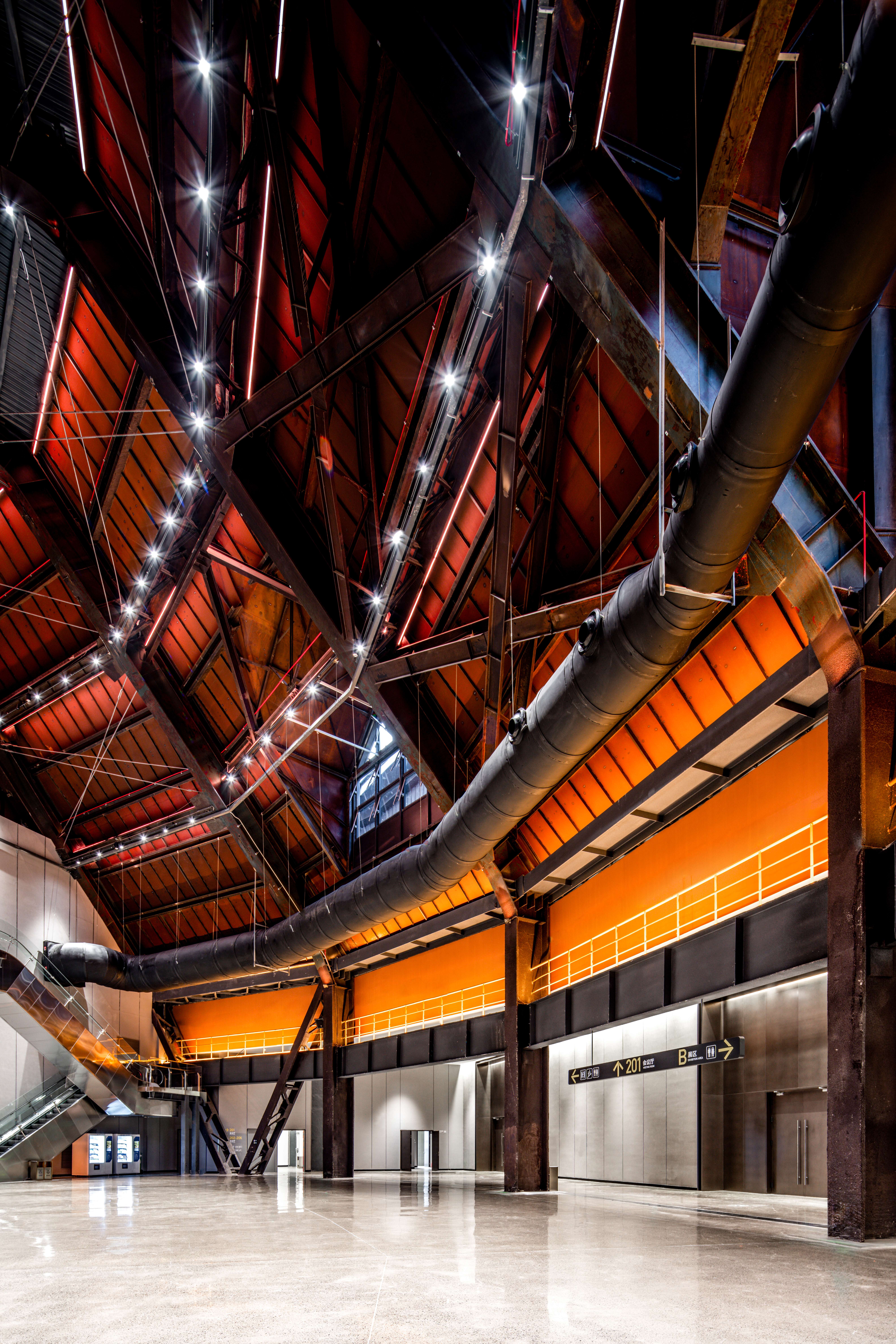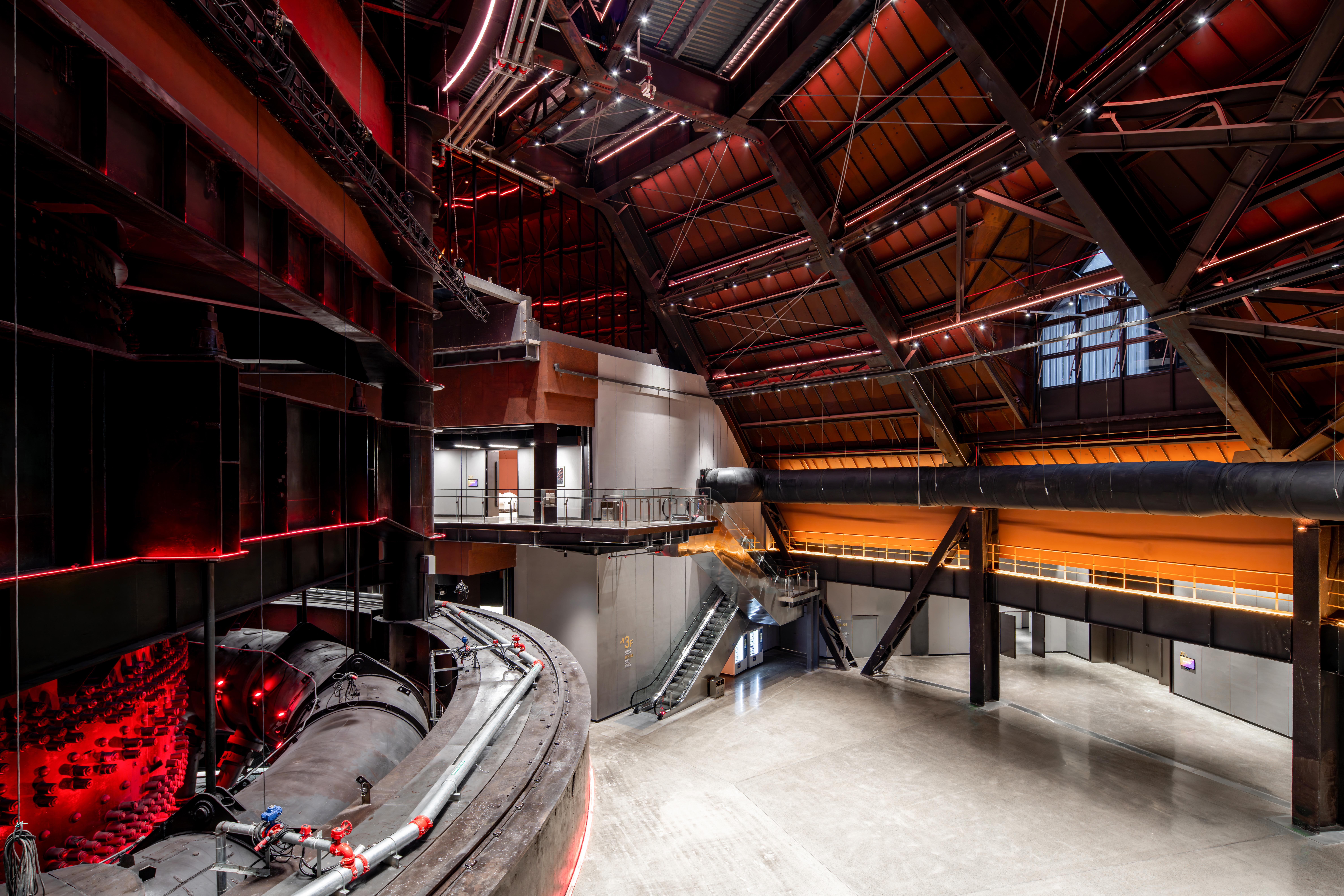 二层设置主会场、贵宾接待室、千人会议室厅及休闲洽谈区,利用视野优势,创造可俯瞰高炉本体的独特体验空间。在四高炉东侧的一号展馆内新建的展览与主会场,采用现代语言和材料(如不锈钢穿孔板、玻璃幕墙、钢结构),但在体量、色彩和细节处理上与高炉本体的工业风貌协调呼应,形成对话而非对抗的关系。