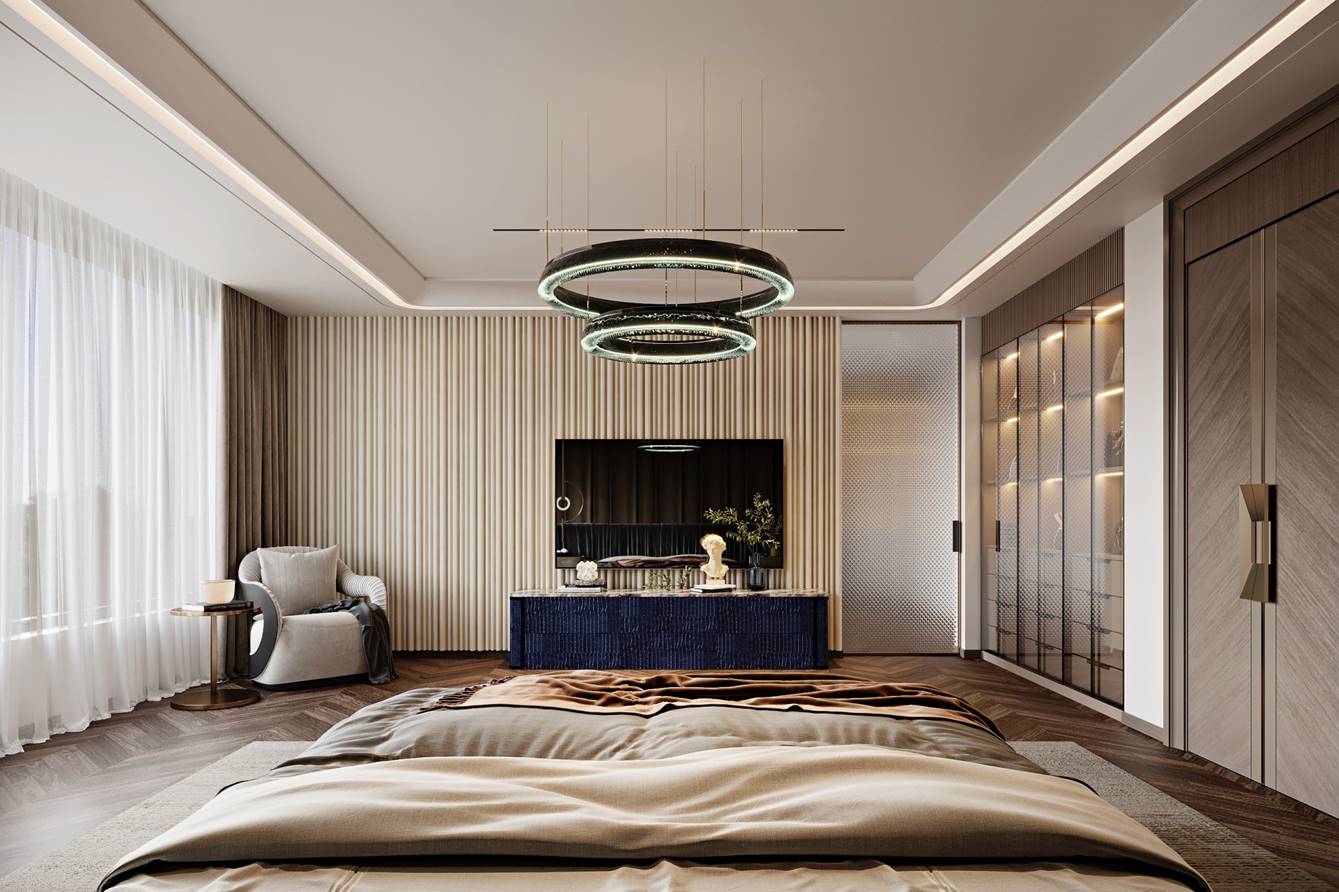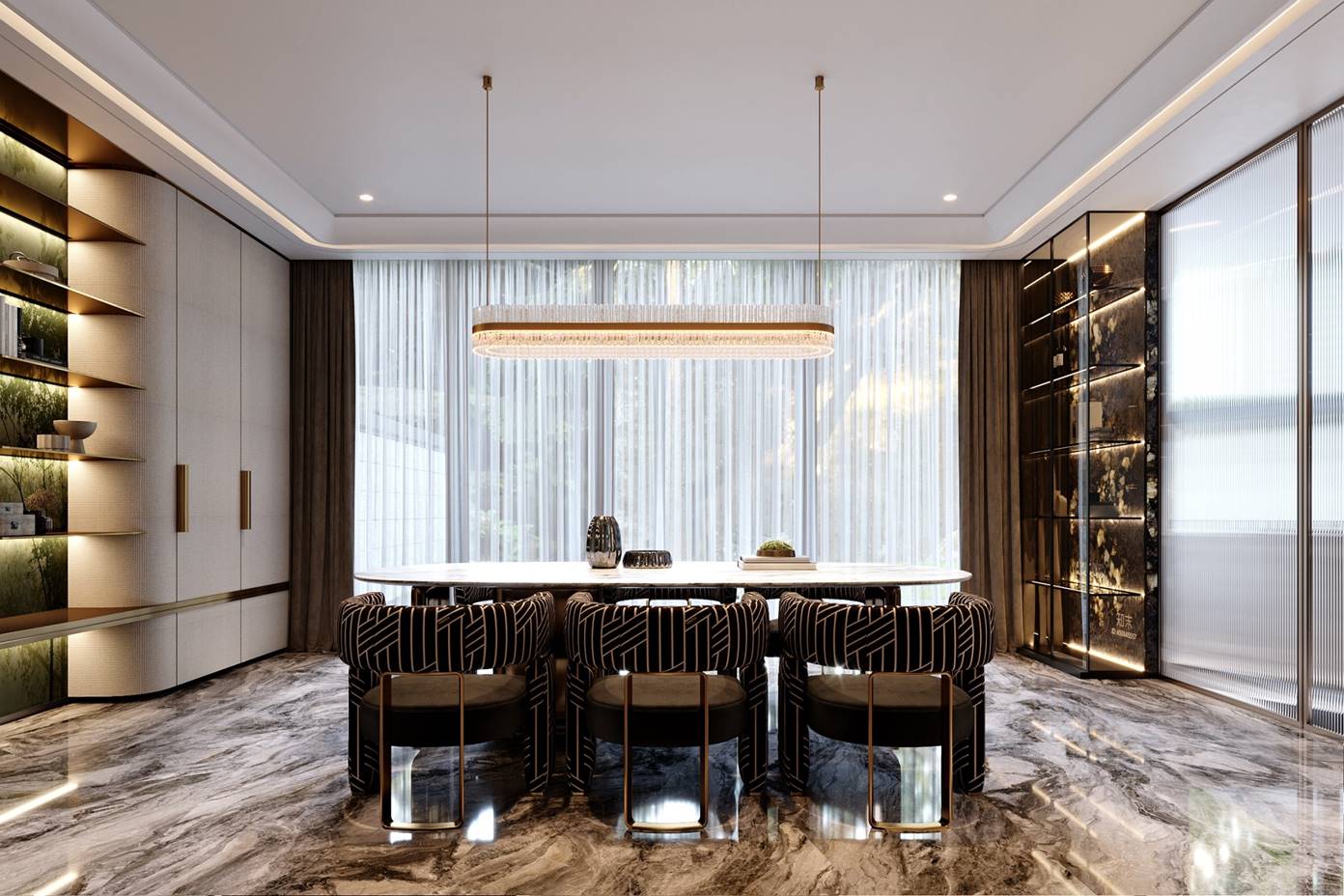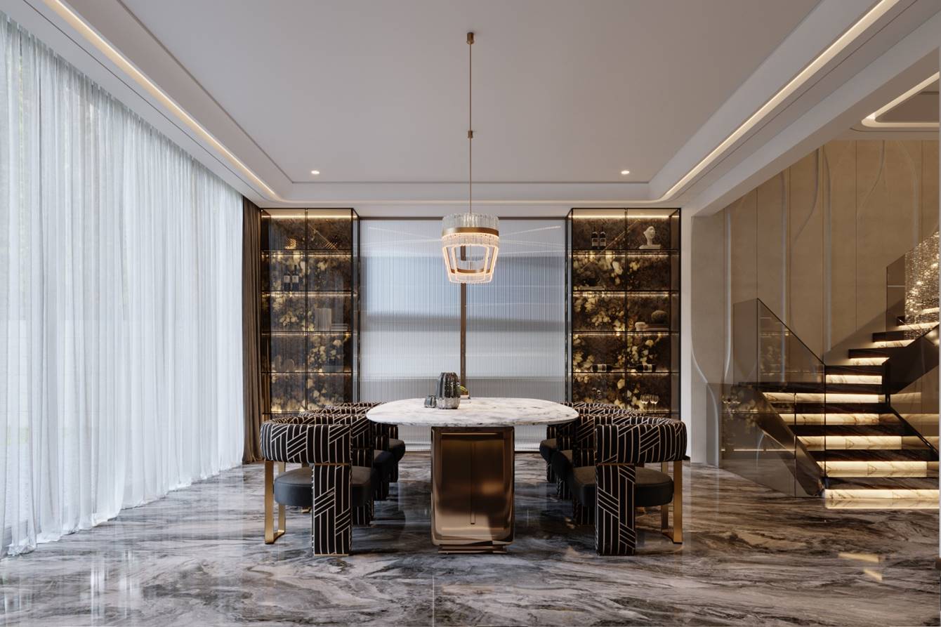 空间意境:1. 流光:既呼应空间中线条灯带的流动光影、大理石纹理的鎏金光泽,也指代垂坠帘幕过滤后的自然光线,让“光”成为空间的动态设计语言,赋予静态空间灵动的韵律感;