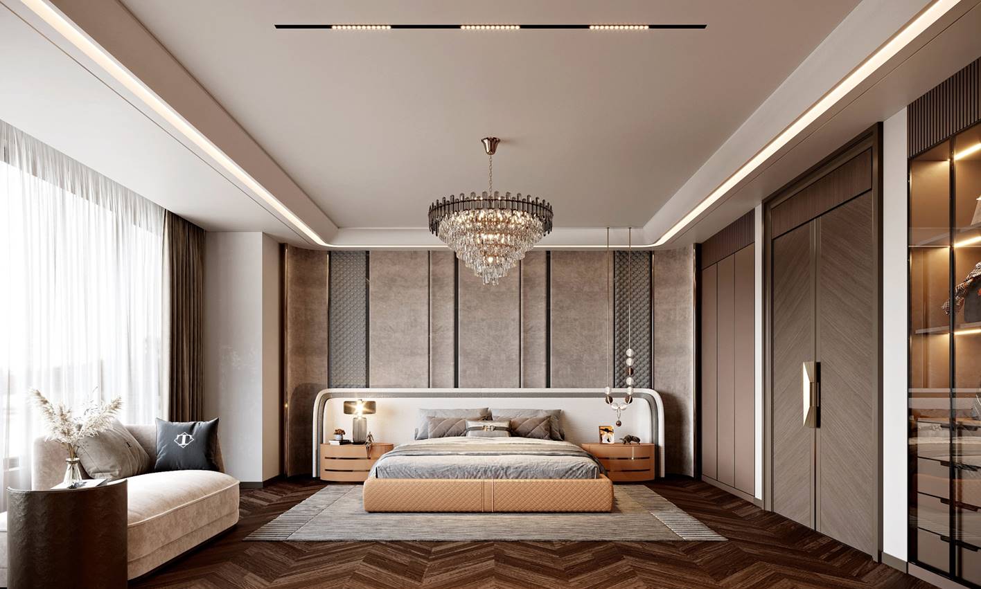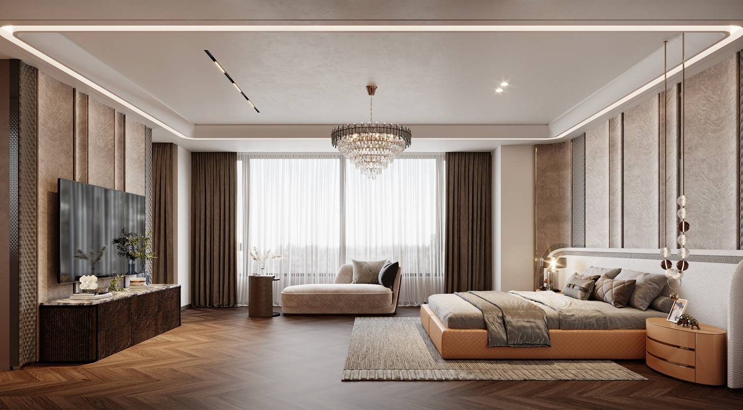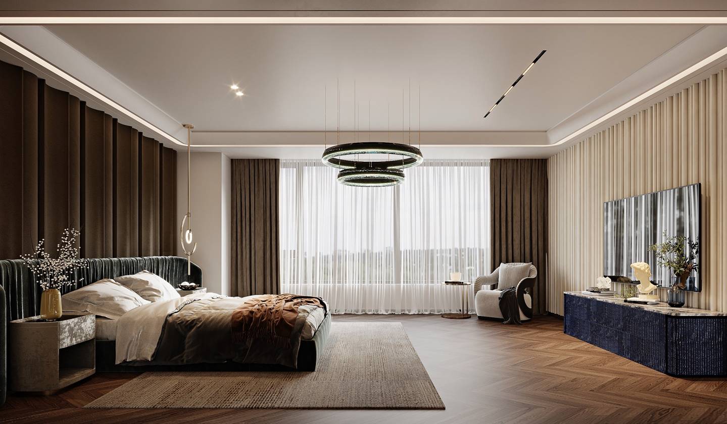 空间意境:1. 流光:既呼应空间中线条灯带的流动光影、大理石纹理的鎏金光泽,也指代垂坠帘幕过滤后的自然光线,让“光”成为空间的动态设计语言,赋予静态空间灵动的韵律感;