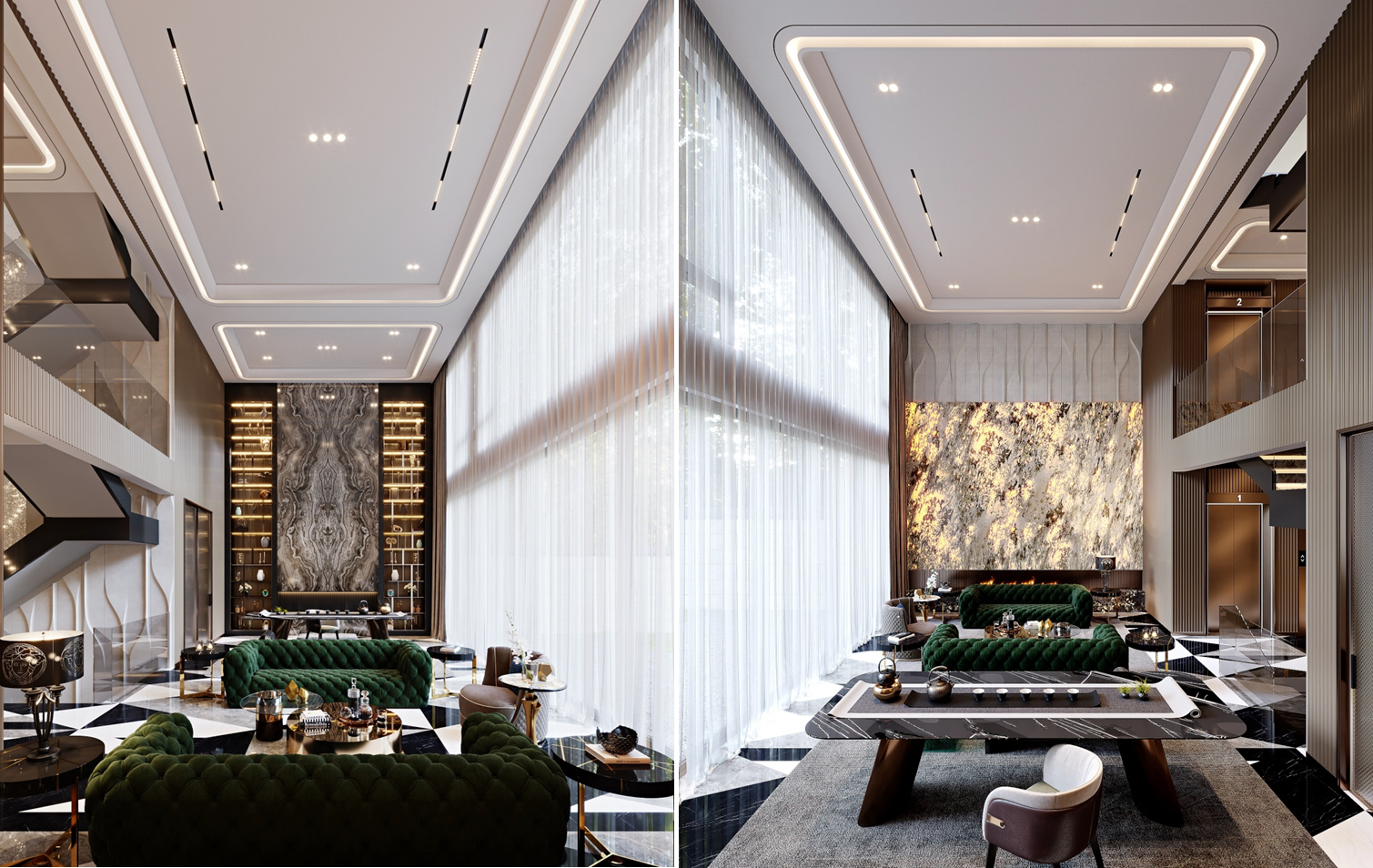 设计选材:墨绿色绒面家具的复古优雅、石材与金属的质感搭配,以及挑高格局营造的雅致奢居氛围,摒弃浮夸的奢华,回归精致的艺术审美。