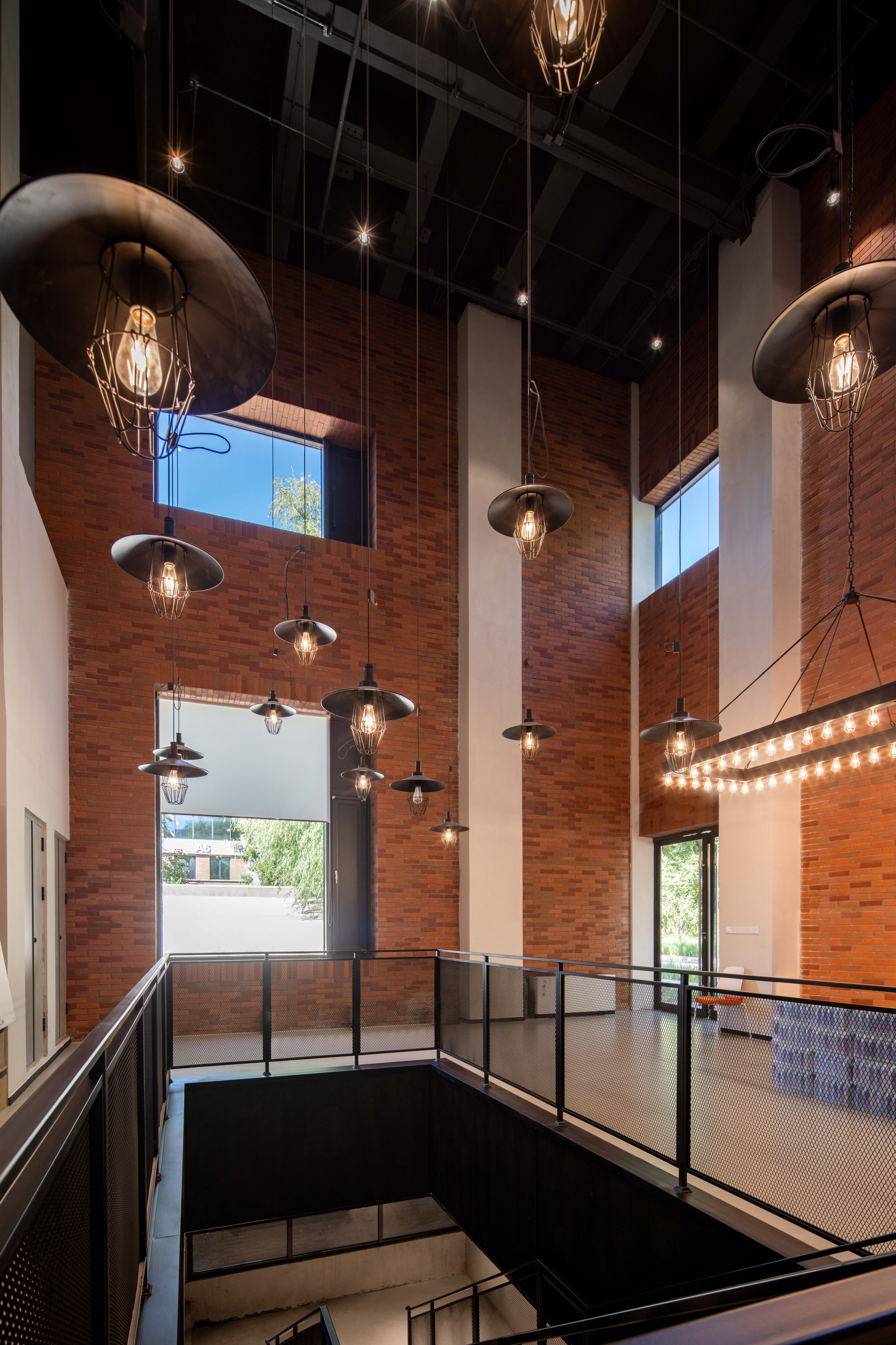 A4教学科研楼及配套的空间功能定位为科研教学及综合服务,空间层次相对丰富,设计均采用裸顶,强调工业感,保留原有构筑物,强调新与旧的对比,考虑到使用者特性,办公、会议、茶歇区墙面均设有黑板。将厂区里承载的记忆引入到室内空间当中,保留厂房老旧红砖墙,混凝土梁柱,如历史化石般向人们述说着曾经的故事。