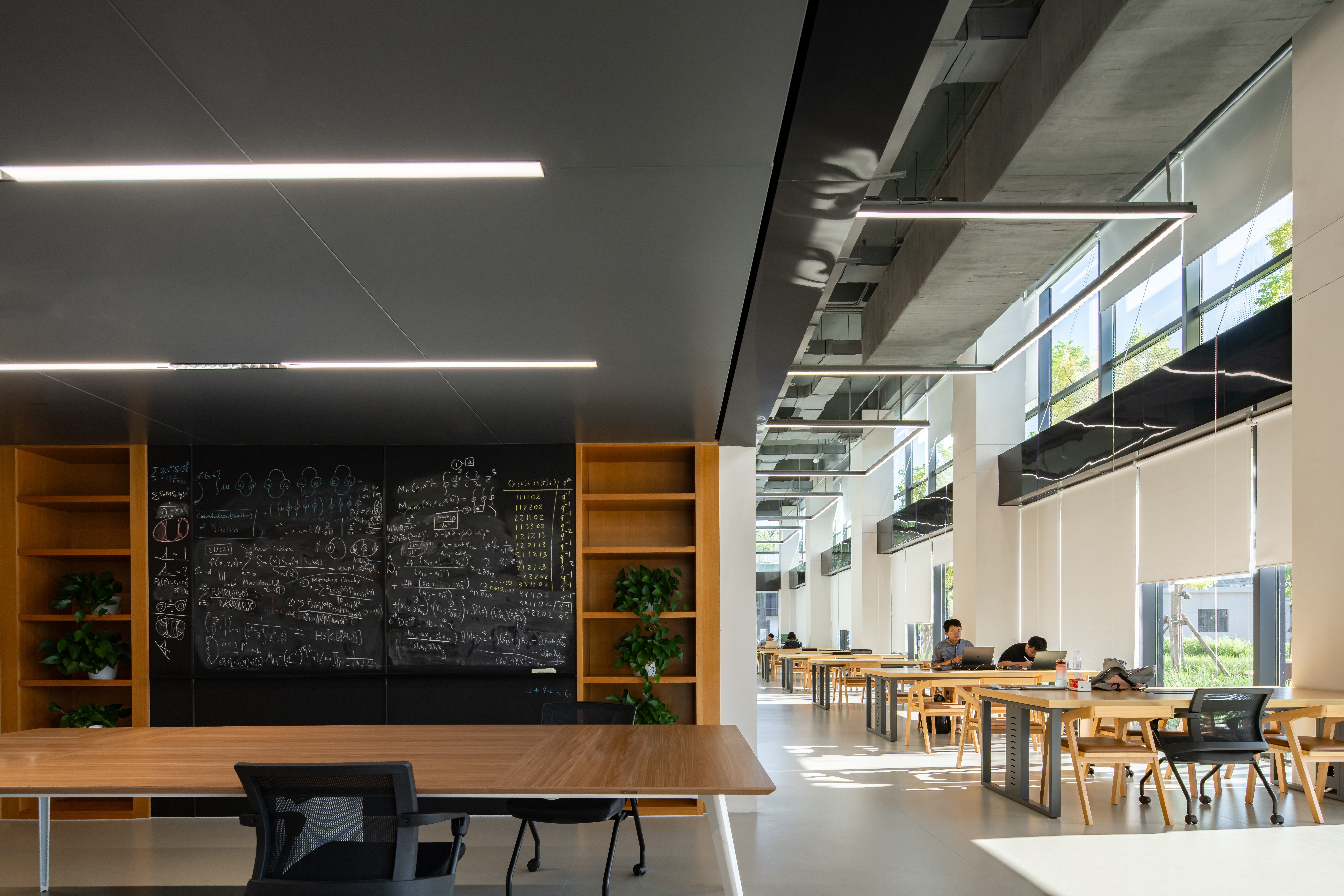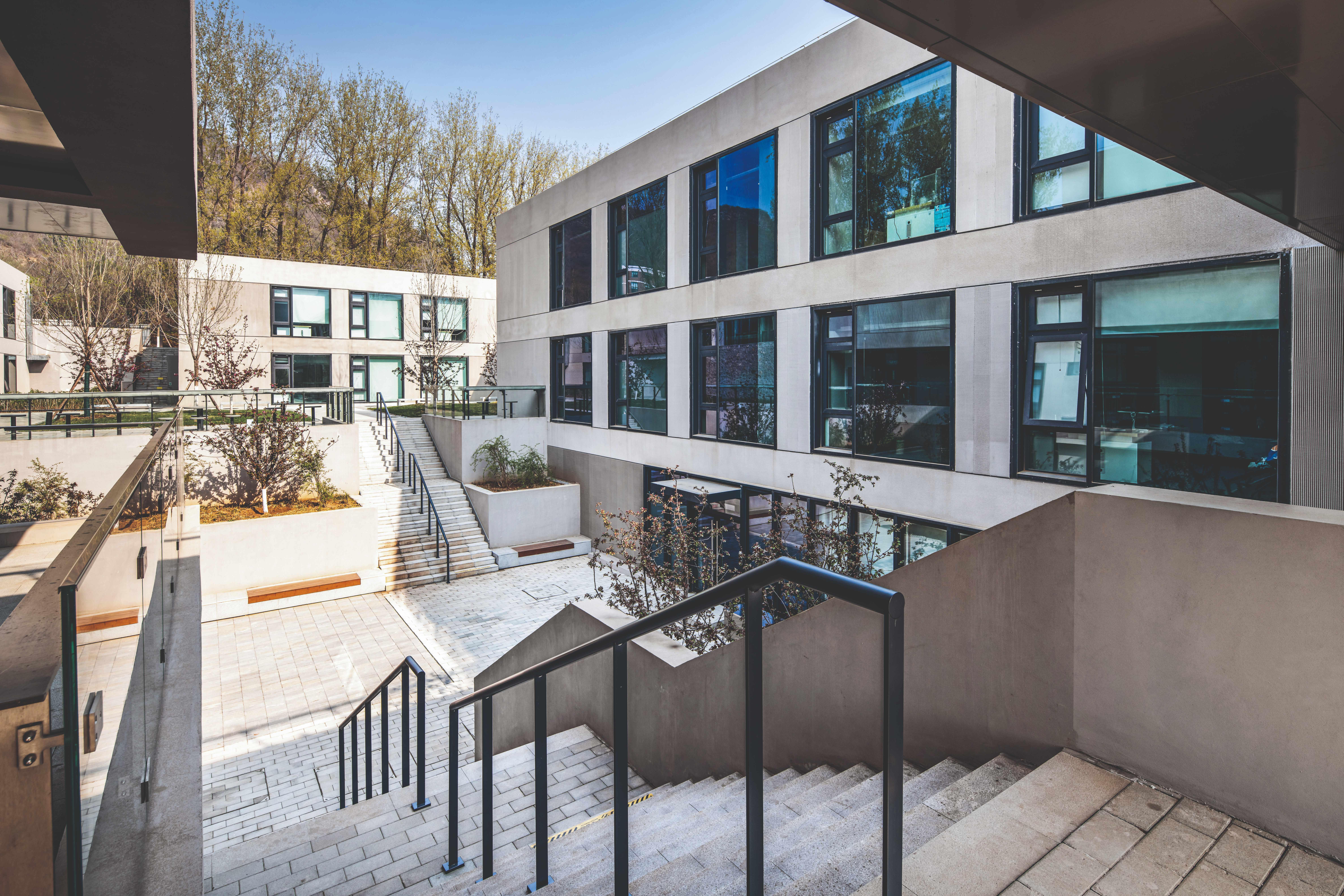 A3教学科研楼主要解决高差问题,建筑对于半山坡地采用局部处理方式,通过插进山体的方式形成三个庭院,相对于室内而言,则是在采光较弱的地下一层,采用大空间的布置,如:图书室、多人办公室、多人讨论间。由于内部空间功能主要以办公为主,所以设计更加注重营造自由、高效、通透、充满活力与生机的空间氛围。公区墙面增设黑板,部分空间选择留白,给使用者提供参与再创新的可能性,使空间成为不断丰富的沉积物,不断进化的生命体。