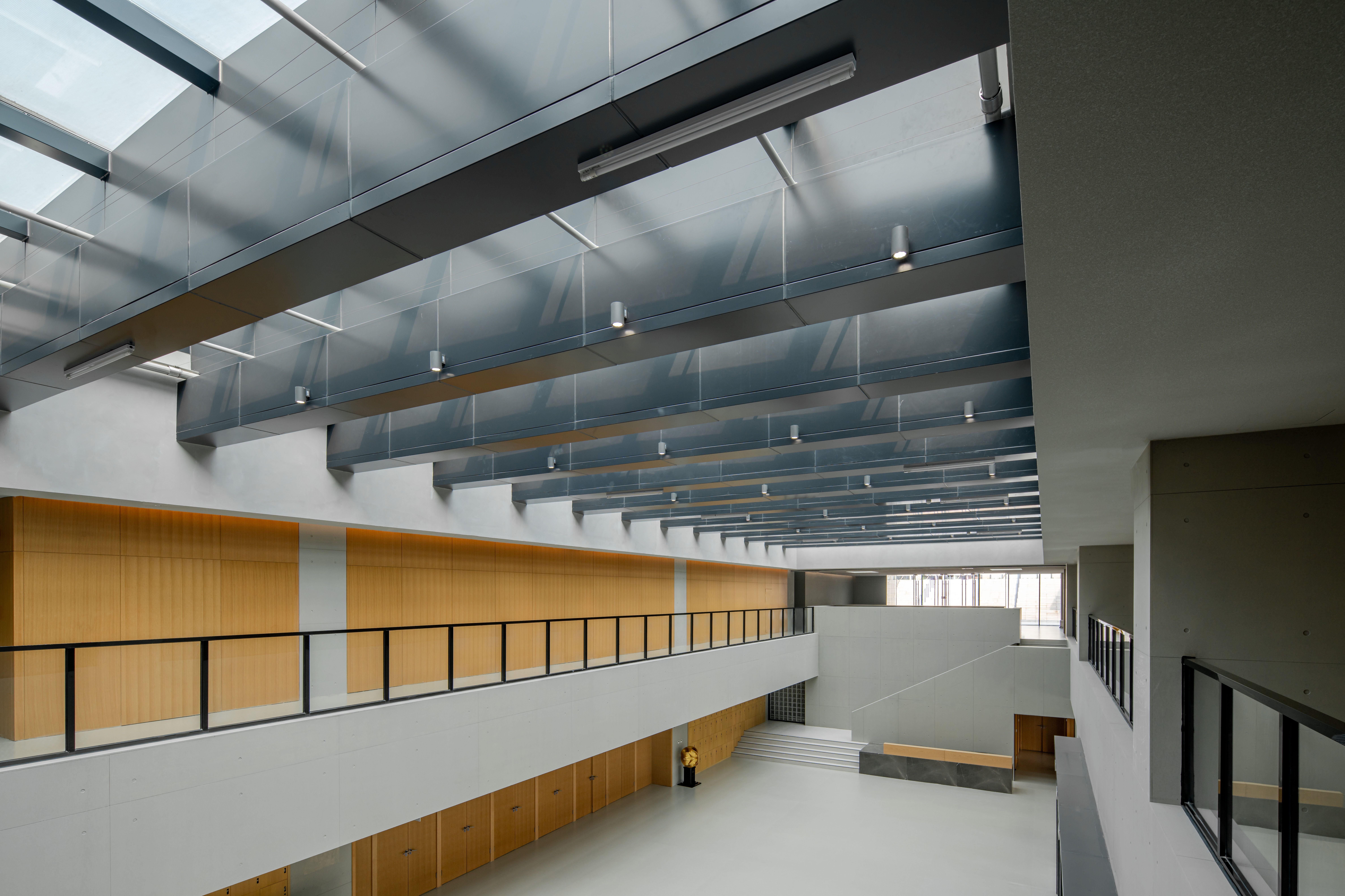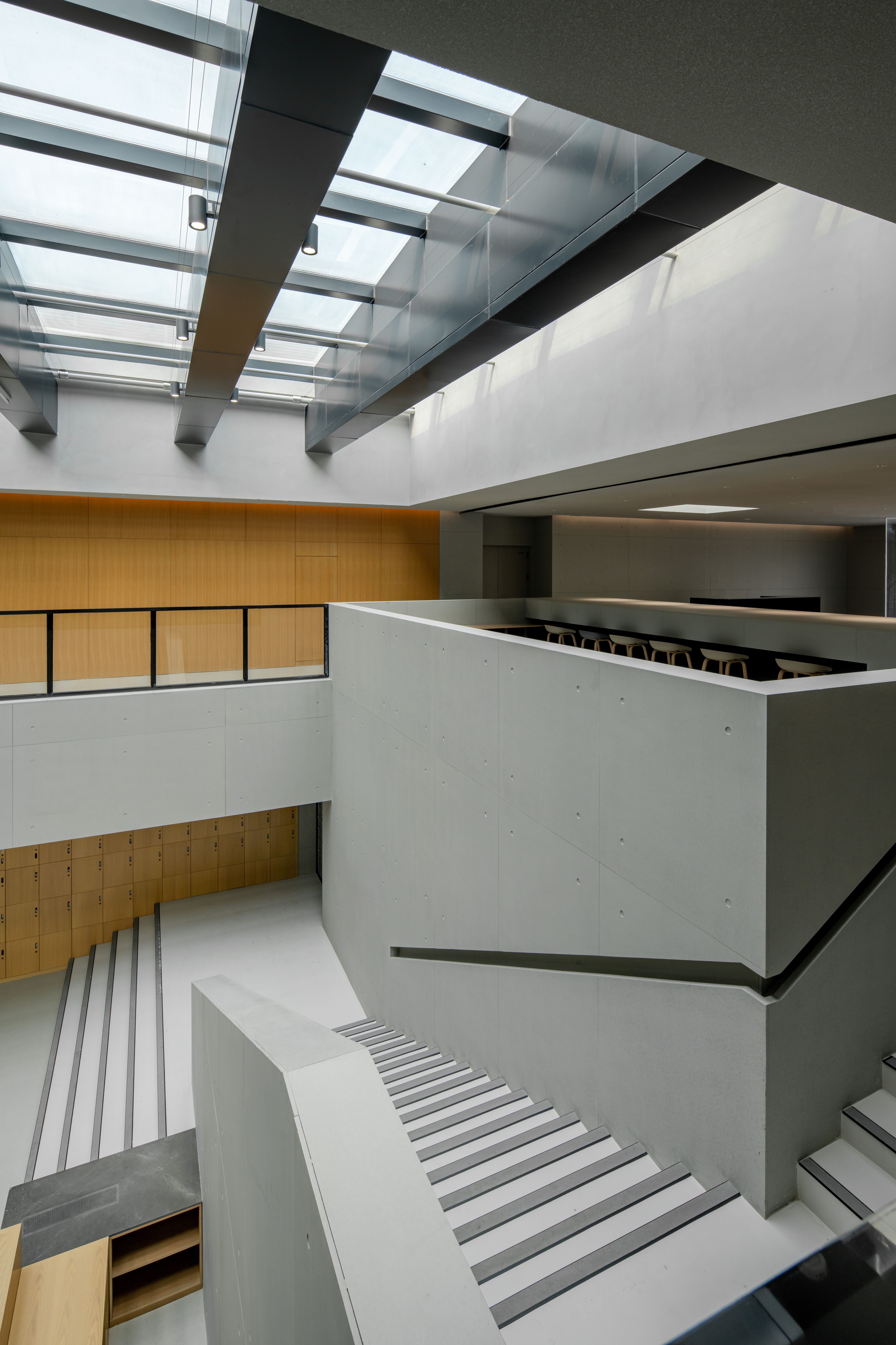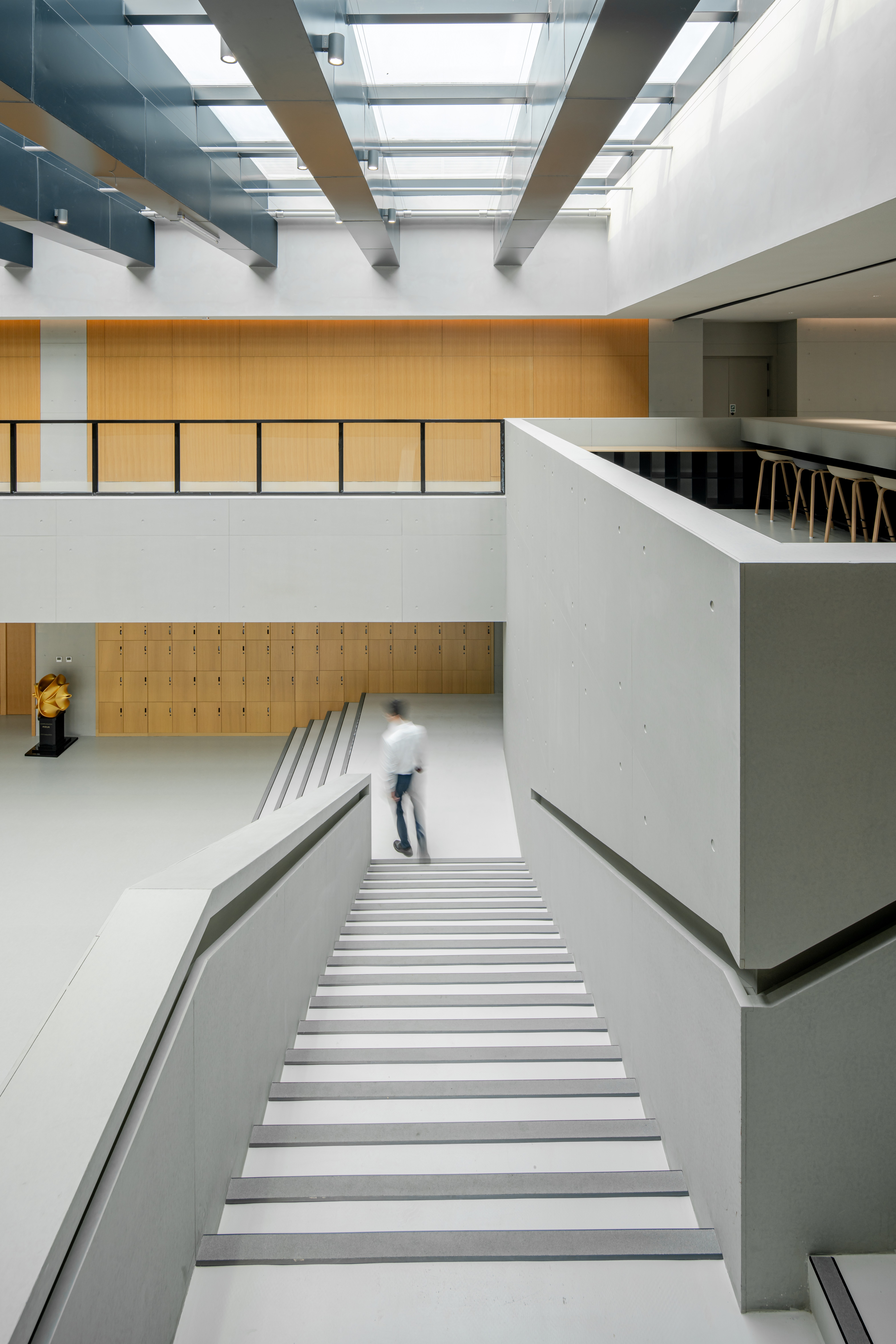 A7图书馆的功能定位为图书馆,内部空间强调仪式感及秩序感,以期打造多元化、开放性的空间精神。图书馆采用叠山的手法错动延伸,连接不同标高场地,创造富有趣味的活动平台。首层设置分项图书馆,二三层为综合图书馆,多功能大台阶拾级而上,同时也将到访者和建筑环境很好地联系在一起。在这里,狭义的空间美学让位于对于人的活动的关注,和对于场景营造的重视,以及对于未来空间新陈代谢的弹性预期。