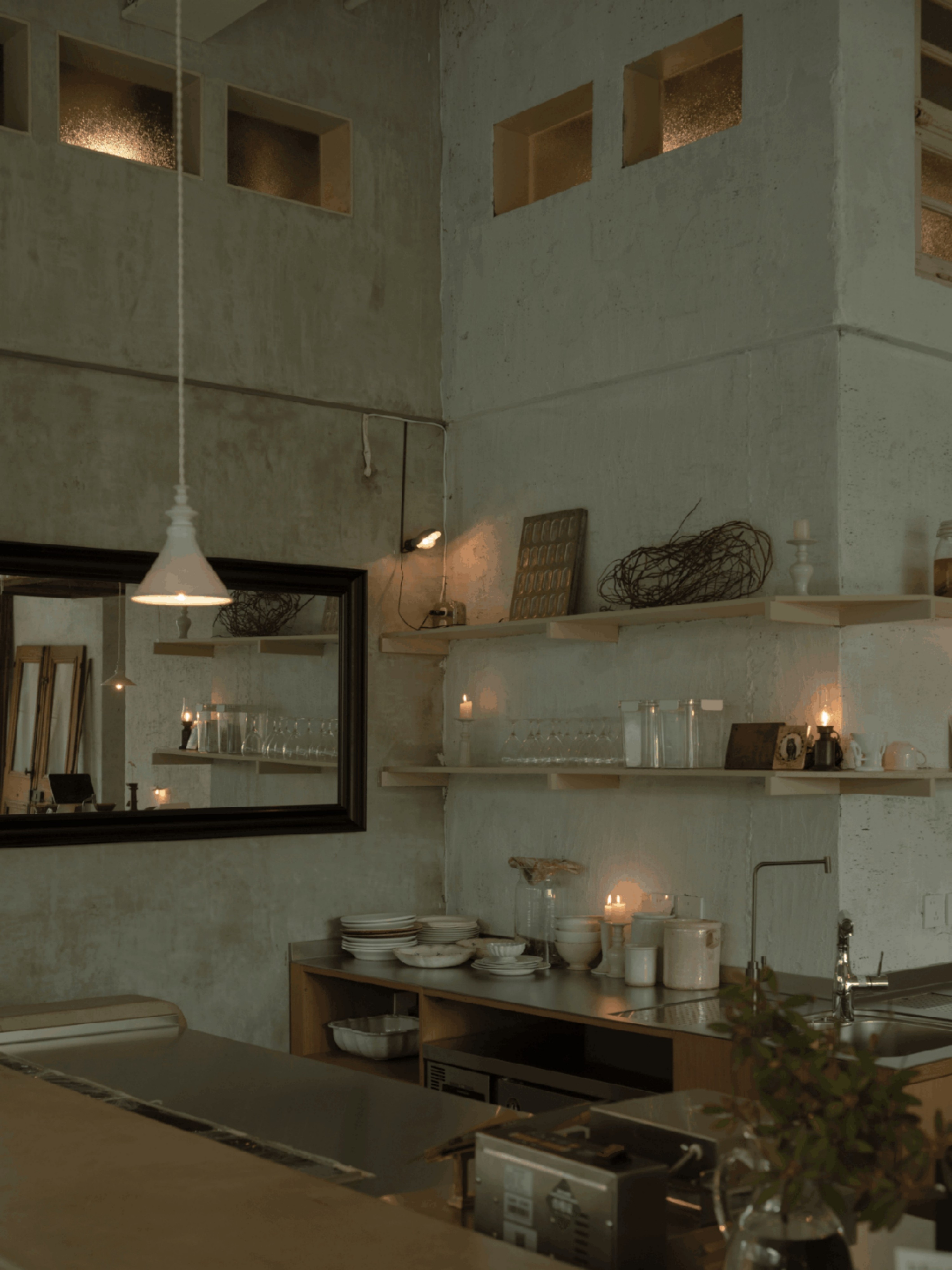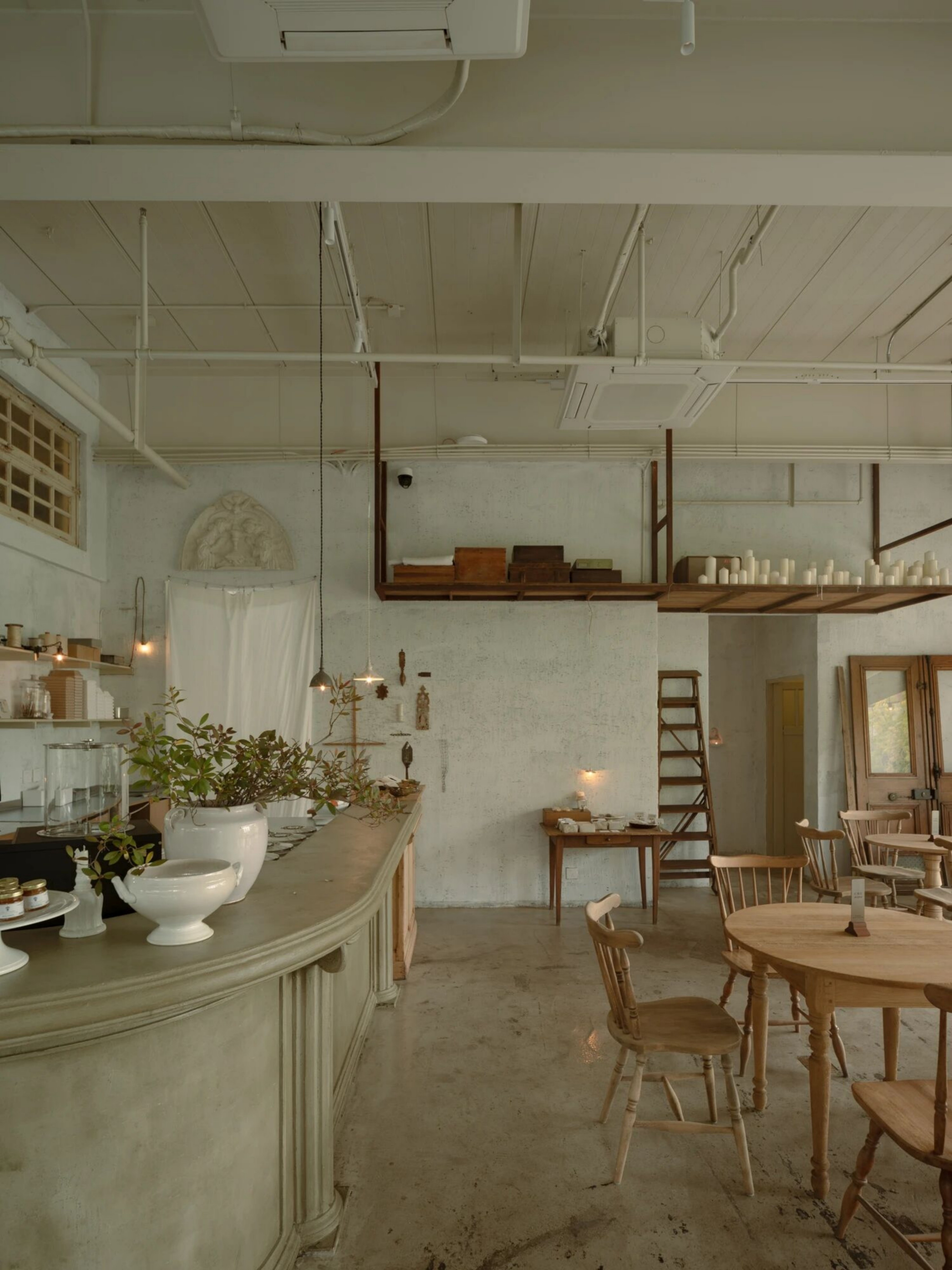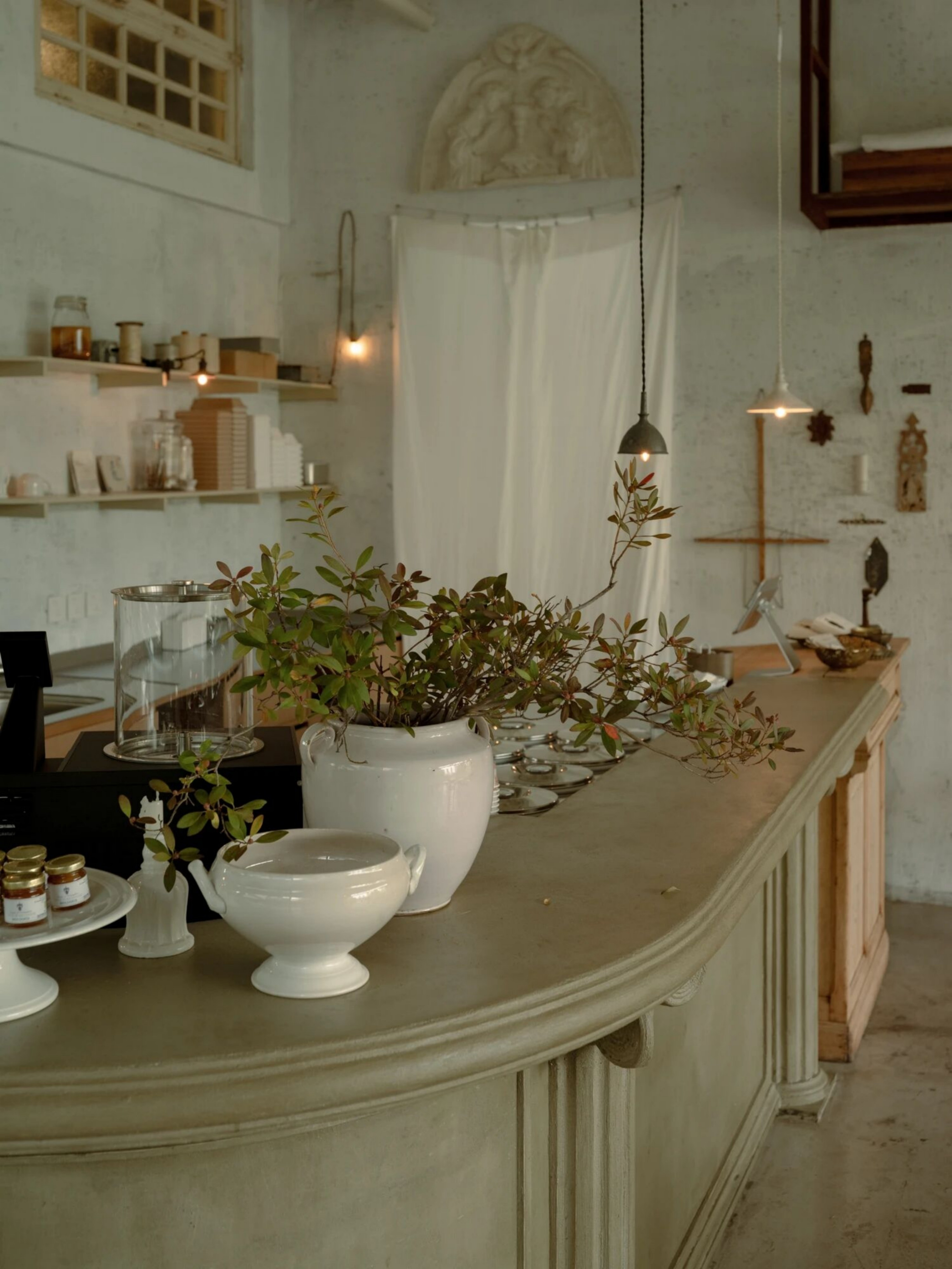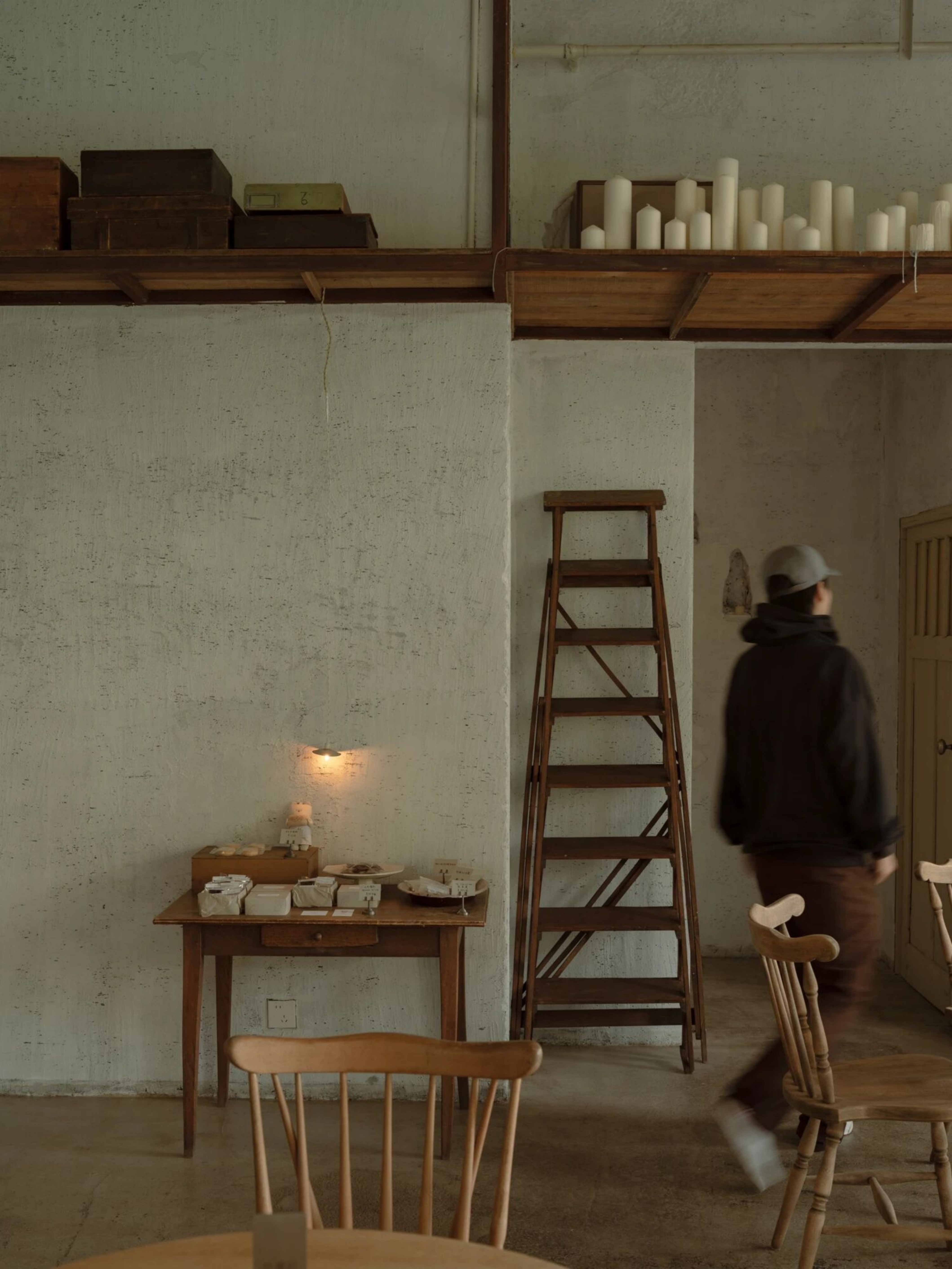 空间意境:空间聚焦到产品的品质,不只是对甜品的精细打磨,更在于整体氛围中传递出的手作气息。从设计伊始,我们便希望以一种沉着克制的语气,让时间沉淀的质感发声。空间不强调“装修”的存在感,而是以物件为主角展开。我们将室内的表达留给器物、机理与材质,构建出一个由物件语言组成的氛围场域。主理人在世界各地淘来了精美的器物,我们共同将其融入在空间里,让每一位到访者都能在使用中触碰到生活美学的细腻感知。